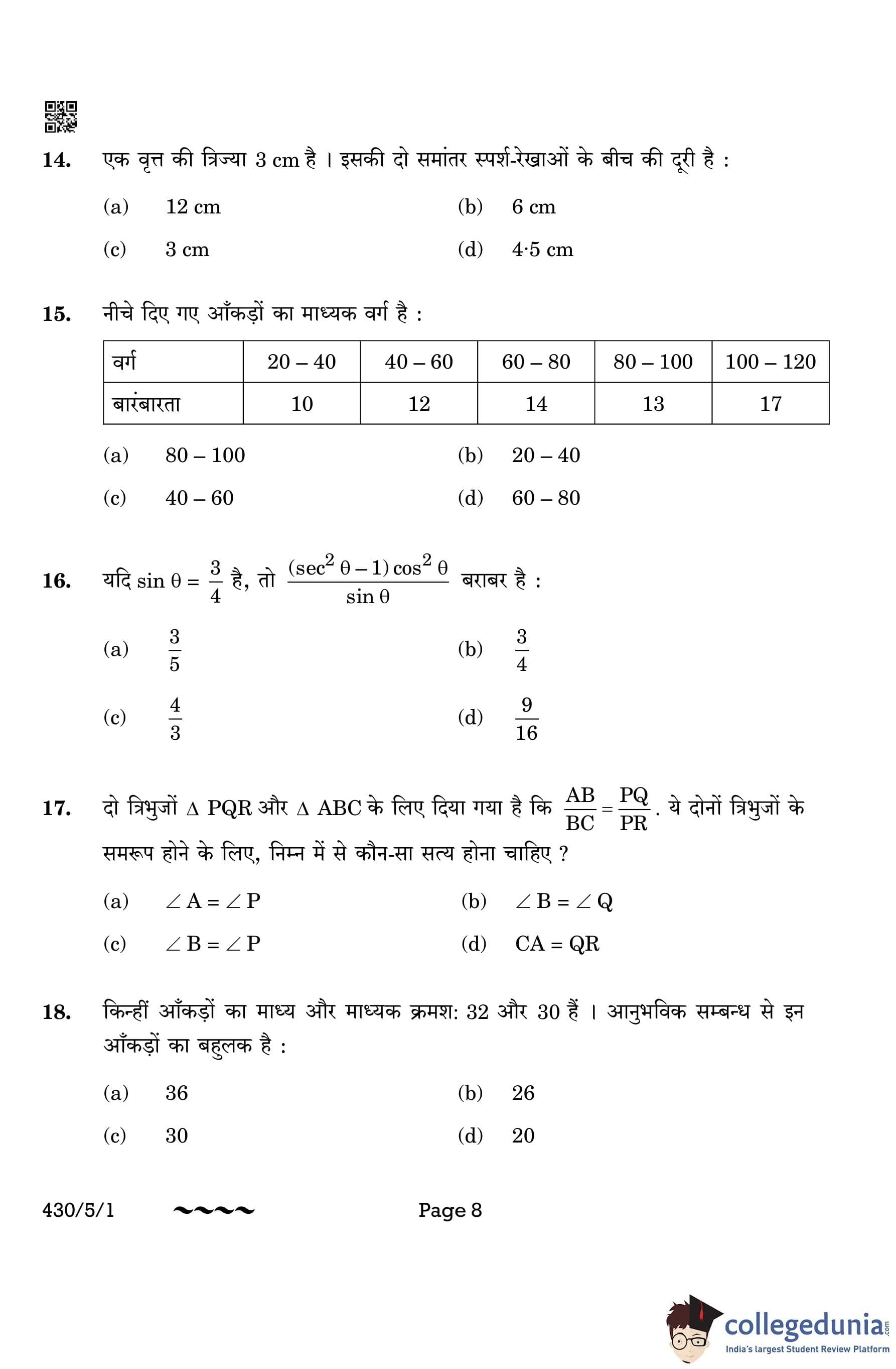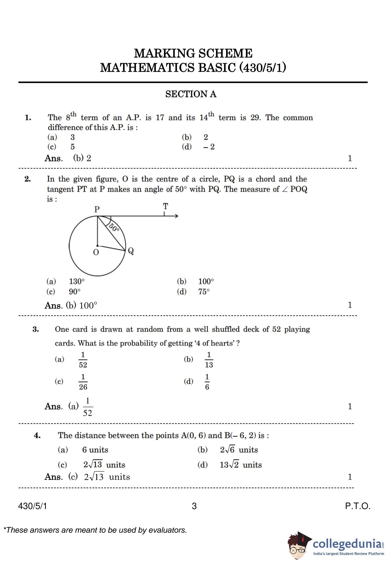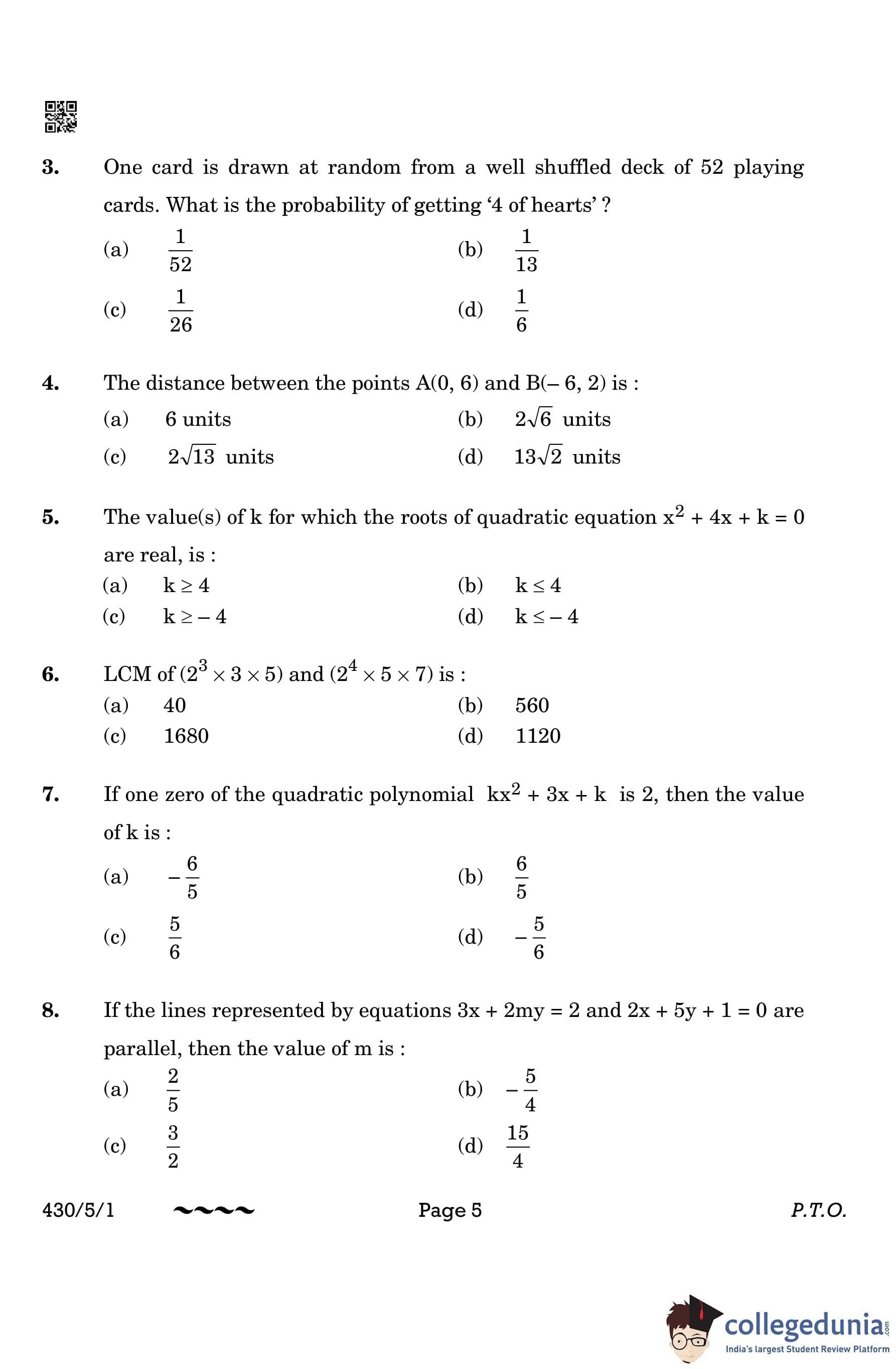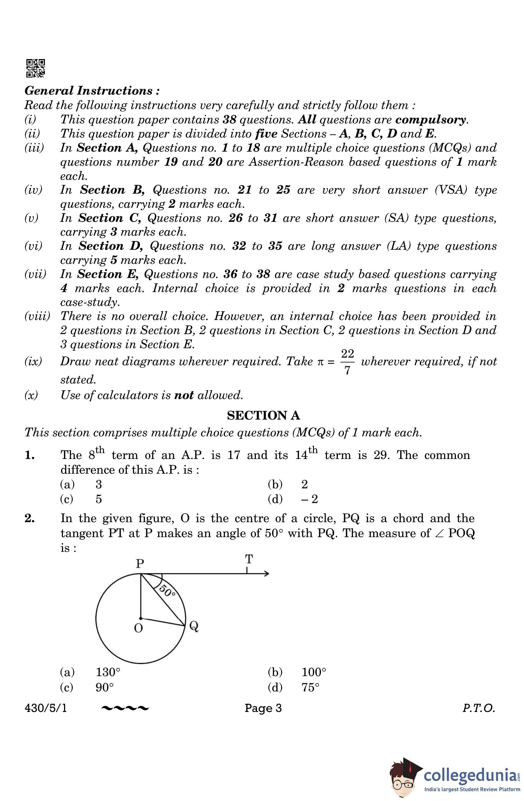 CBSE Class 10 Mathematics Basic Question Paper 2023 with Answer Key (Set 1- 430/5/1) is available for download here. The exam was conducted by the Central Board of Secondary Education on March 21, 2023 in the Morning Session 10:30 AM to 1:30 PM. The medium of paper was English & Hindi. According to initial student reaction, the CBSE Class 10 Mathematics Basic paper was rated as Moderate in difficulty level. The question paper comprised a total of 38 questions divided among 5 sections.