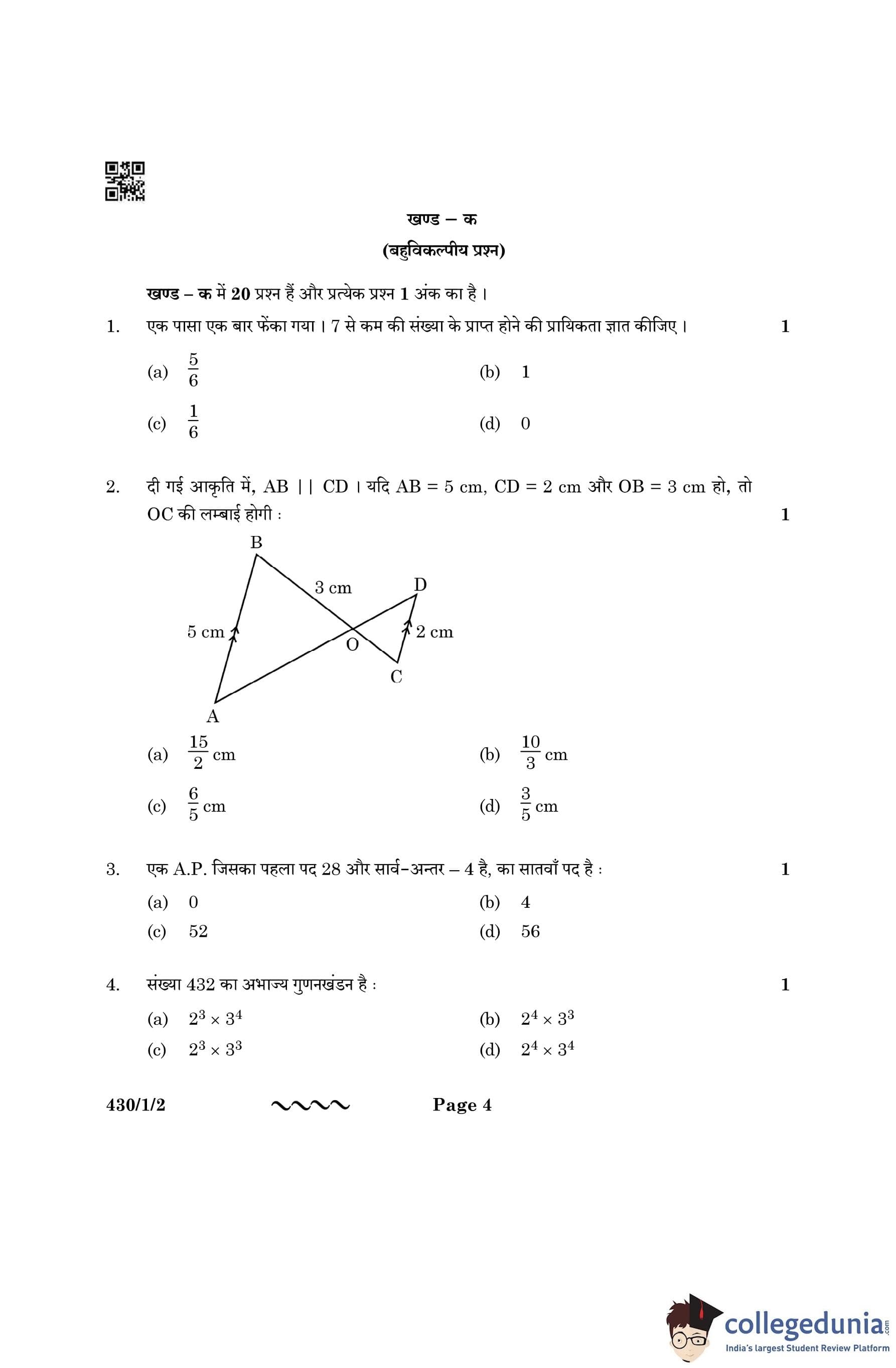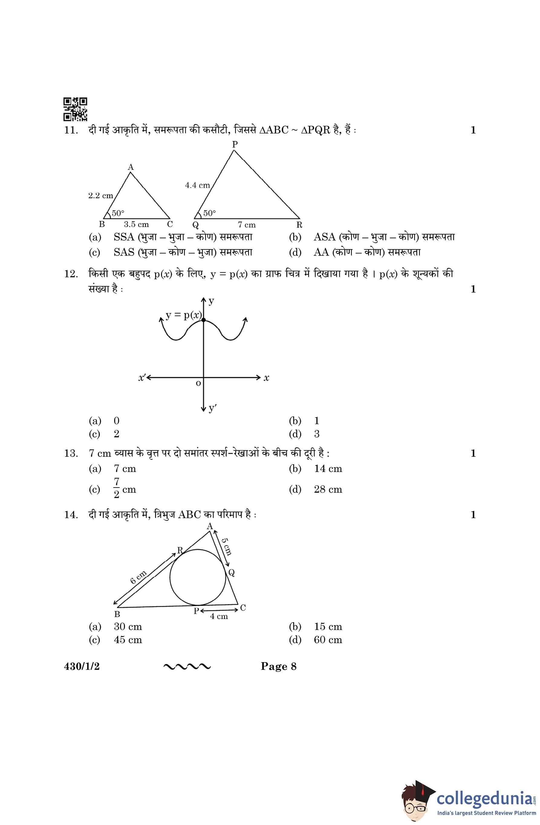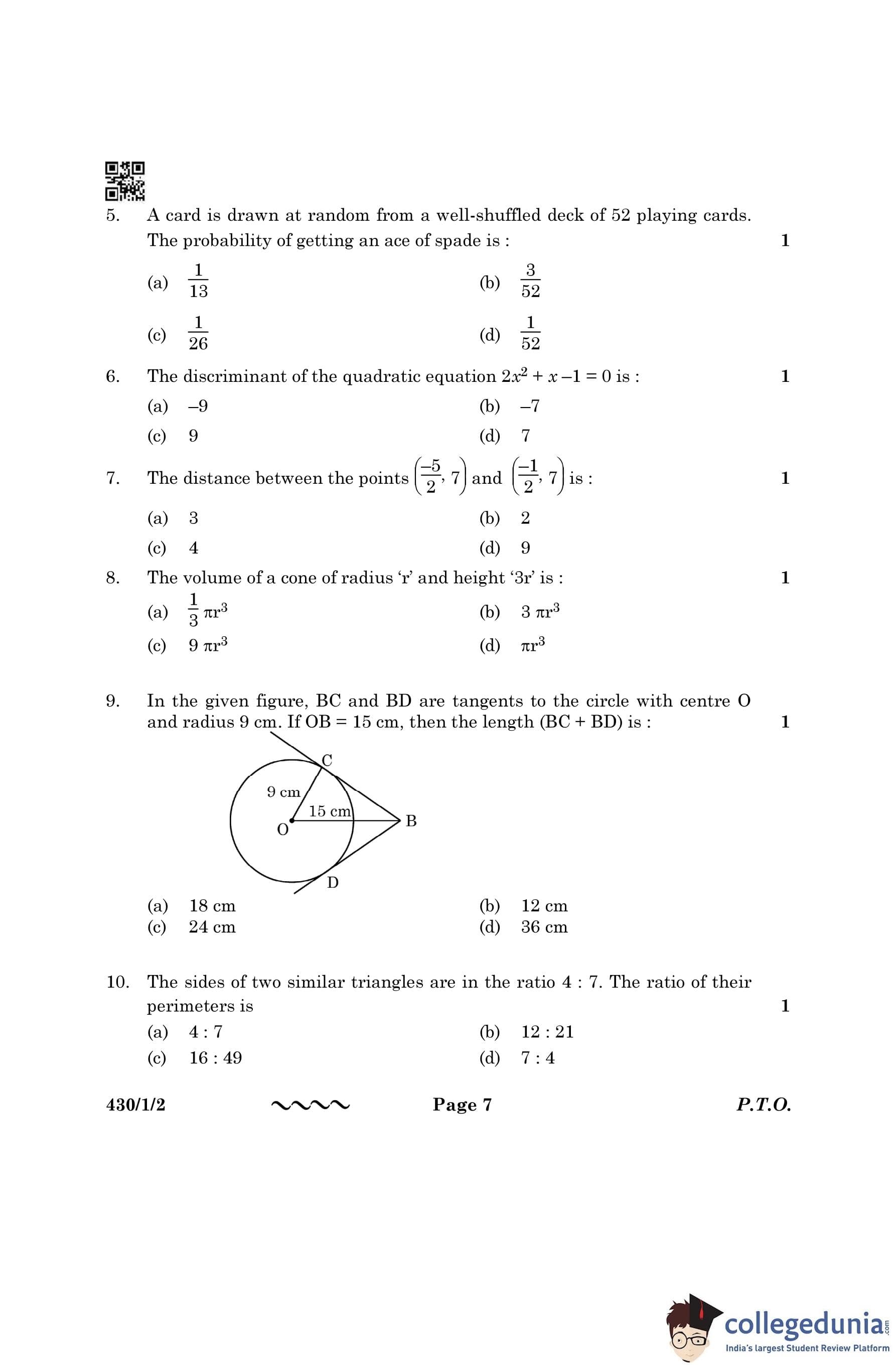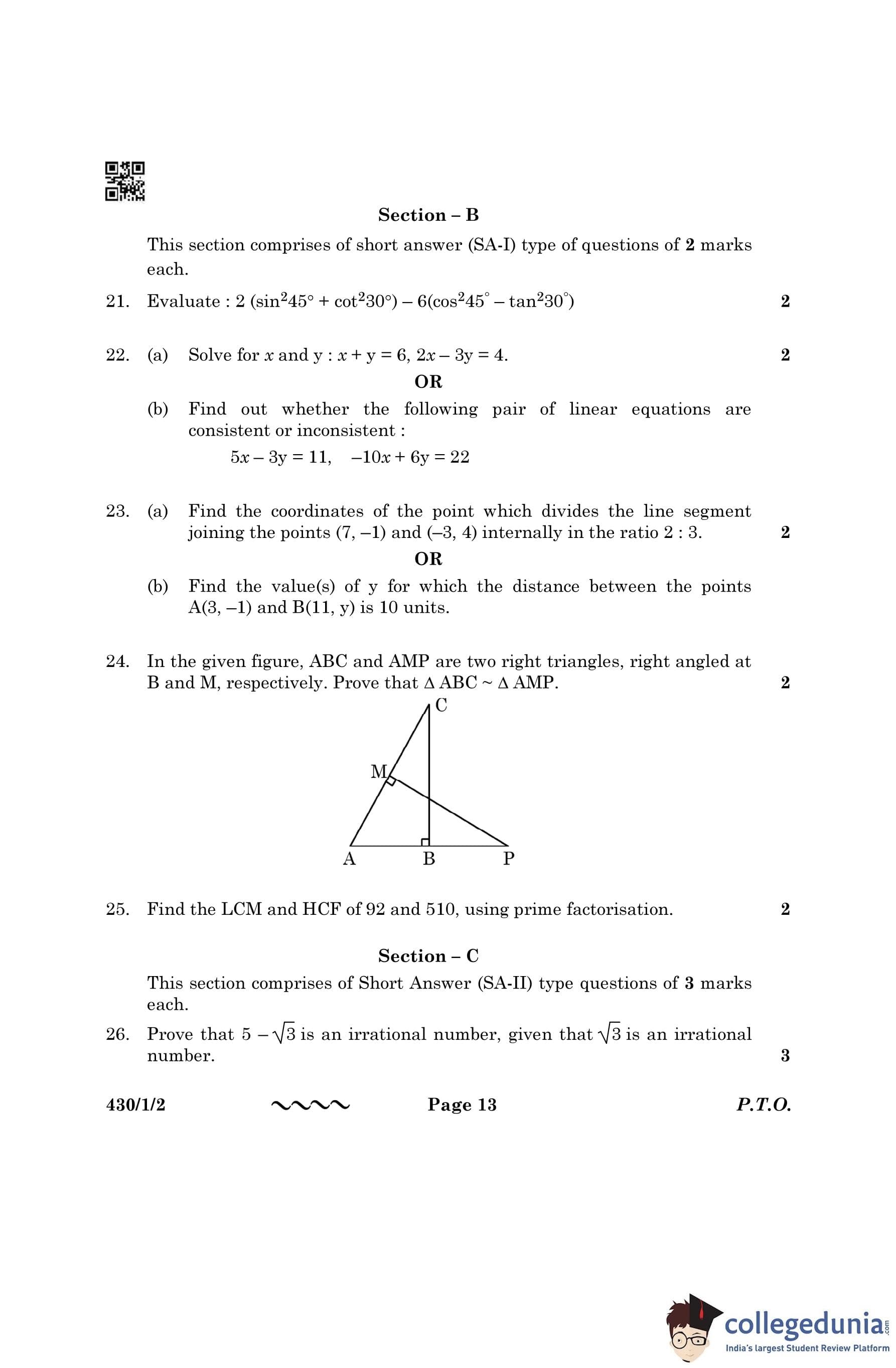 CBSE Class 10 Mathematics Basic (Set 2- 430/1/2) Question Paper 2023 with Answer Key