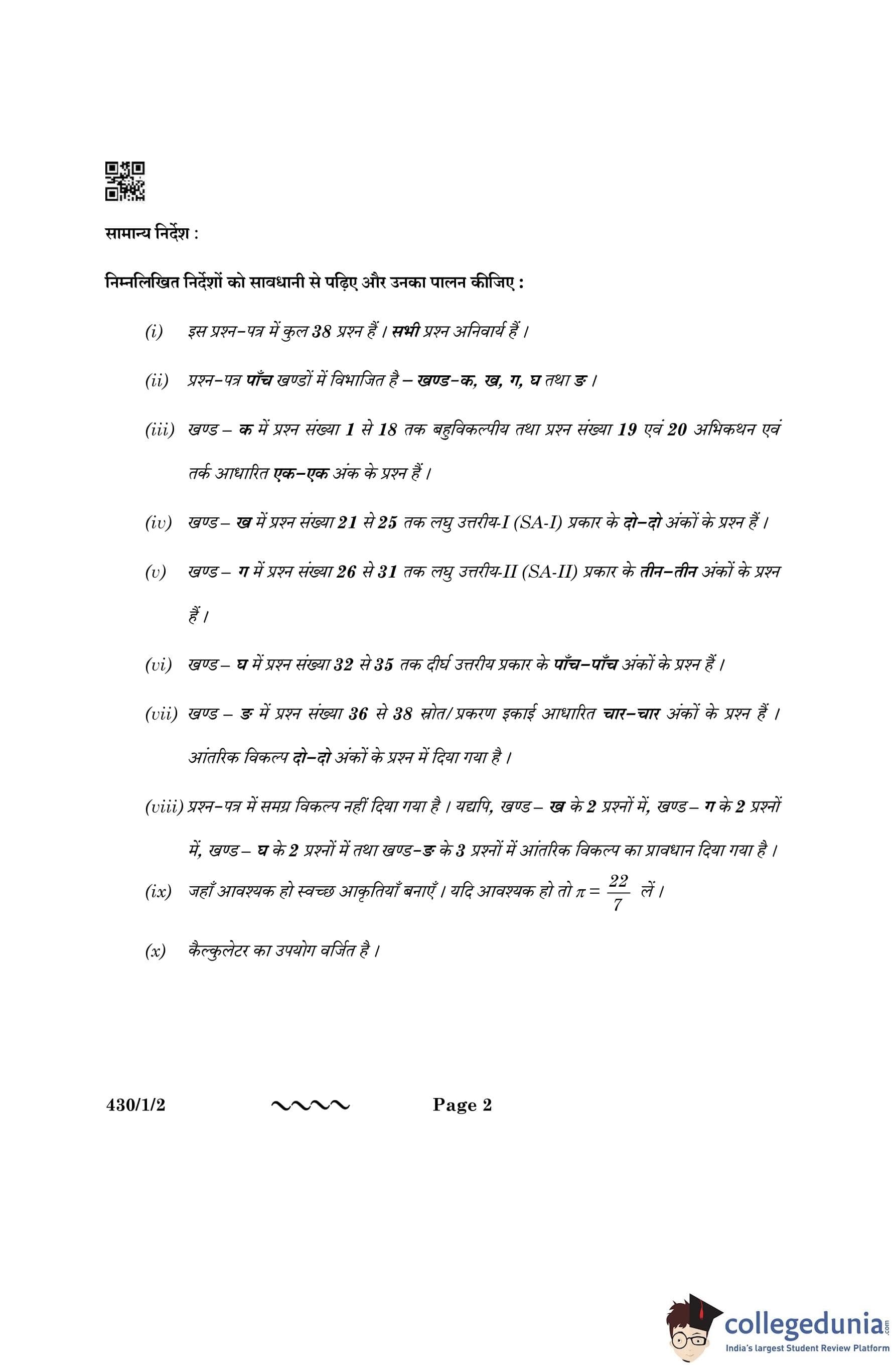 CBSE Class 10 Mathematics Basic Question Paper 2023 with Answer Key (Set 2- 430/1/2) is available for download here. The exam was conducted by the Central Board of Secondary Education on March 21, 2023 in the Morning Session 10:30 AM to 1:30 PM. The medium of paper was English & Hindi. According to initial student reaction, the CBSE Class 10 Mathematics Basic paper was rated as Moderate in difficulty level. The question paper comprised a total of 38 questions divided among 5 sections.