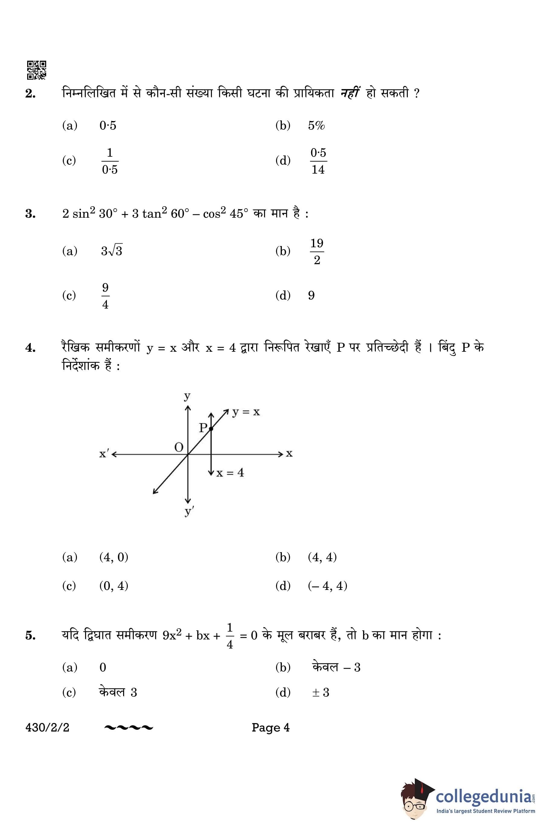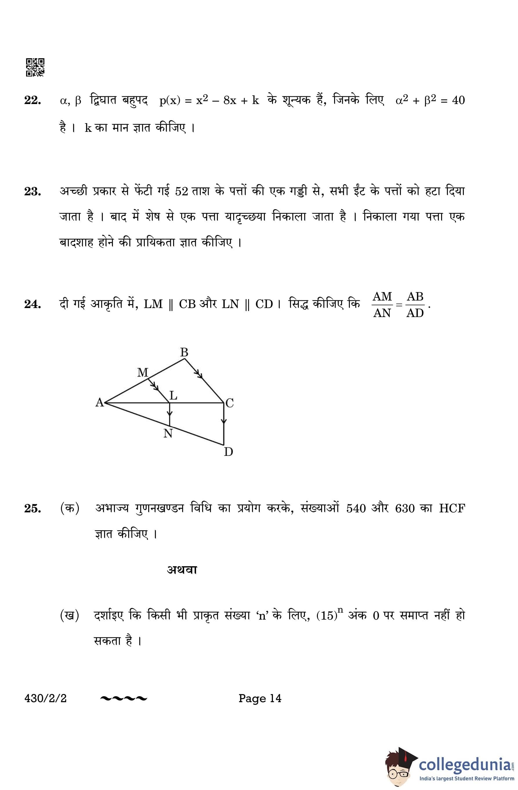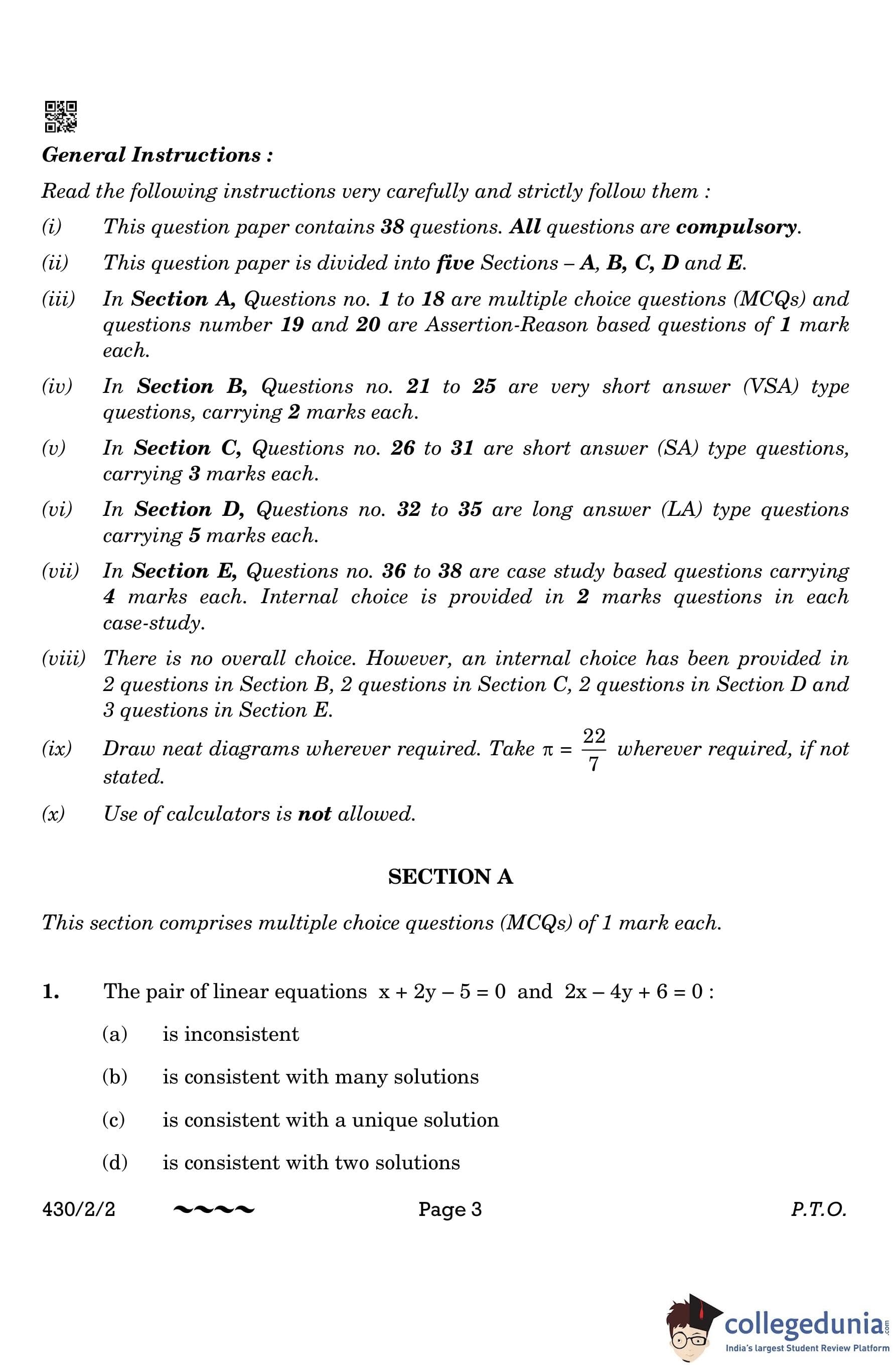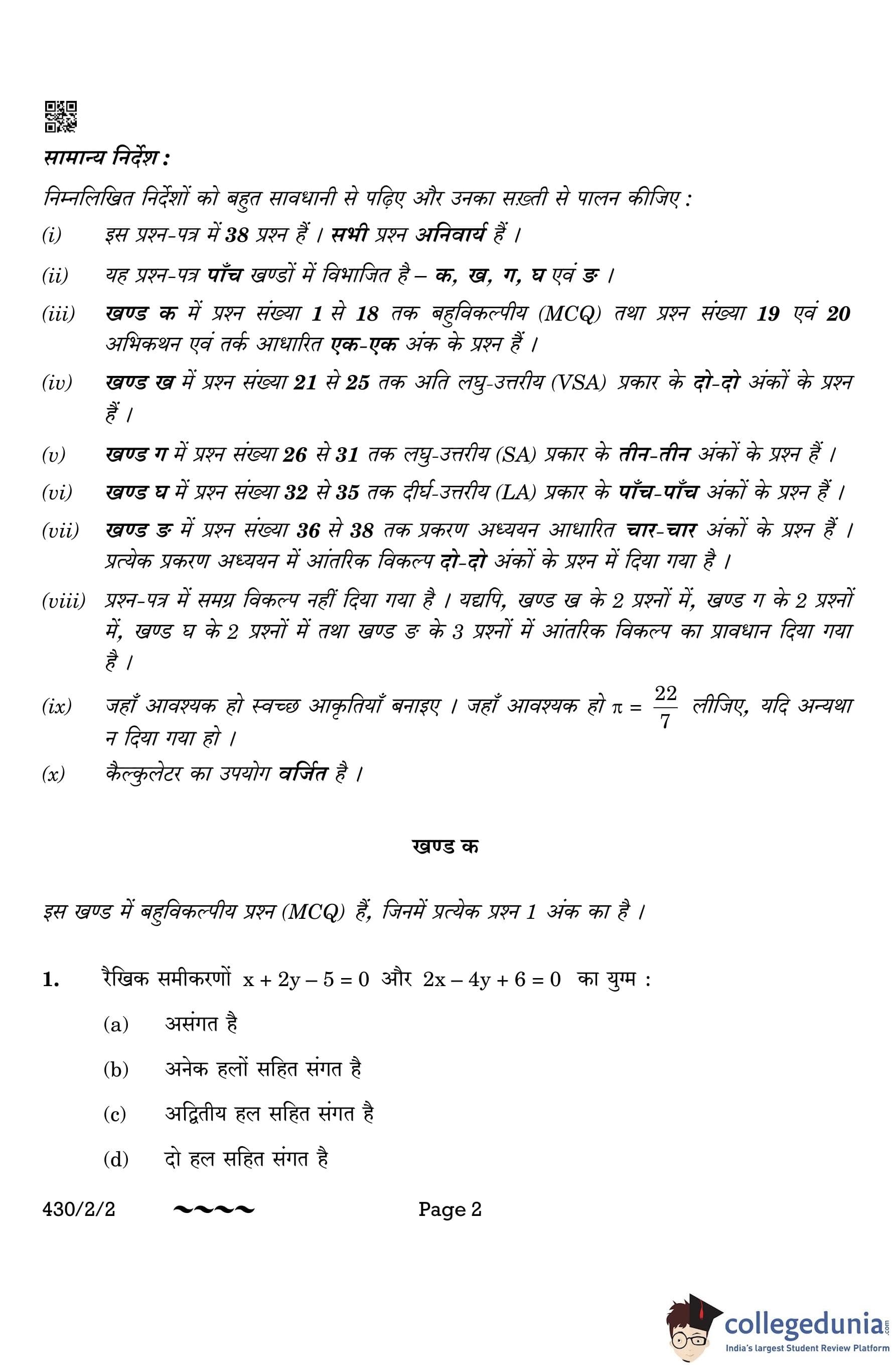 CBSE Class 10 Mathematics Basic Question Paper 2023 with Answer Key (Set 2- 430/2/2) is available for download here. The exam was conducted by the Central Board of Secondary Education on March 21, 2023 in the Morning Session 10:30 AM to 1:30 PM. The medium of paper was English & Hindi. According to initial student reaction, the CBSE Class 10 Mathematics Basic paper was rated as Moderate in difficulty level. The question paper comprised a total of 38 questions divided among 5 sections.
