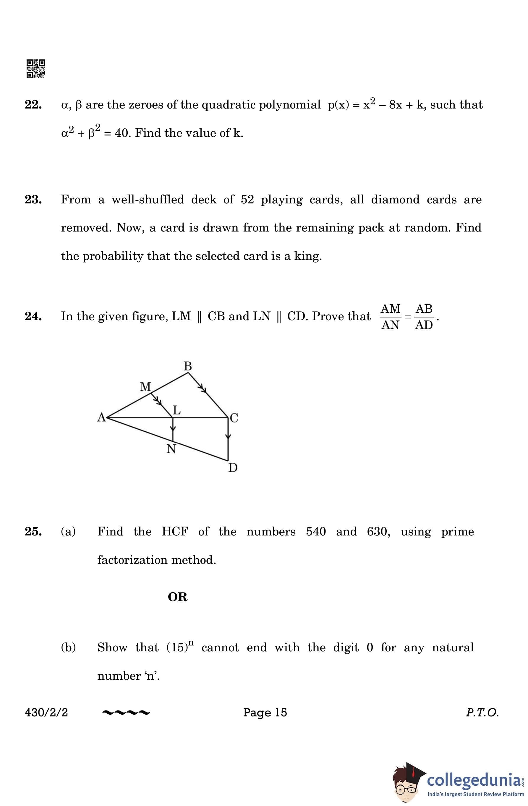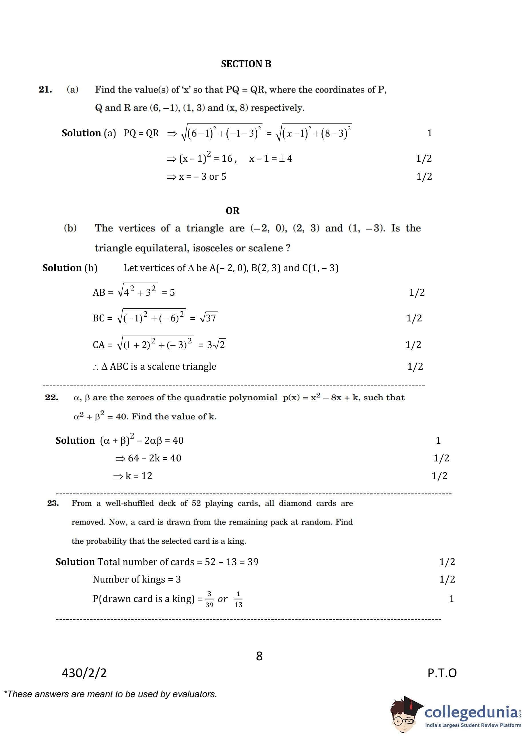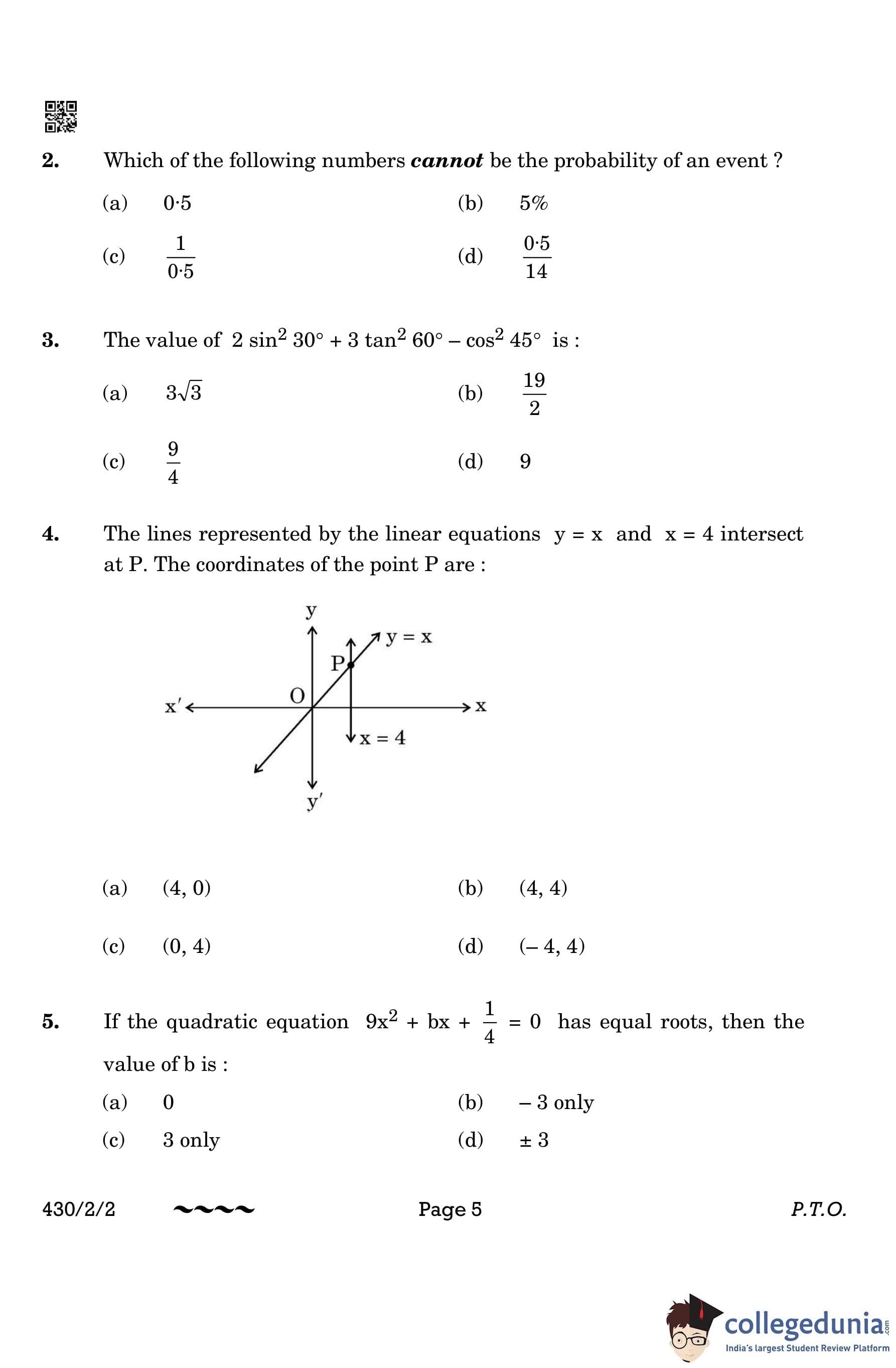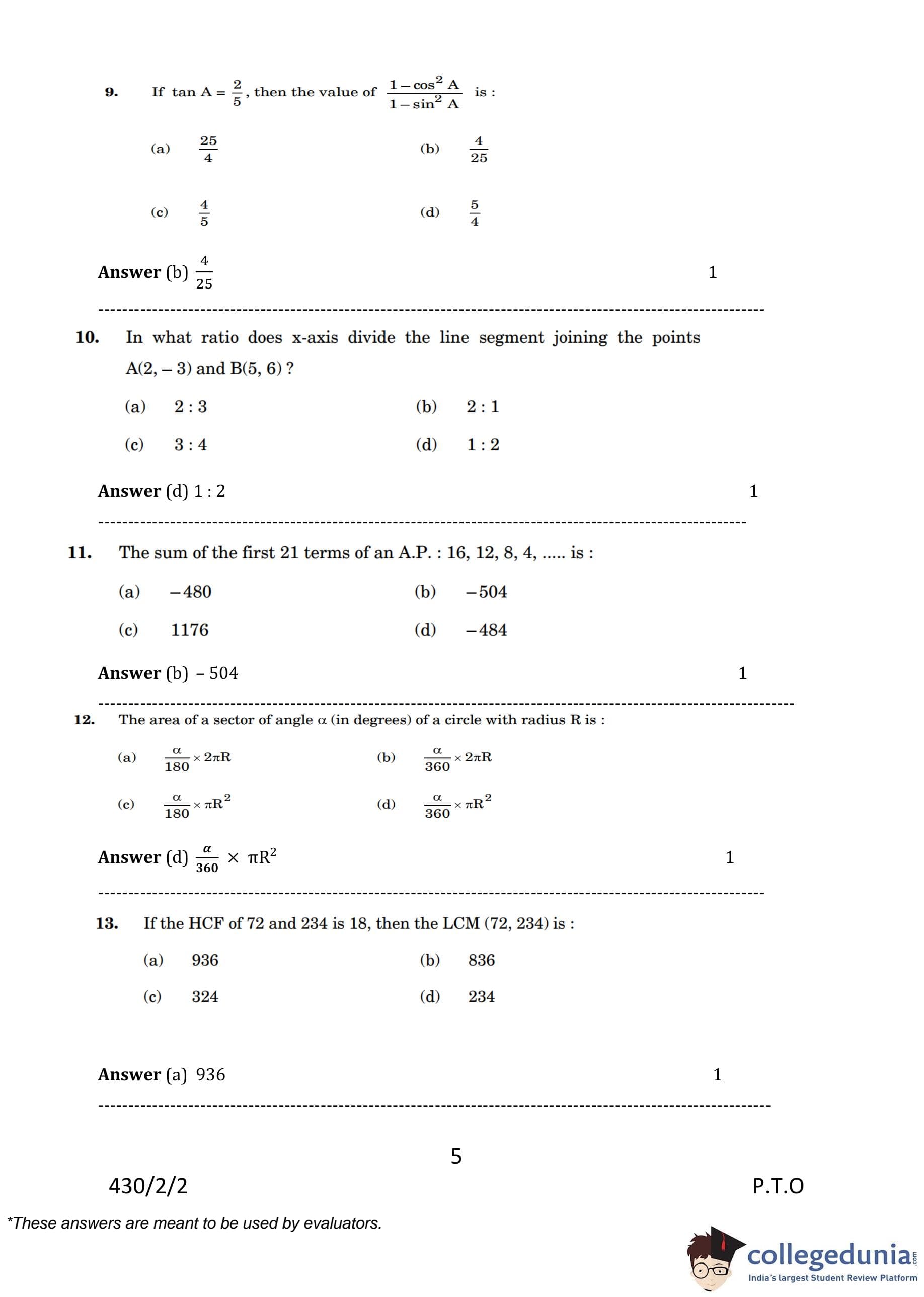 CBSE Class 10 Mathematics Basic Question Paper 2023 with Answer Key (Set 2- 430/2/2) is available for download here. The exam was conducted by the Central Board of Secondary Education on March 21, 2023 in the Morning Session 10:30 AM to 1:30 PM. The medium of paper was English & Hindi. According to initial student reaction, the CBSE Class 10 Mathematics Basic paper was rated as Moderate in difficulty level. The question paper comprised a total of 38 questions divided among 5 sections.
