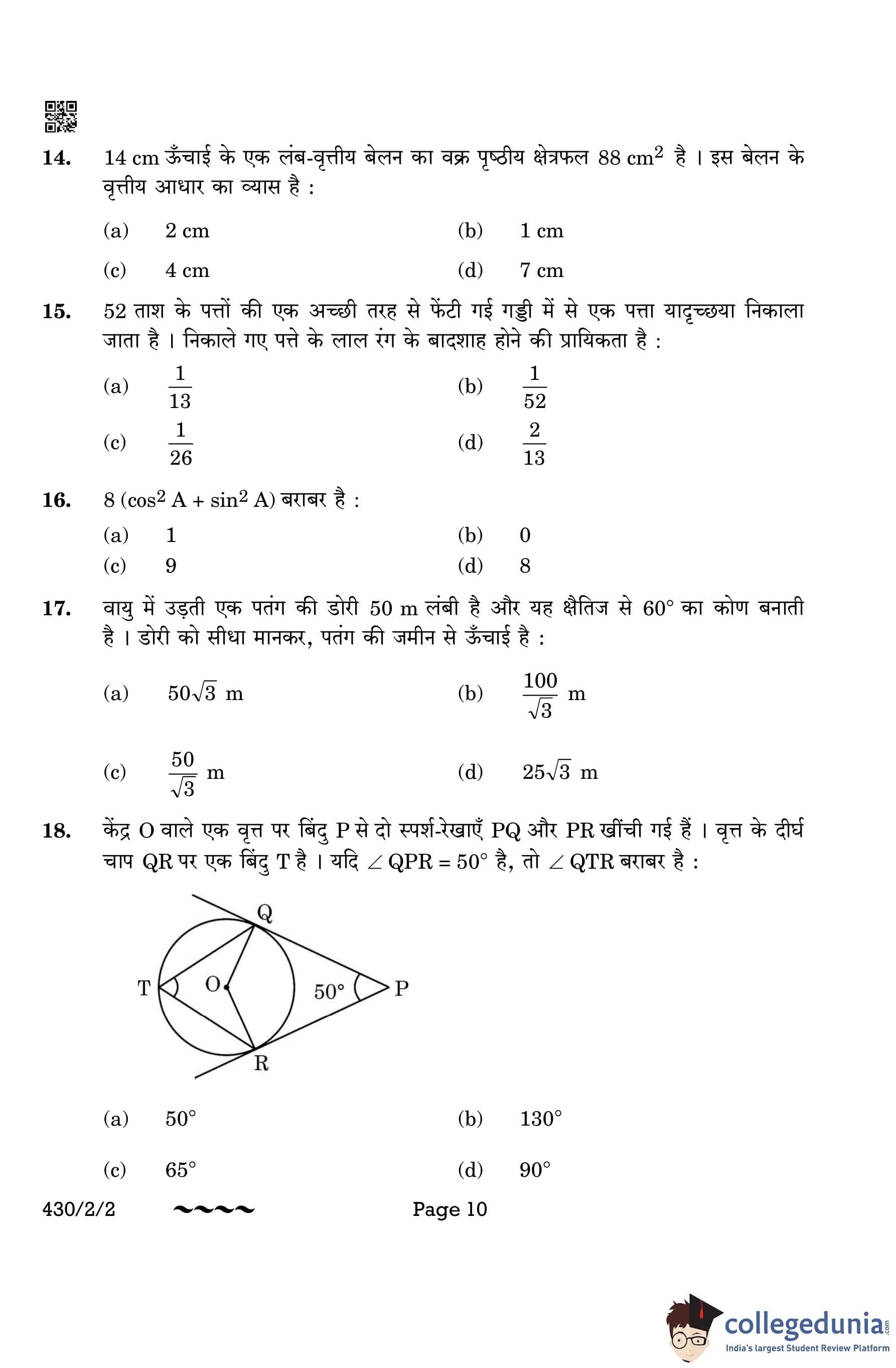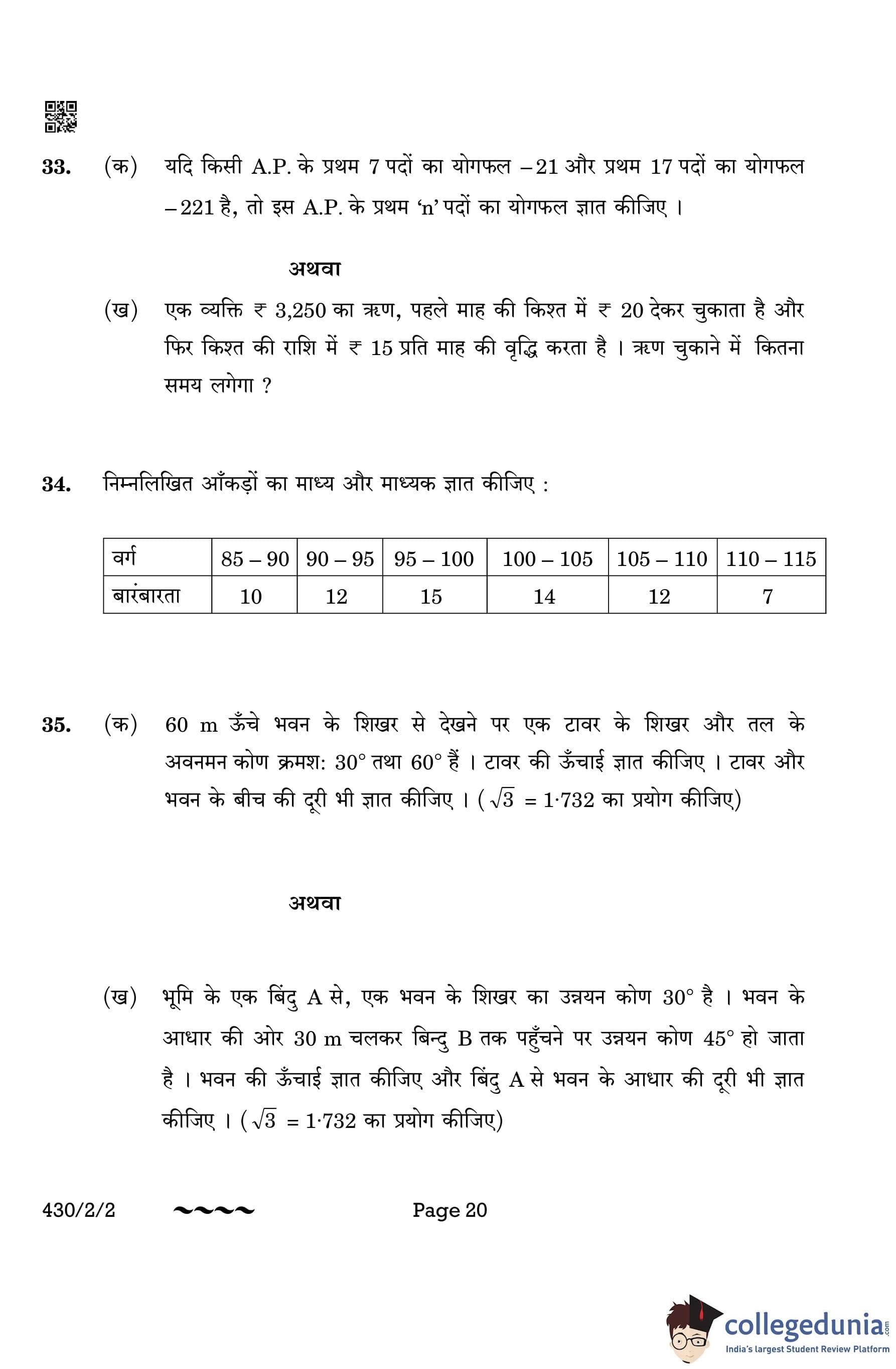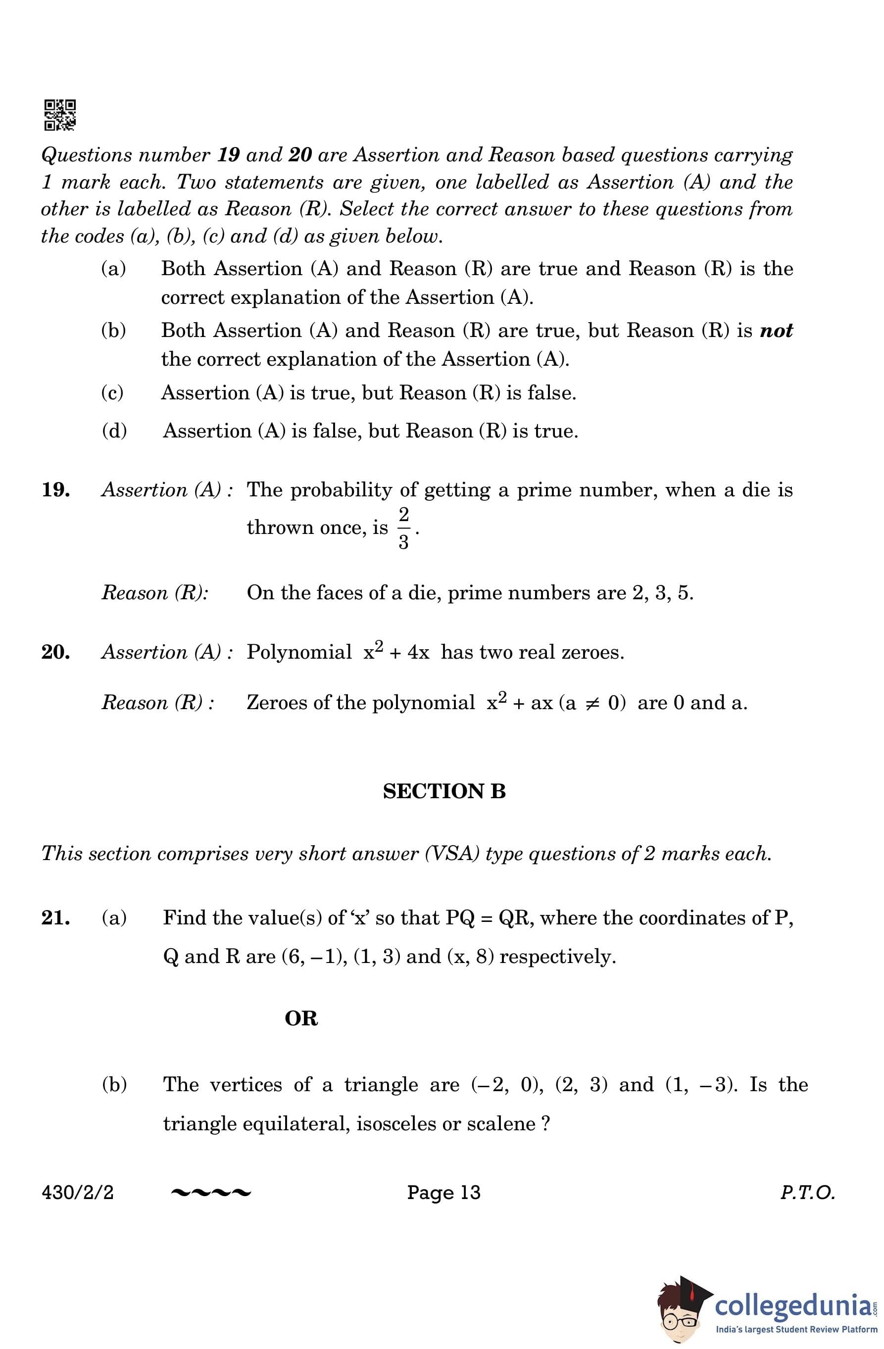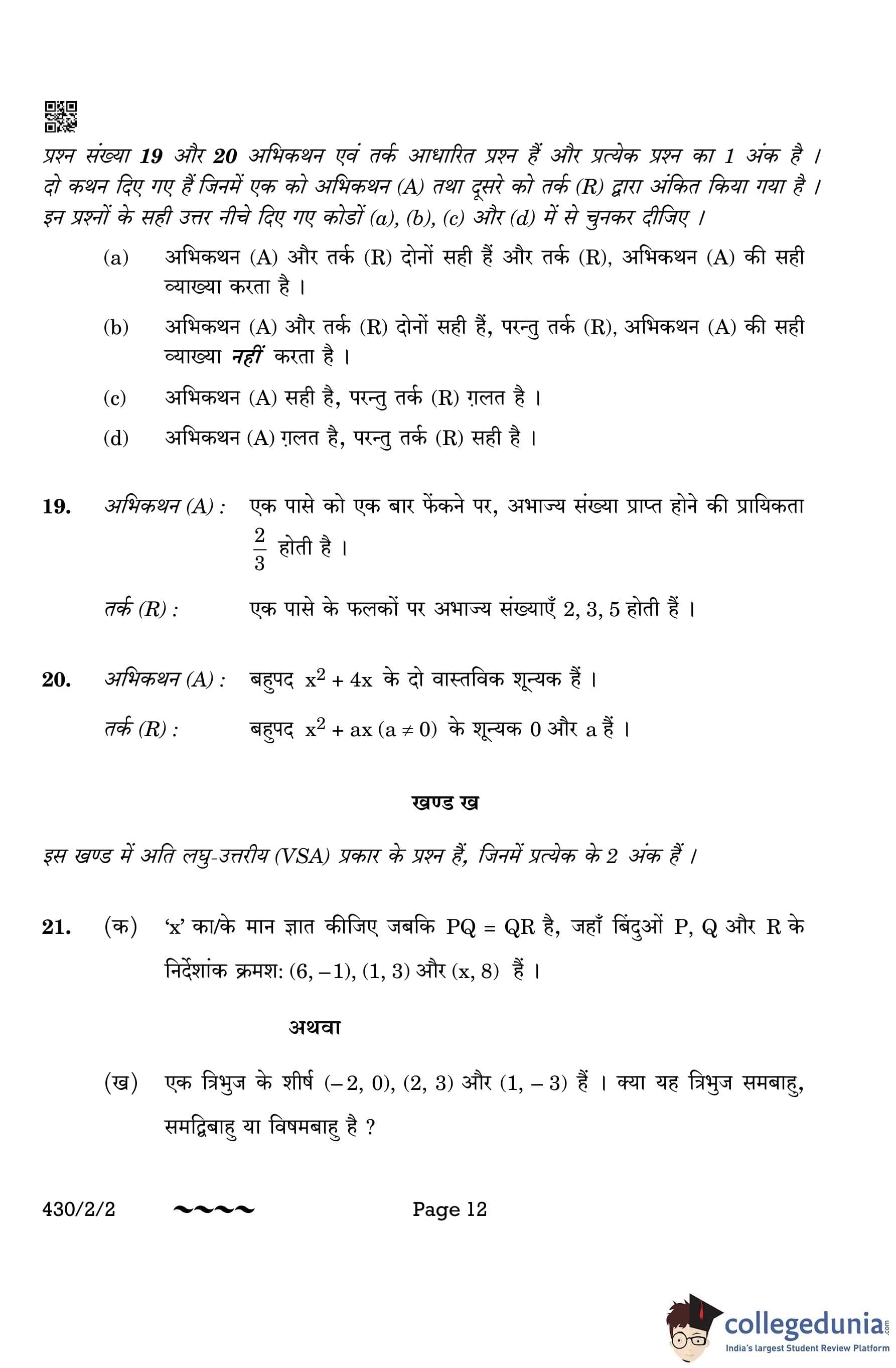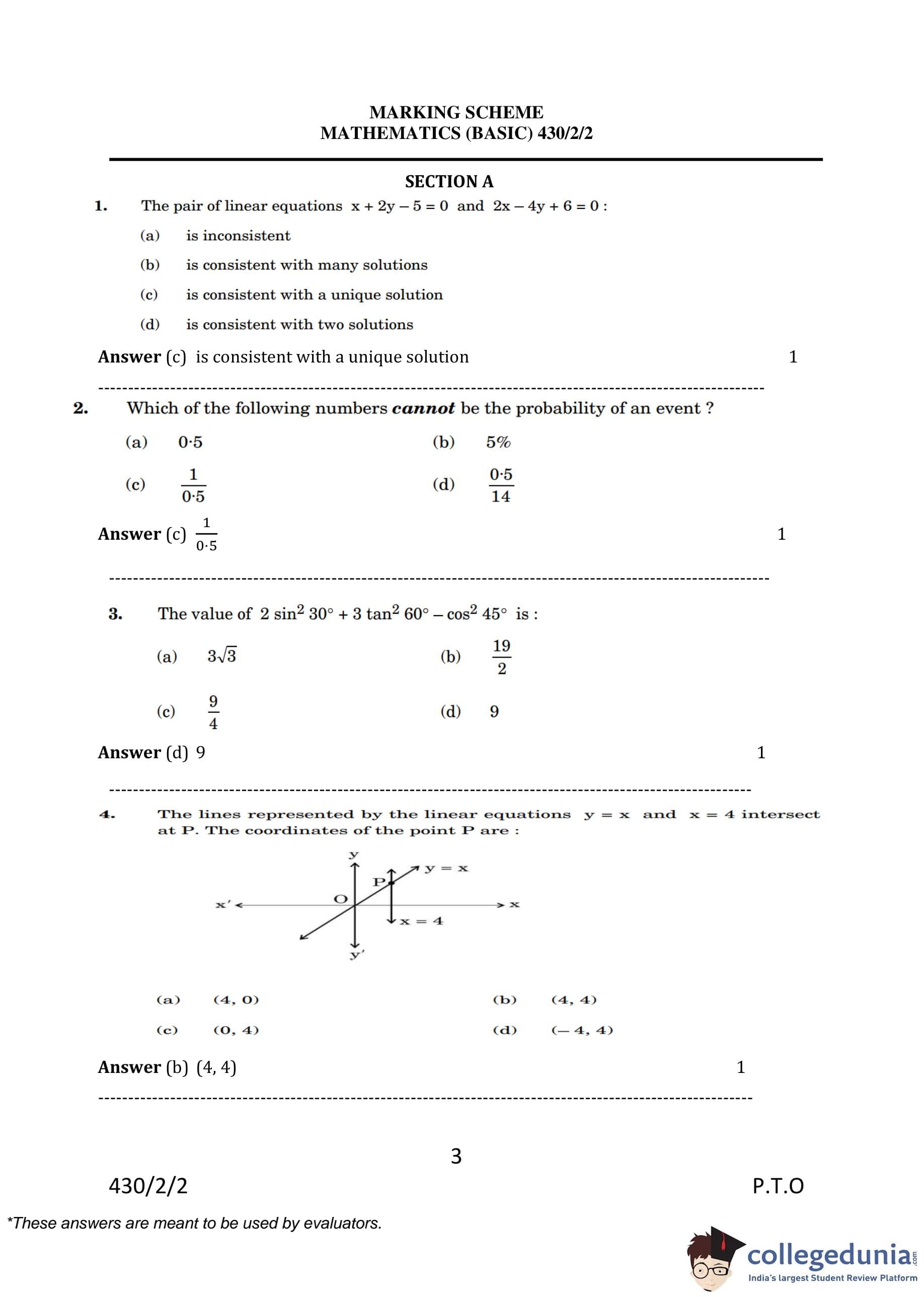 CBSE Class 10 Mathematics Basic Question Paper 2023 with Answer Key (Set 2- 430/2/2) is available for download here. The exam was conducted by the Central Board of Secondary Education on March 21, 2023 in the Morning Session 10:30 AM to 1:30 PM. The medium of paper was English & Hindi. According to initial student reaction, the CBSE Class 10 Mathematics Basic paper was rated as Moderate in difficulty level. The question paper comprised a total of 38 questions divided among 5 sections.
