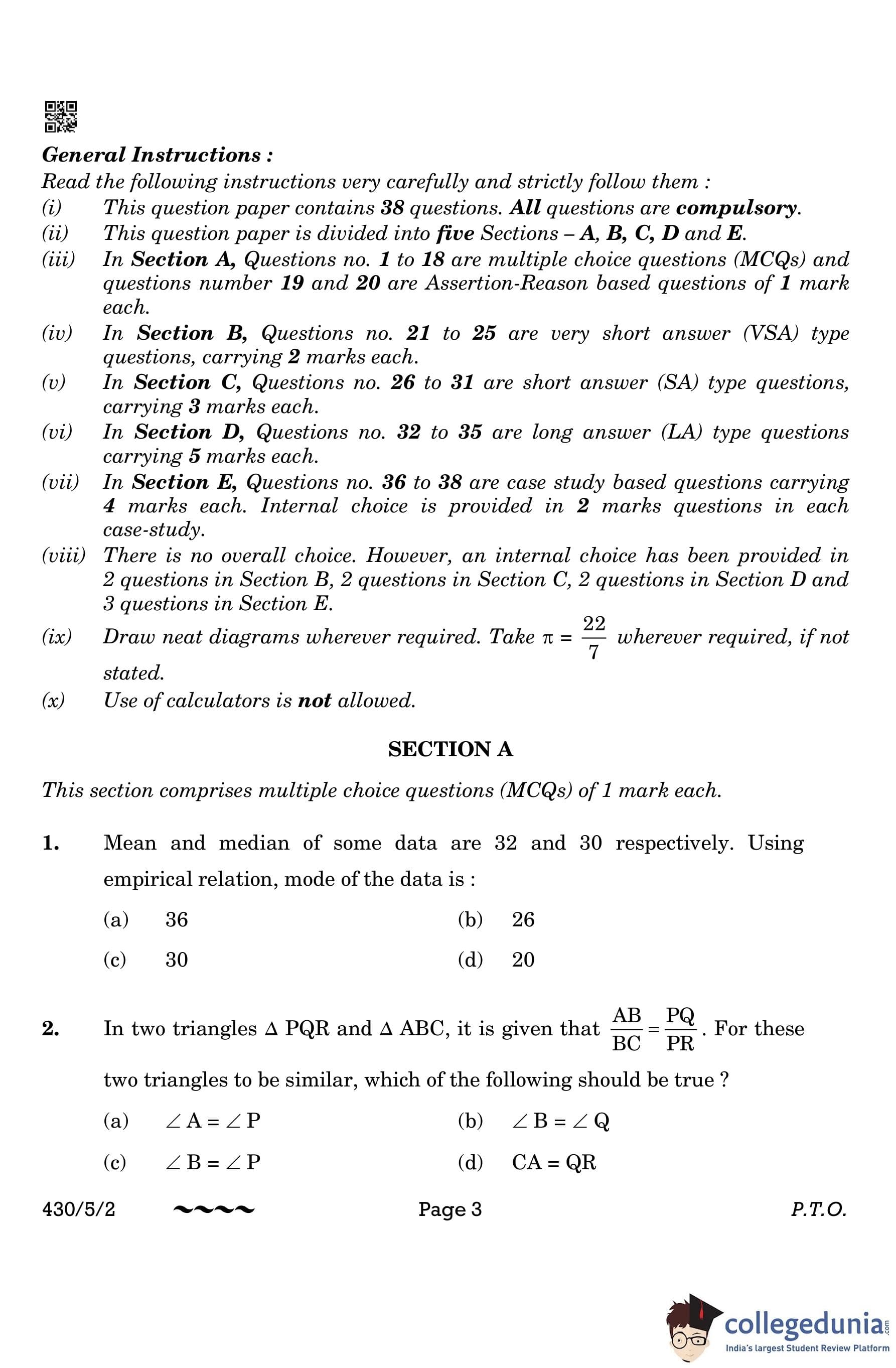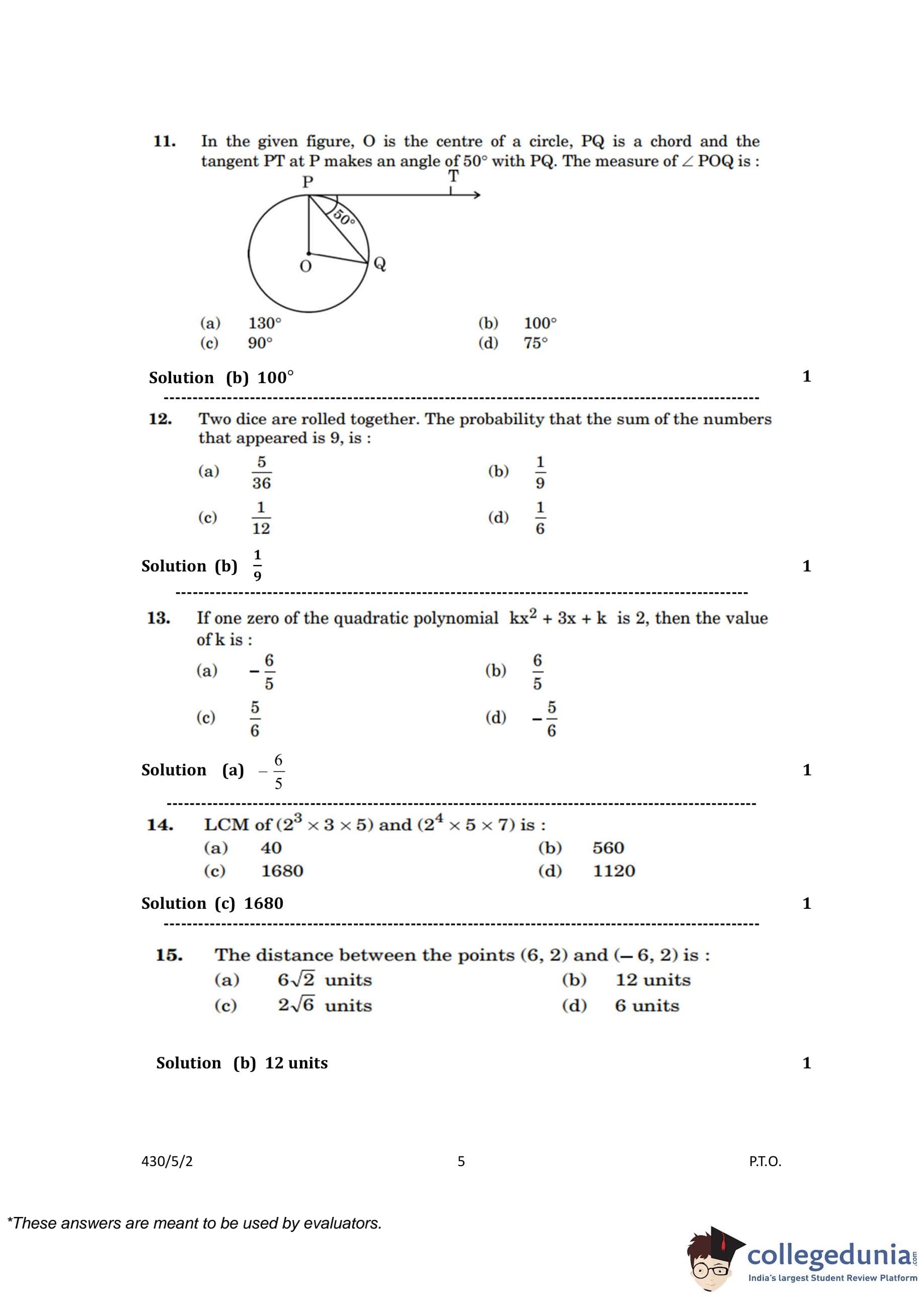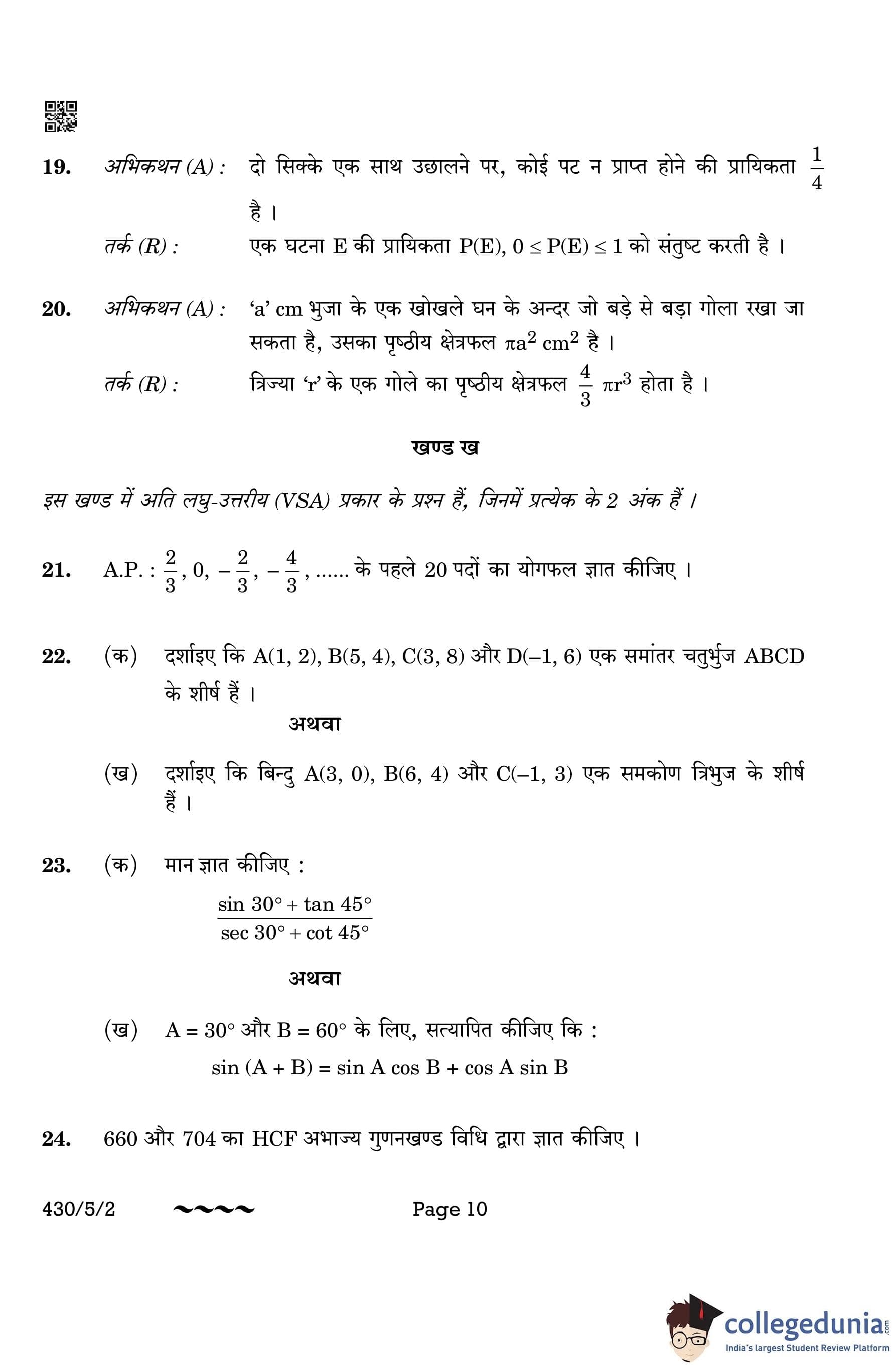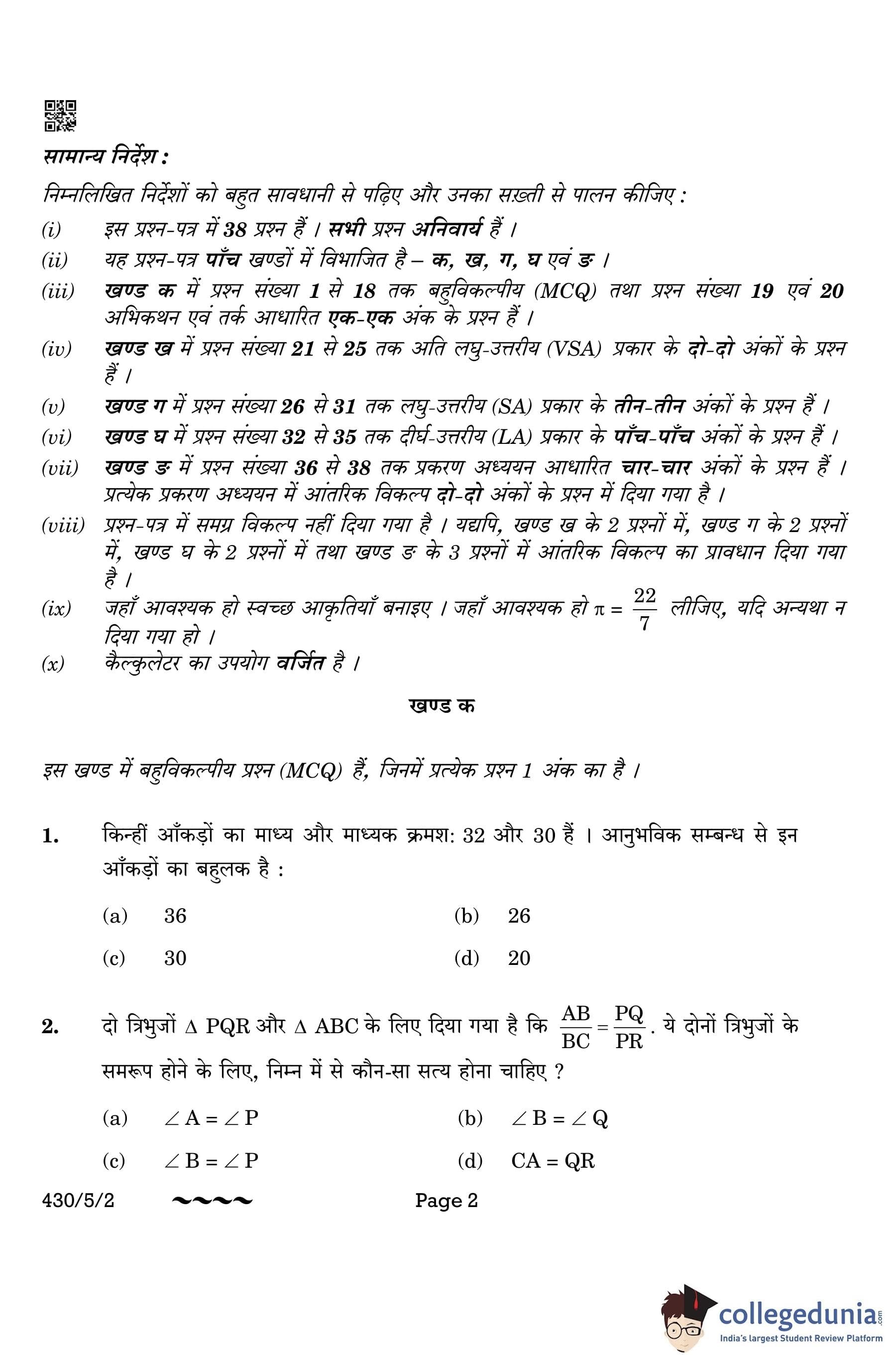 CBSE Class 10 Mathematics Basic Question Paper 2023 with Answer Key (Set 2- 430/5/2) is available for download here. The exam was conducted by the Central Board of Secondary Education on March 21, 2023 in the Morning Session 10:30 AM to 1:30 PM. The medium of paper was English & Hindi. According to initial student reaction, the CBSE Class 10 Mathematics Basic paper was rated as Moderate in difficulty level. The question paper comprised a total of 38 questions divided among 5 sections.