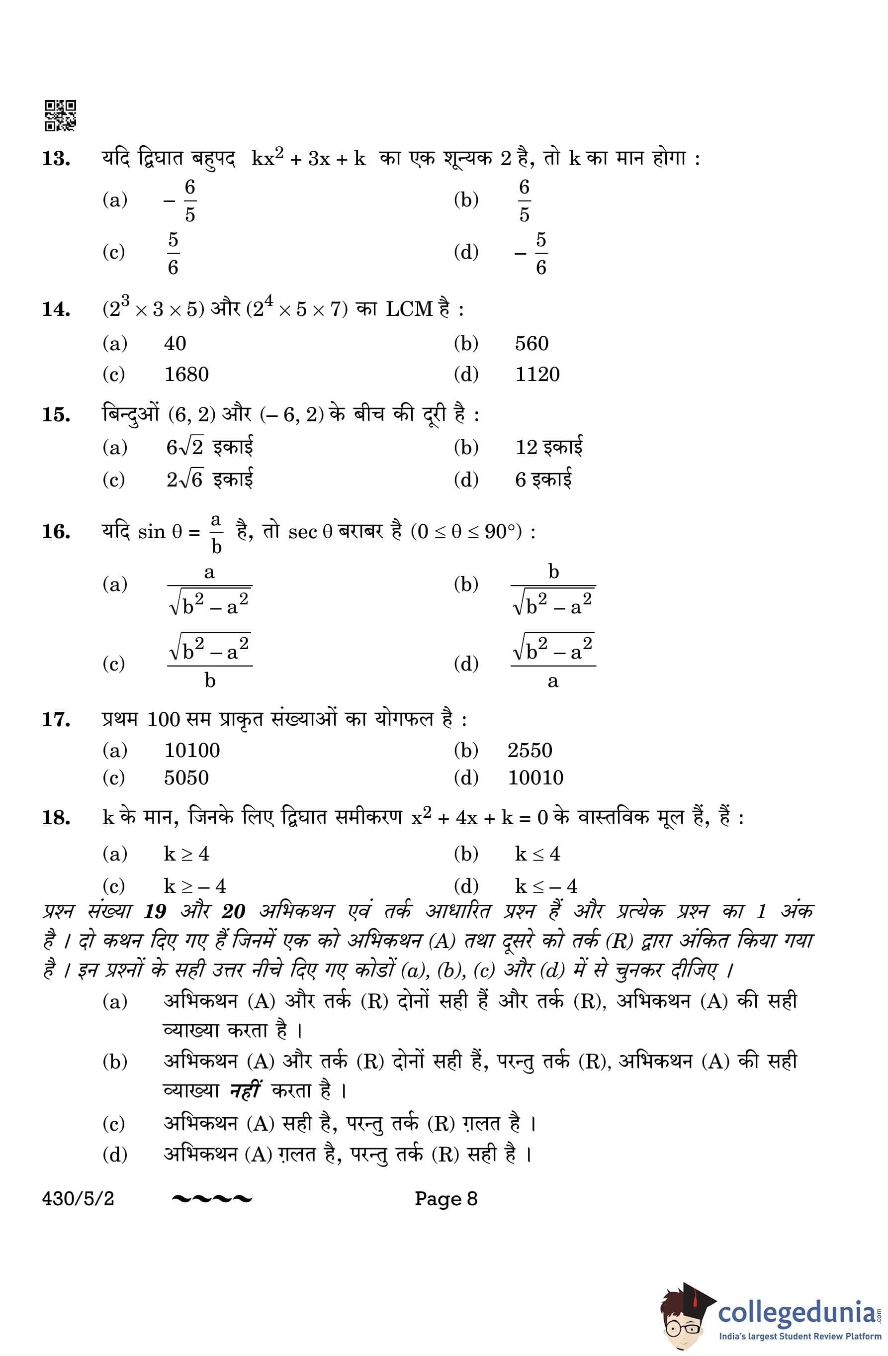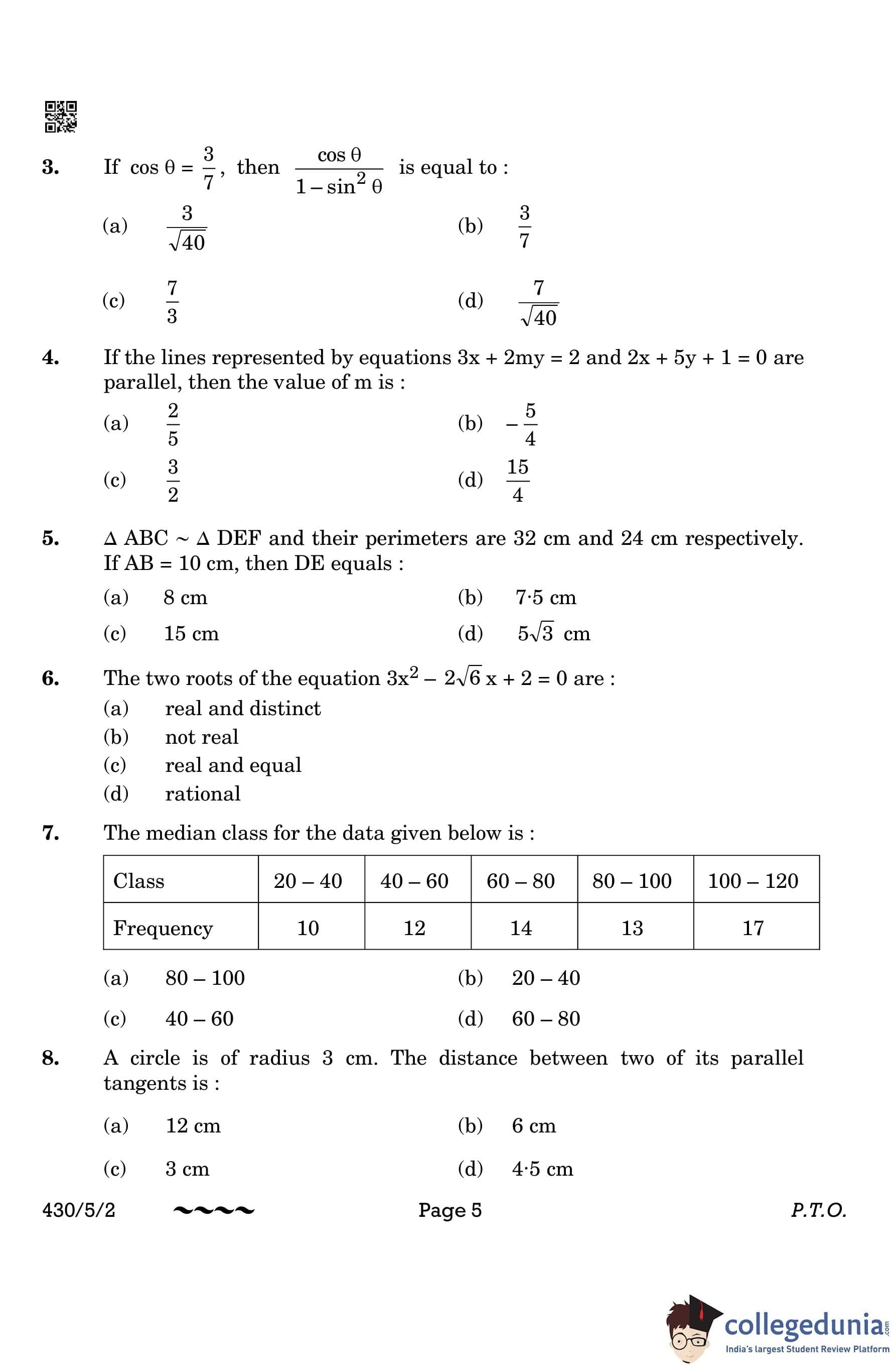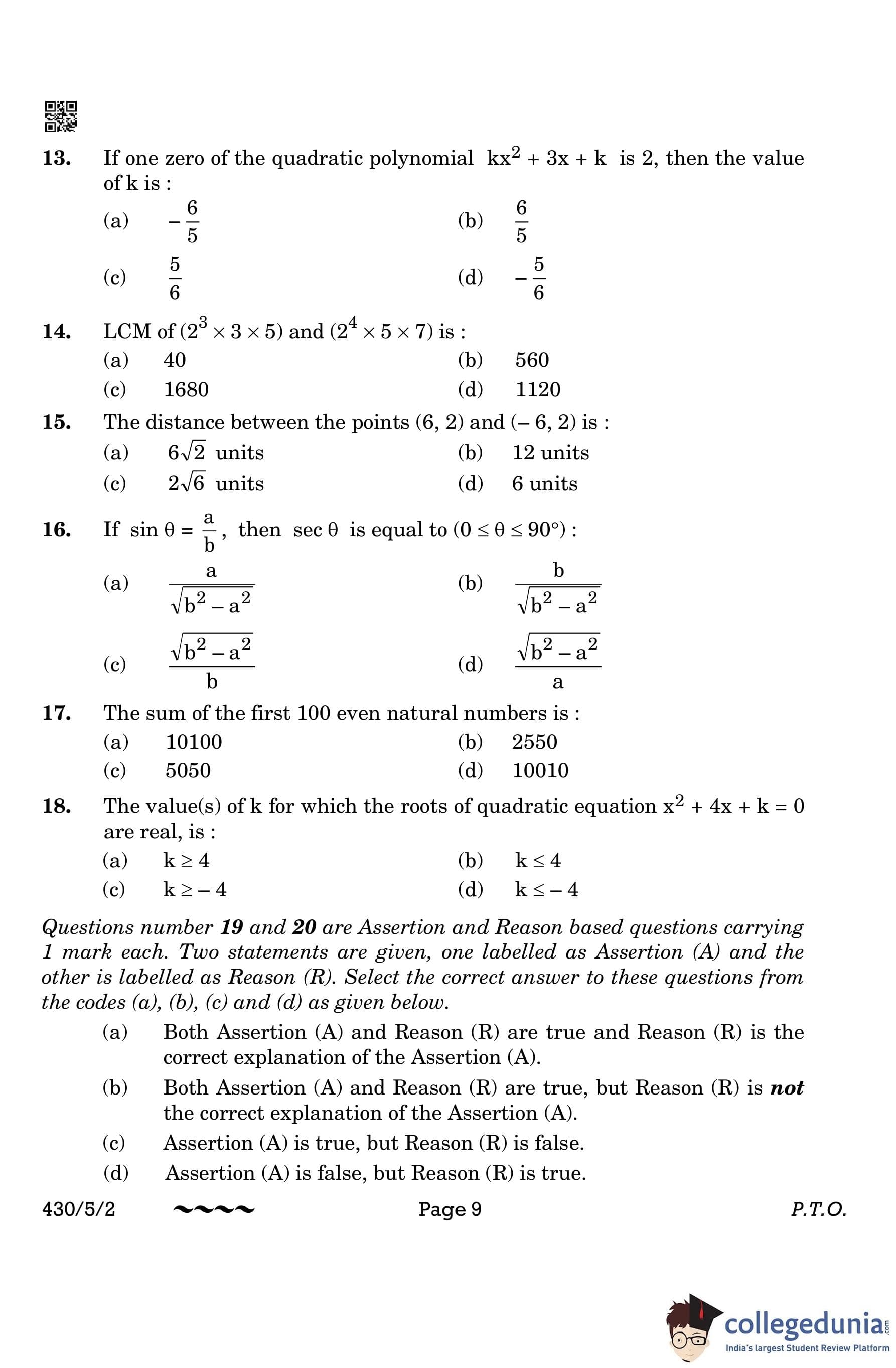 CBSE Class 10 Mathematics Basic Question Paper 2023 with Answer Key (Set 2- 430/5/2) is available for download here. The exam was conducted by the Central Board of Secondary Education on March 21, 2023 in the Morning Session 10:30 AM to 1:30 PM. The medium of paper was English & Hindi. According to initial student reaction, the CBSE Class 10 Mathematics Basic paper was rated as Moderate in difficulty level. The question paper comprised a total of 38 questions divided among 5 sections.