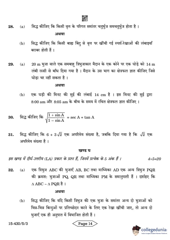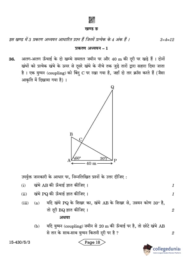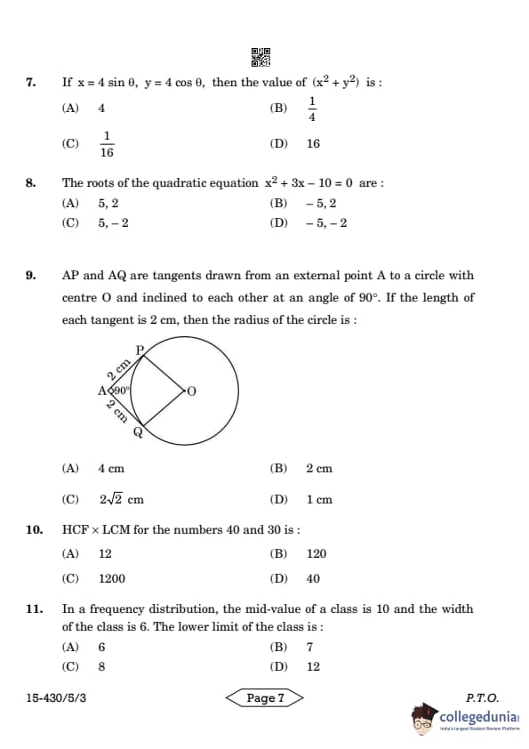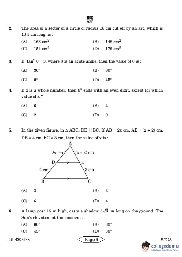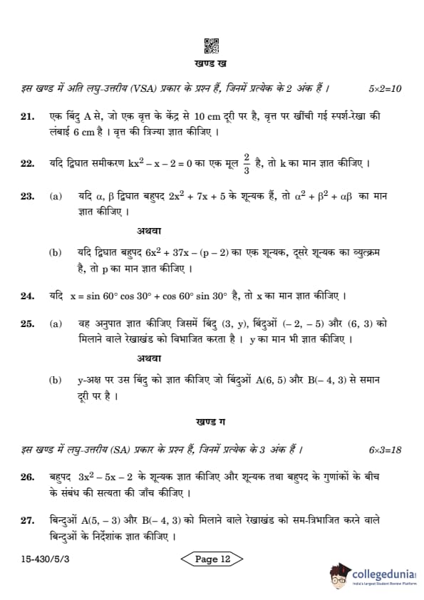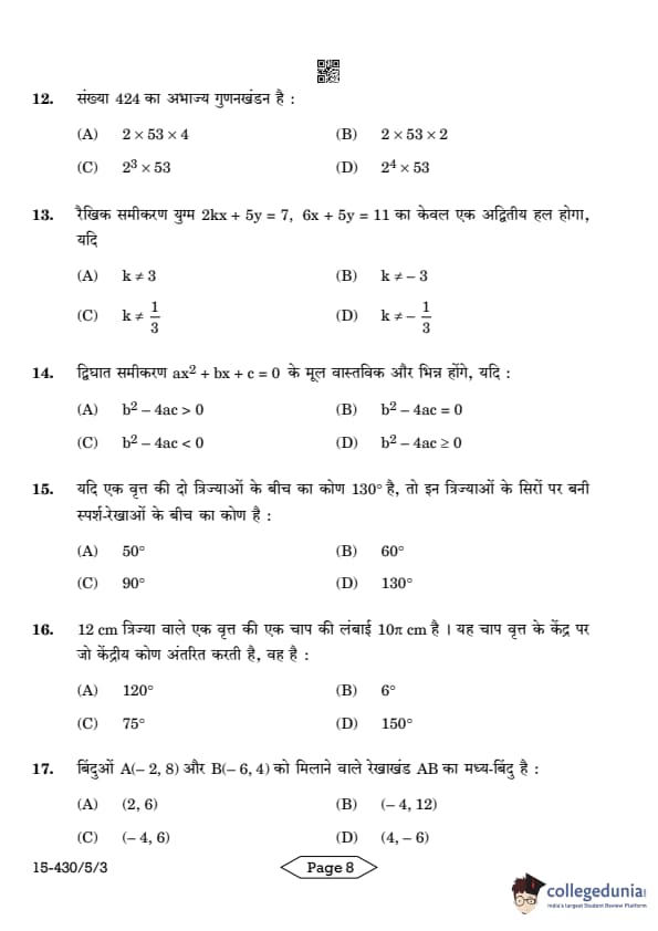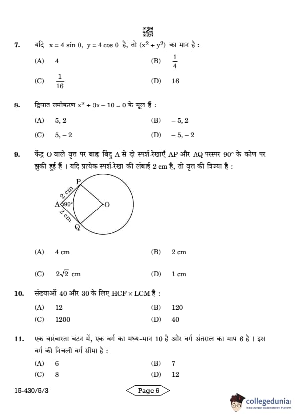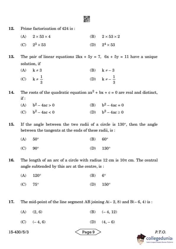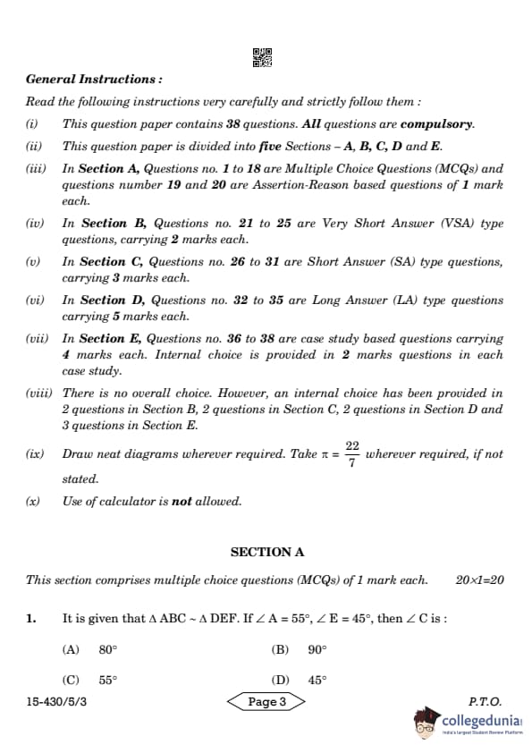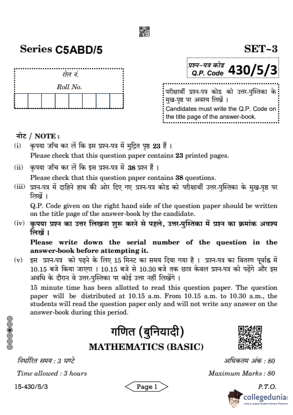 CBSE Class 10 Mathematics Basic Question Paper 2024 PDF (Set 3- 430/5/3) is available for download here. CBSE conducted the Mathematics Basic exam on March 11, 2024 from 10:30 AM to 1:30 PM. The total marks for the theory paper are 80. The question paper contains 20% MCQ-based questions, 40% competency-based questions, and 40% short and long answer type questions.