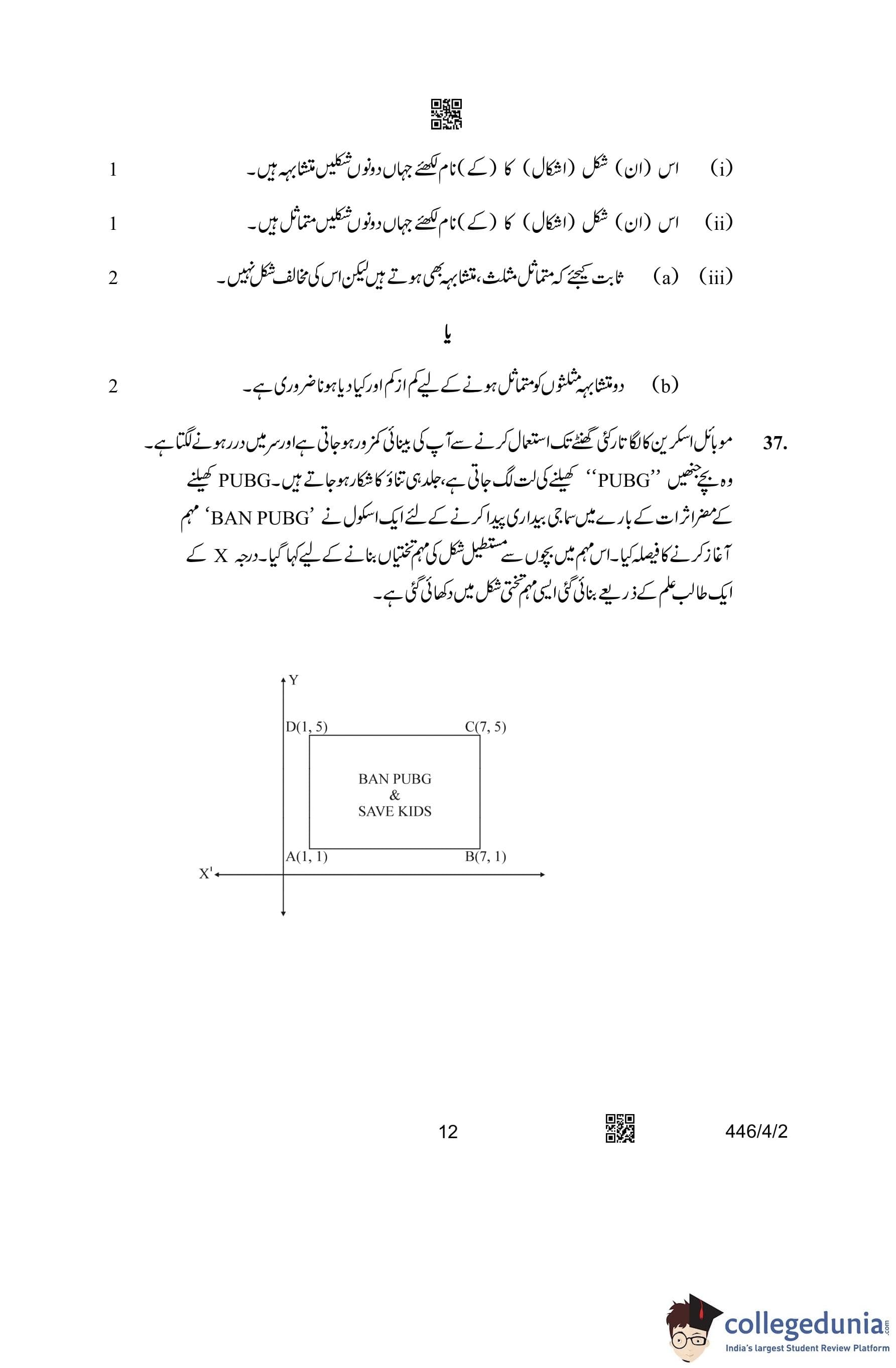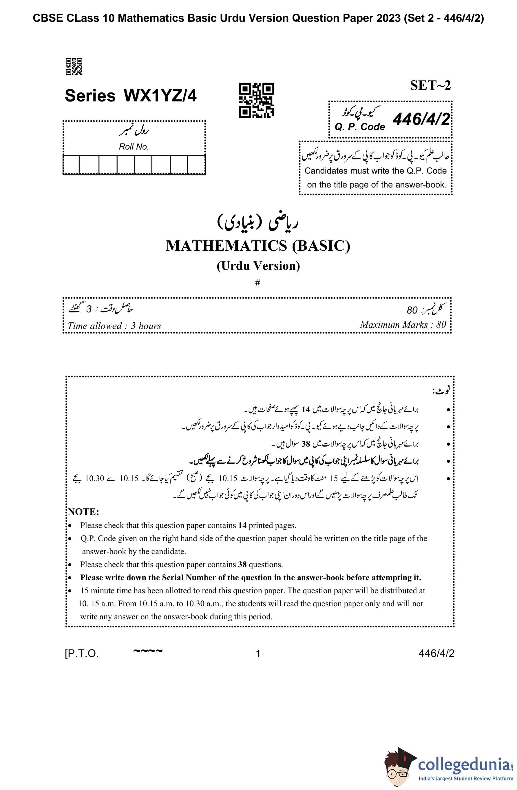 CBSE Class 10 Mathematics Basic Question Paper 2023 with Answer Key (Urdu Version) (Set 2) is available for download here. The exam was conducted by the Central Board of Secondary Education on March 21, 2023 in the Morning Session 10:30 AM to 1:30 PM. The medium of paper was Urdu. According to initial student reaction, the CBSE Class 10 Mathematics Basic paper was rated as Moderate in difficulty level. The question paper comprised a total of 38 questions divided among 5 sections.