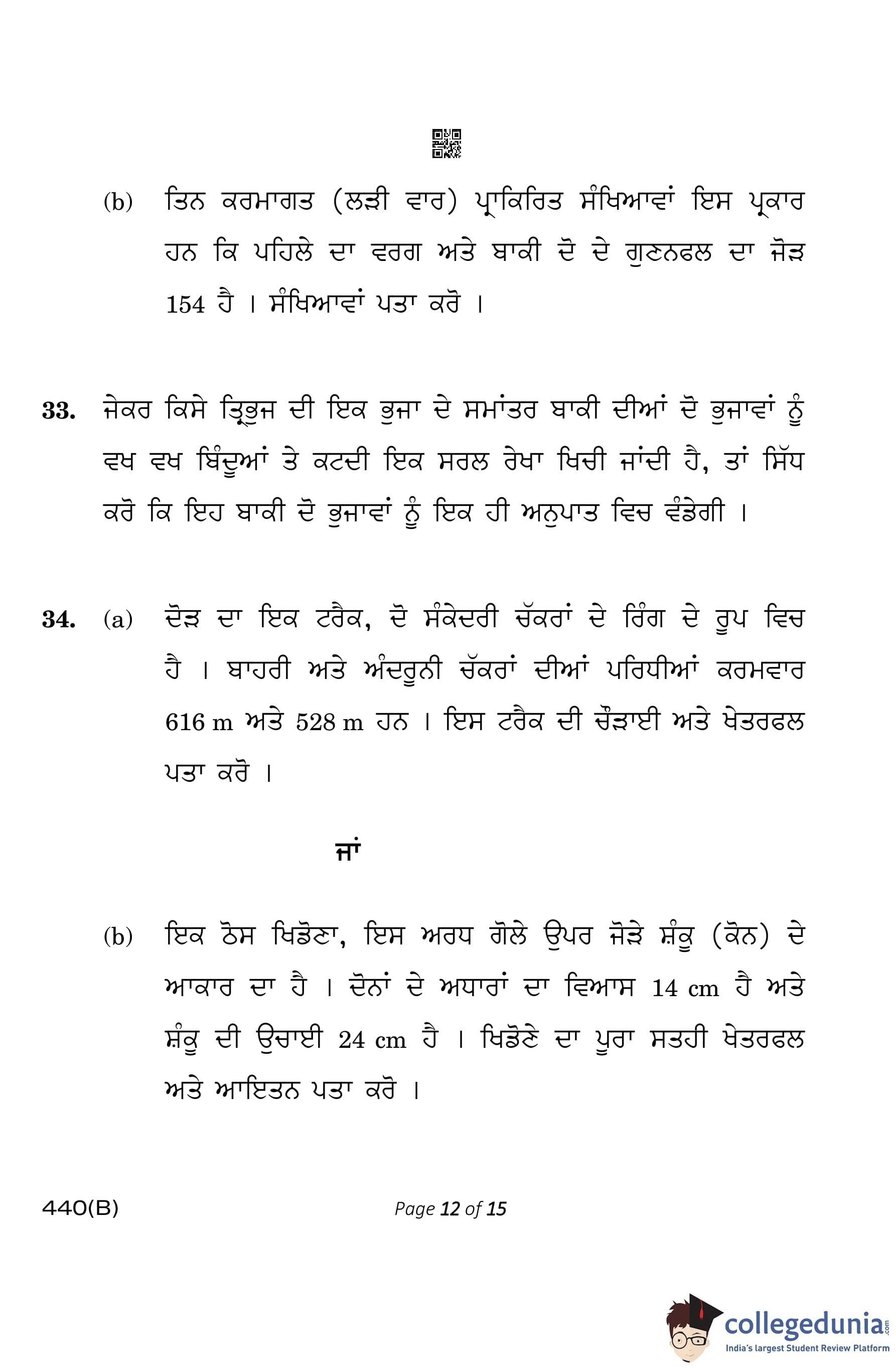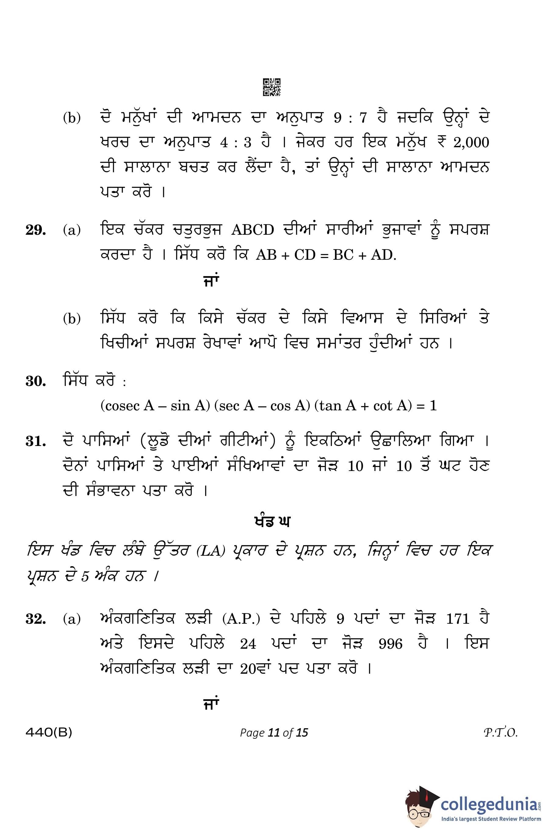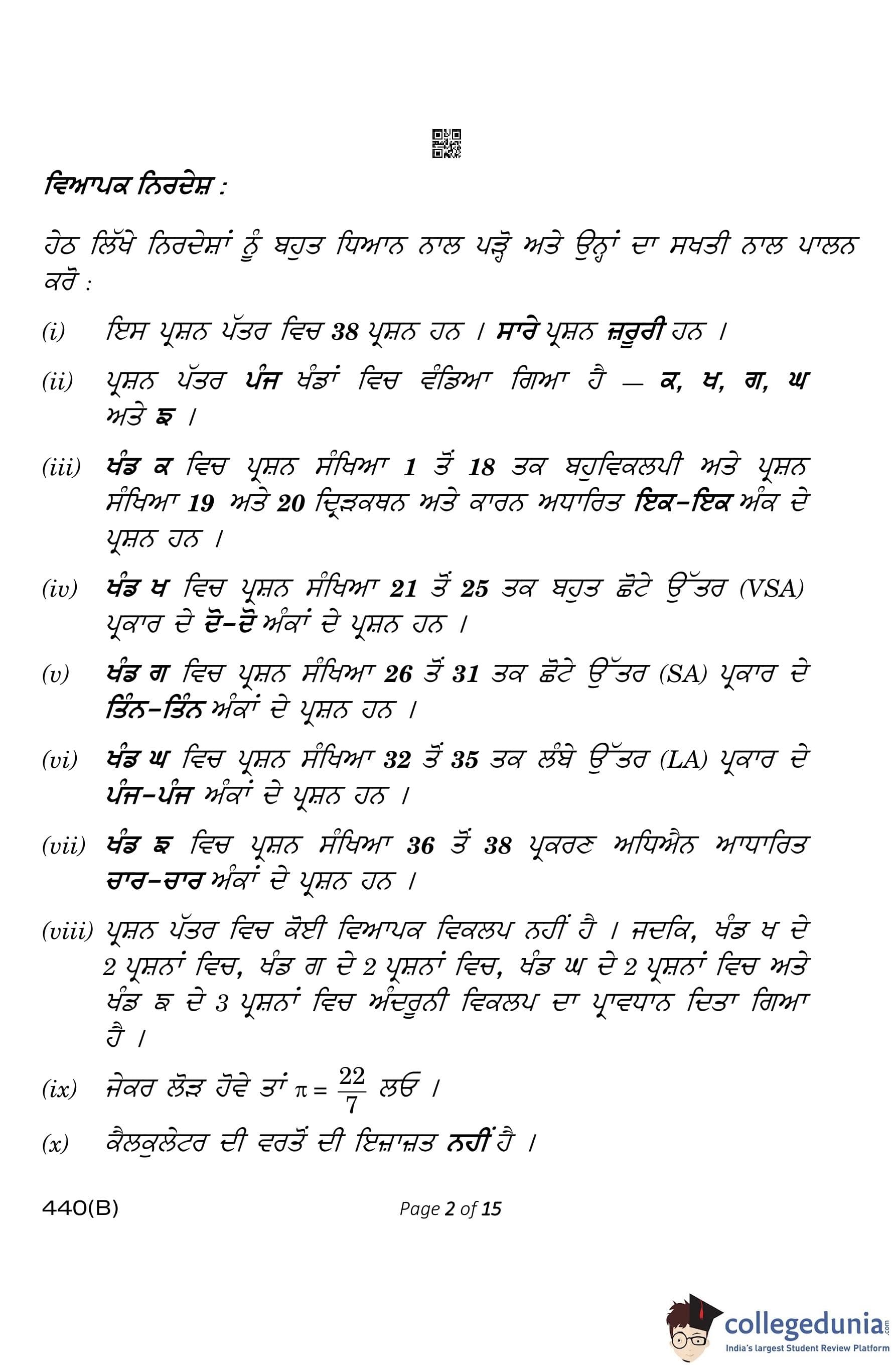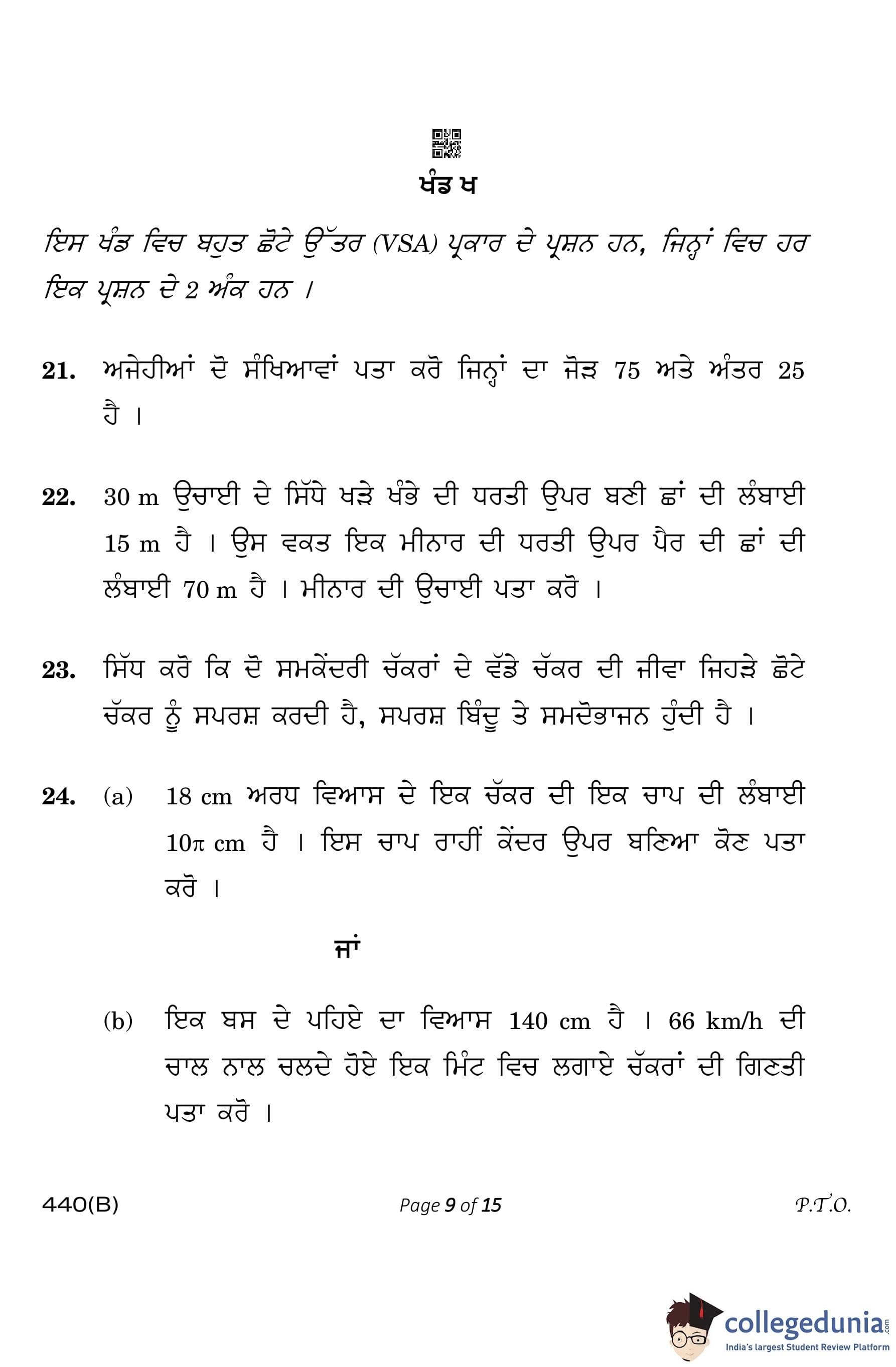 CBSE Class 10 Mathematics Basic (Visually Impaired Candidates) Punjabi Question Paper 2023 with Answer Key