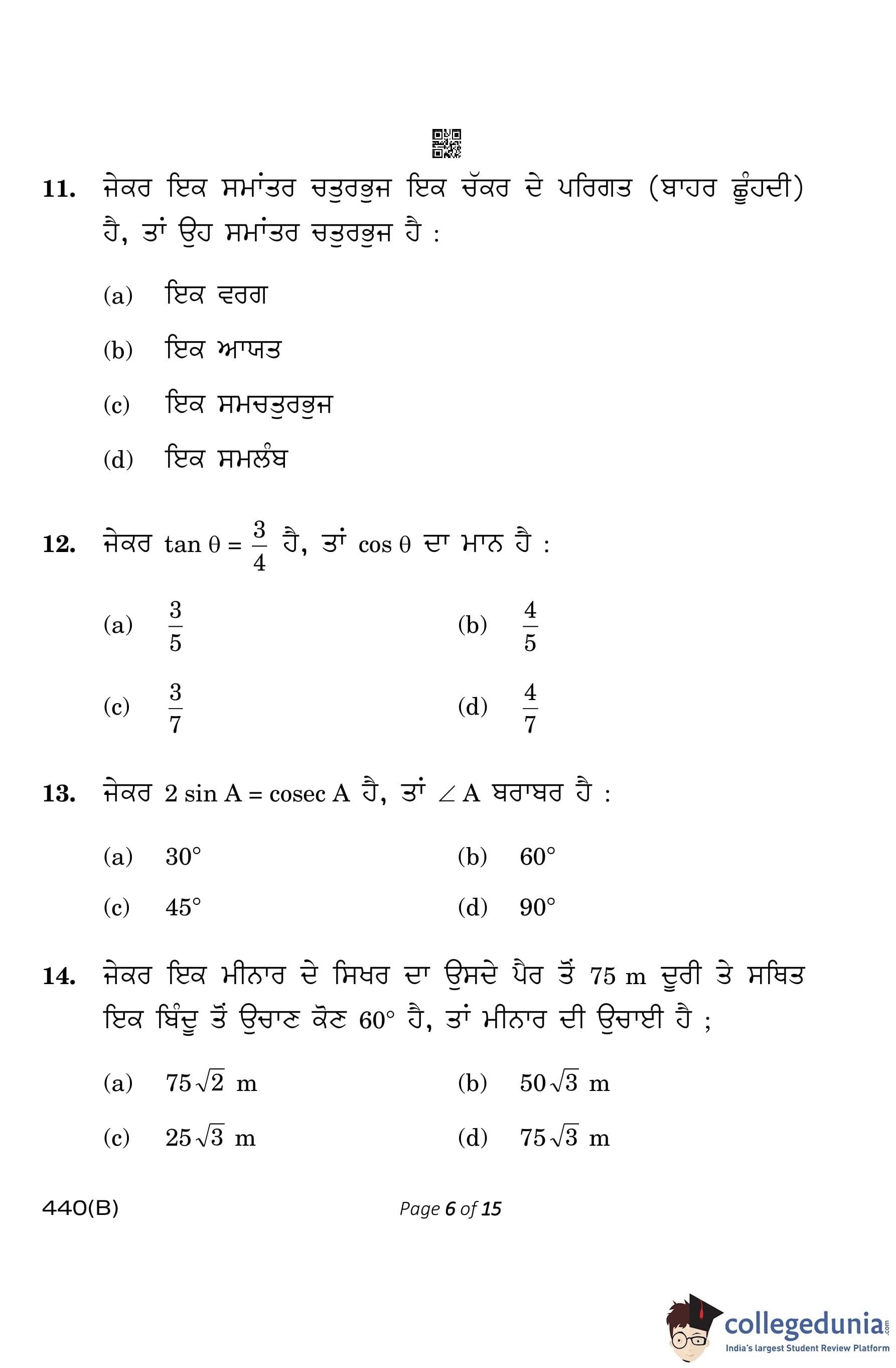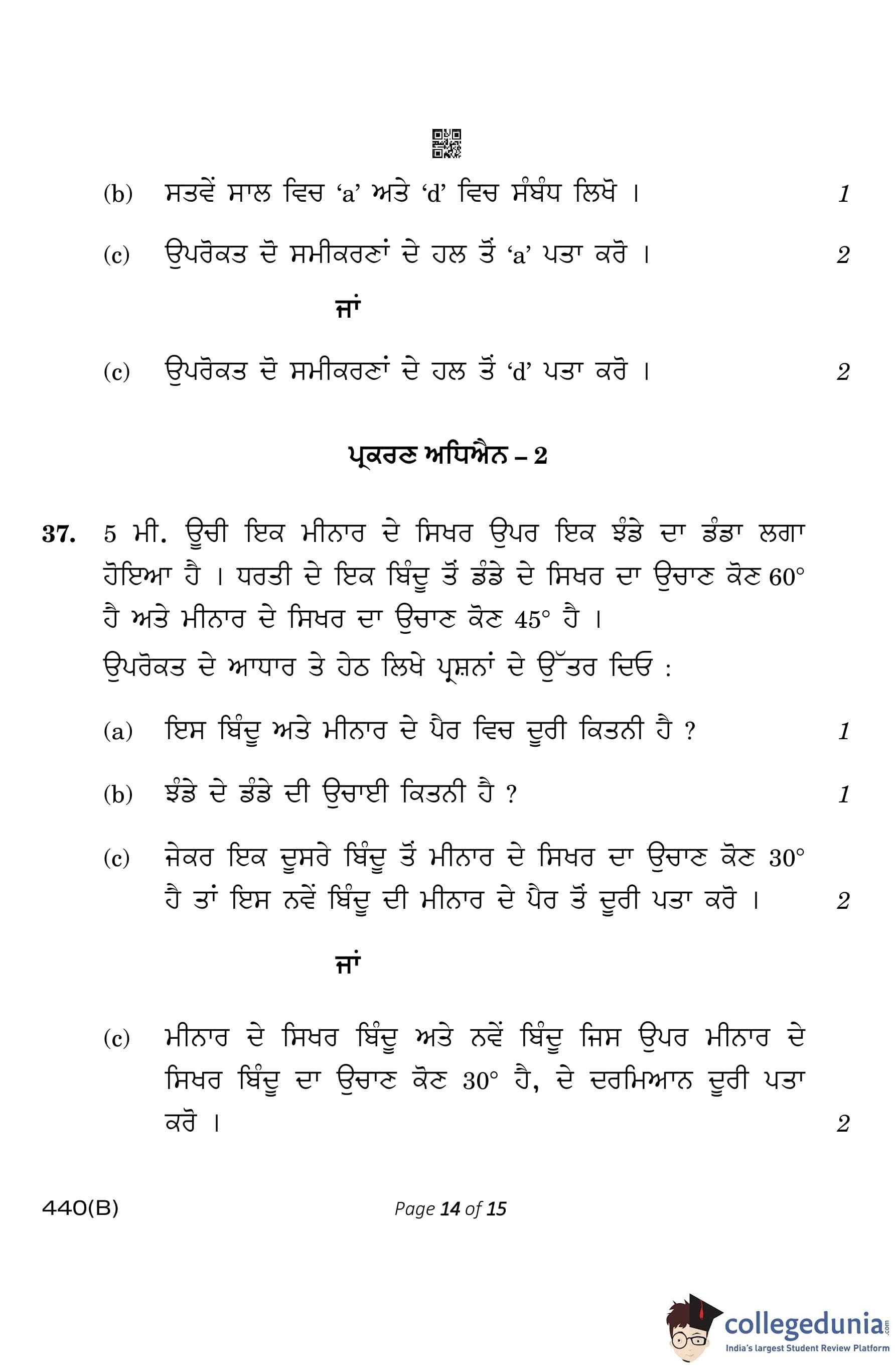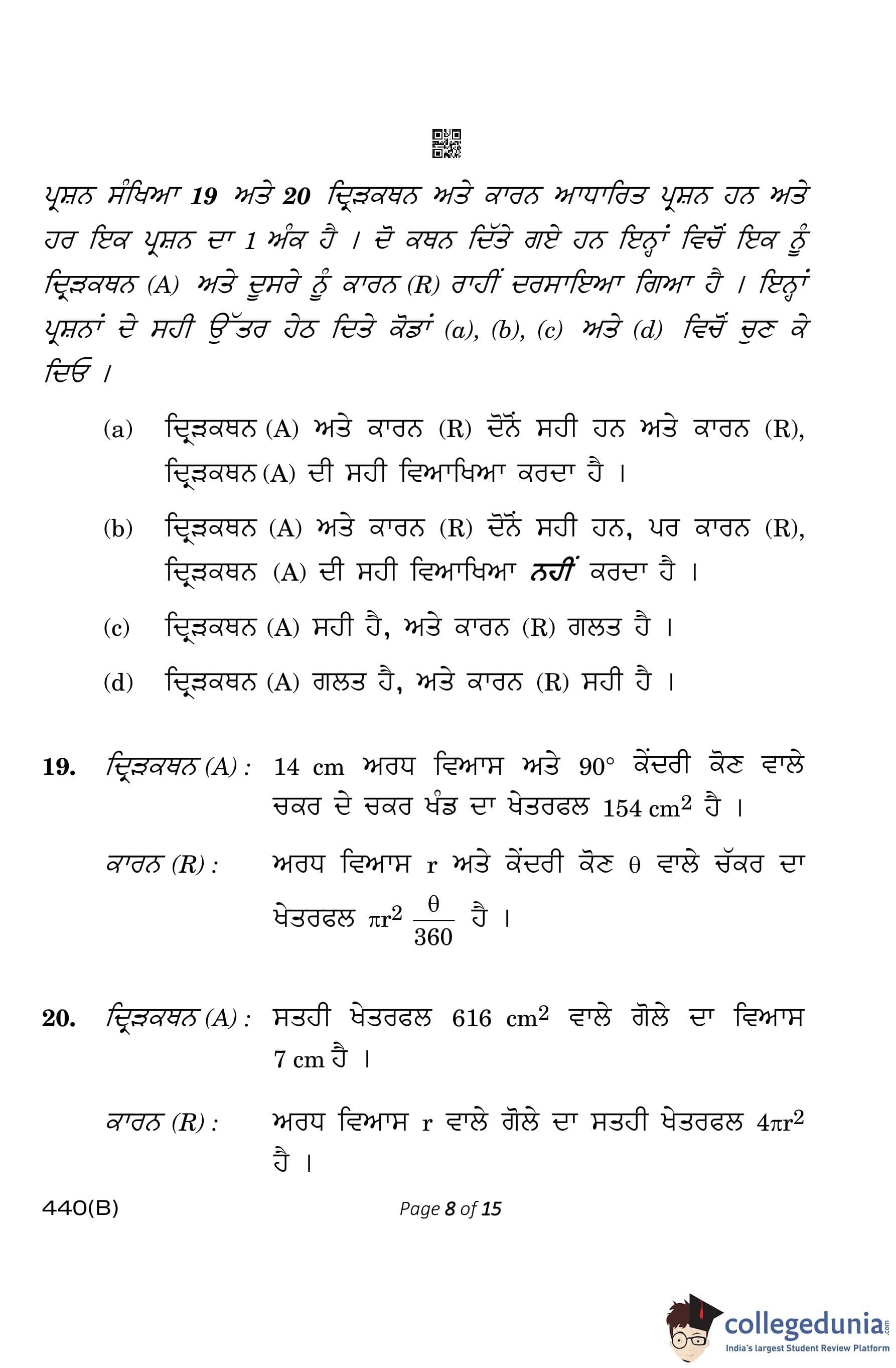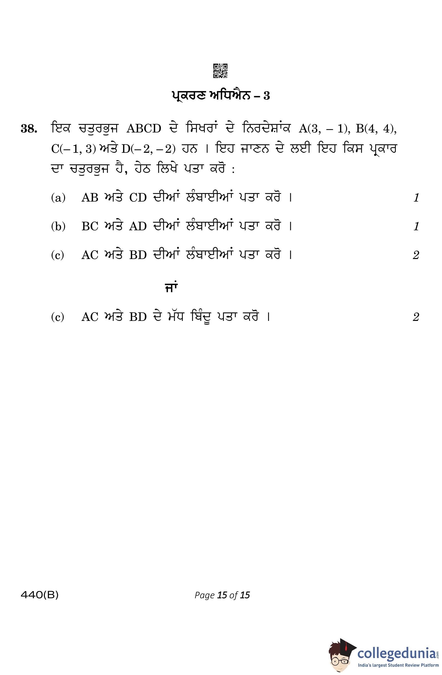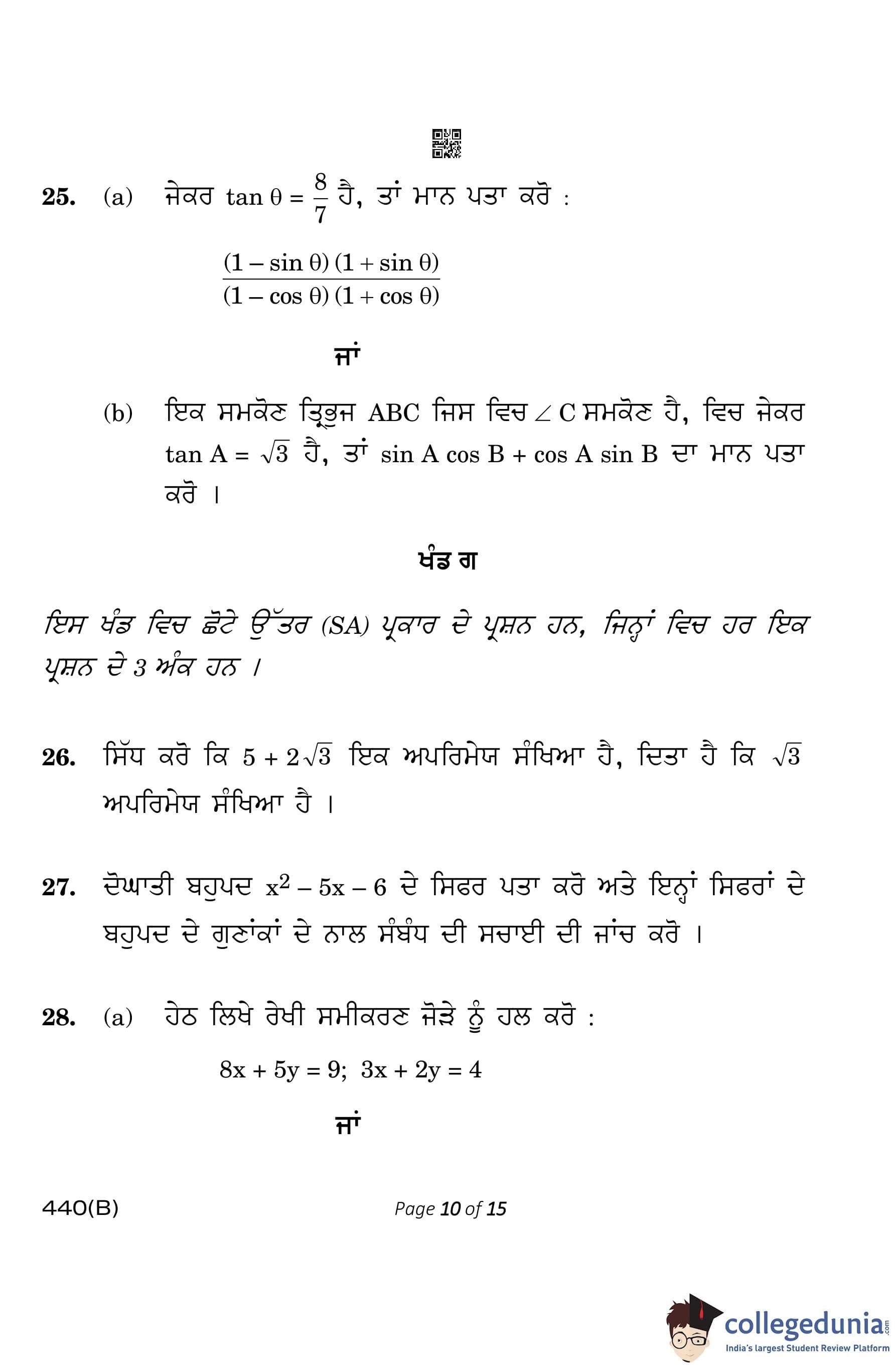 CBSE Class 10 Mathematics Basic (Visually Impaired Candidates) Punjabi Question Paper 2023 with Answer Key