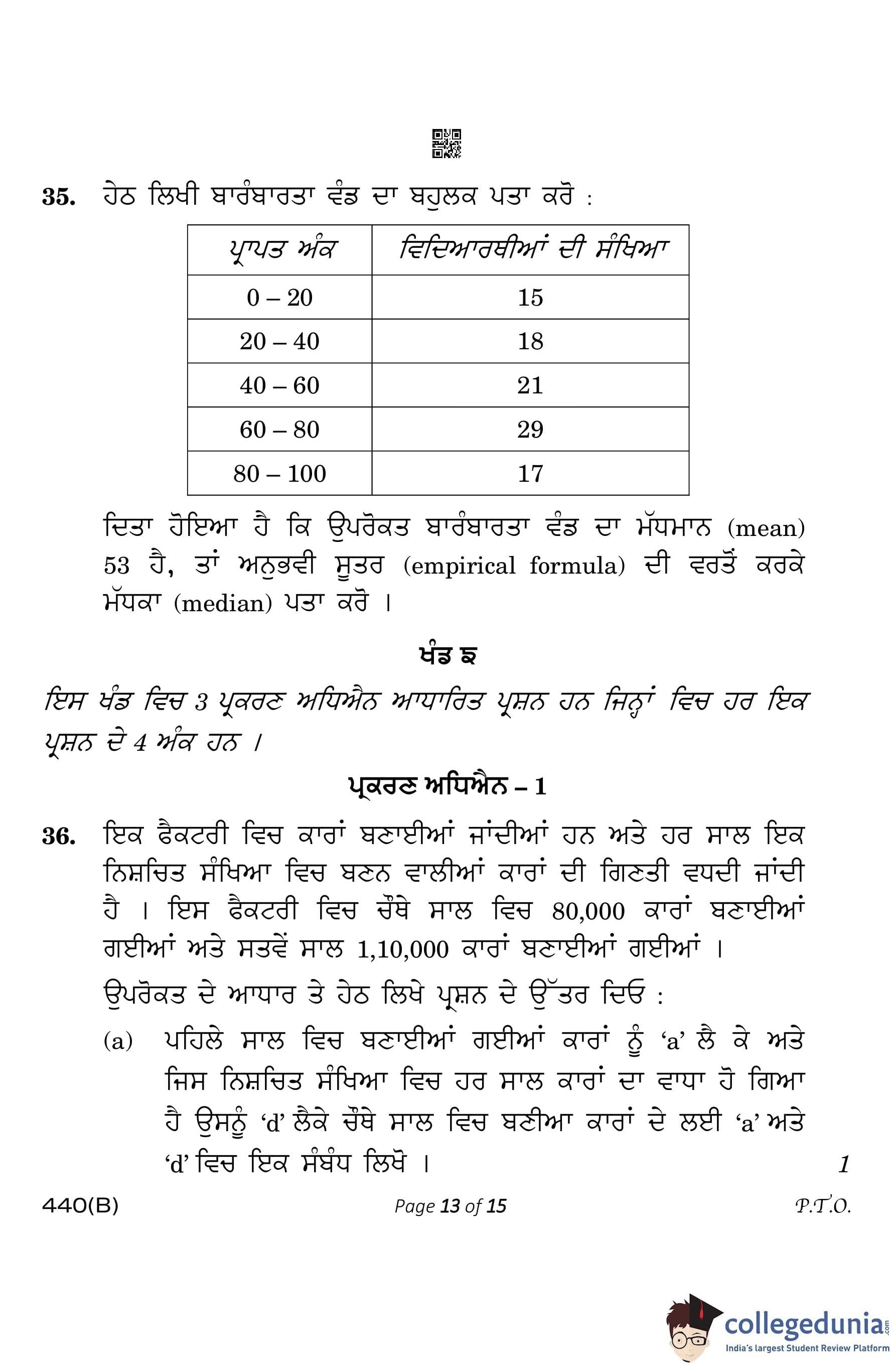 CBSE Class 10 Mathematics Basic Punjabi Question Paper 2023 with Answer Key (Visually Impaired Candidates) is available for download here. The exam was conducted by the Central Board of Secondary Education on March 21, 2023 in the Morning Session 10:30 AM to 1:30 PM. The medium of paper was Punjabi. According to initial student reaction, the CBSE Class 10 Mathematics Basic paper was rated as Moderate in difficulty level. The question paper comprised a total of 38 questions divided among 5 sections.