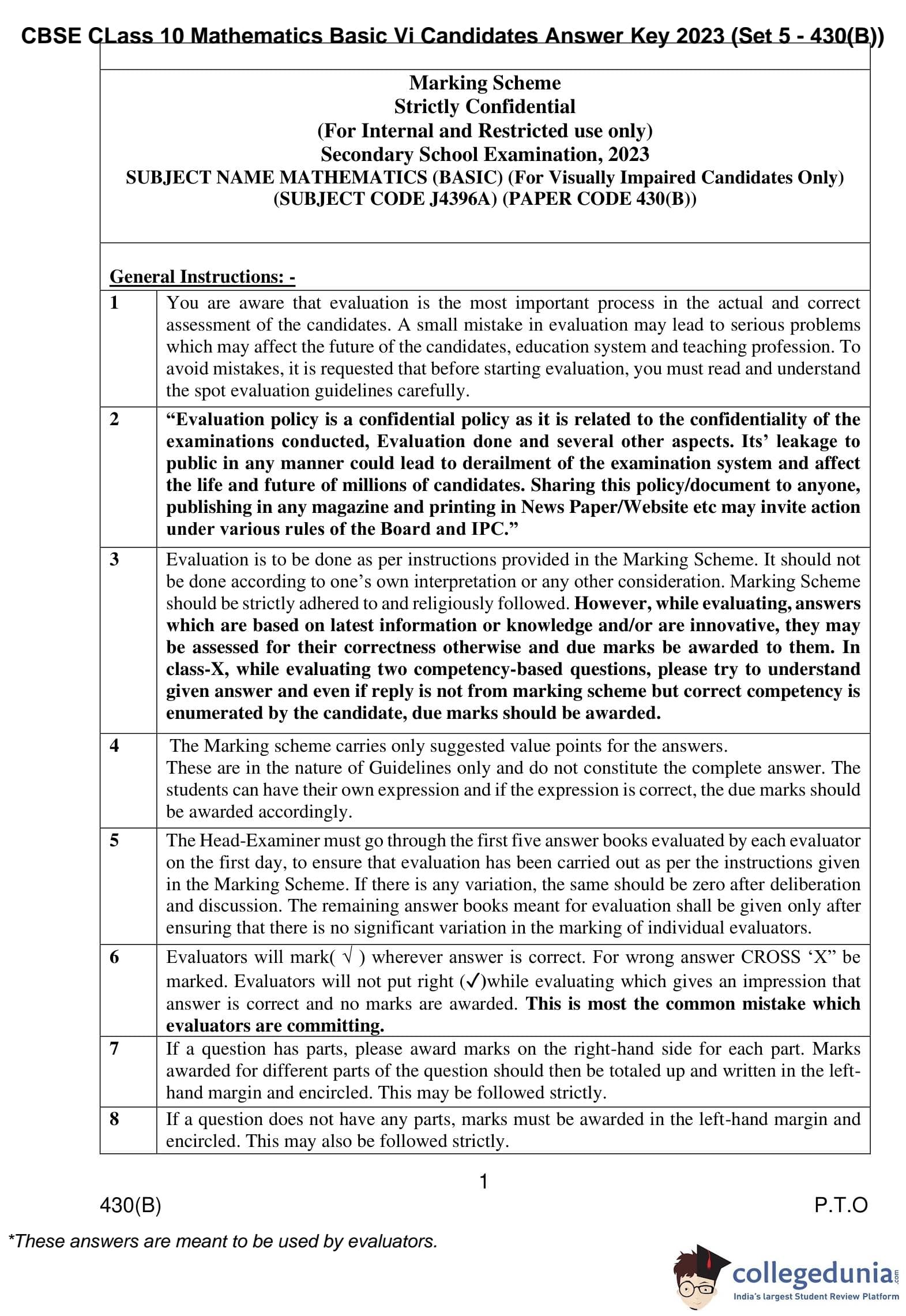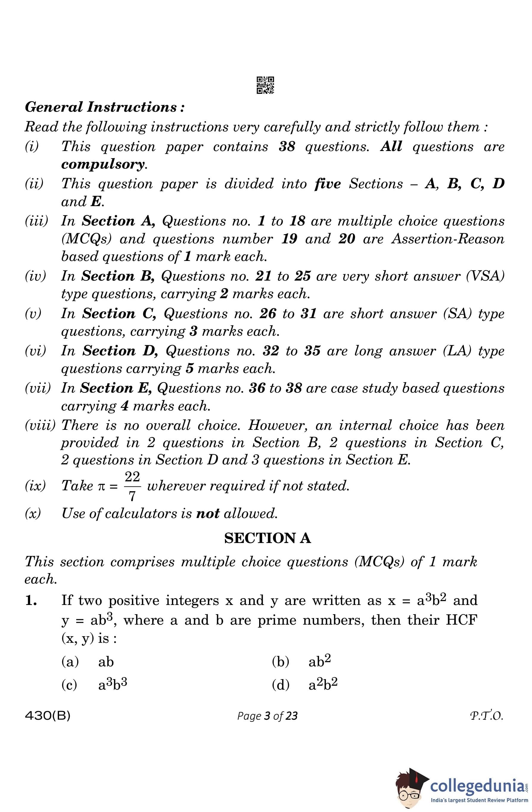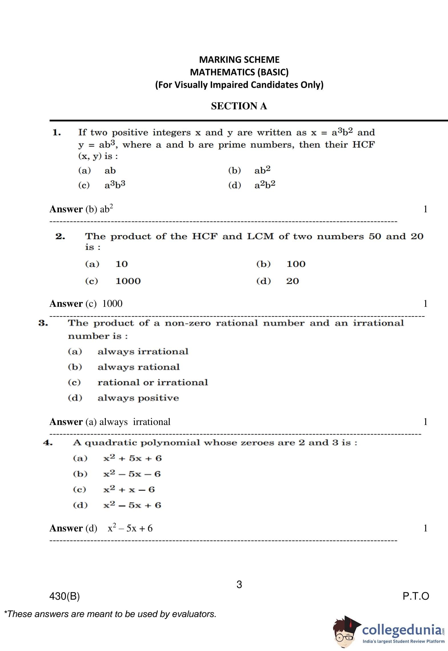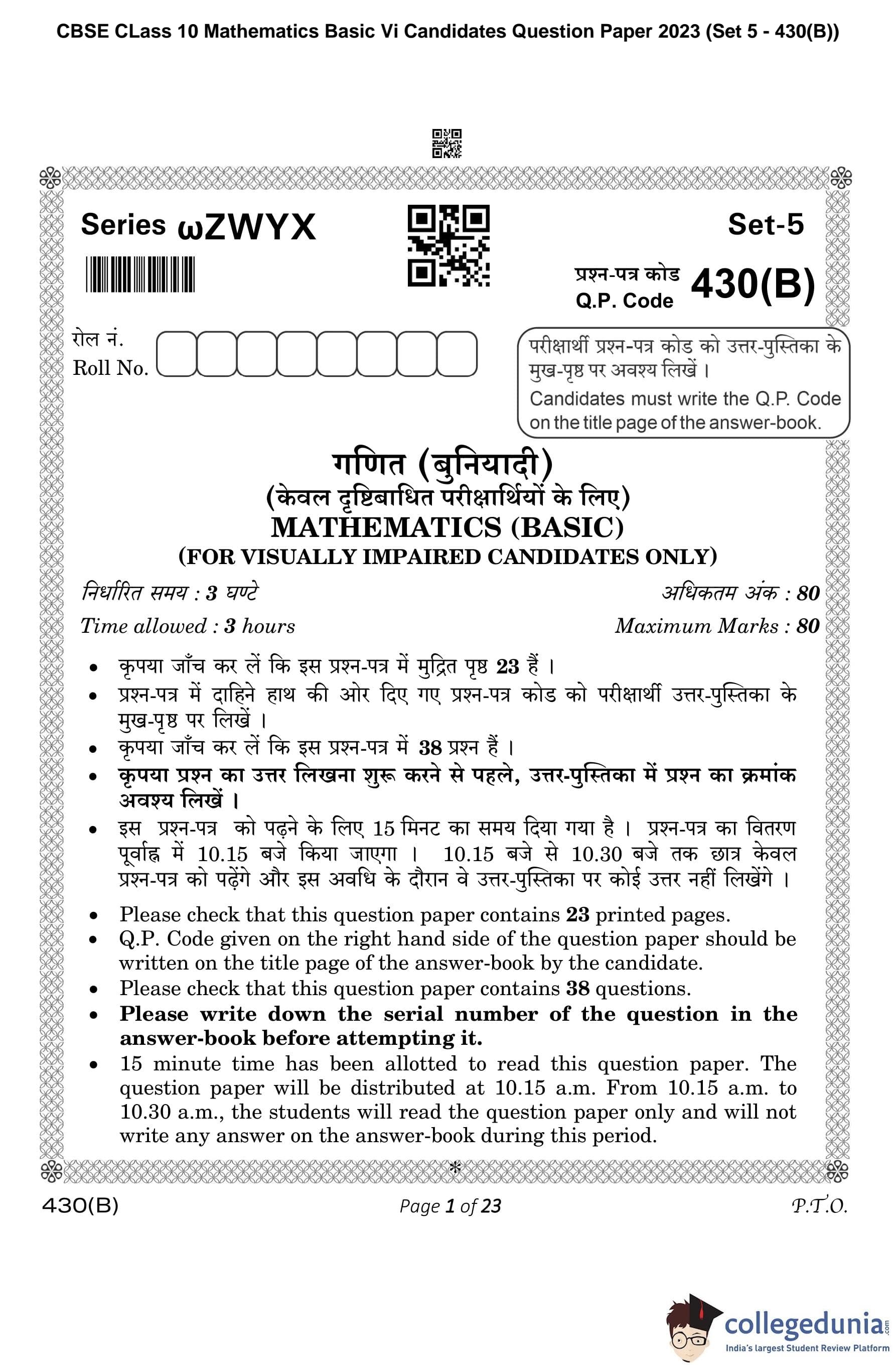 CBSE Class 10 Mathematics Basic (Visually Impaired Candidates) Question Paper 2023 with Answer Key
