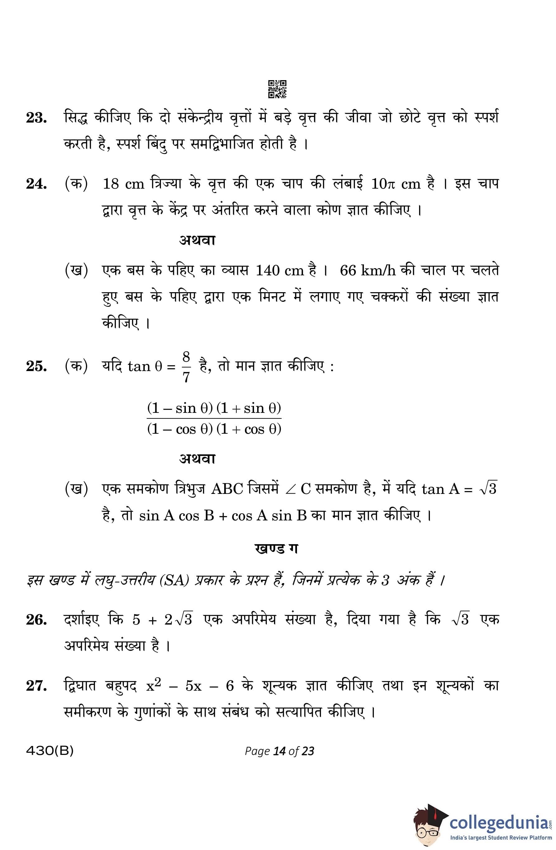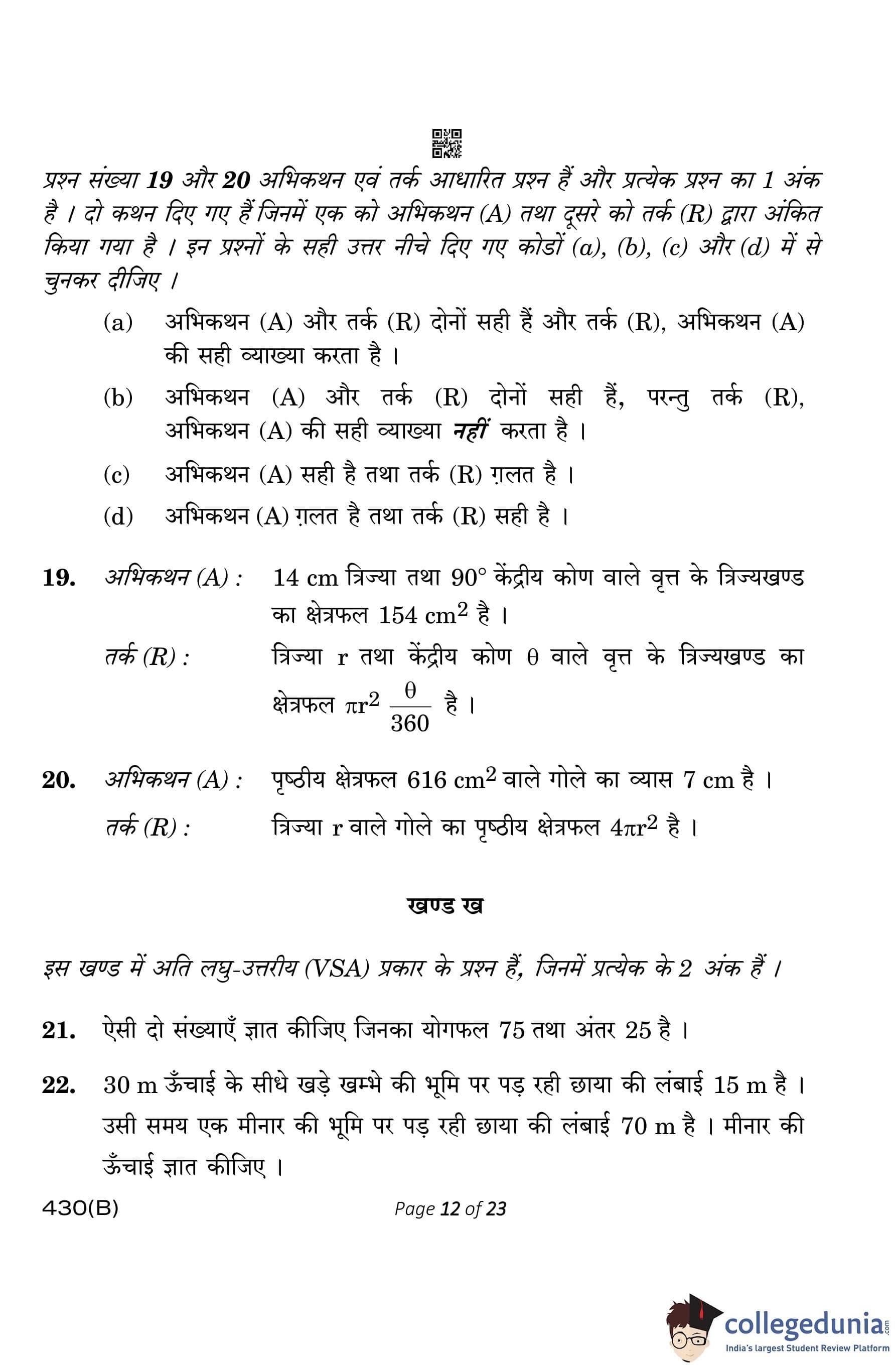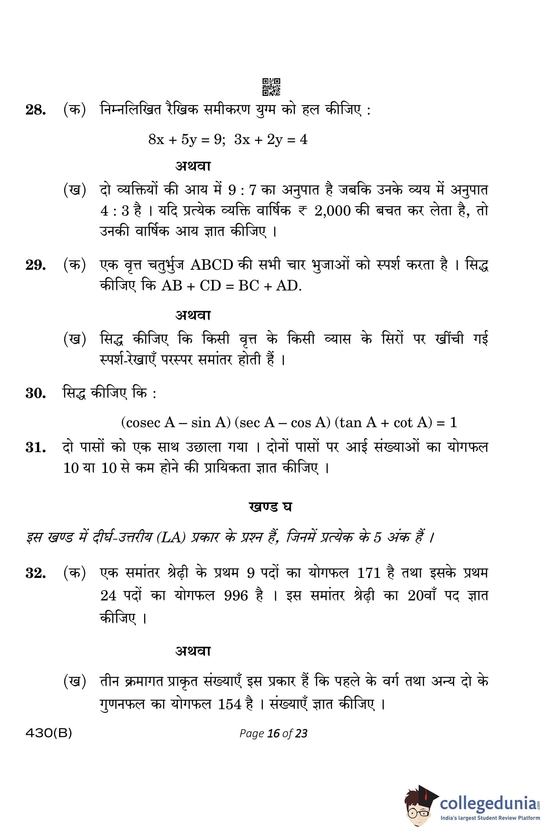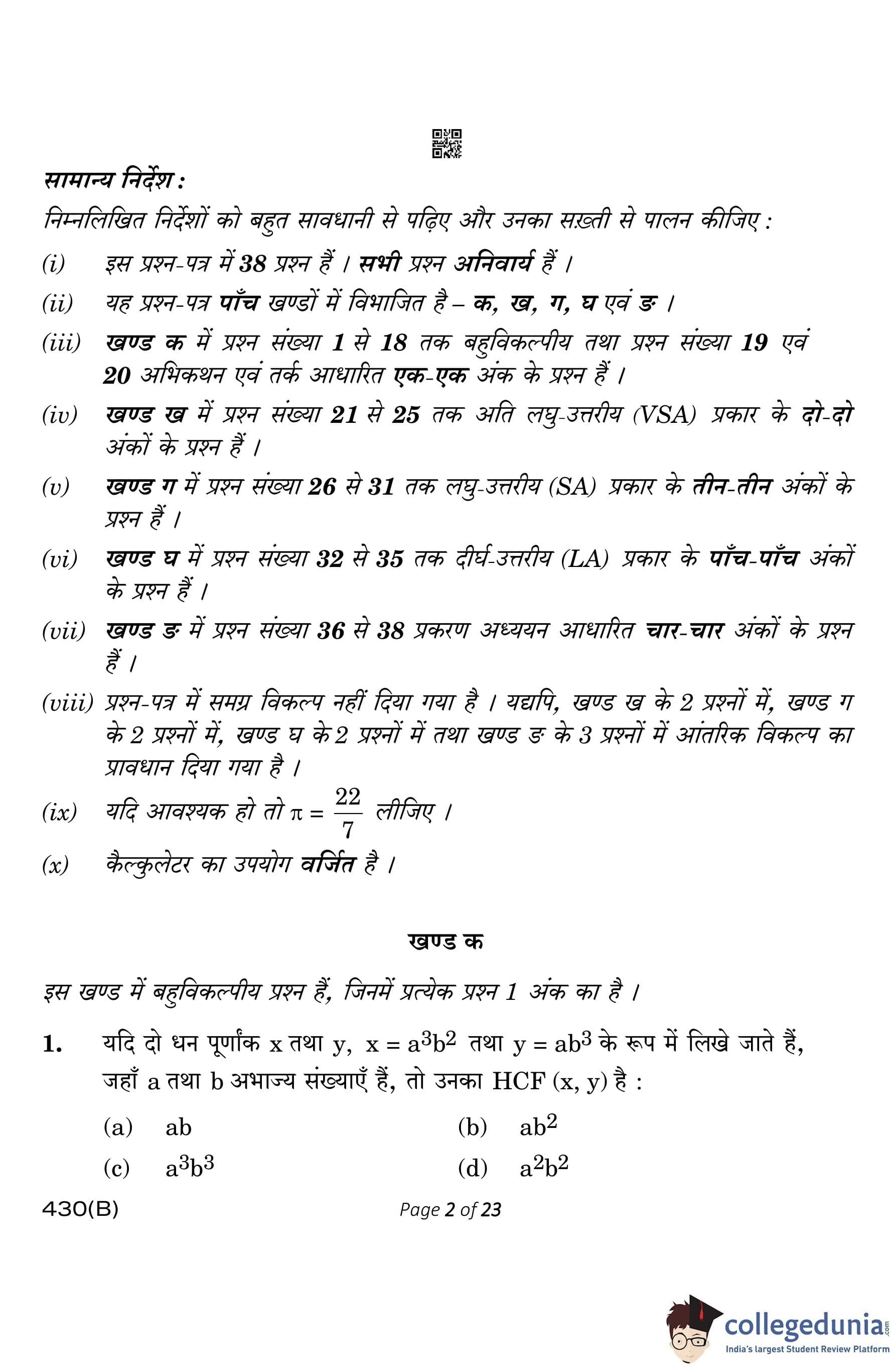 CBSE Class 10 Mathematics Basic (Visually Impaired Candidates) Question Paper 2023 with Answer Key