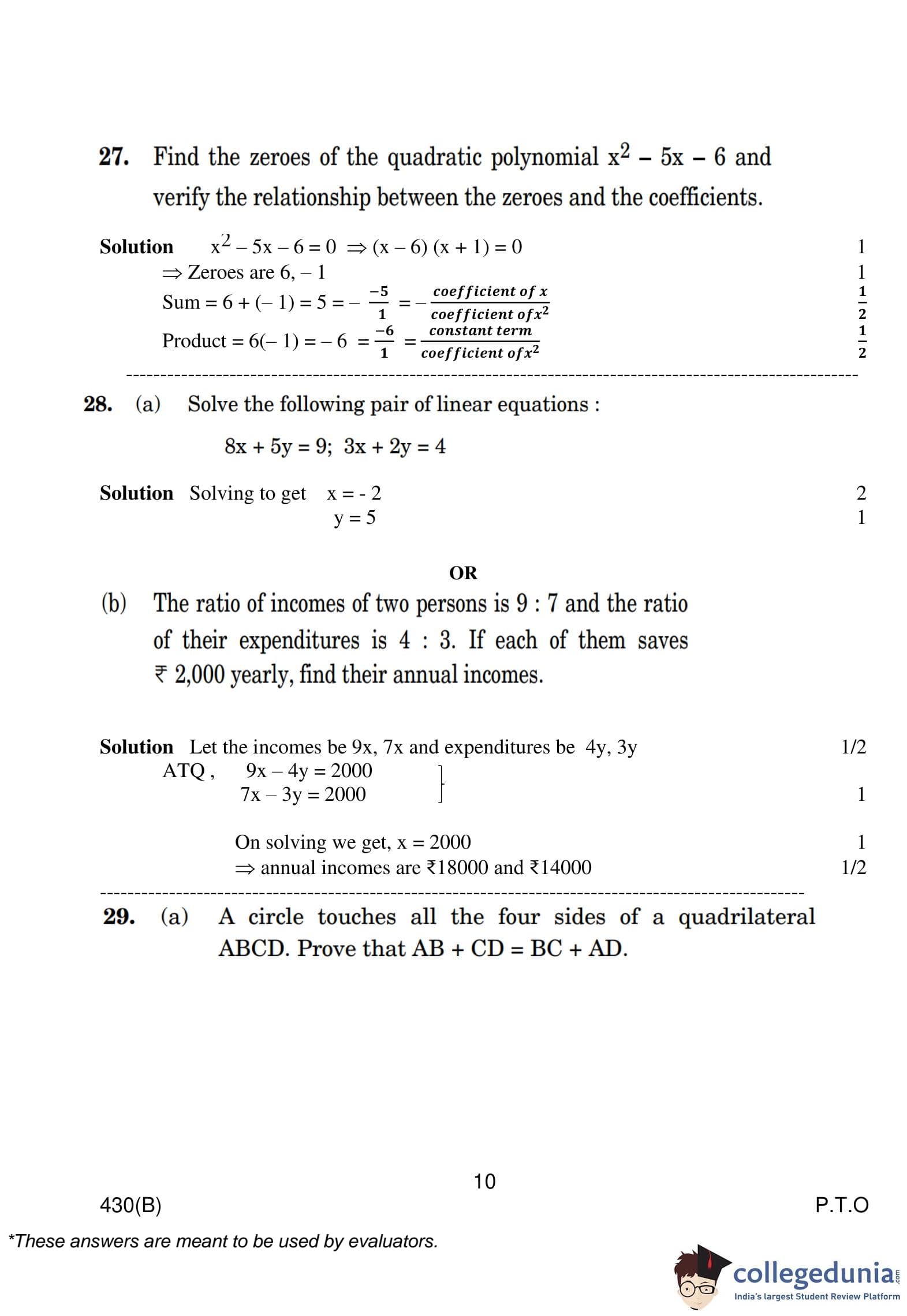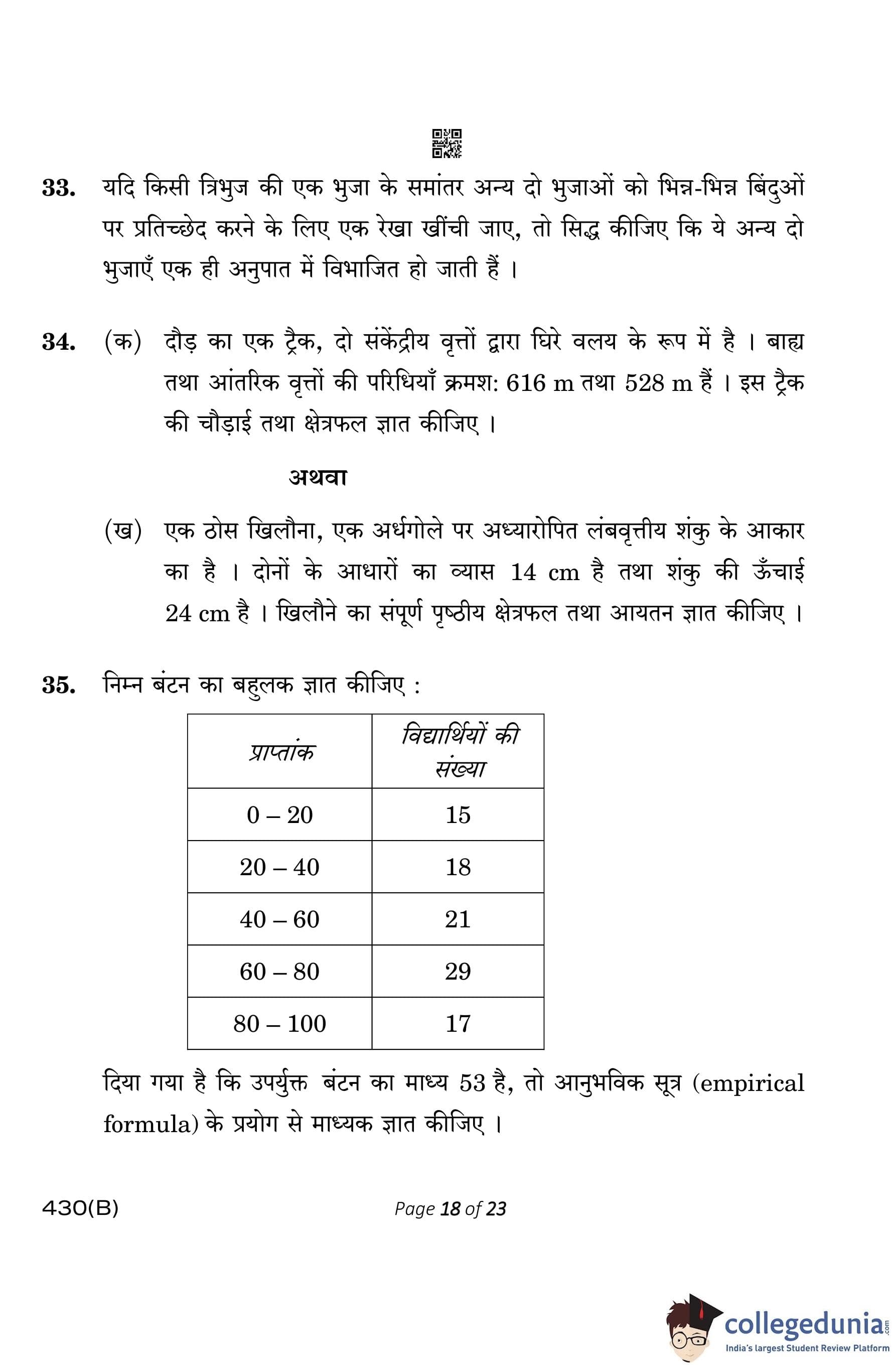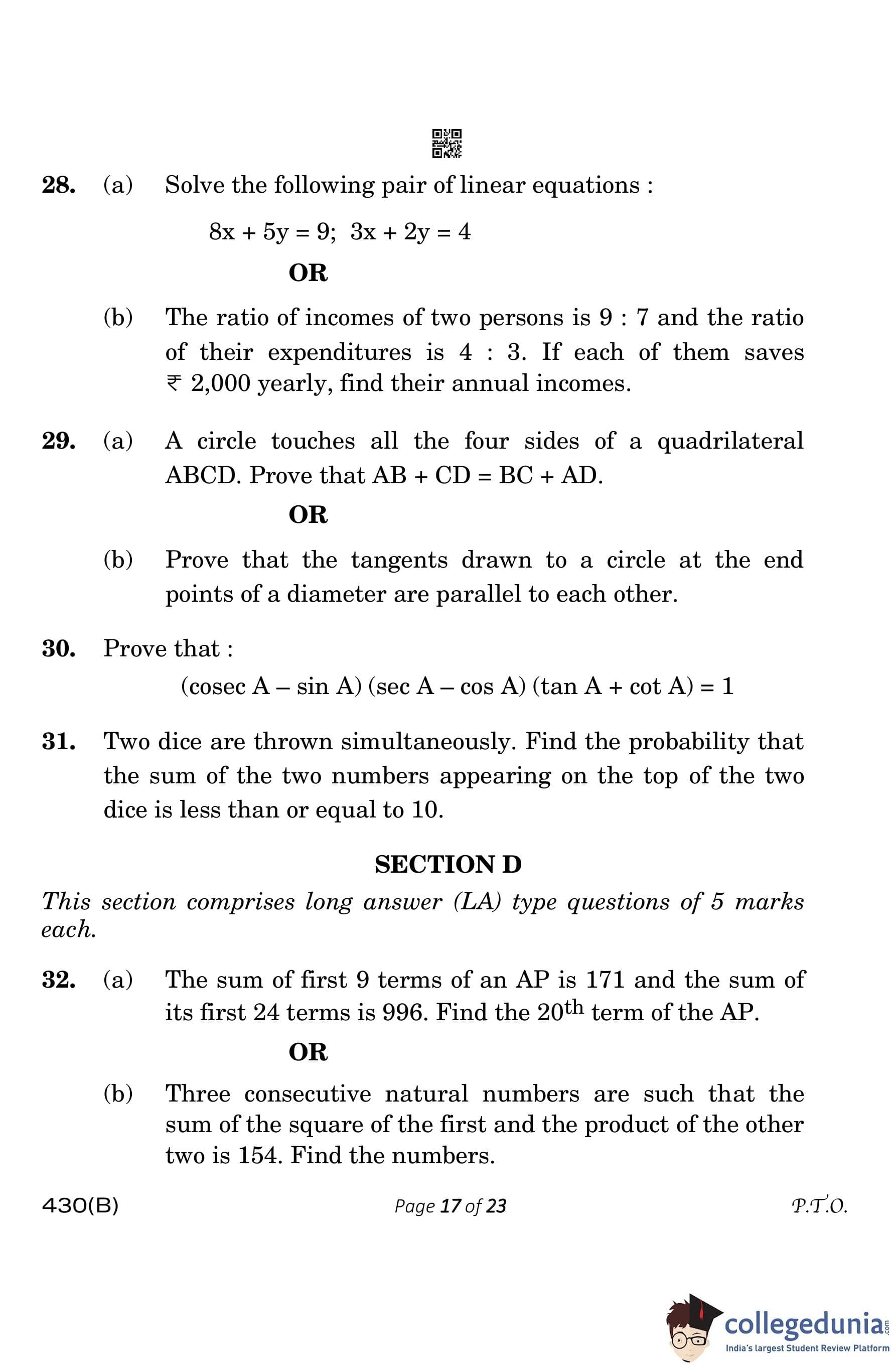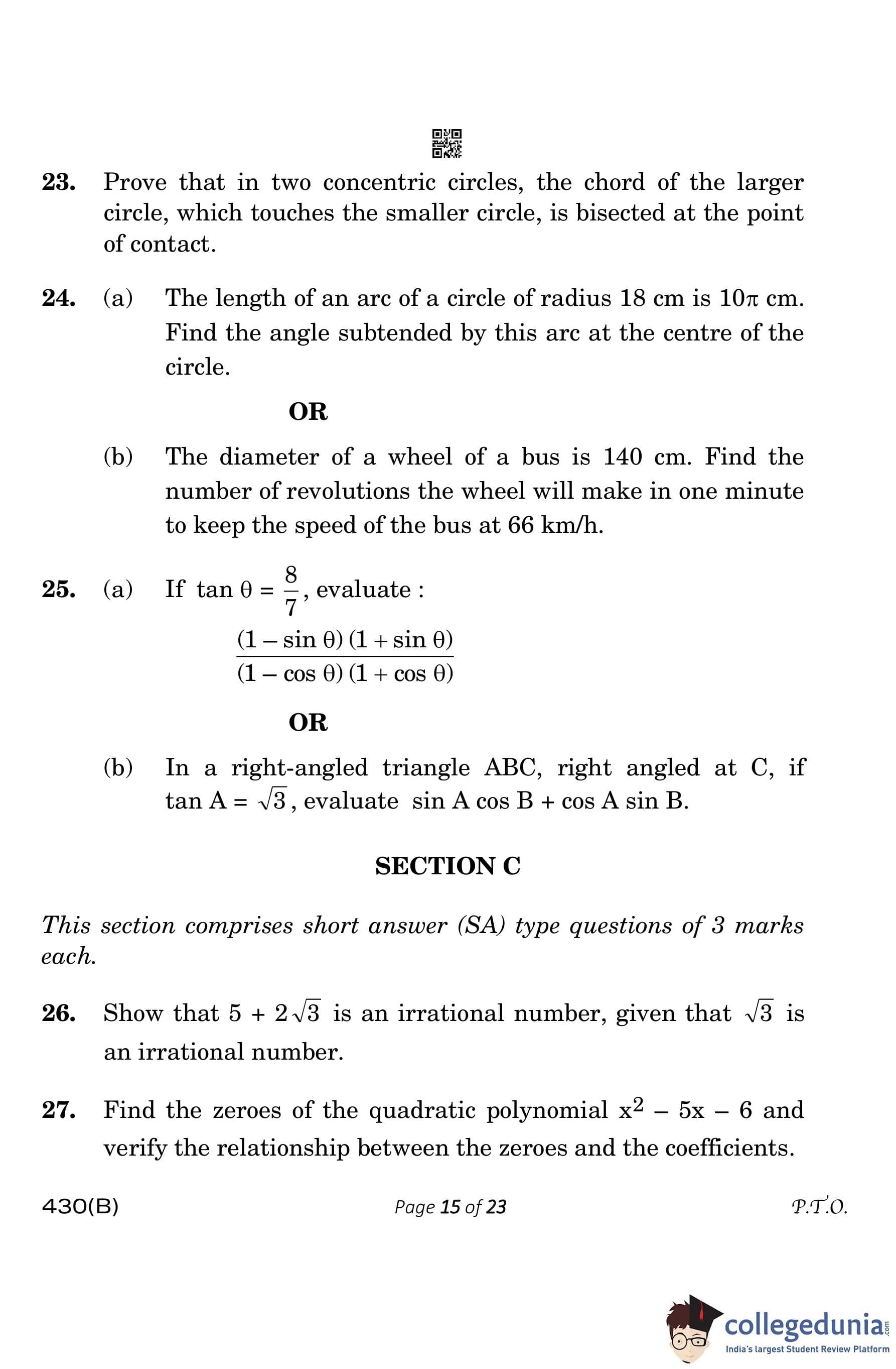 CBSE Class 10 Mathematics Basic (Visually Impaired Candidates) Question Paper 2023 with Answer Key