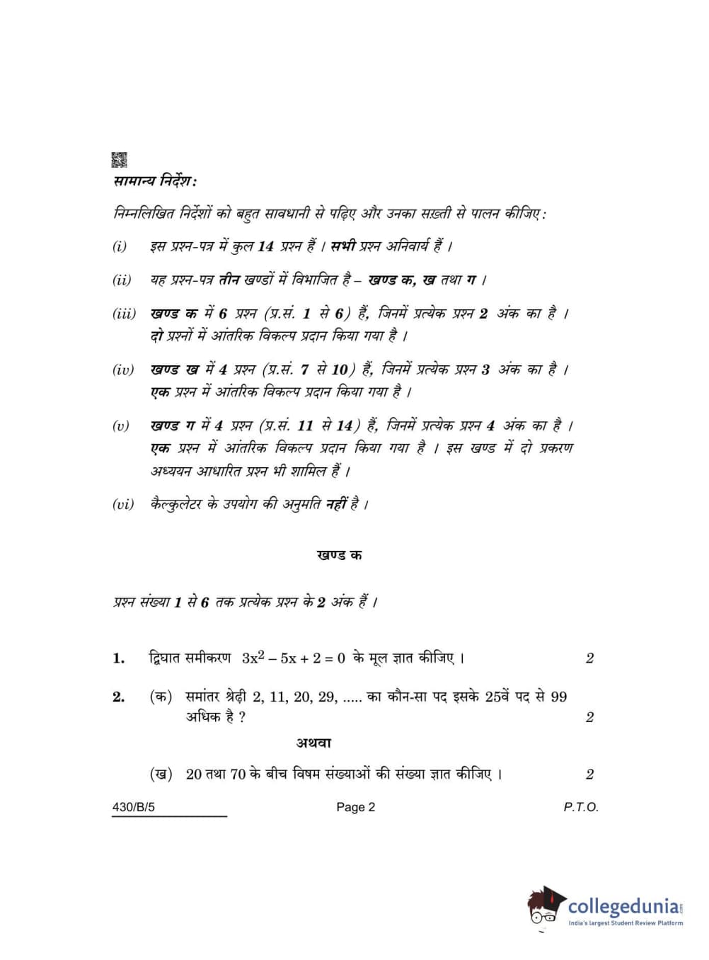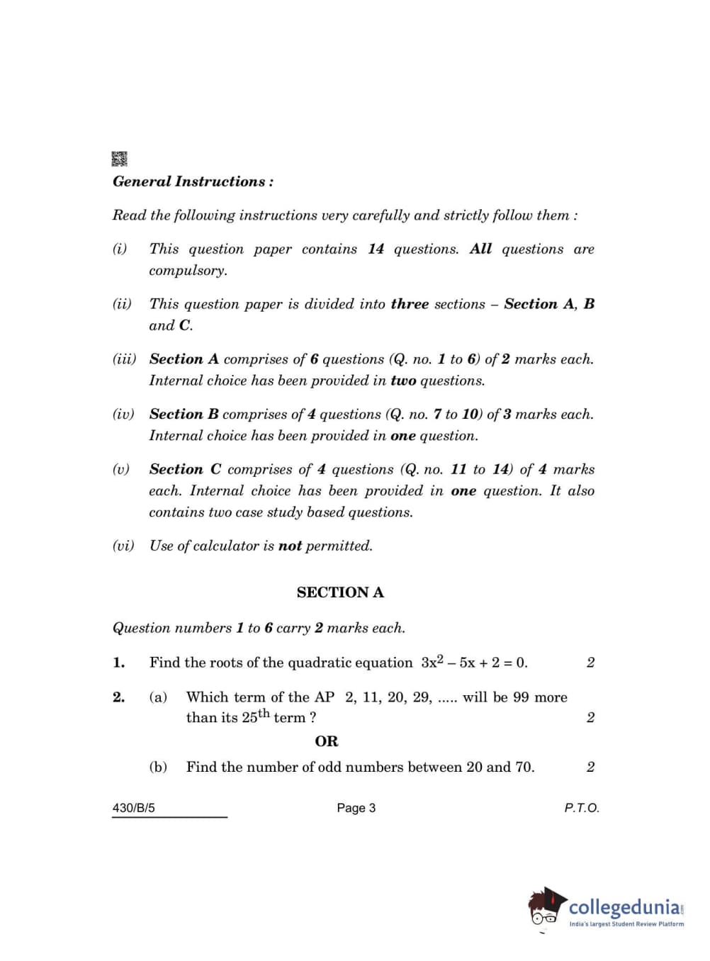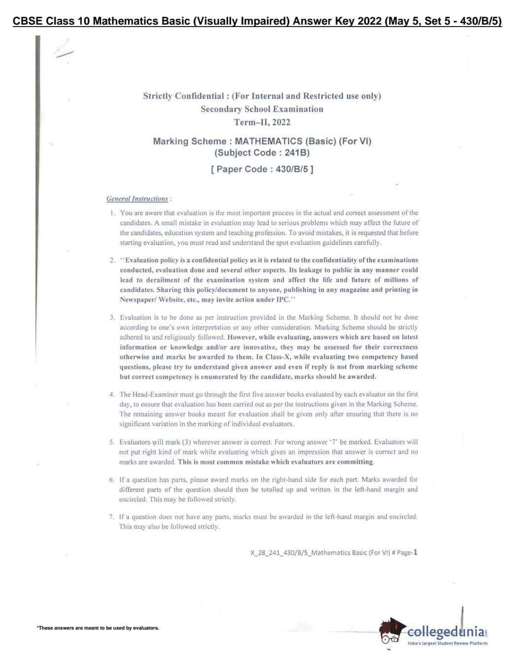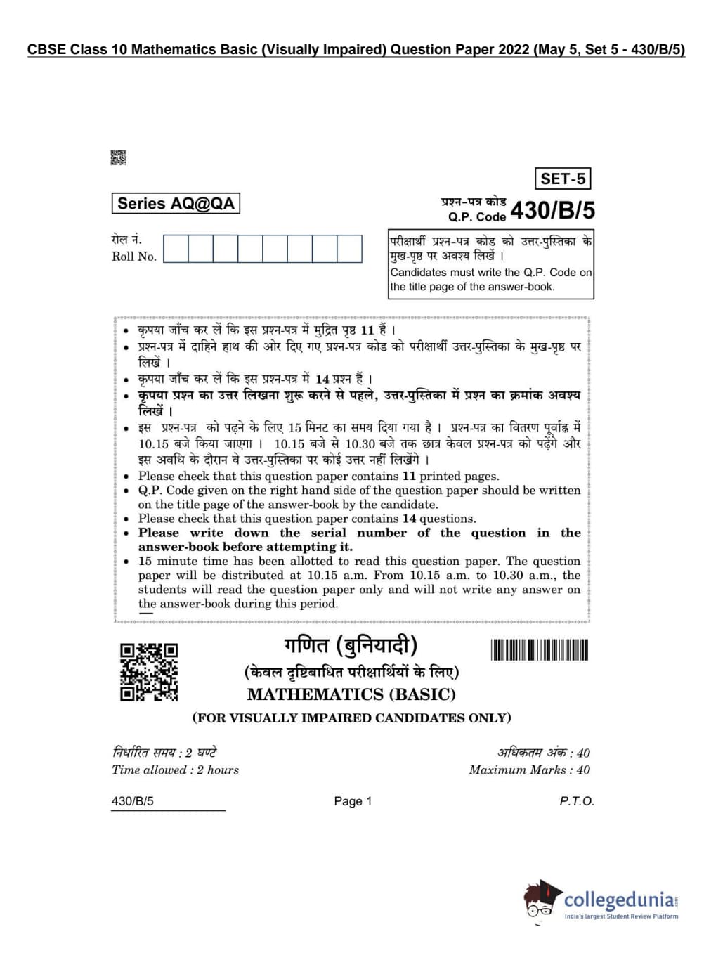 CBSE Class 10 Mathematics Basic (Visually Impaired) Question Paper 2022 with Answer Key Set 5 - 430/B/5 is available for download. The exam was conducted by the Central Board of Secondary Education on May 5, 2022 in the Morning Session 10:30 AM to 12:30 PM. The medium of paper was English & Hindi. The question paper comprised a total of 14 questions divided among 3 sections.
