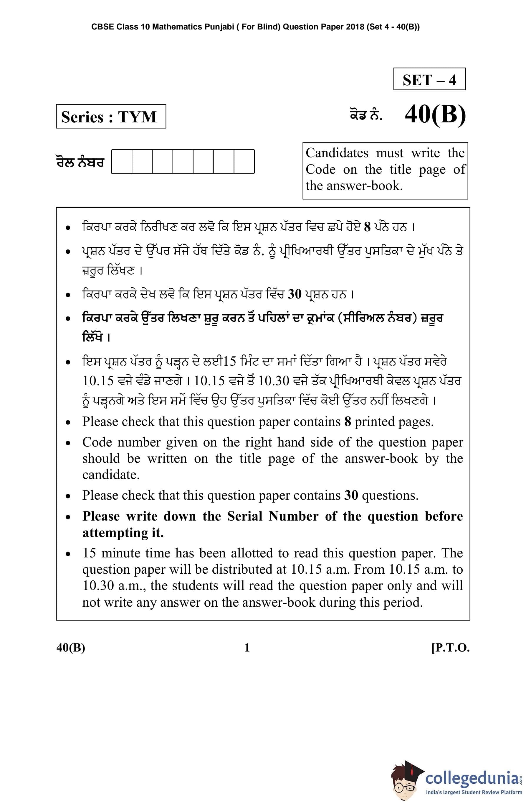 CBSE Class 10 Mathematics Punjabi ( For Blind) Question Paper 2018 with Answer Key Set 4 - 40(B) is available for download. The exam was conducted by the Central Board of Secondary Education on March 28, 2018 in the Morning Session 10:30 AM to 1:30 PM. The medium of paper was Punjabi. The question paper comprised a total of 30 questions divided among 4 sections.