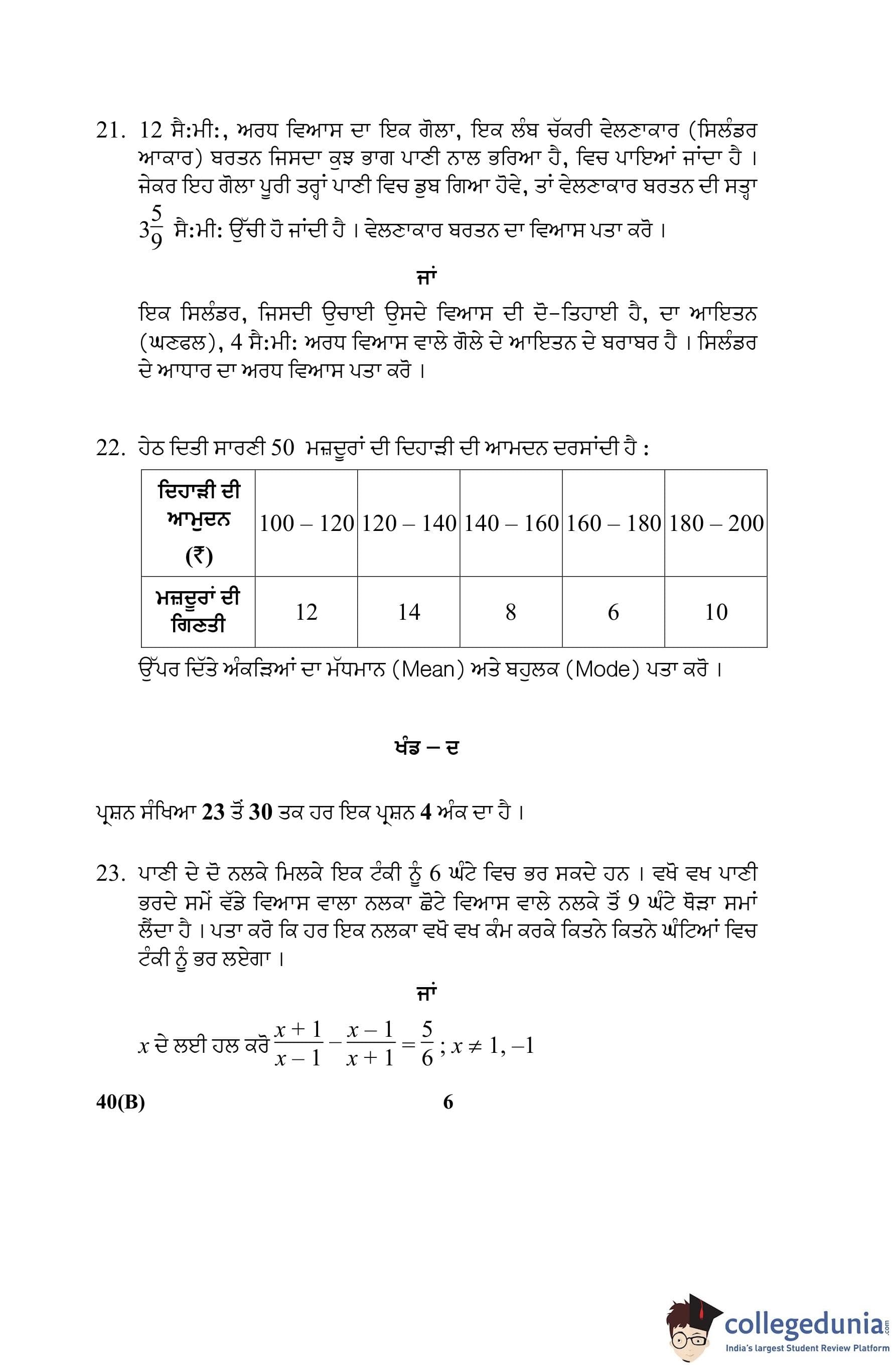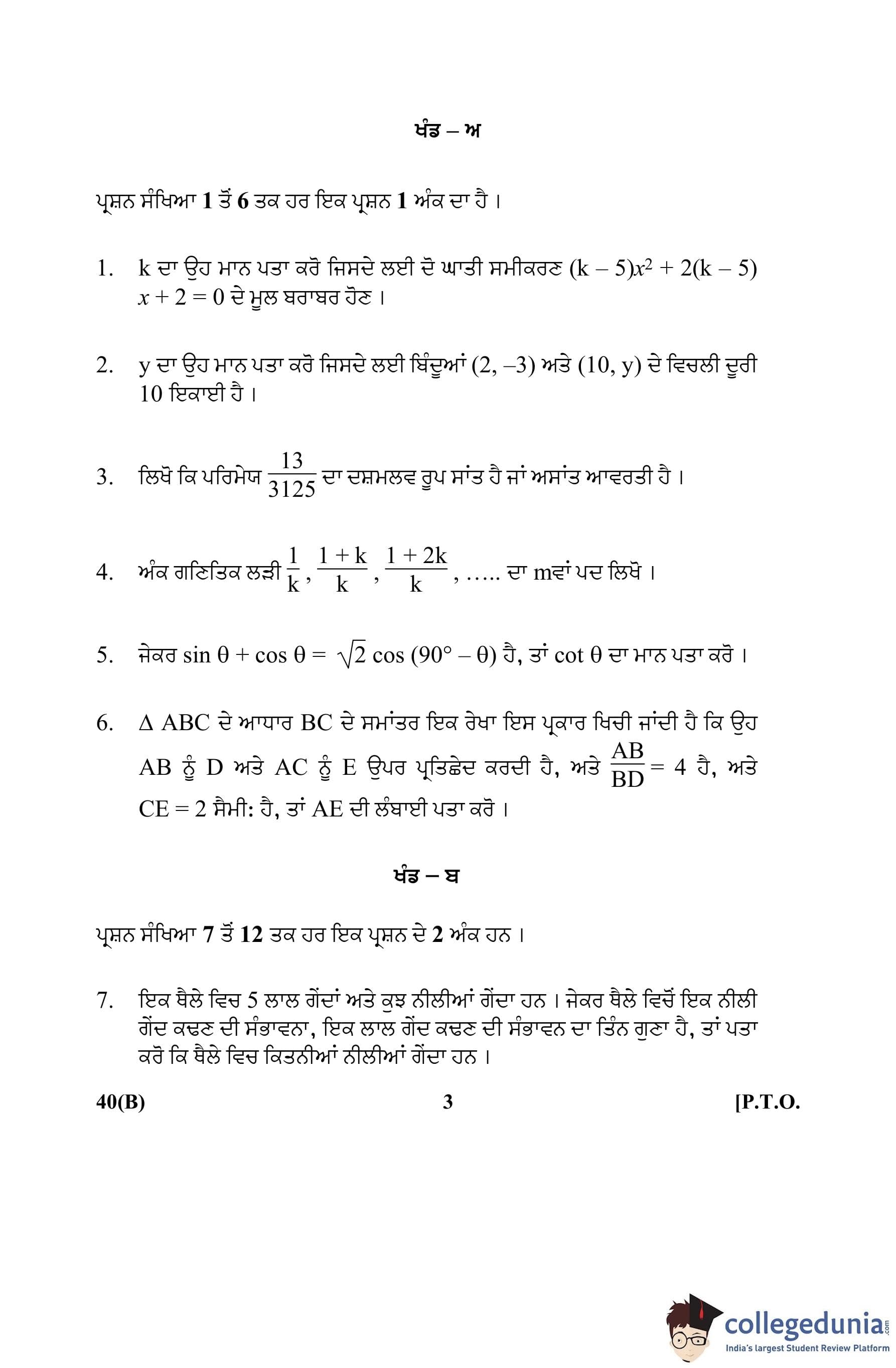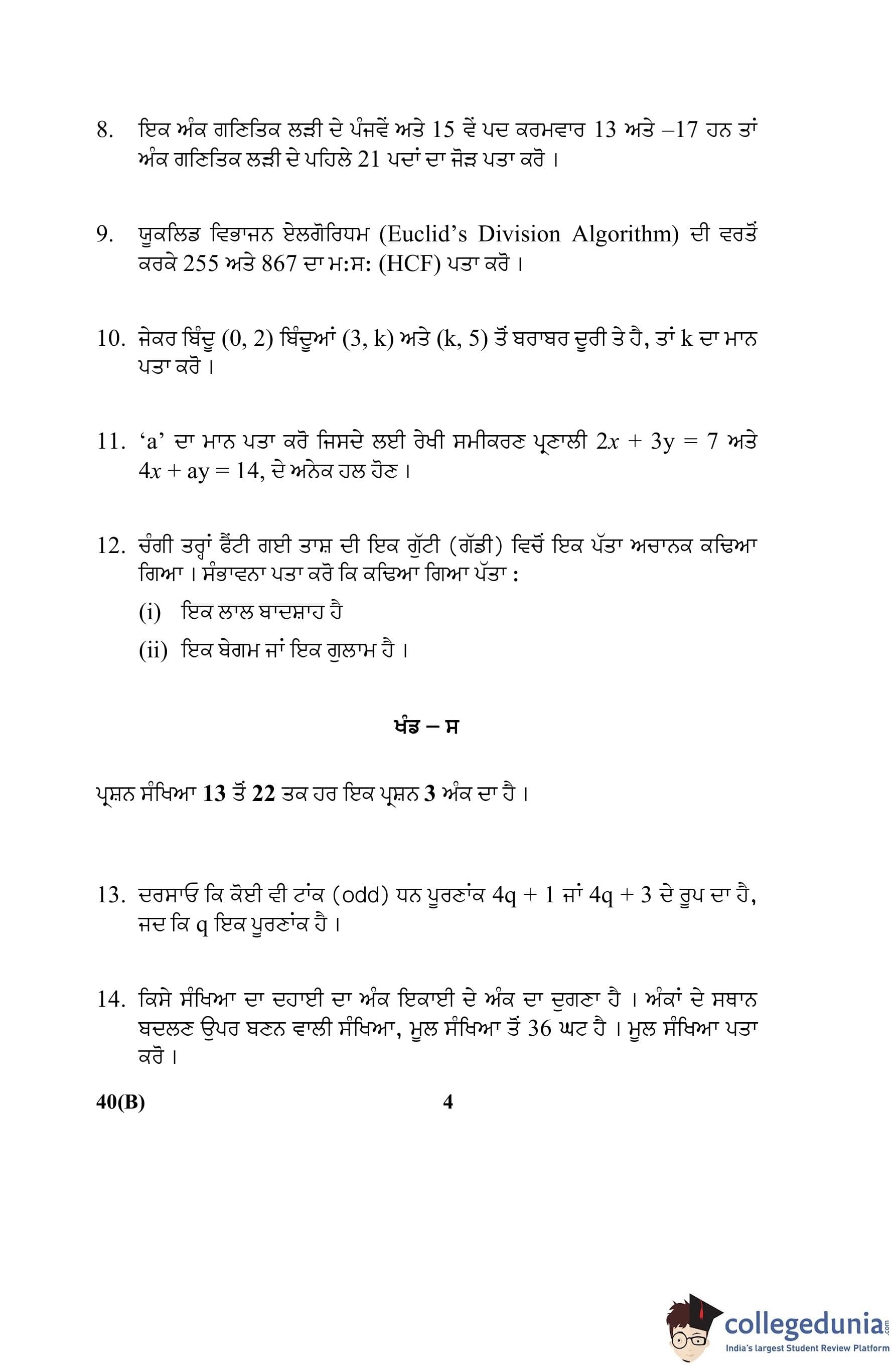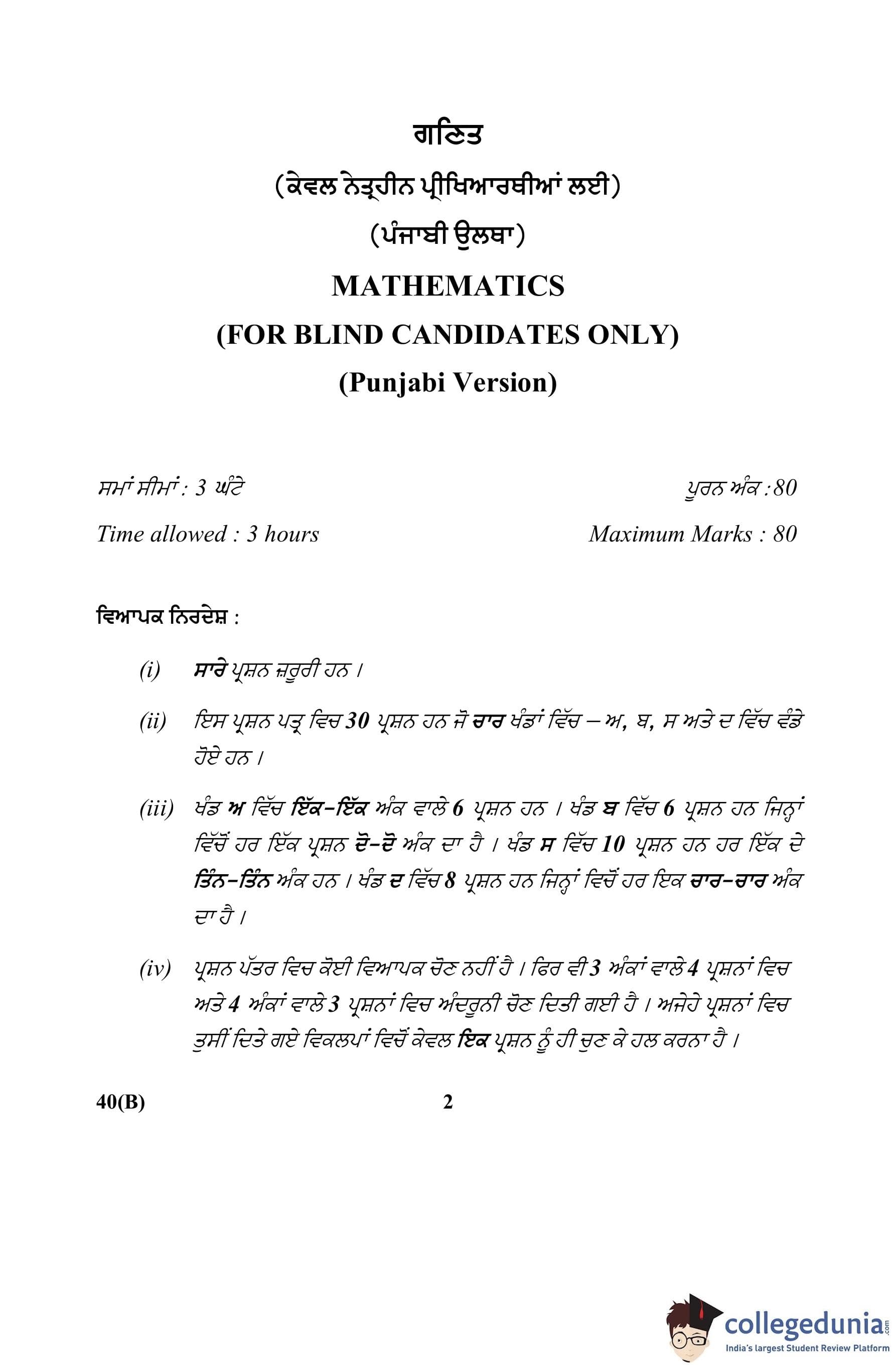 CBSE Class 10 Mathematics Punjabi ( For Blind) Set 4 - 40(B) Question Paper 2018 with Answer Key (March 28)