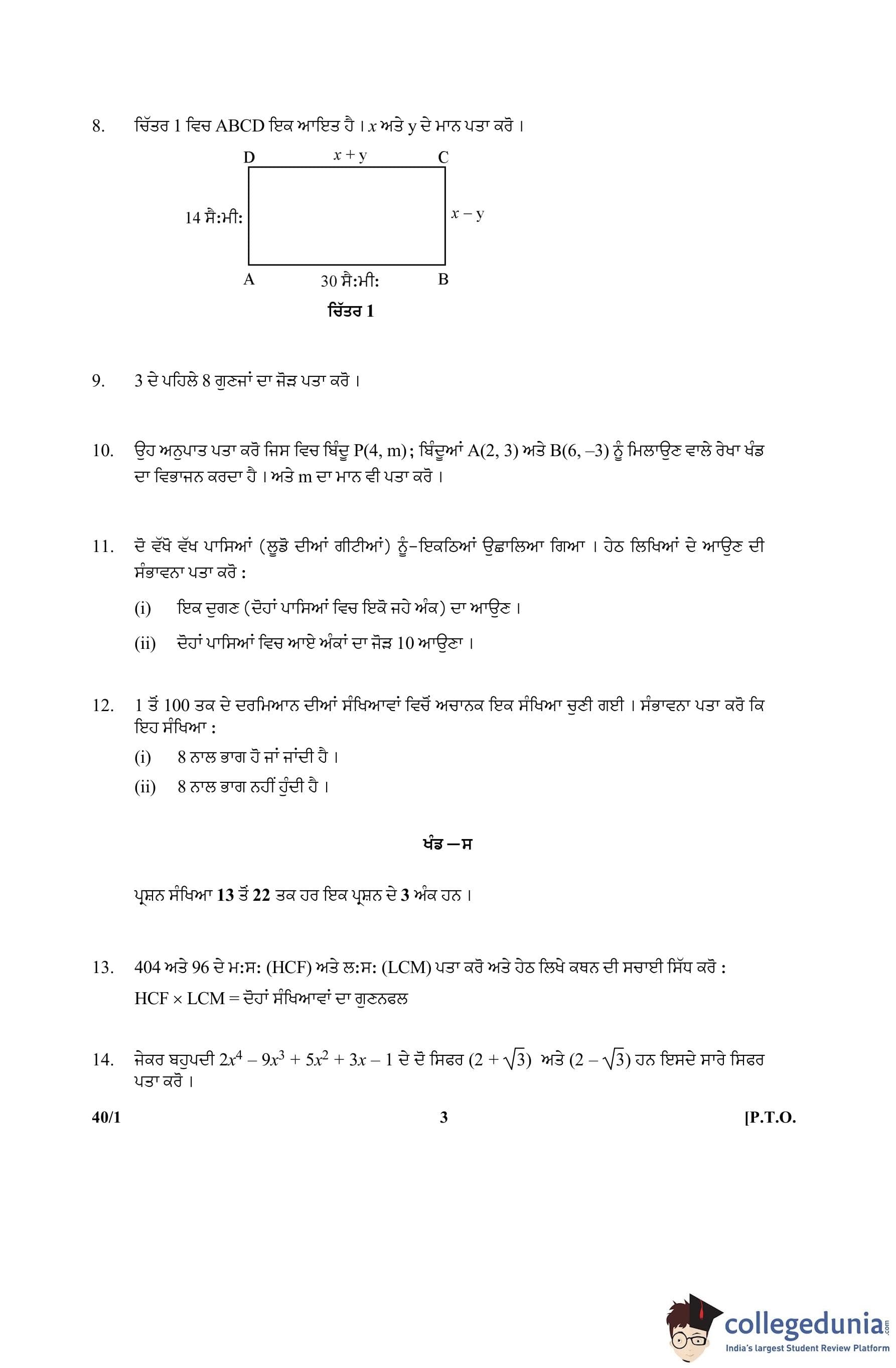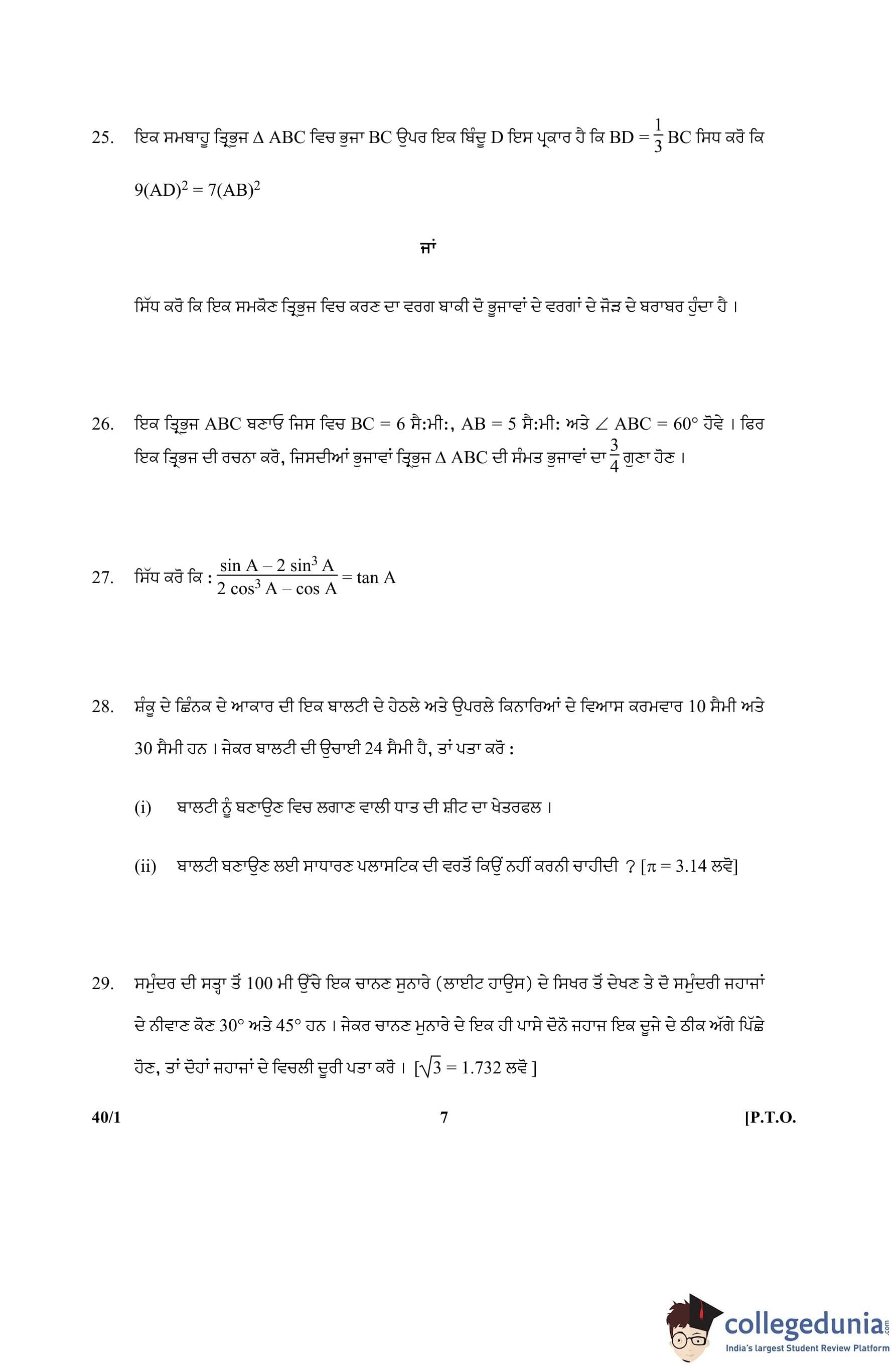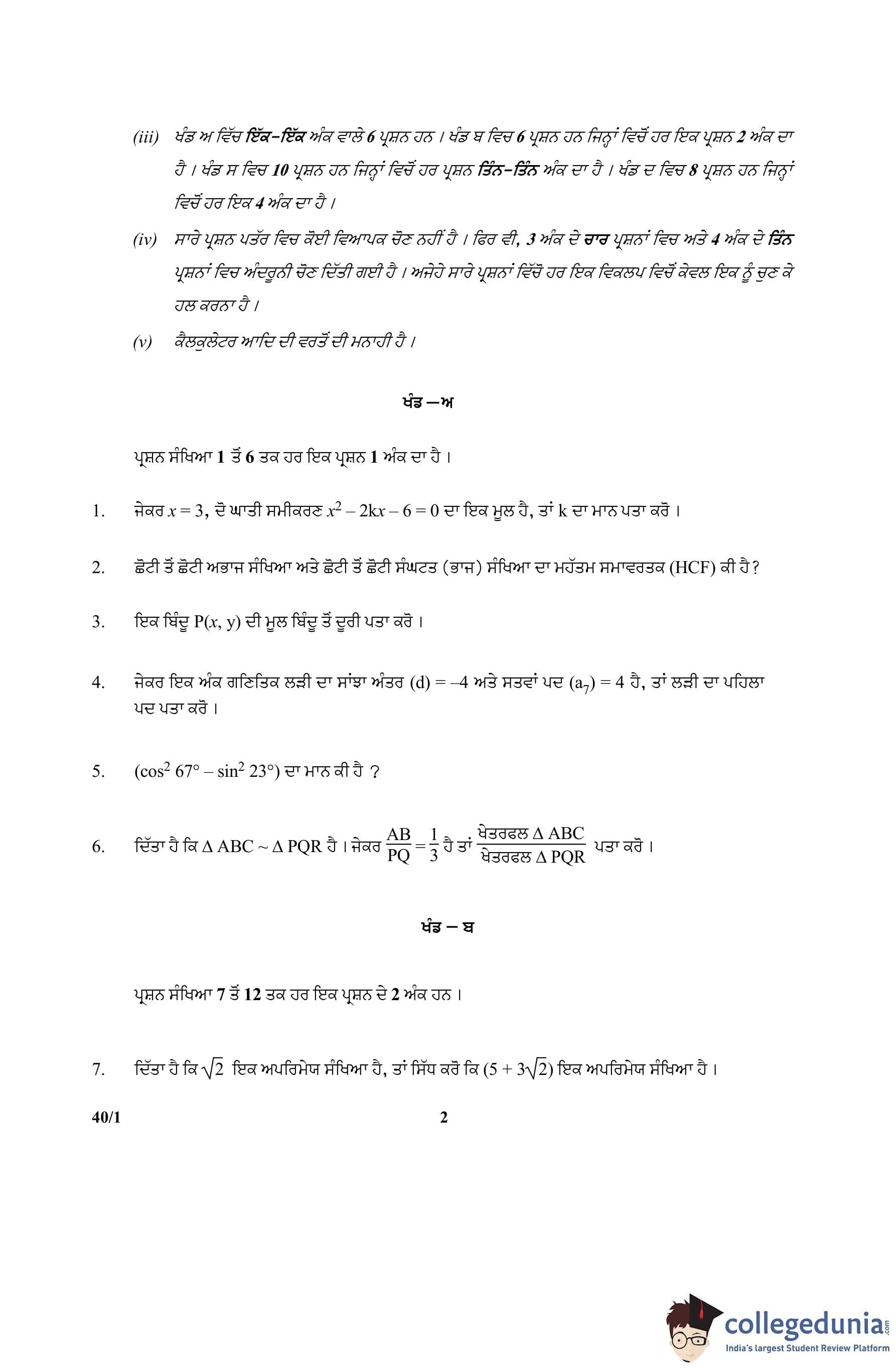 CBSE Class 10 Mathematics Punjabi Question Paper 2018 with Answer Key Set 1 - 40/1 is available for download. The exam was conducted by the Central Board of Secondary Education on March 28, 2018 in the Morning Session 10:30 AM to 1:30 PM. The medium of paper was Punjabi. The question paper comprised a total of 30 questions divided among 4 sections.