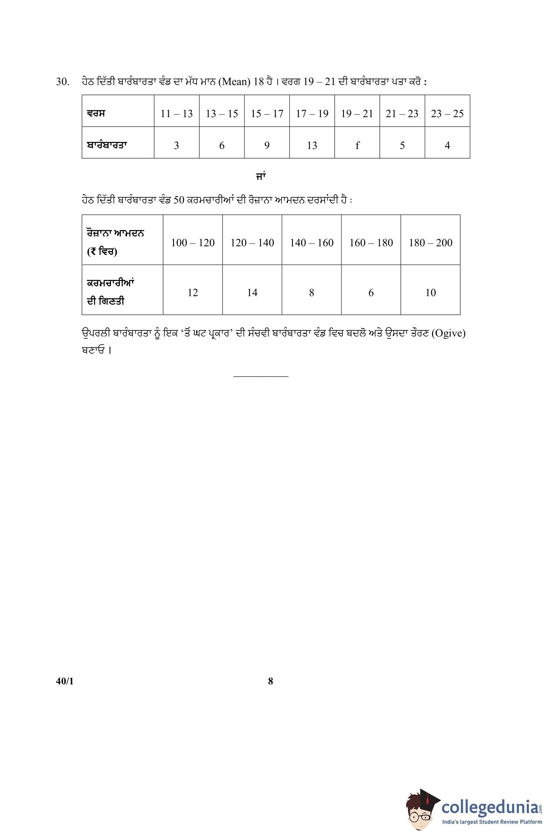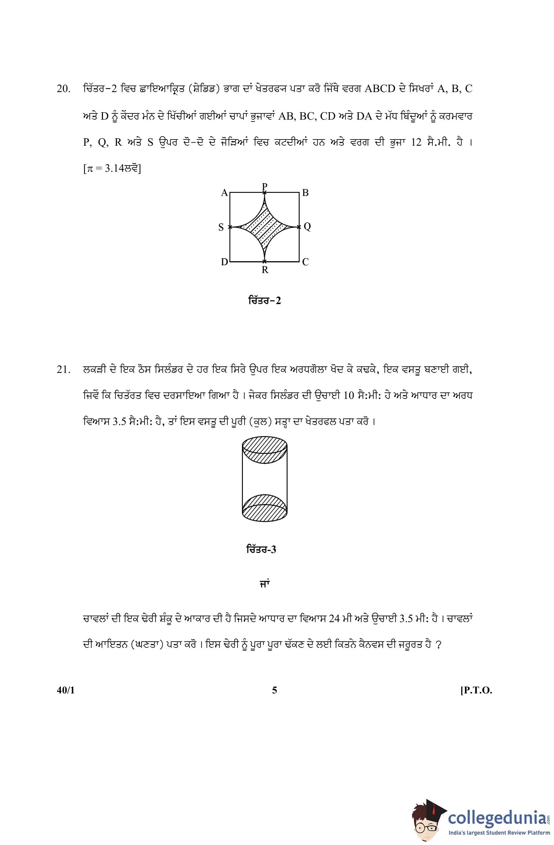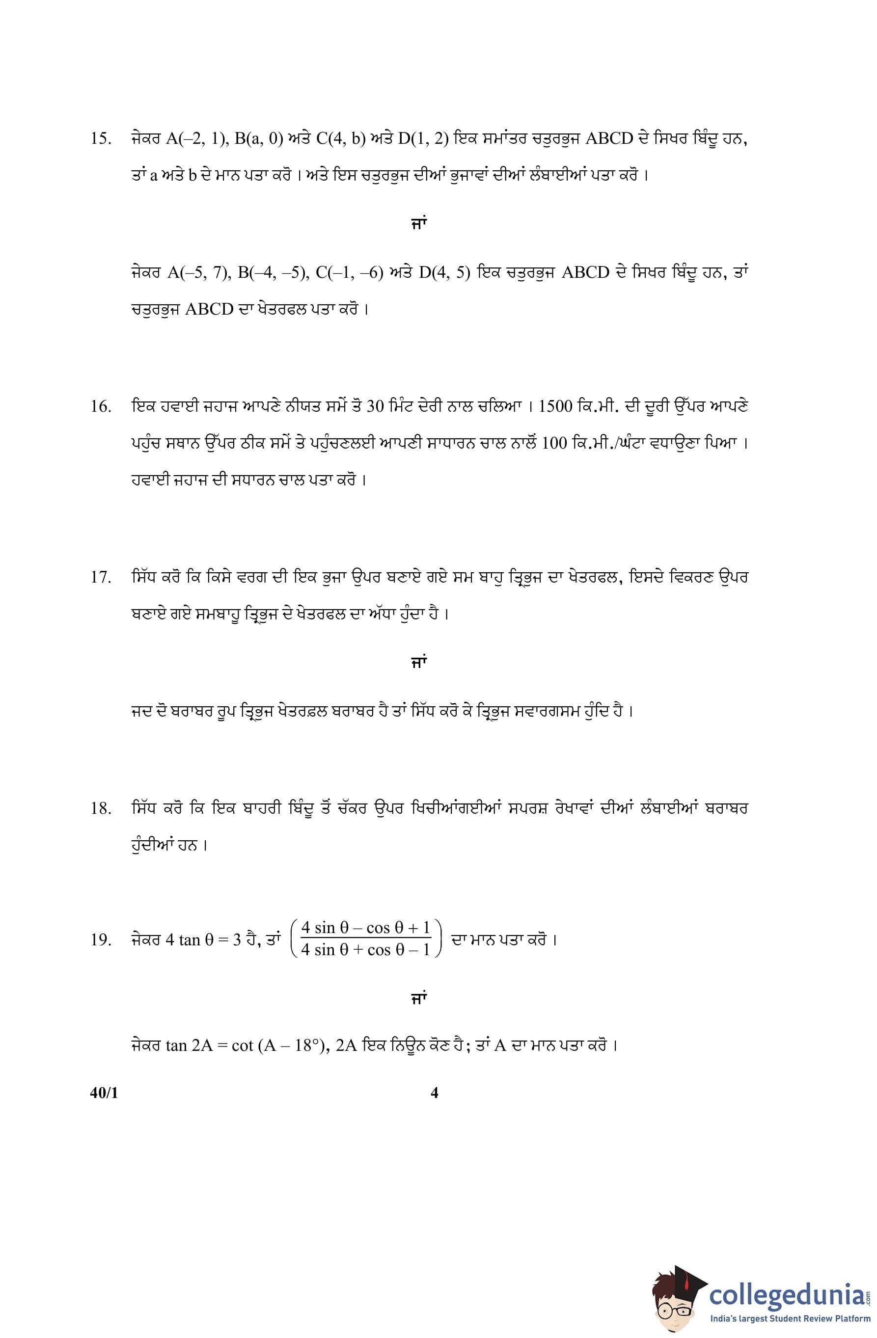 CBSE Class 10 Mathematics Punjabi Question Paper 2018 with Answer Key Set 1 - 40/1 is available for download. The exam was conducted by the Central Board of Secondary Education on March 28, 2018 in the Morning Session 10:30 AM to 1:30 PM. The medium of paper was Punjabi. The question paper comprised a total of 30 questions divided among 4 sections.