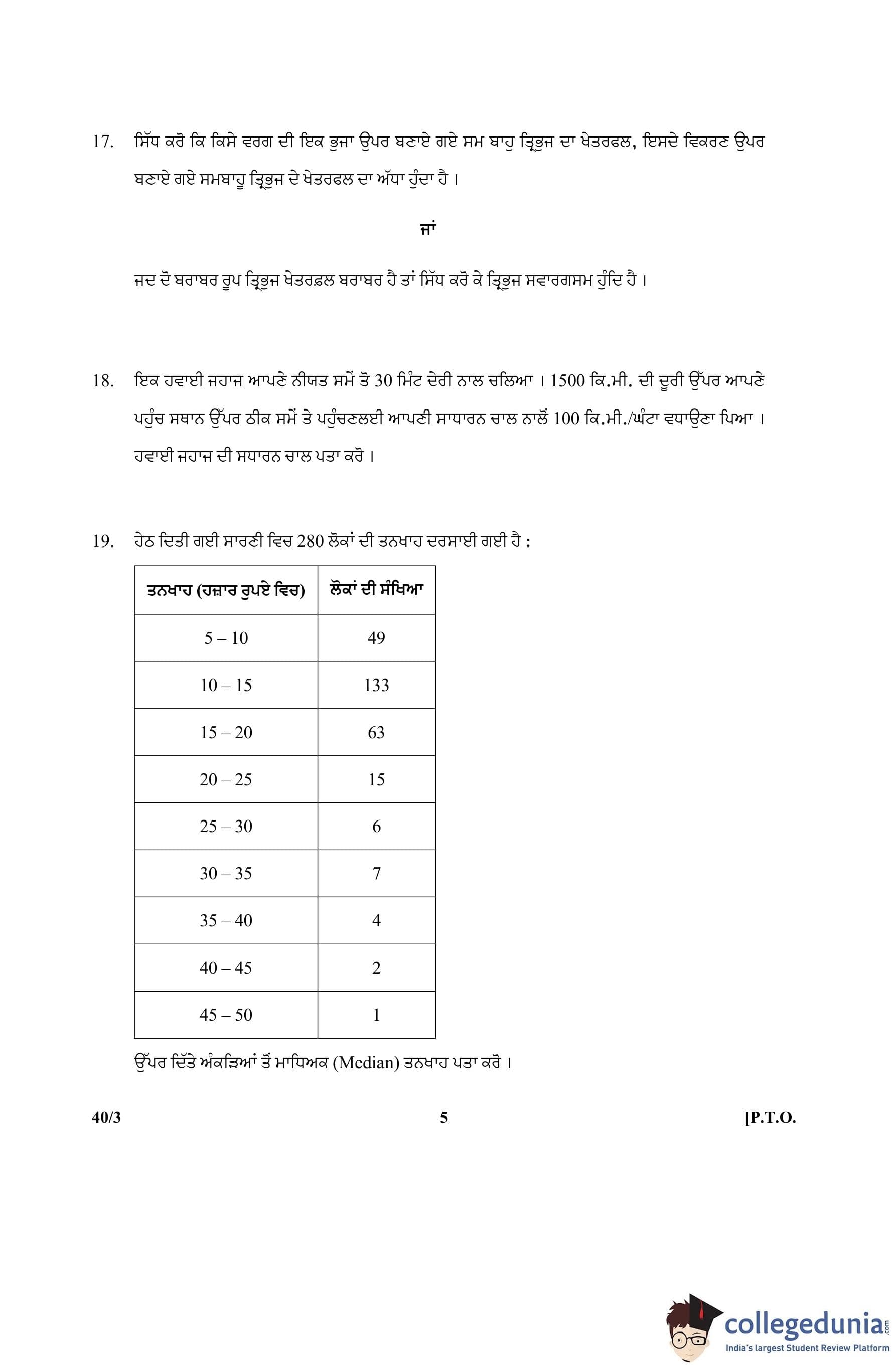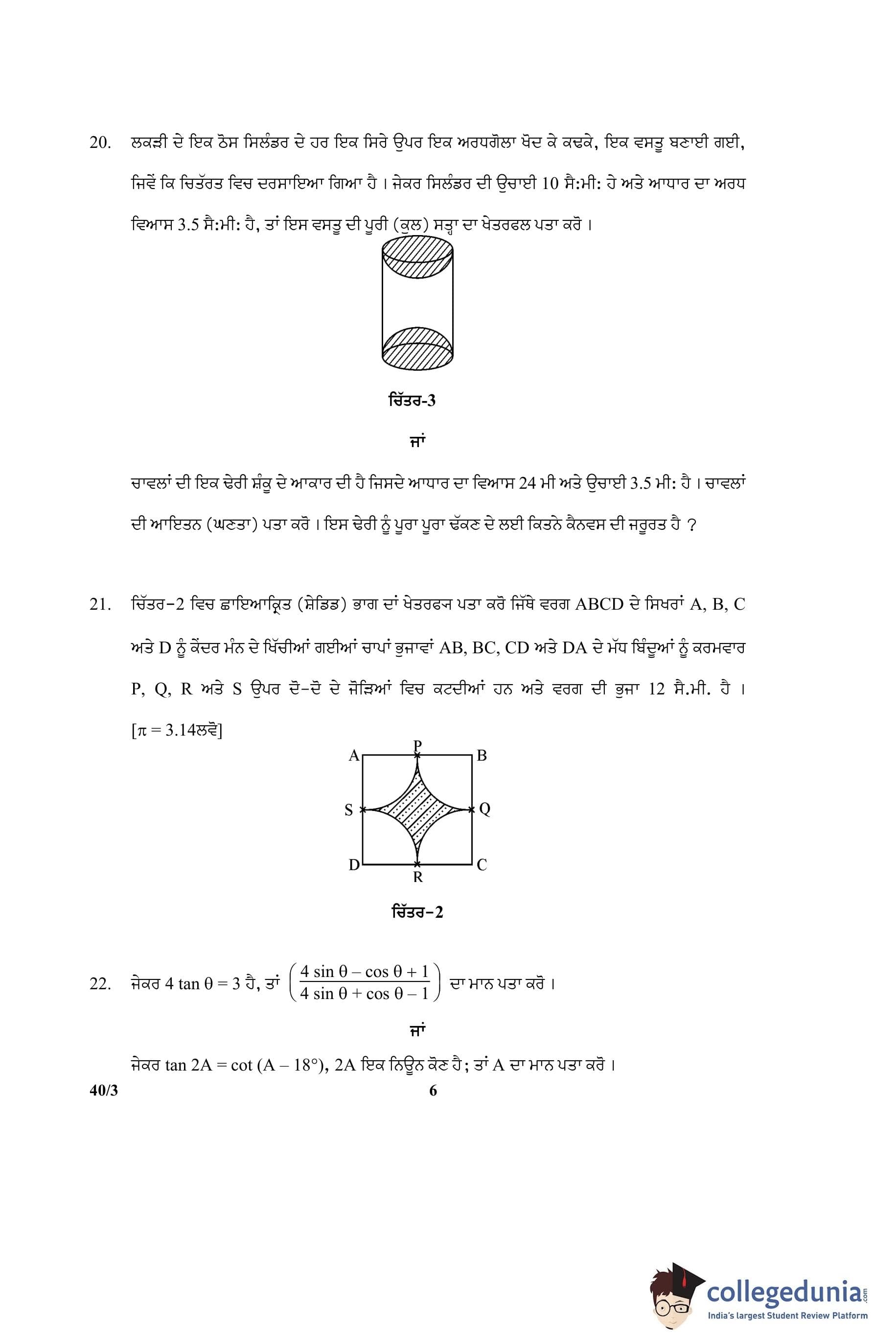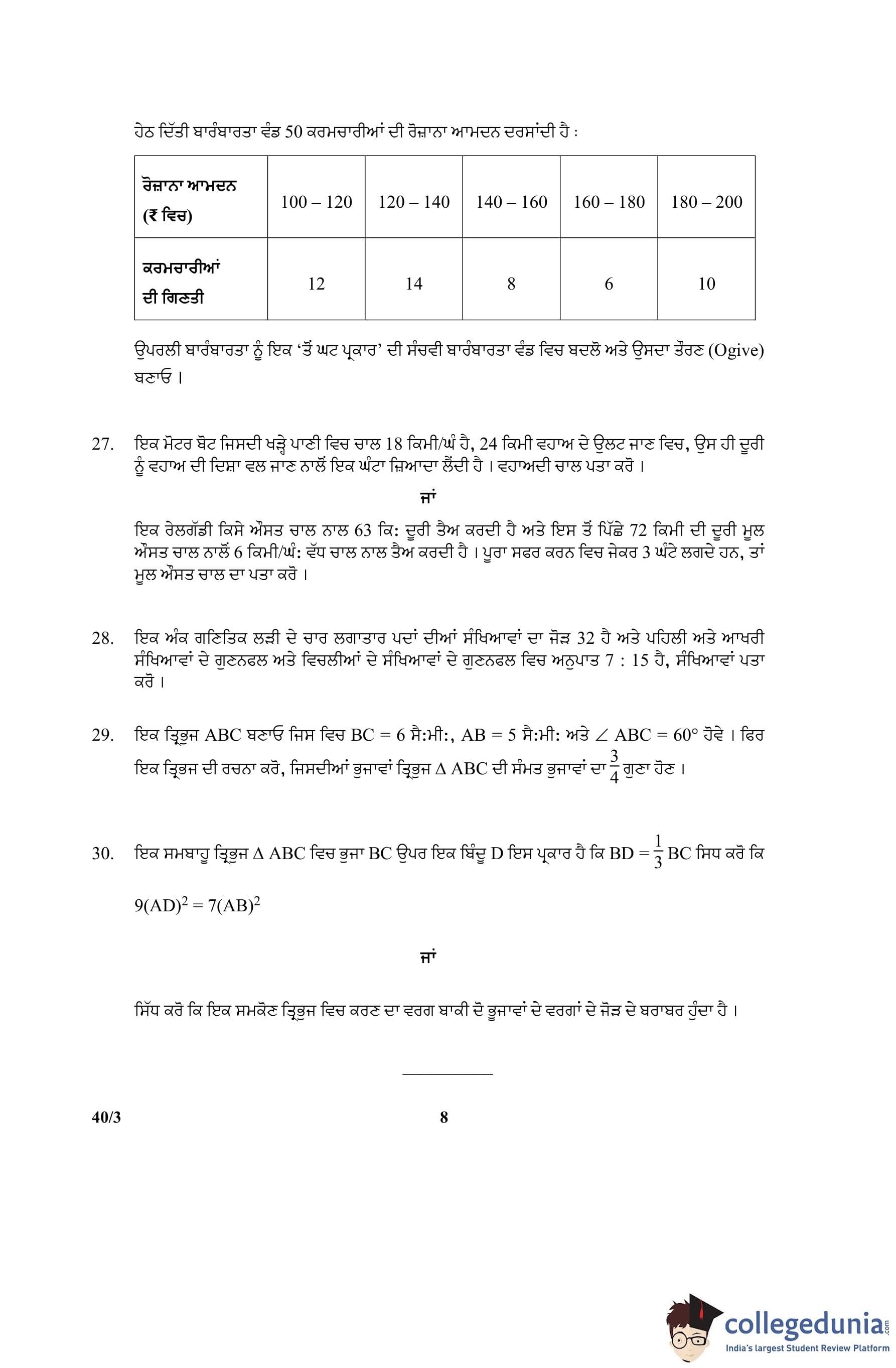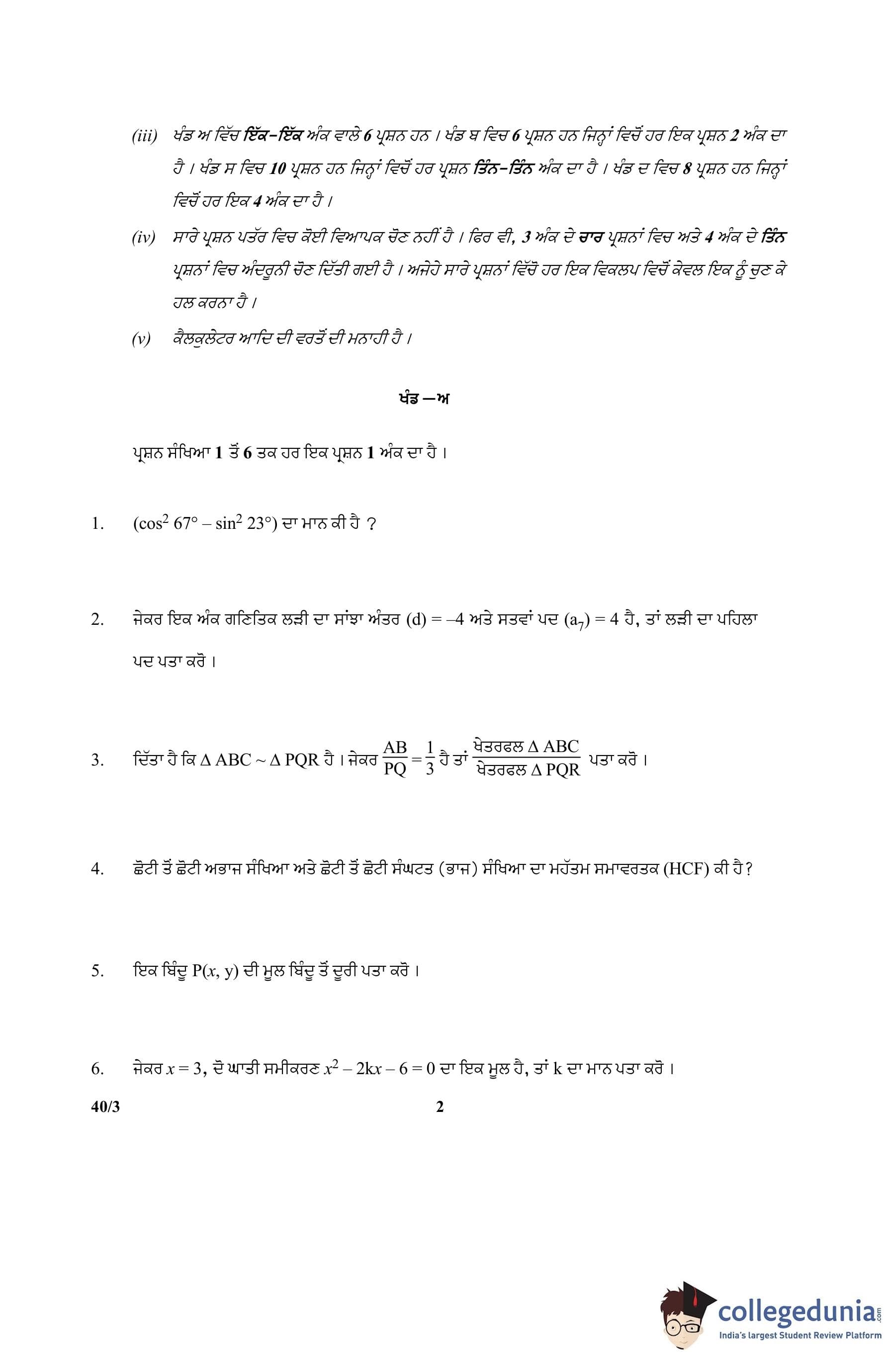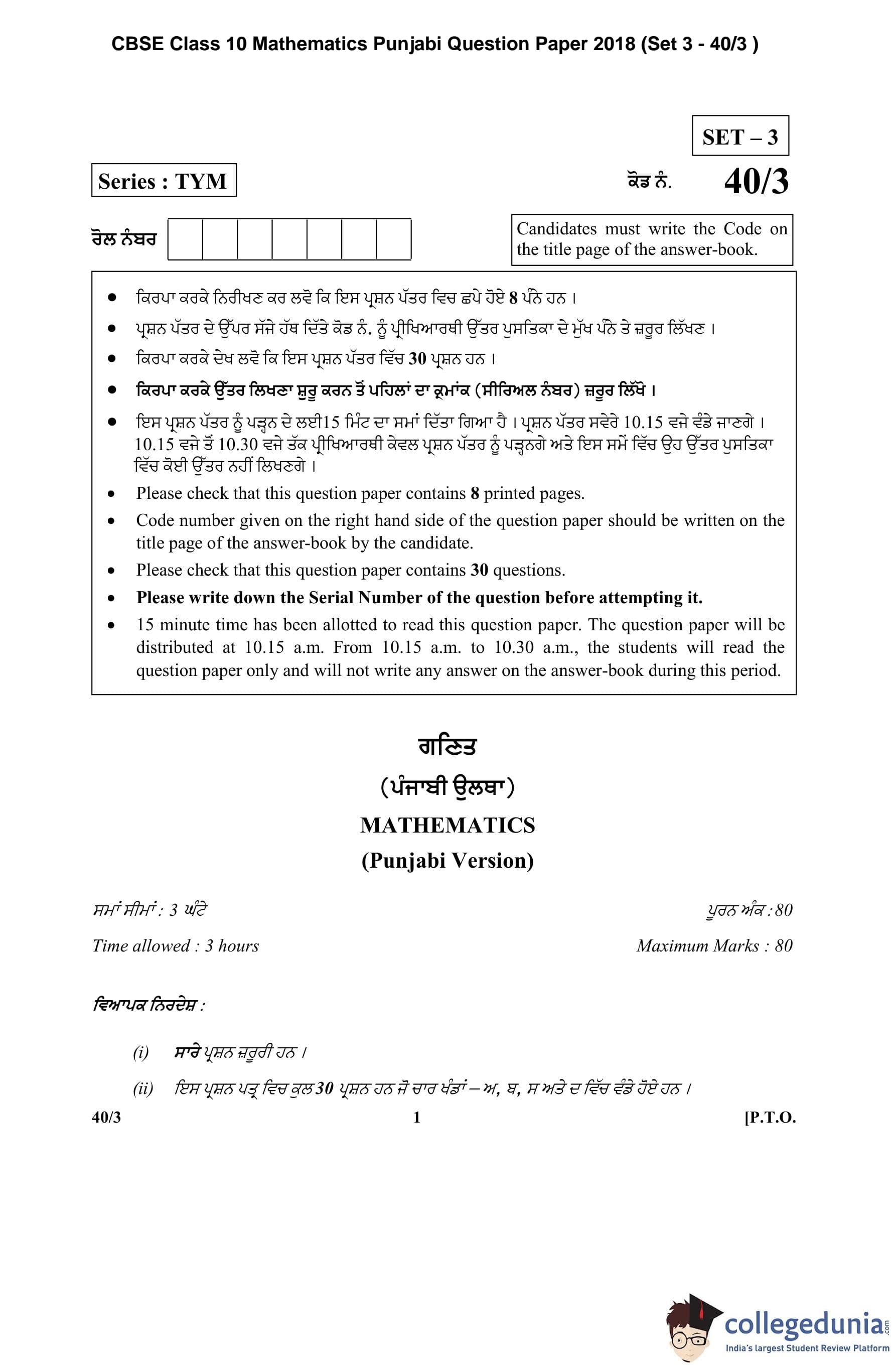 CBSE Class 10 Mathematics Punjabi Question Paper 2018 with Answer Key Set 3 - 40/3 is available for download. The exam was conducted by the Central Board of Secondary Education on March 28, 2018 in the Morning Session 10:30 AM to 1:30 PM. The medium of paper was Punjabi. The question paper comprised a total of 30 questions divided among 4 sections.