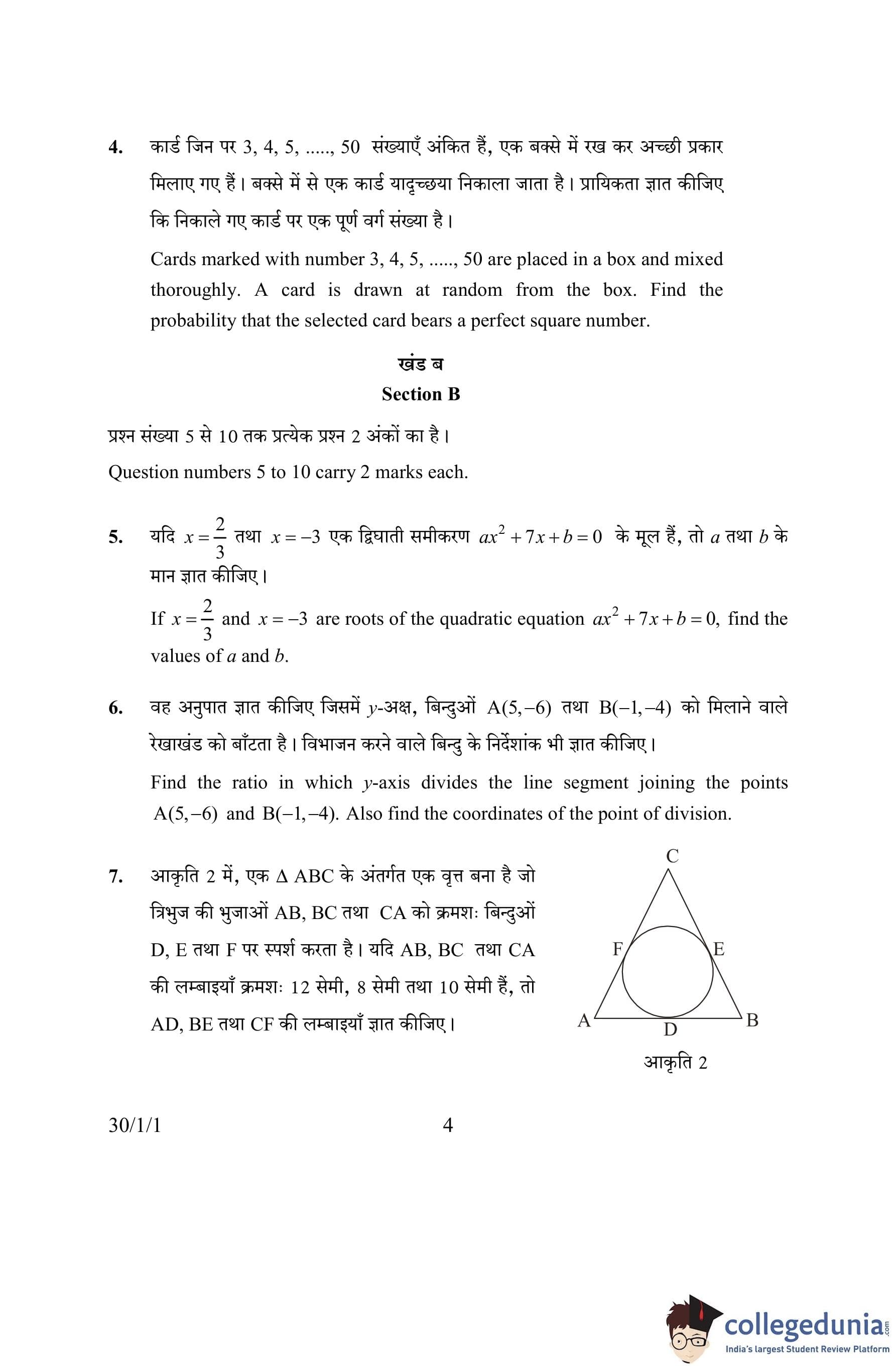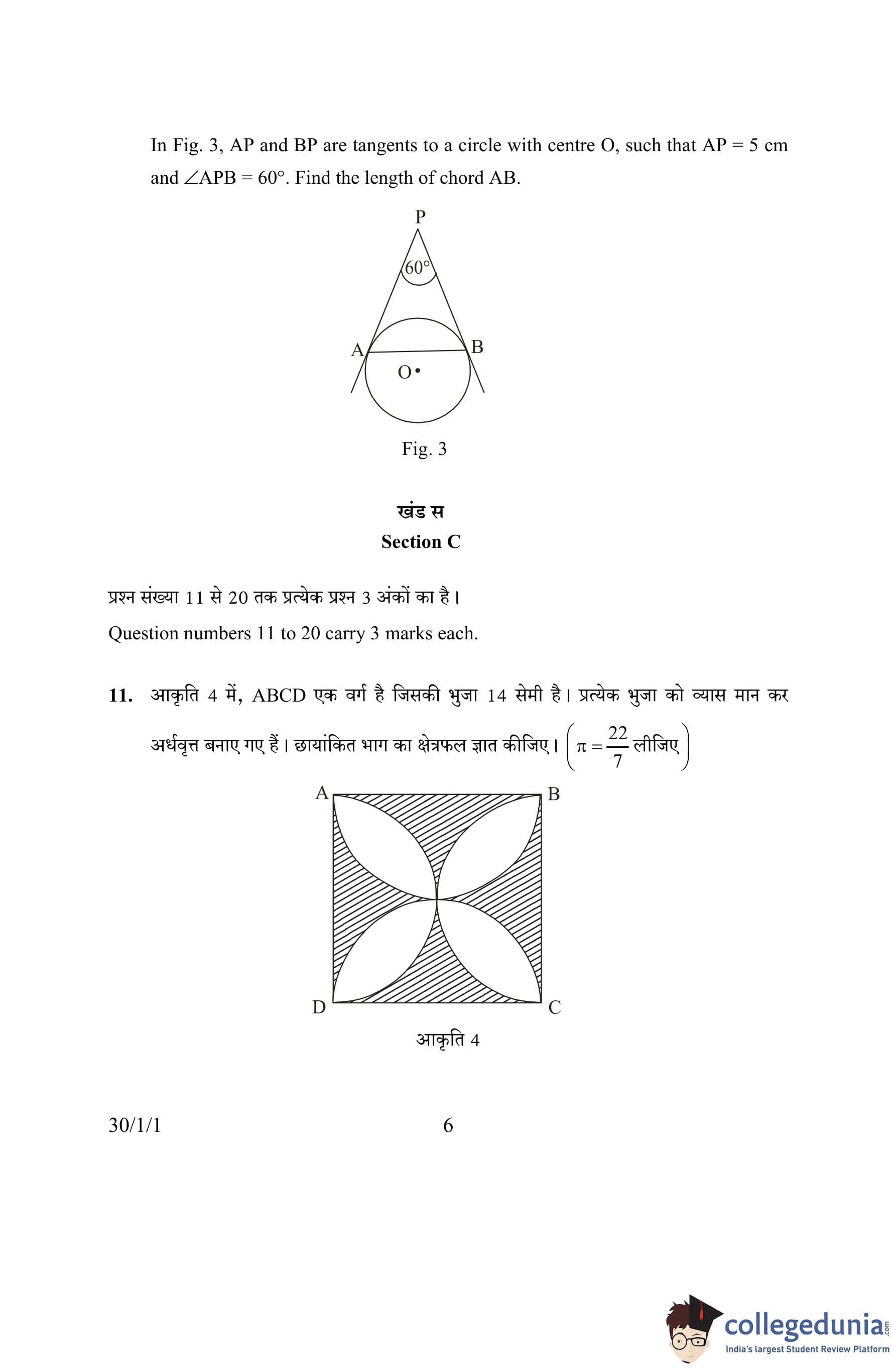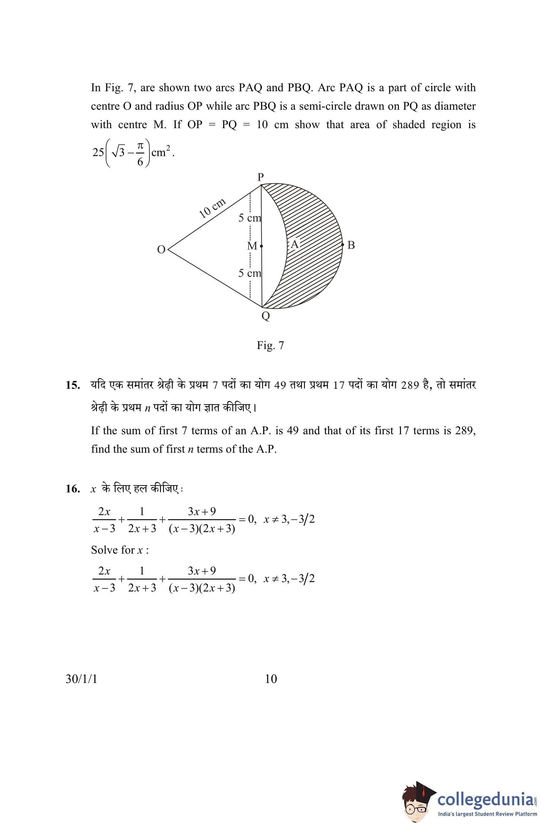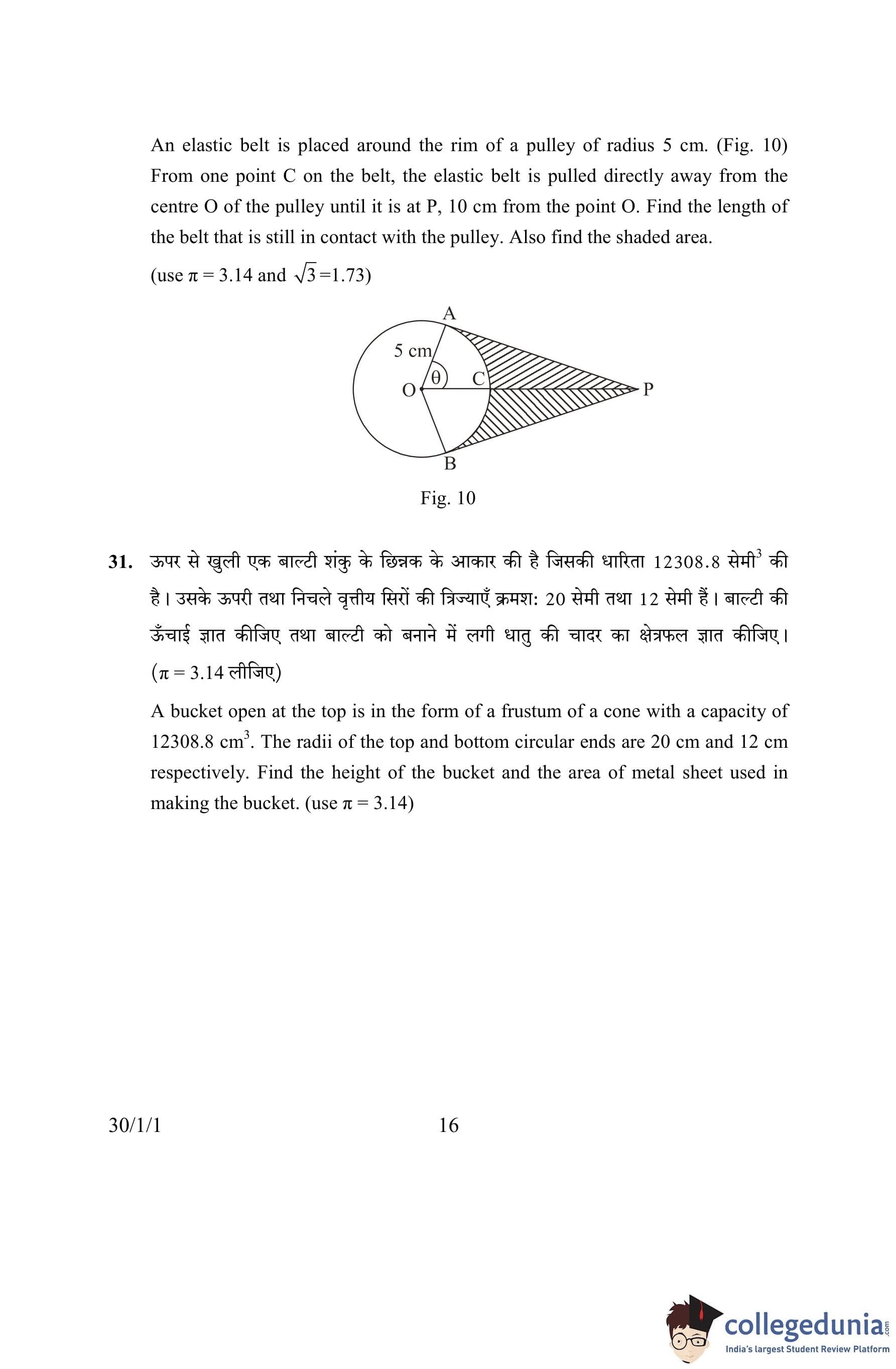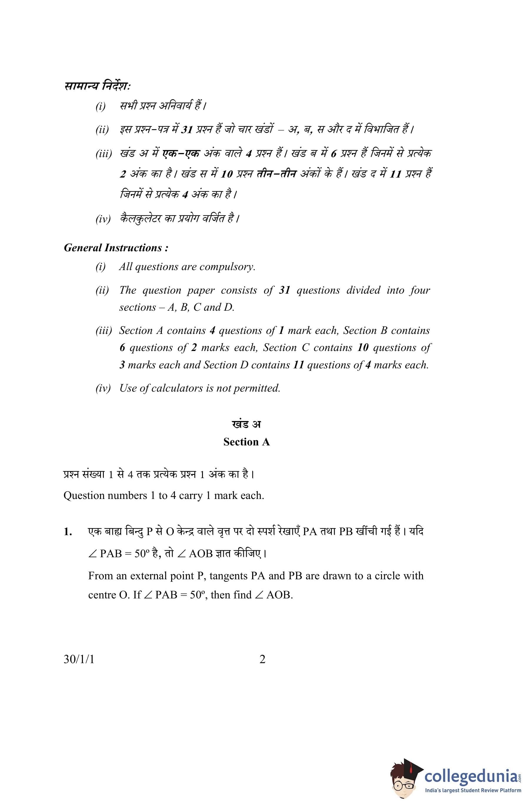 CBSE Class 10 Mathematics Question Paper 2016 with Answer Key Set 1- 30/1/1 is available for download. The exam was conducted by the Central Board of Secondary Education on March 19, 2016 in the Morning Session 10:30 AM to 1:30 PM. The medium of paper was English and Hindi. The question paper comprised a total of 31 questions divided among 4 sections.