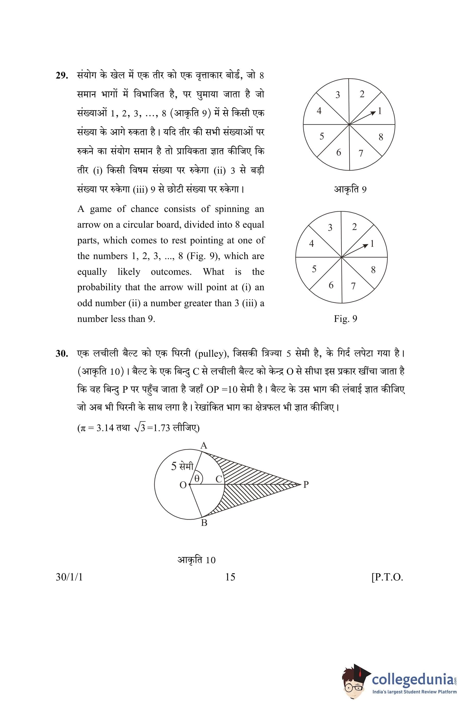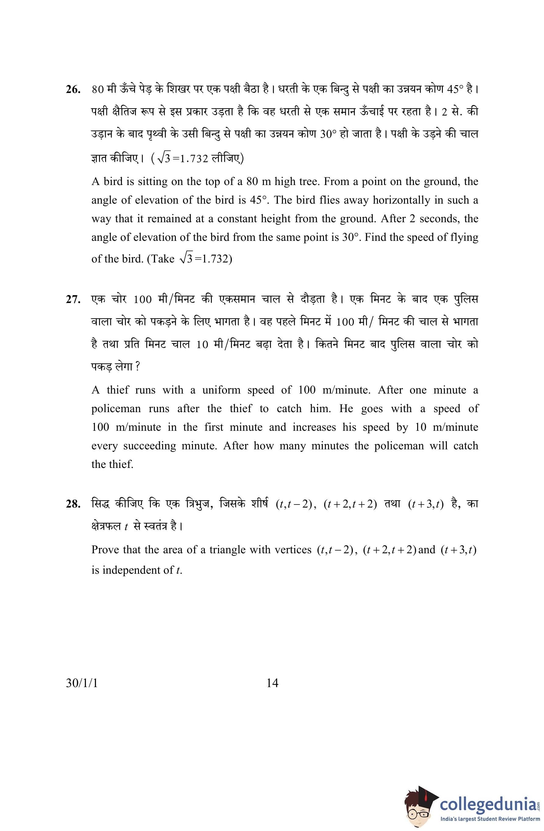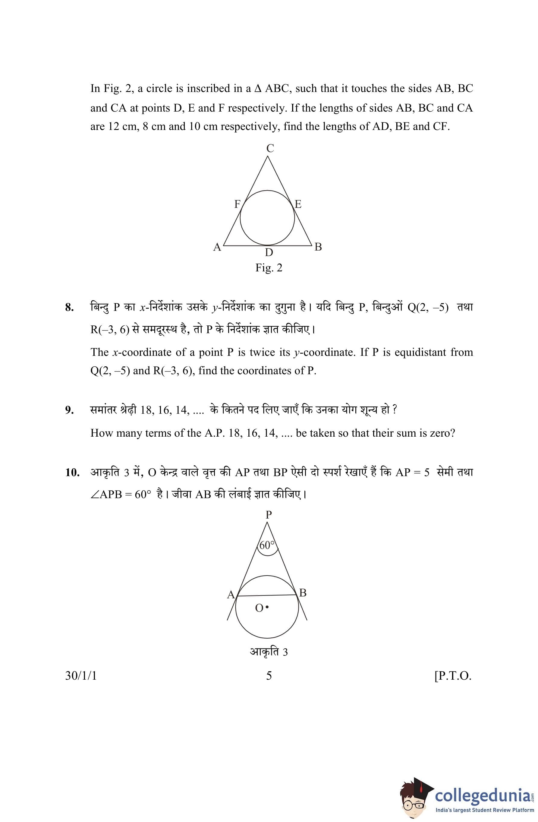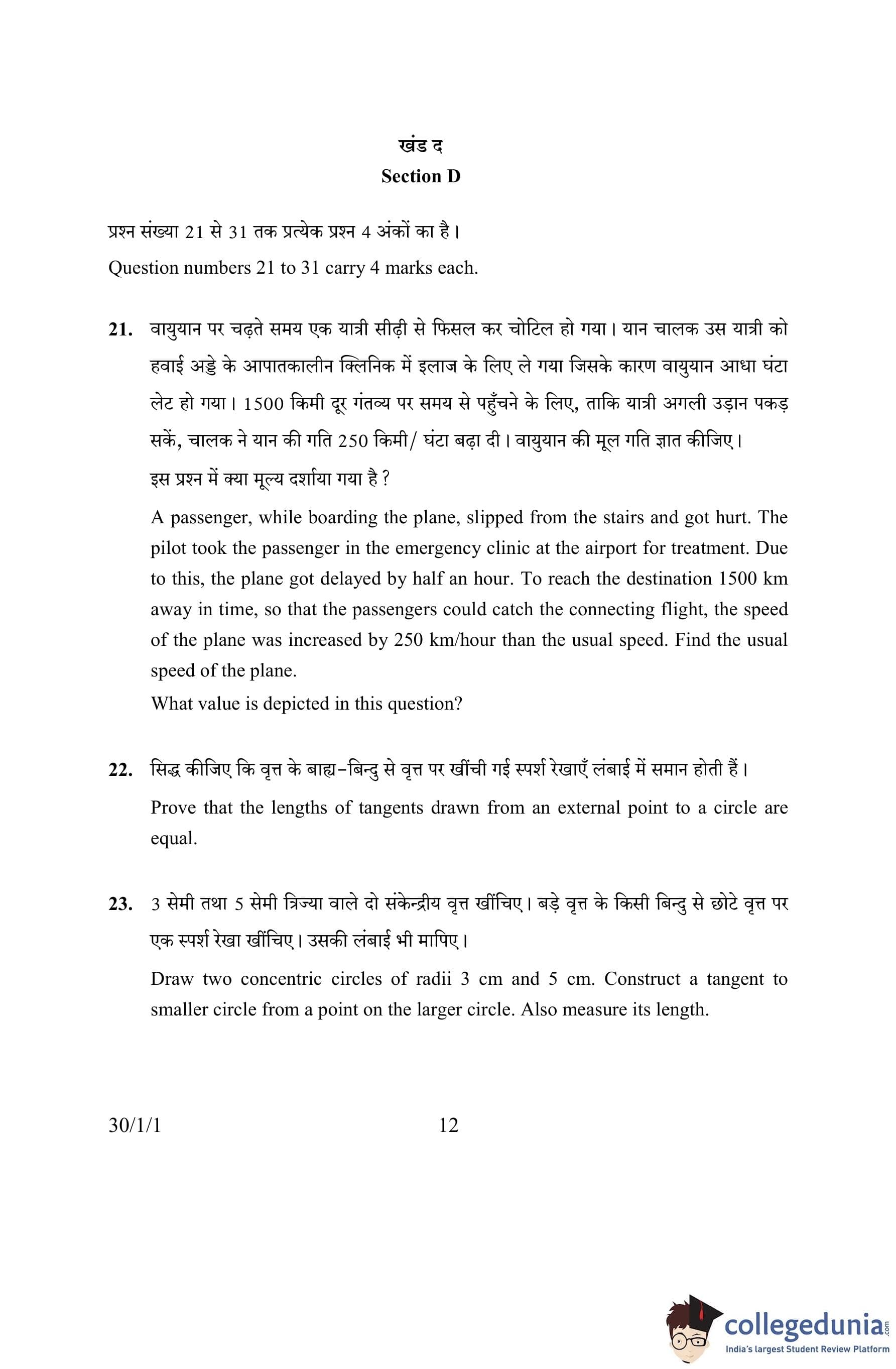 CBSE Class 10 Mathematics Question Paper 2016 with Answer Key Set 1- 30/1/1 is available for download. The exam was conducted by the Central Board of Secondary Education on March 19, 2016 in the Morning Session 10:30 AM to 1:30 PM. The medium of paper was English and Hindi. The question paper comprised a total of 31 questions divided among 4 sections.