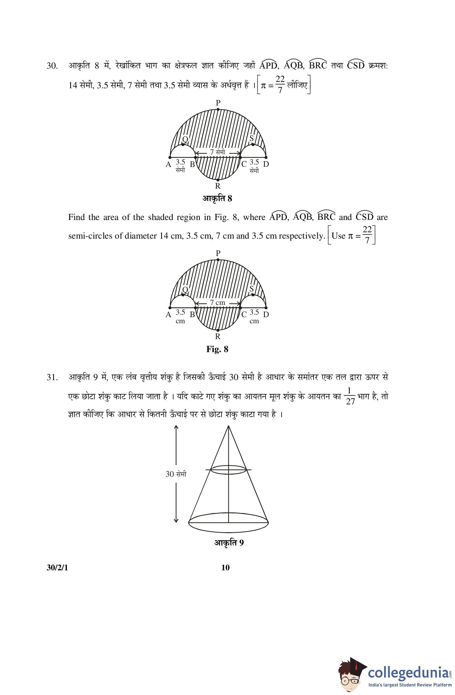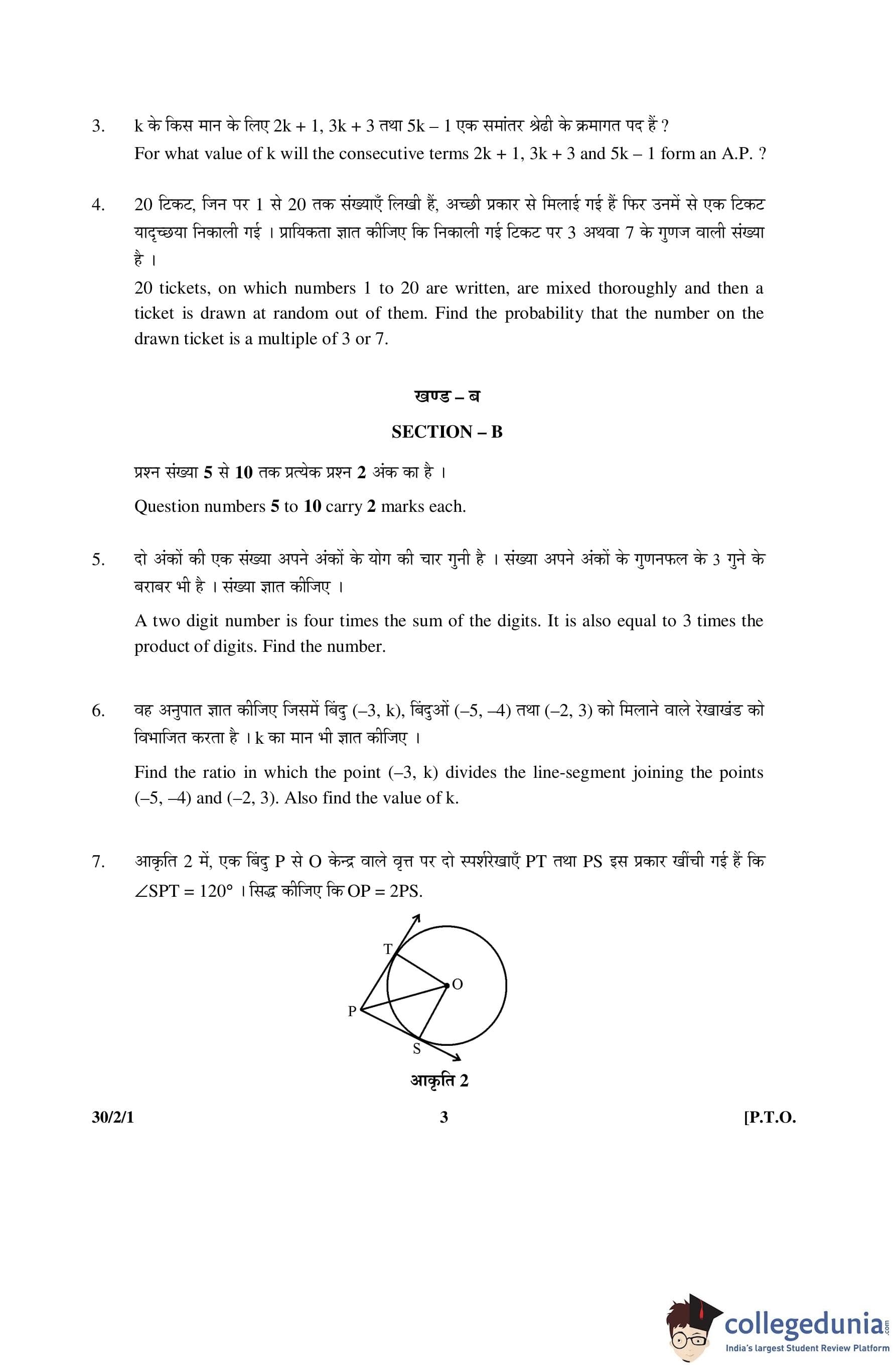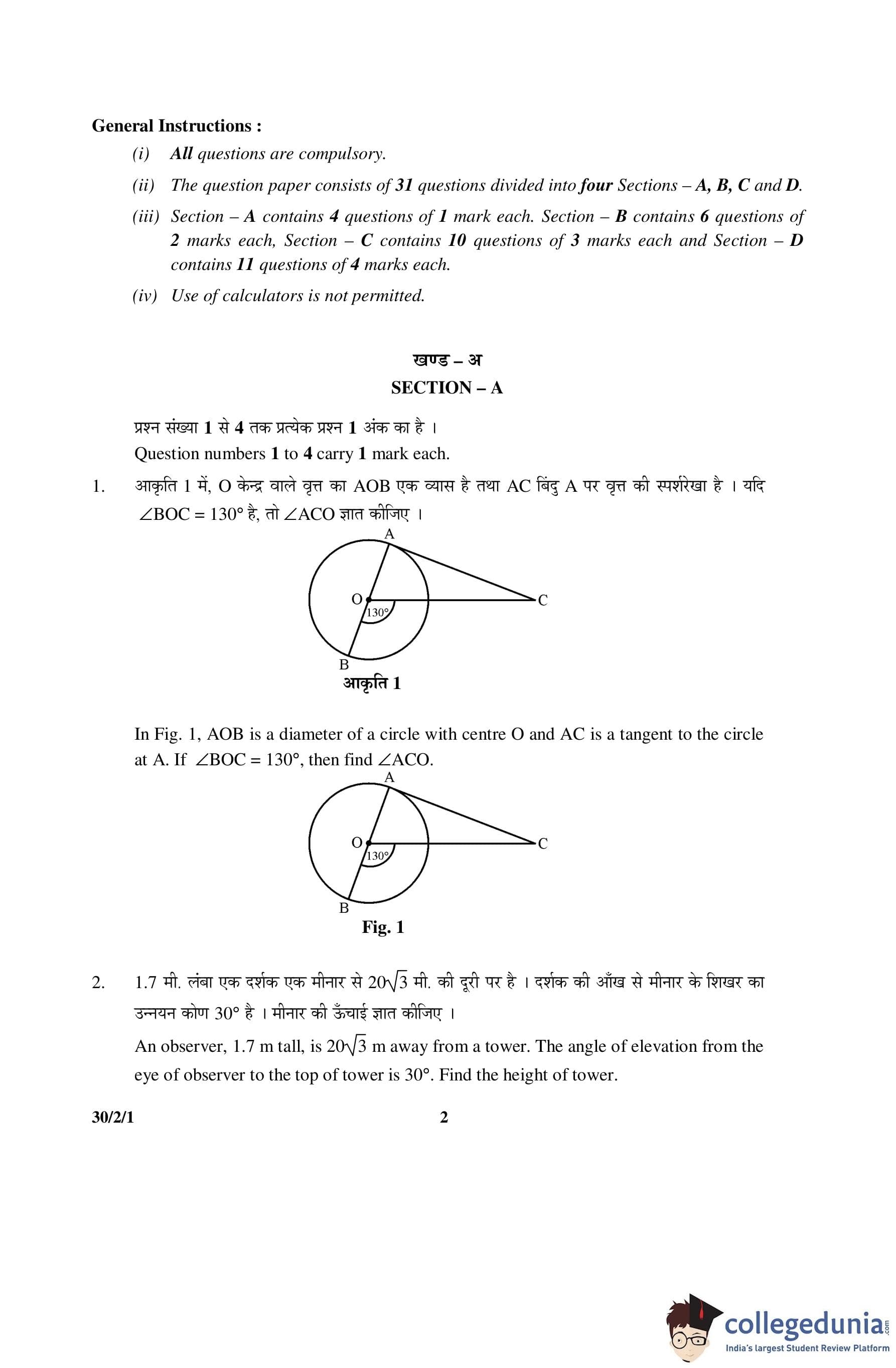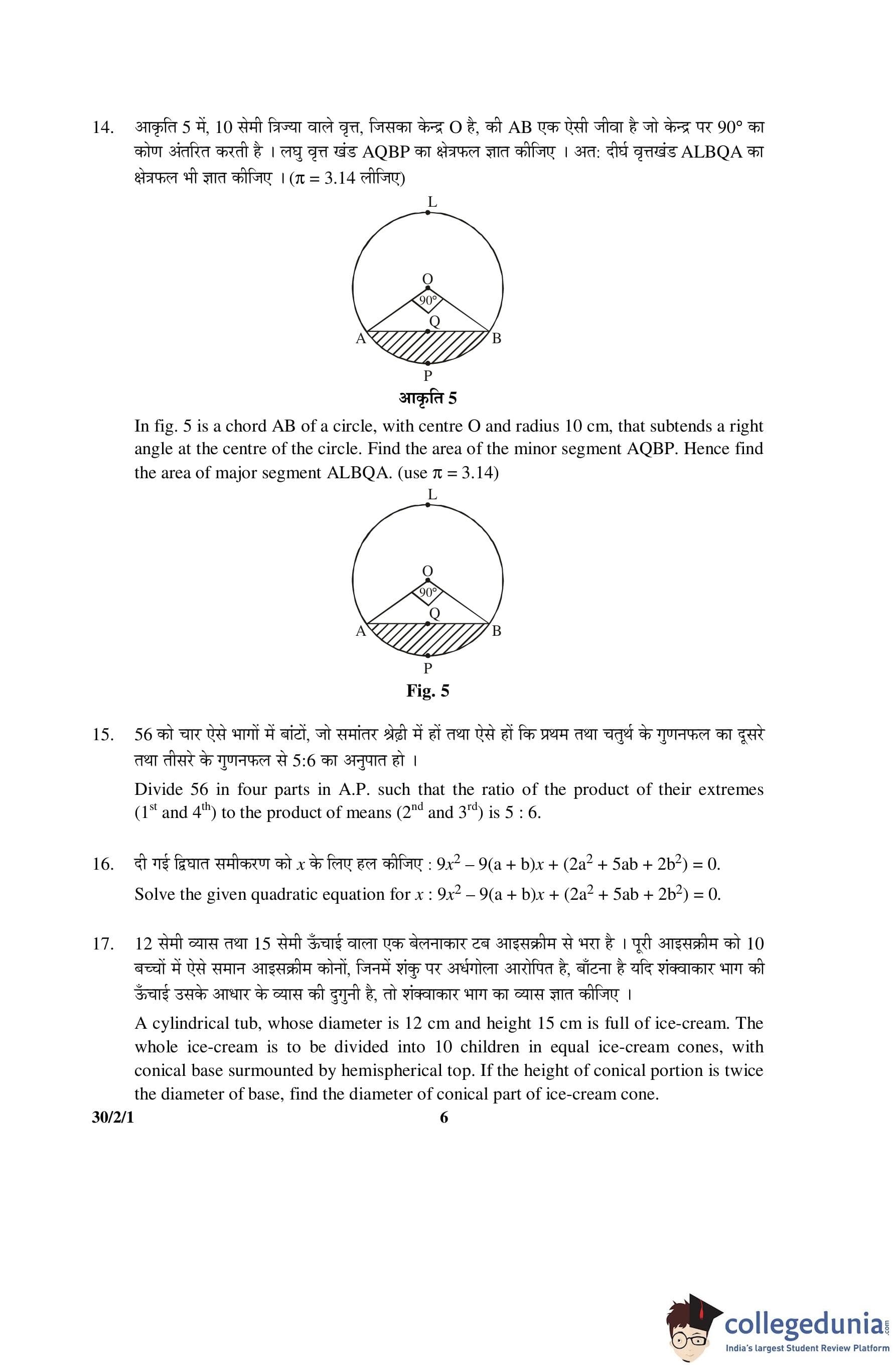CBSE Class 10 Mathematics Question Paper 2016 with Answer Key Set 1- 30/2/1 is available for download. The exam was conducted by the Central Board of Secondary Education on March 19, 2016 in the Morning Session 10:30 AM to 1:30 PM. The medium of paper was English and Hindi. The question paper comprised a total of 31 questions divided among 4 sections.