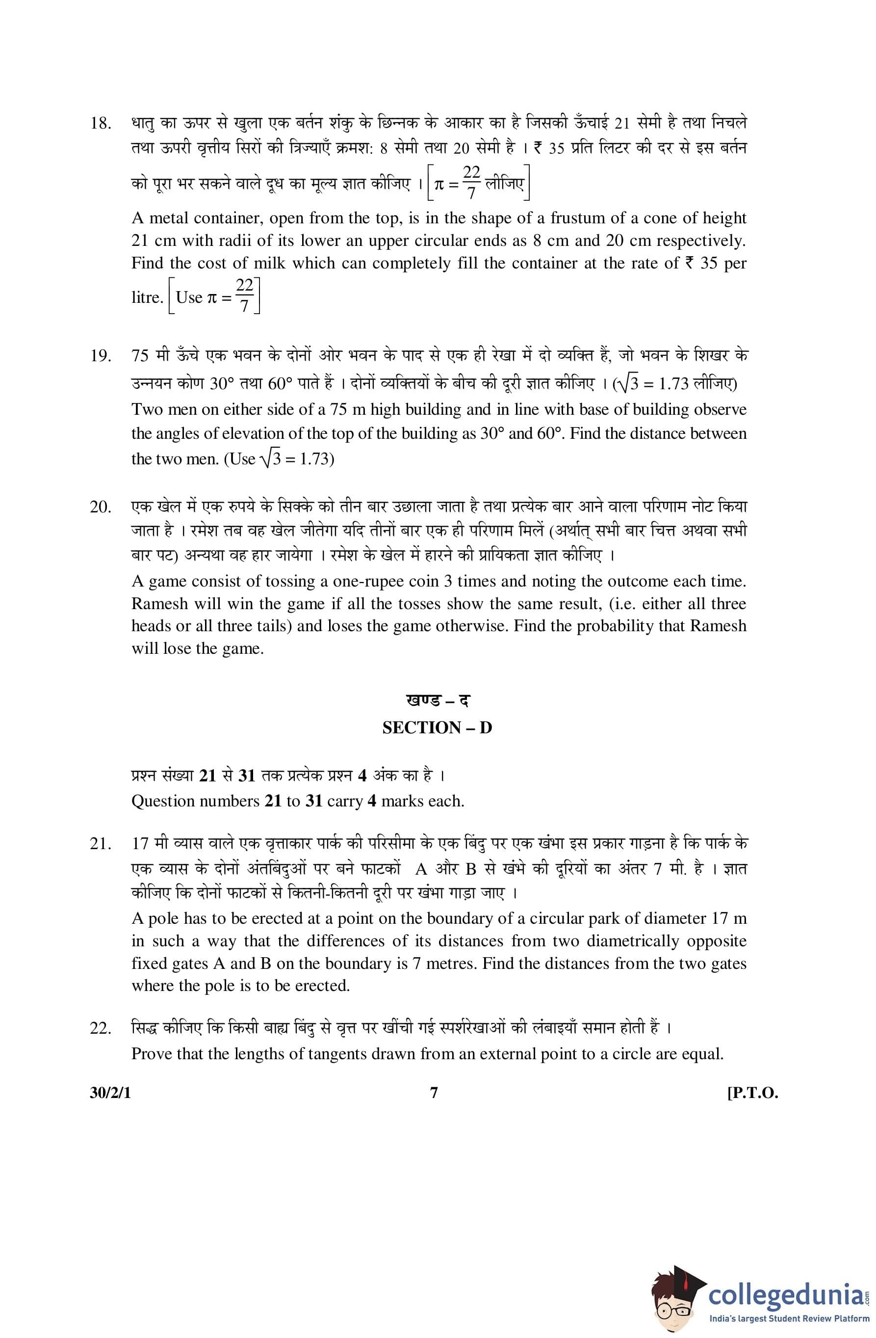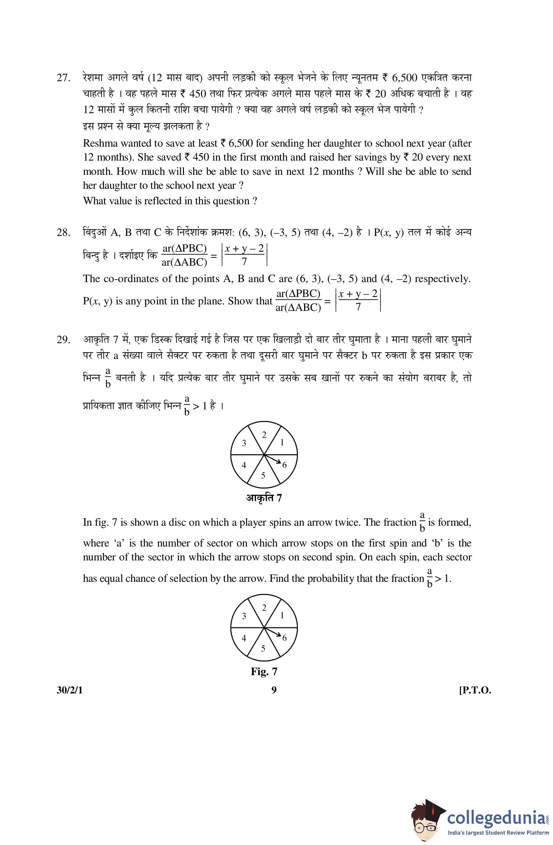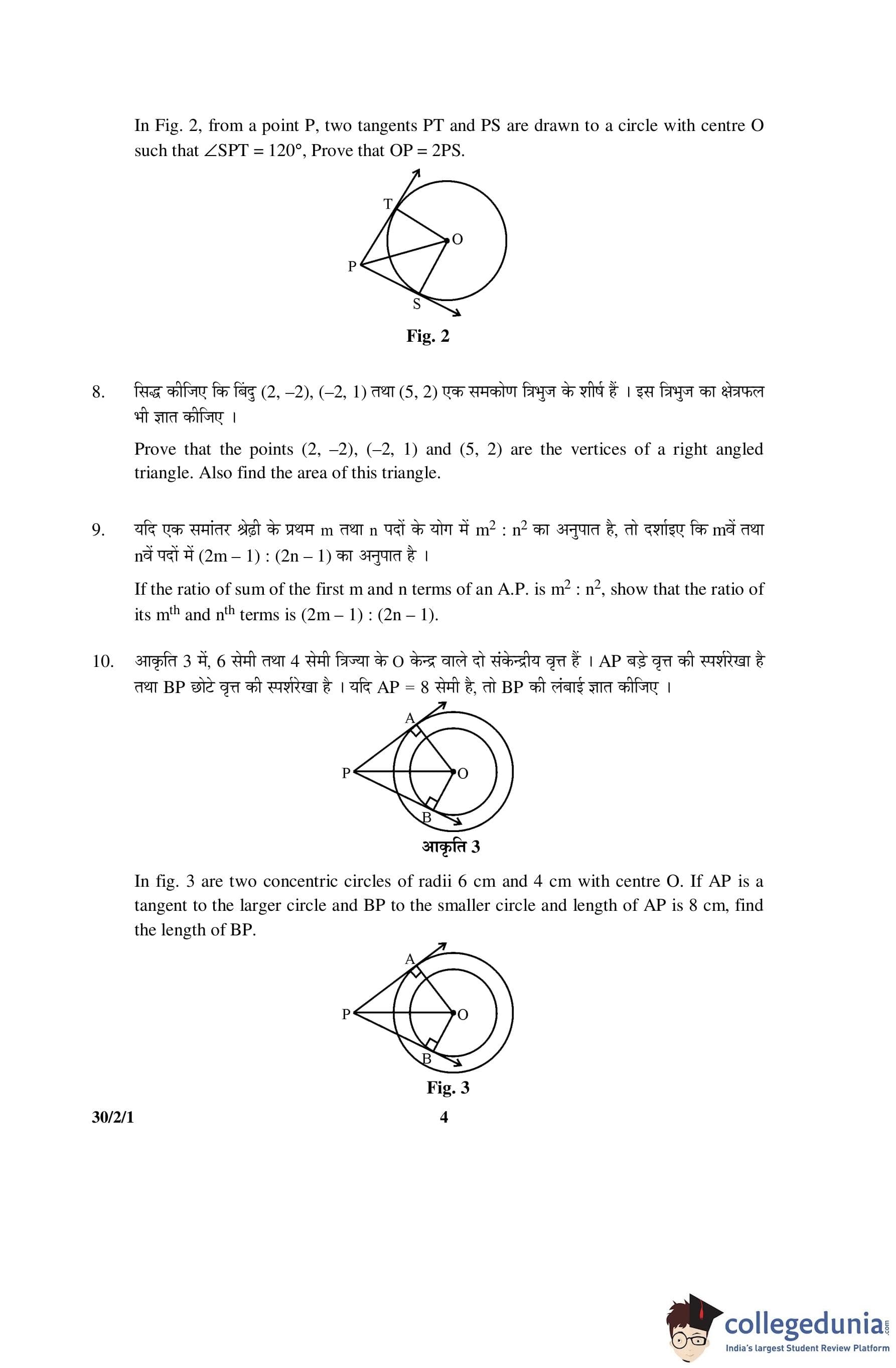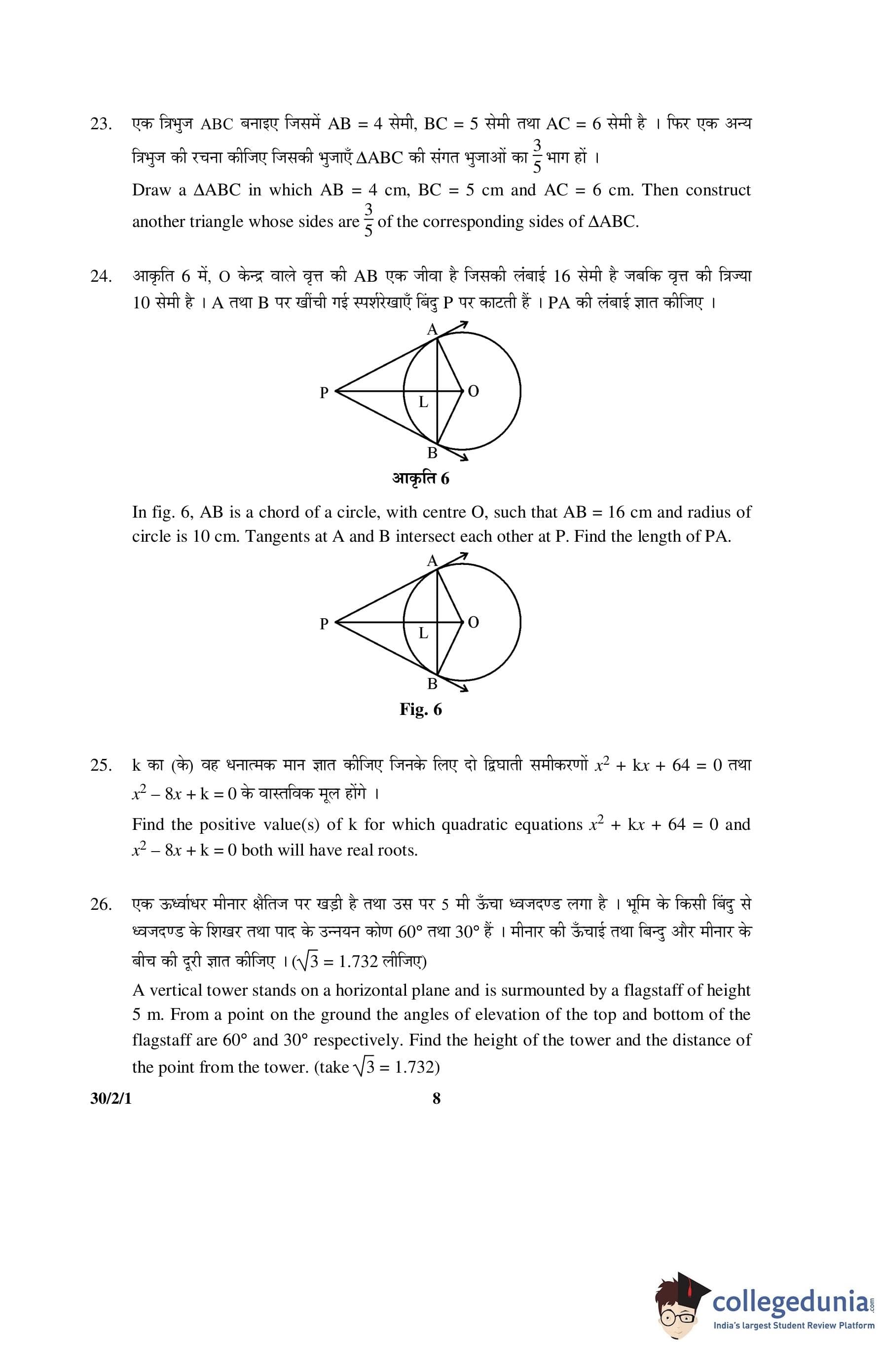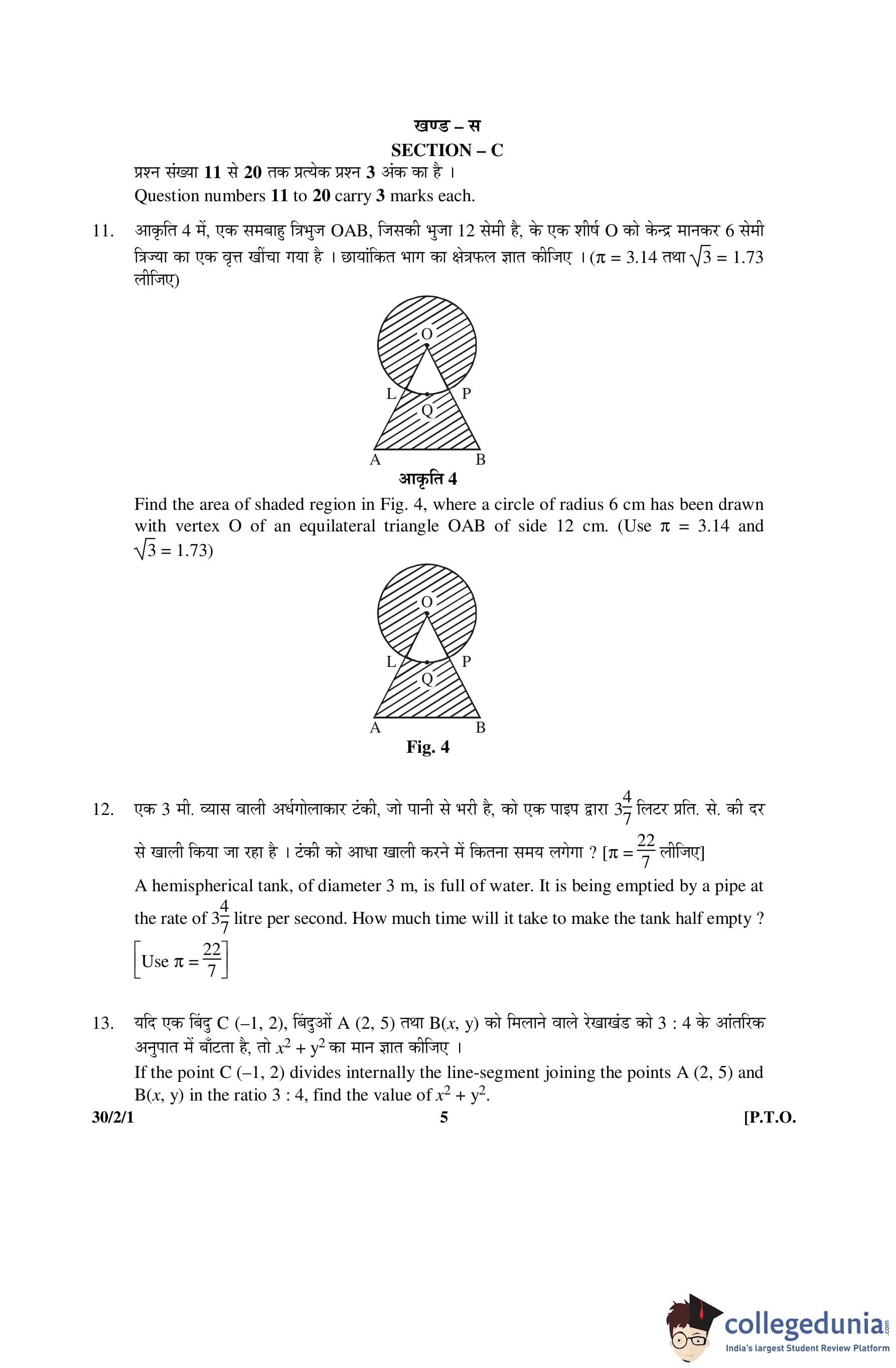 CBSE Class 10 Mathematics Question Paper 2016 with Answer Key Set 1- 30/2/1 is available for download. The exam was conducted by the Central Board of Secondary Education on March 19, 2016 in the Morning Session 10:30 AM to 1:30 PM. The medium of paper was English and Hindi. The question paper comprised a total of 31 questions divided among 4 sections.