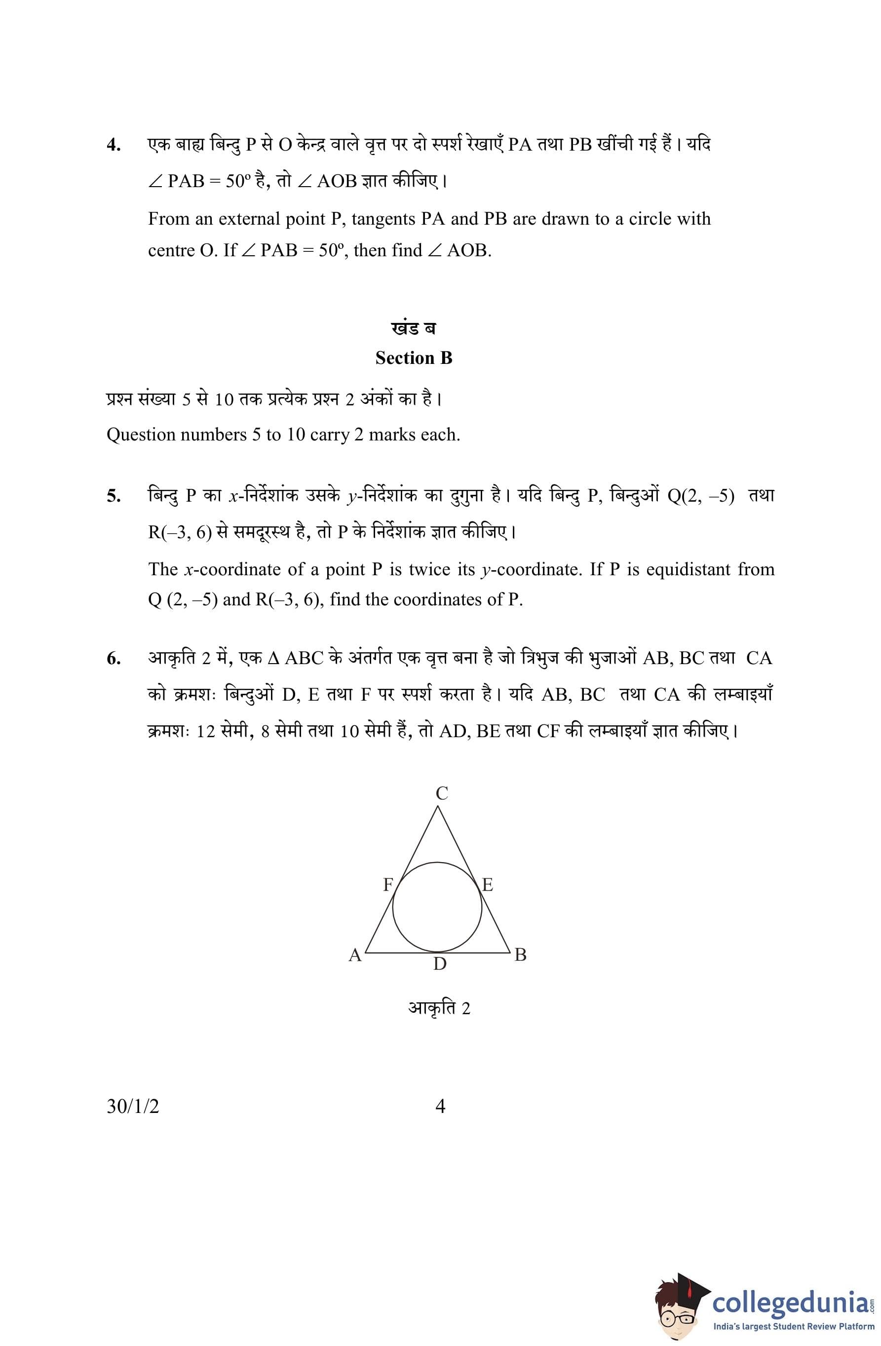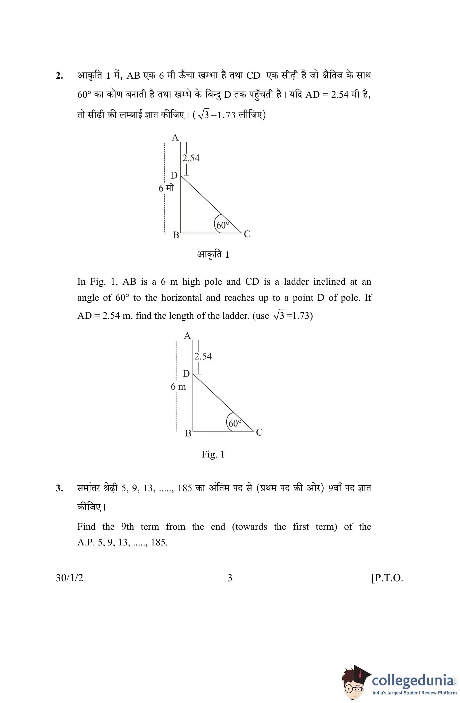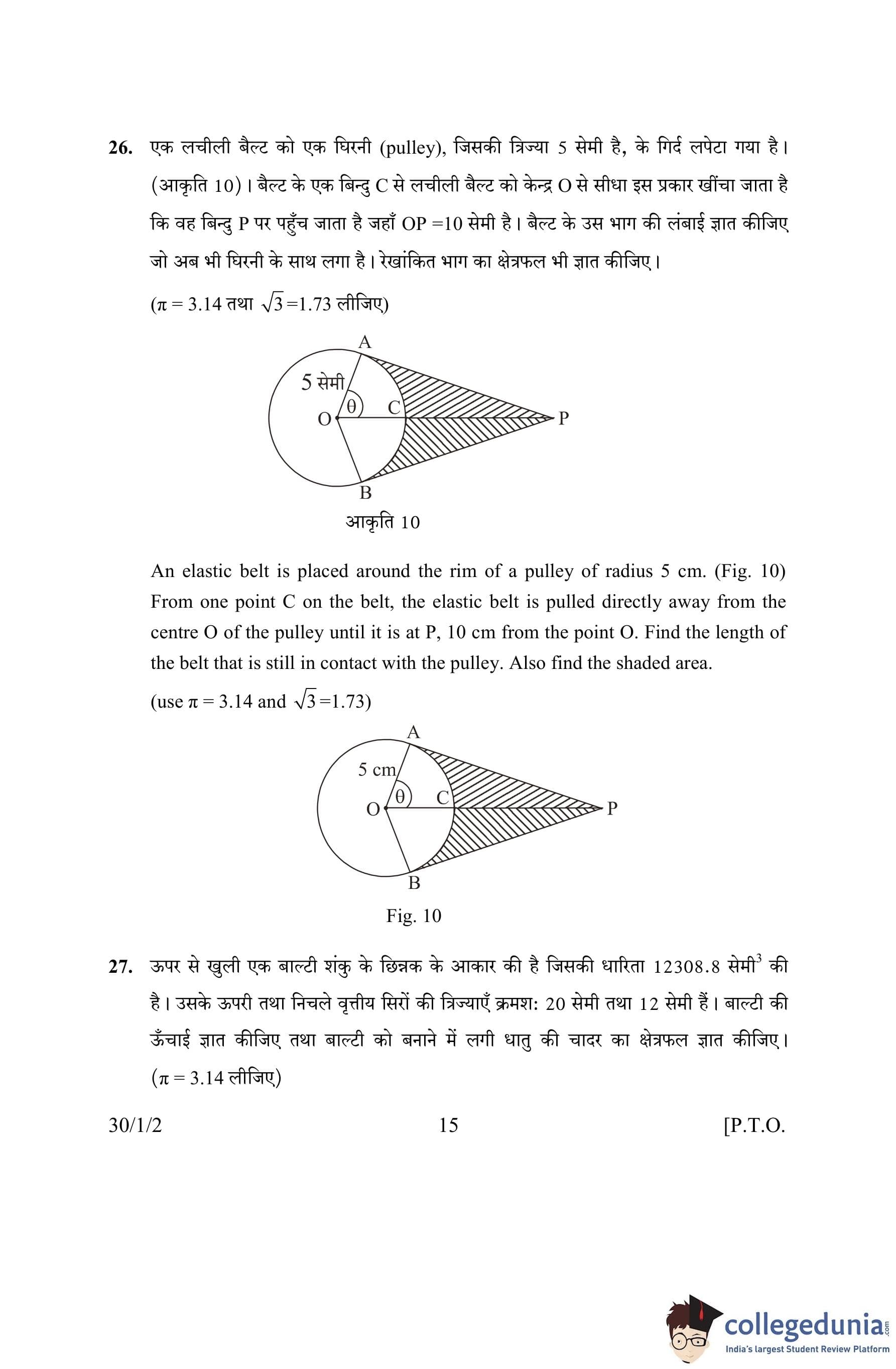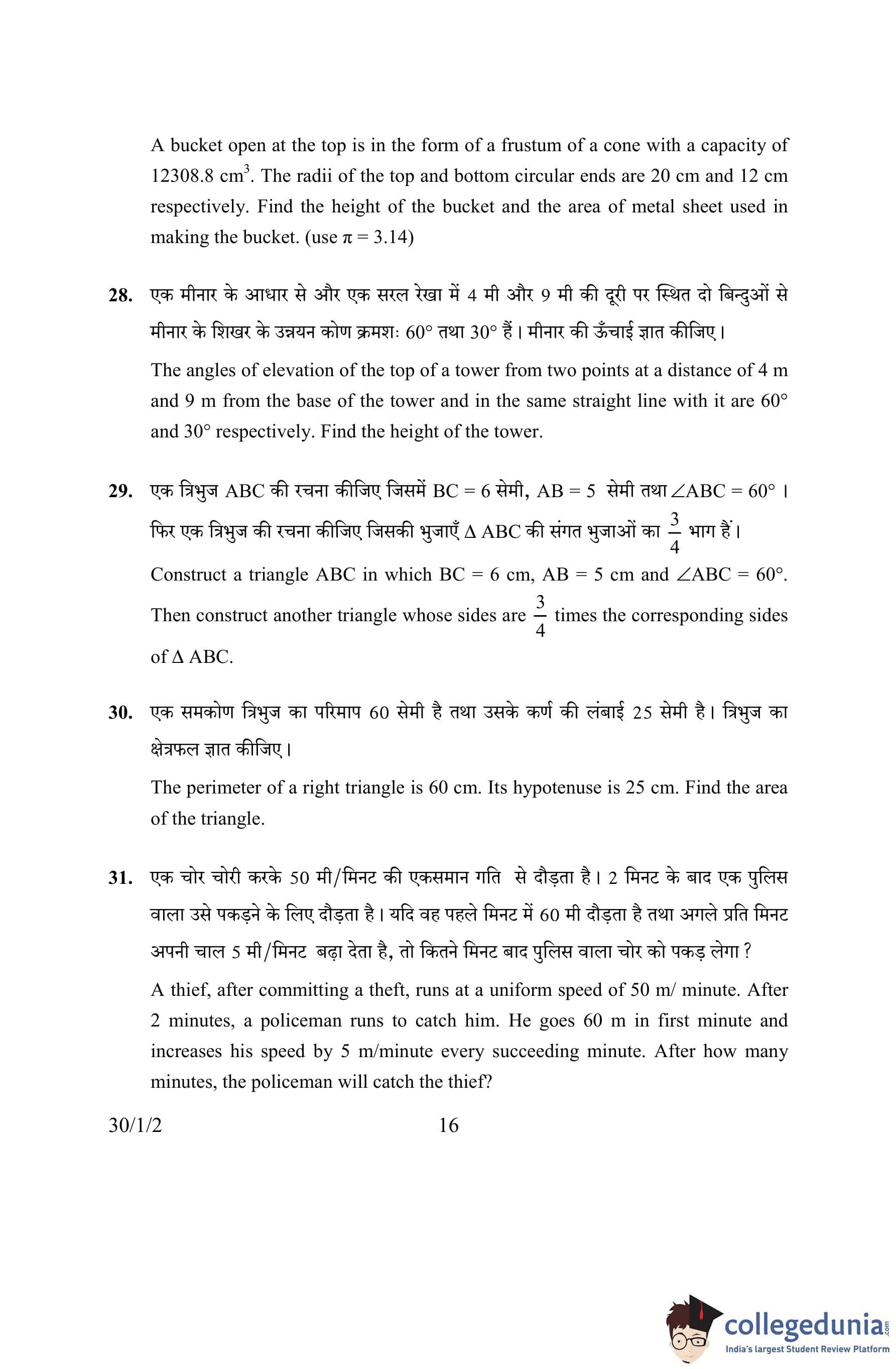 CBSE Class 10 Mathematics Question Paper 2016 with Answer Key Set 2- 30/1/2 is available for download. The exam was conducted by the Central Board of Secondary Education on March 19, 2016 in the Morning Session 10:30 AM to 1:30 PM. The medium of paper was English and Hindi. The question paper comprised a total of 31 questions divided among 4 sections.