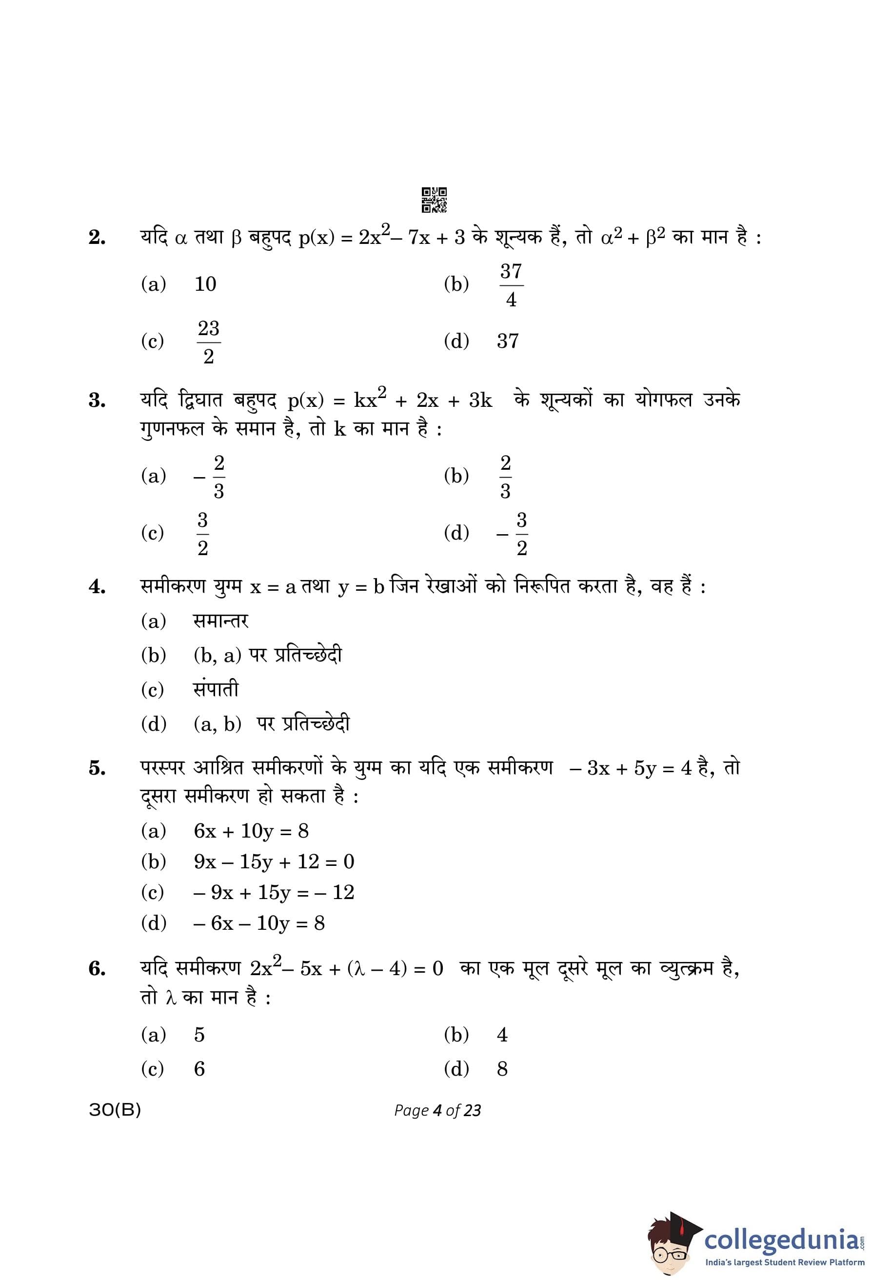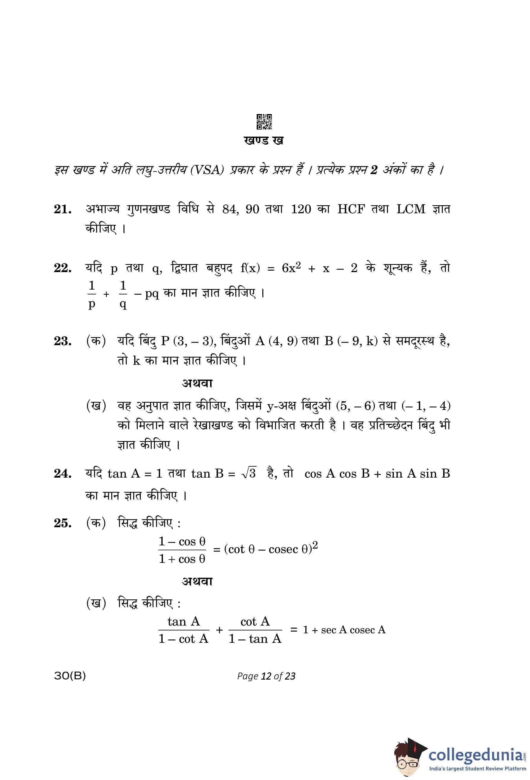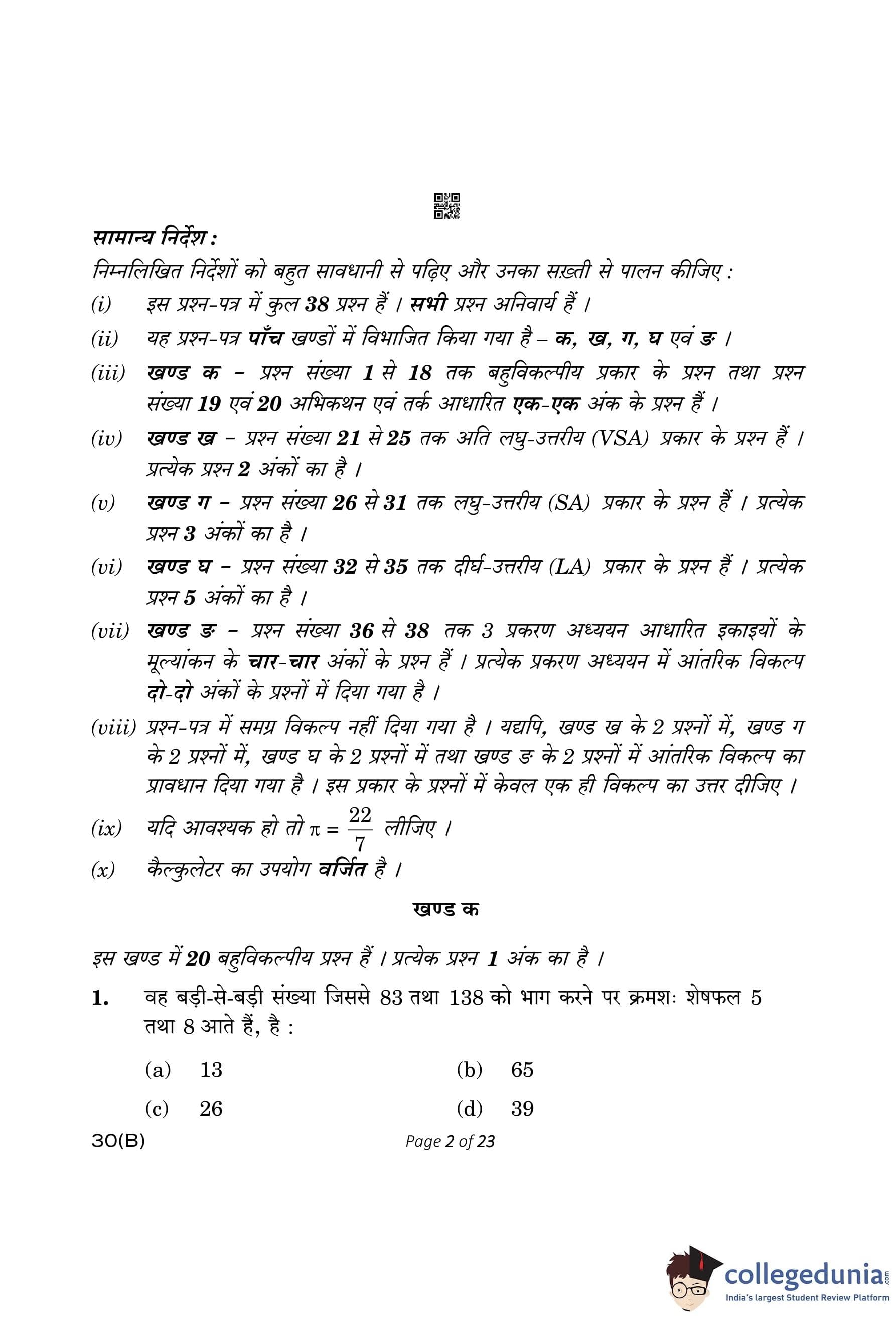 CBSE Class 10 Mathematics Standard (Blind) Compartment Question Paper 2023 with Answer Key