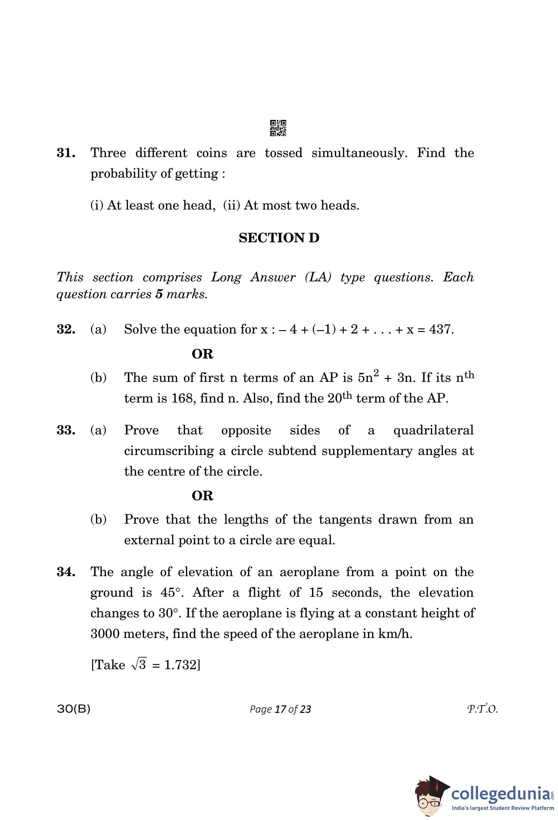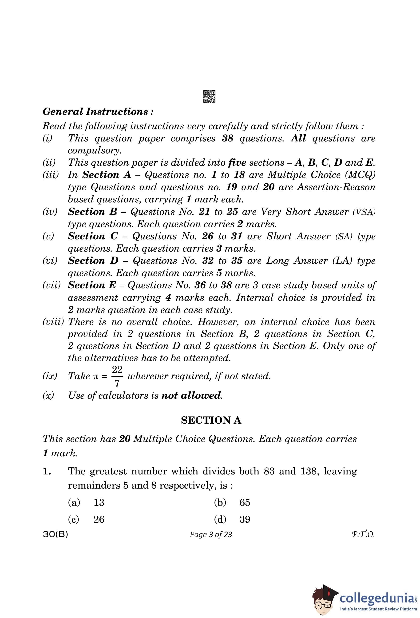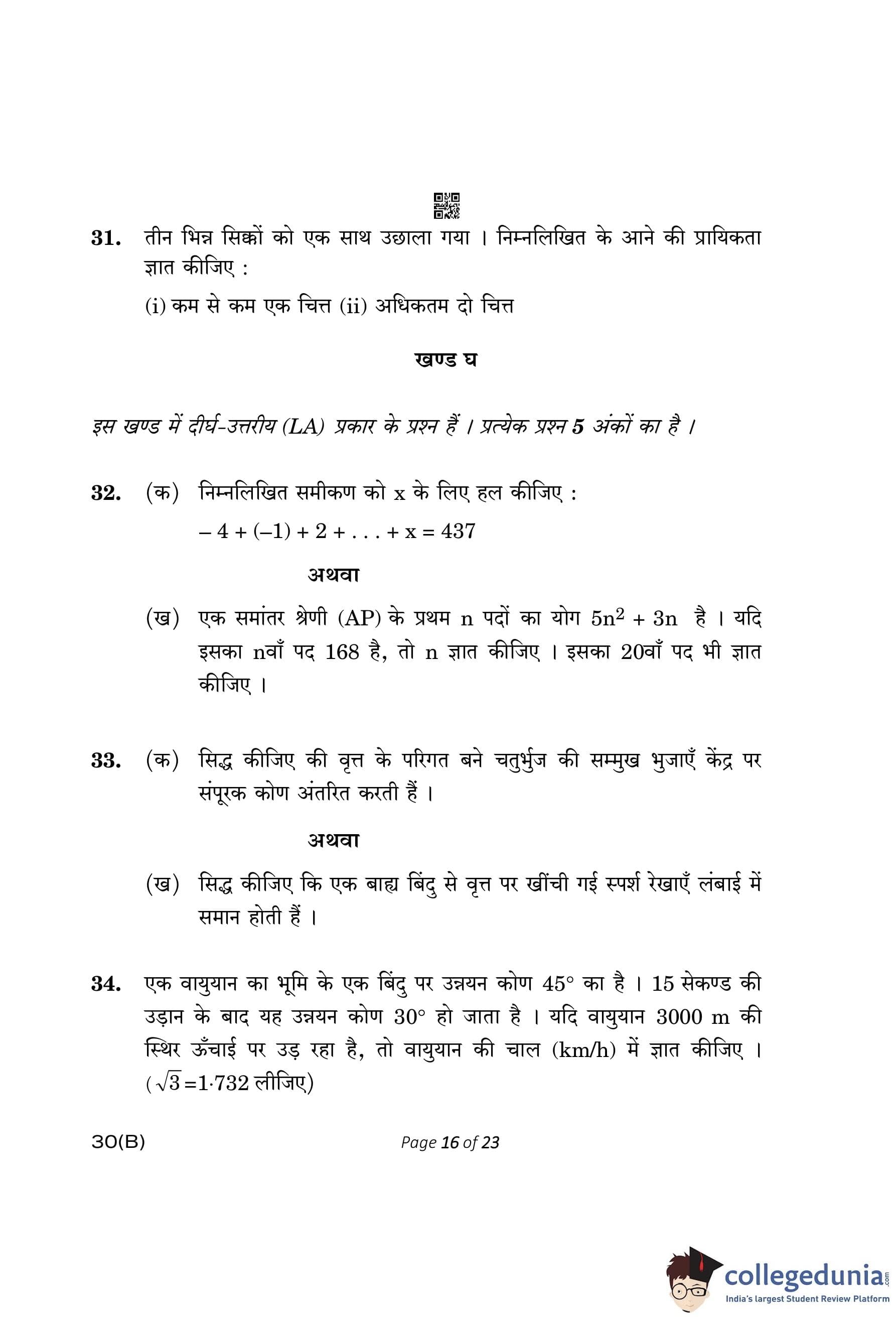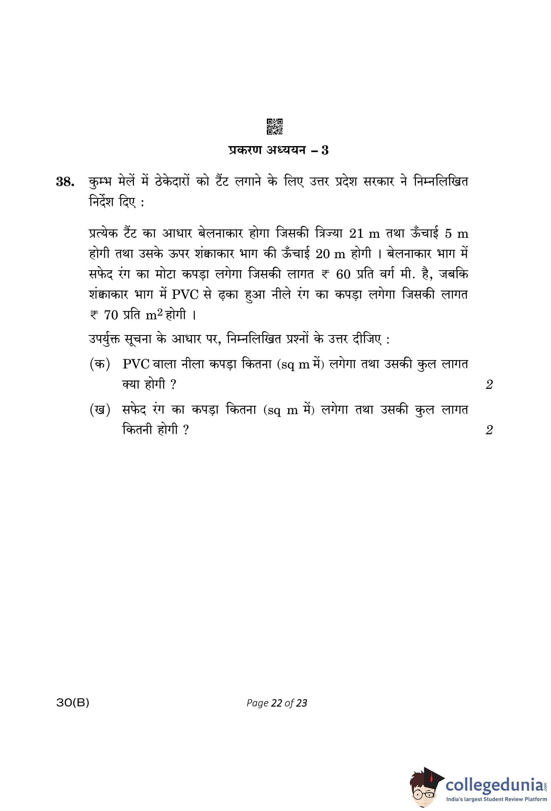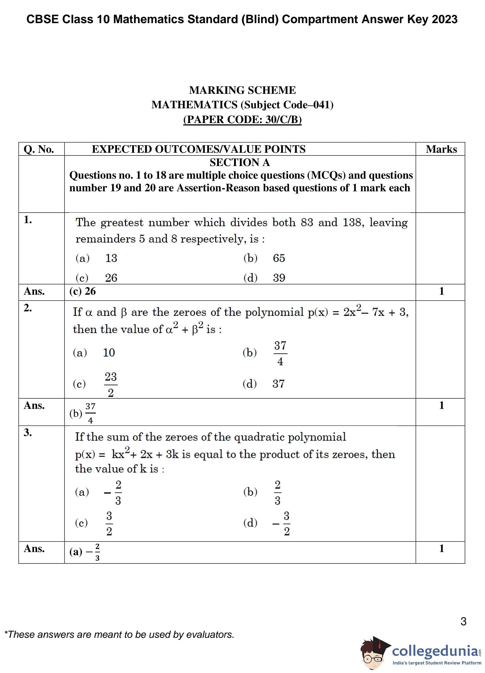 CBSE Class 10 Mathematics Standard (Blind) Compartment Question Paper 2023 with Answer Key pdf is available for download here. The exam was conducted by Central Board of Secondary Education on July 17, 2023 in the Morning Session 10:30 AM to 1:30 PM. The question paper comprised a total of 38 questions divided among 5 sections.