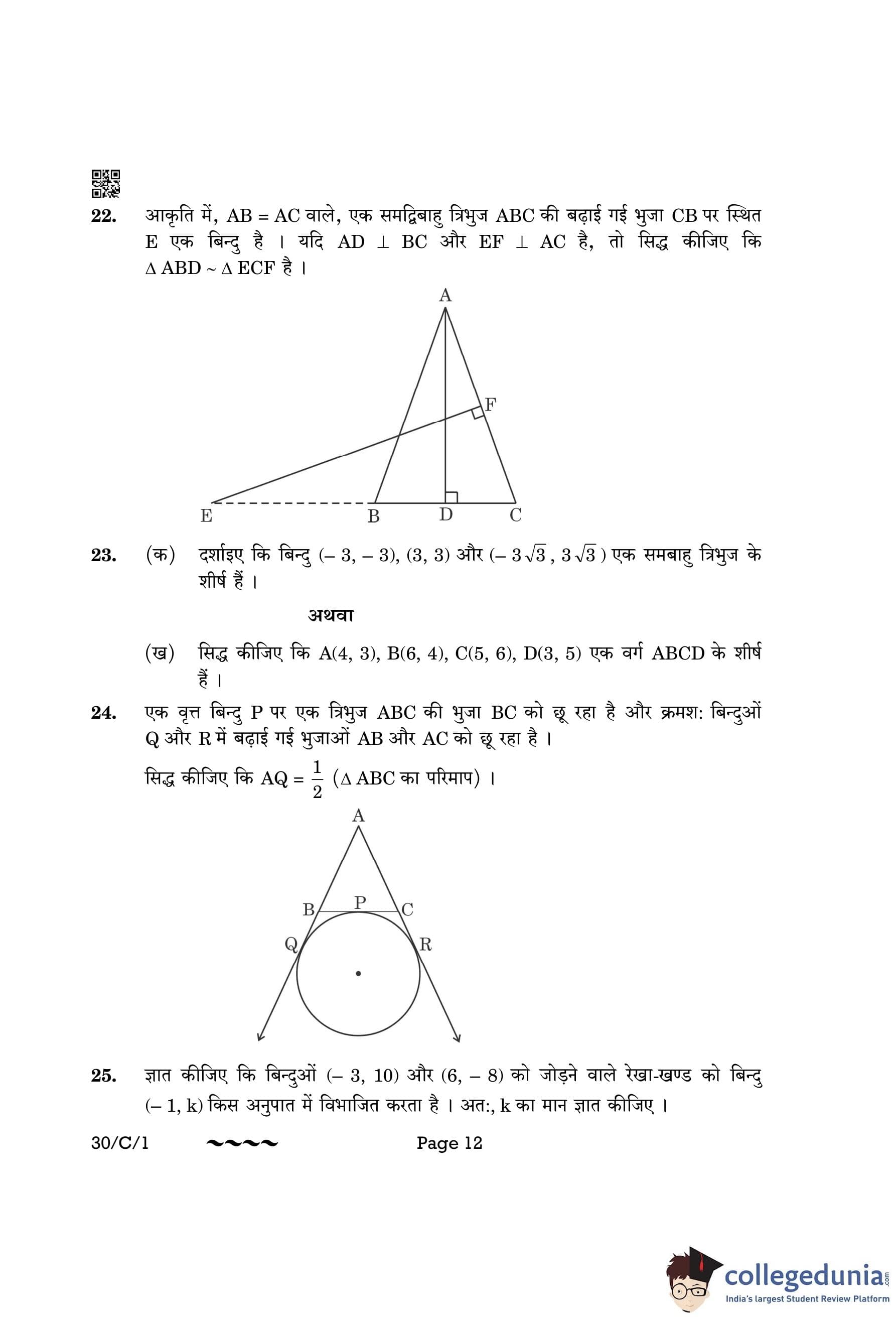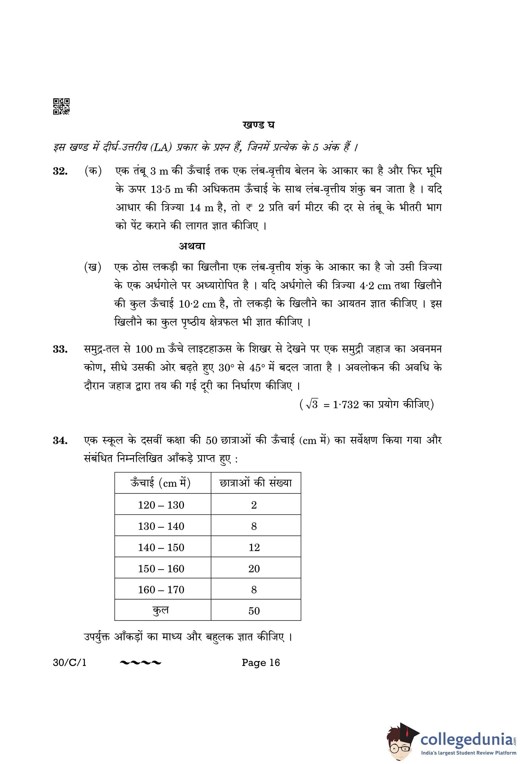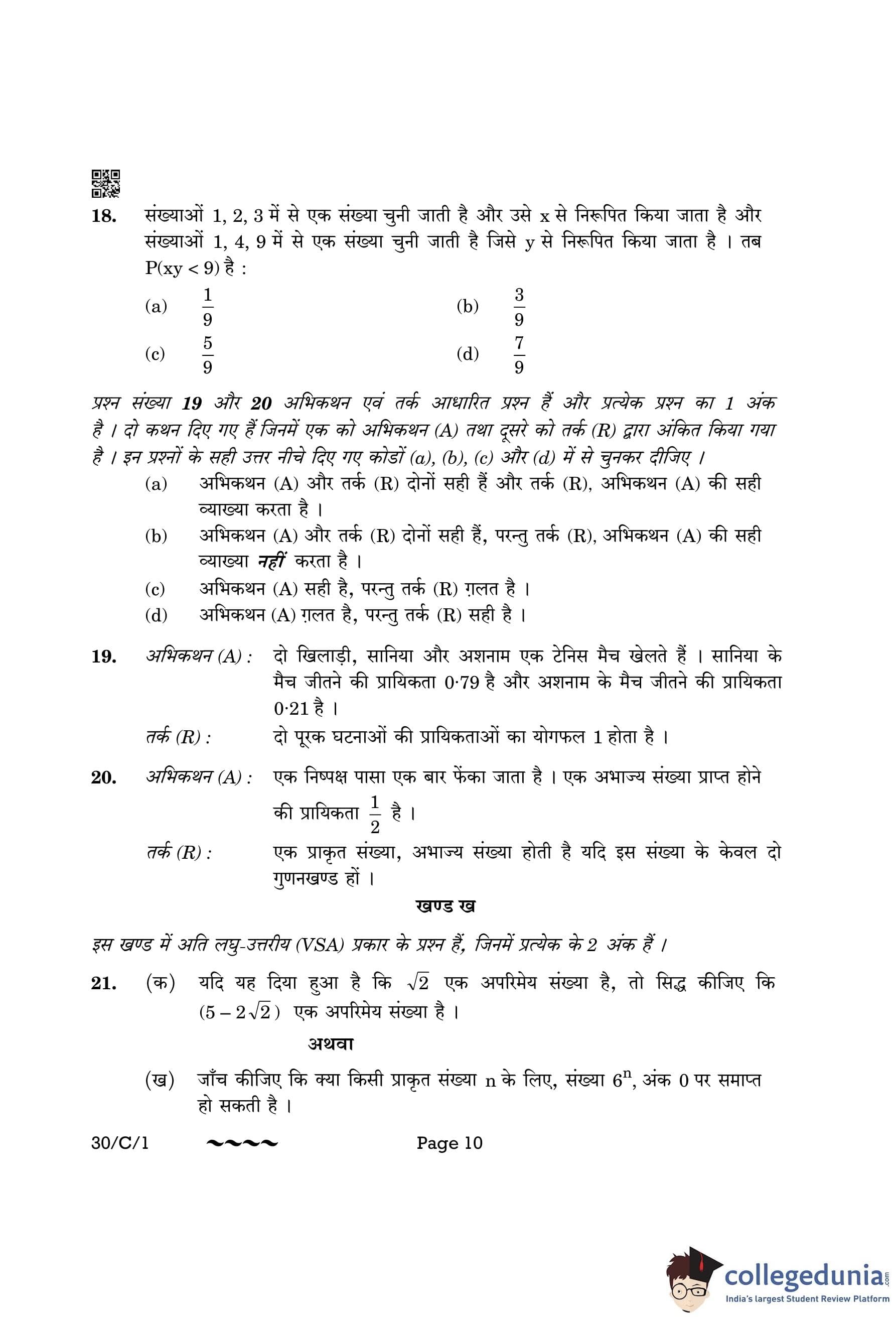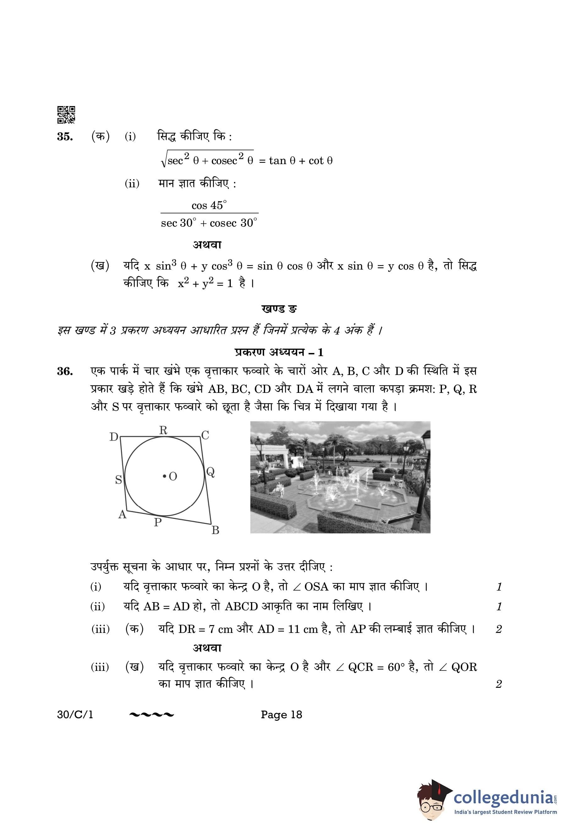 CBSE Class 10 Mathematics Standard (Set 1- 30/C/1) Compartment Question Paper 2023 with Answer Key