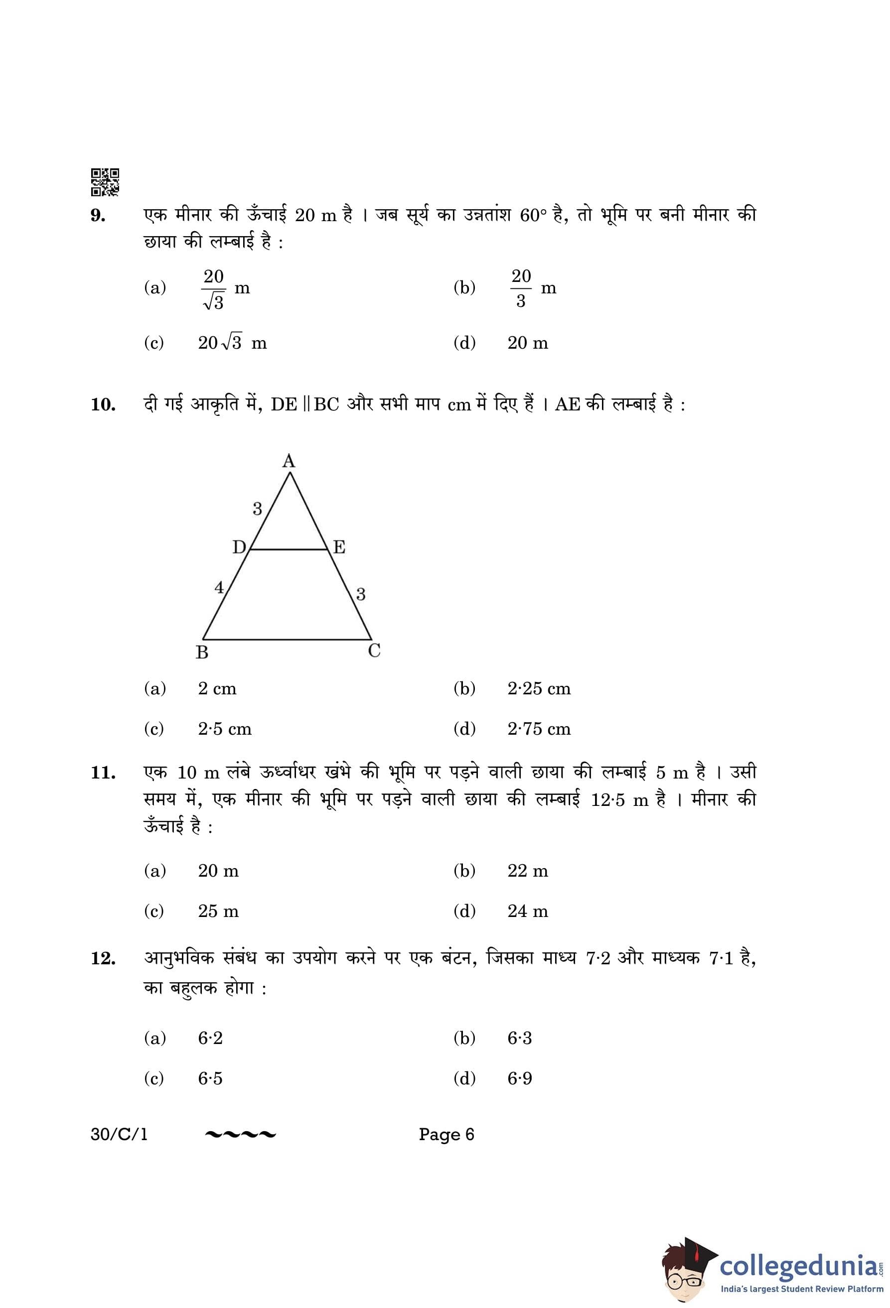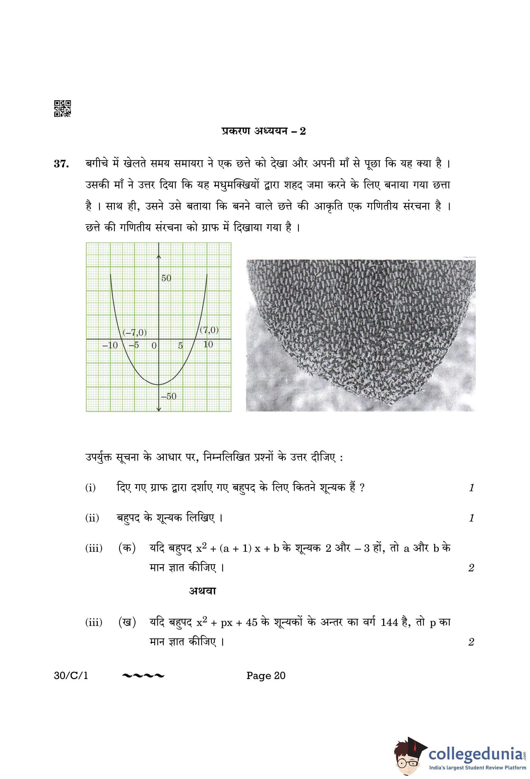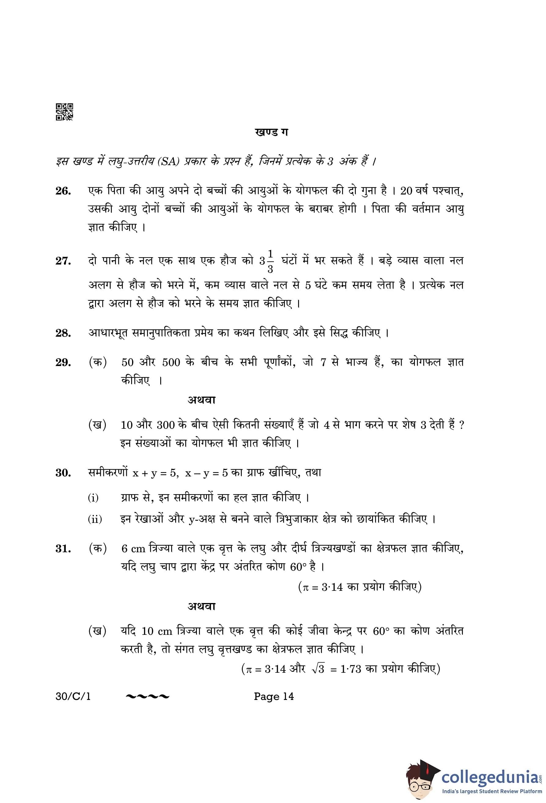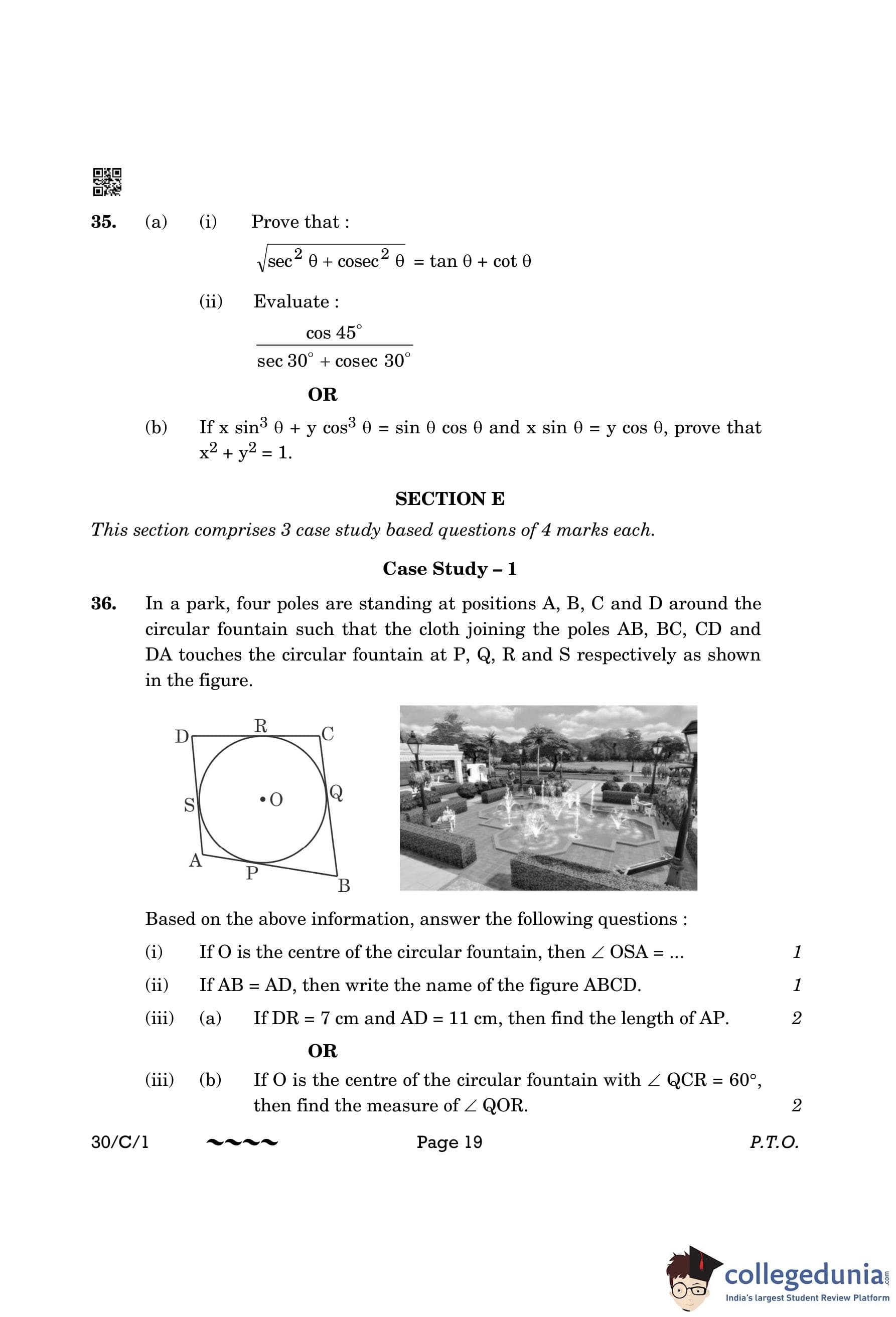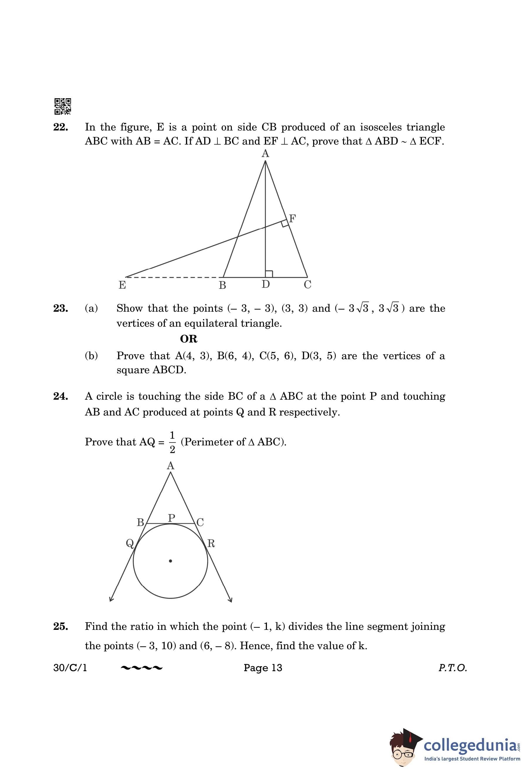 CBSE Class 10 Mathematics Standard (Set 1- 30/C/1) Compartment Question Paper 2023 with Answer Key