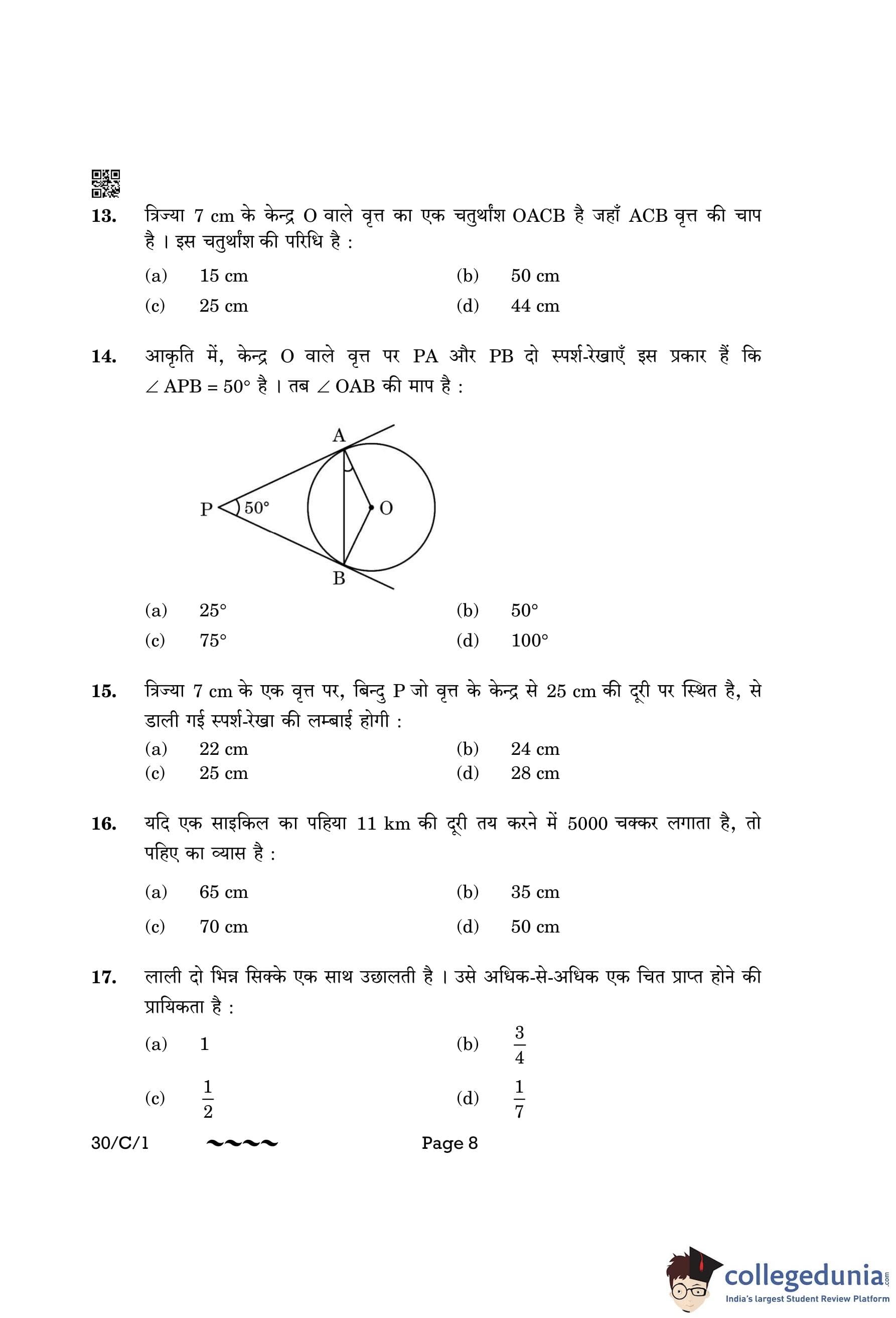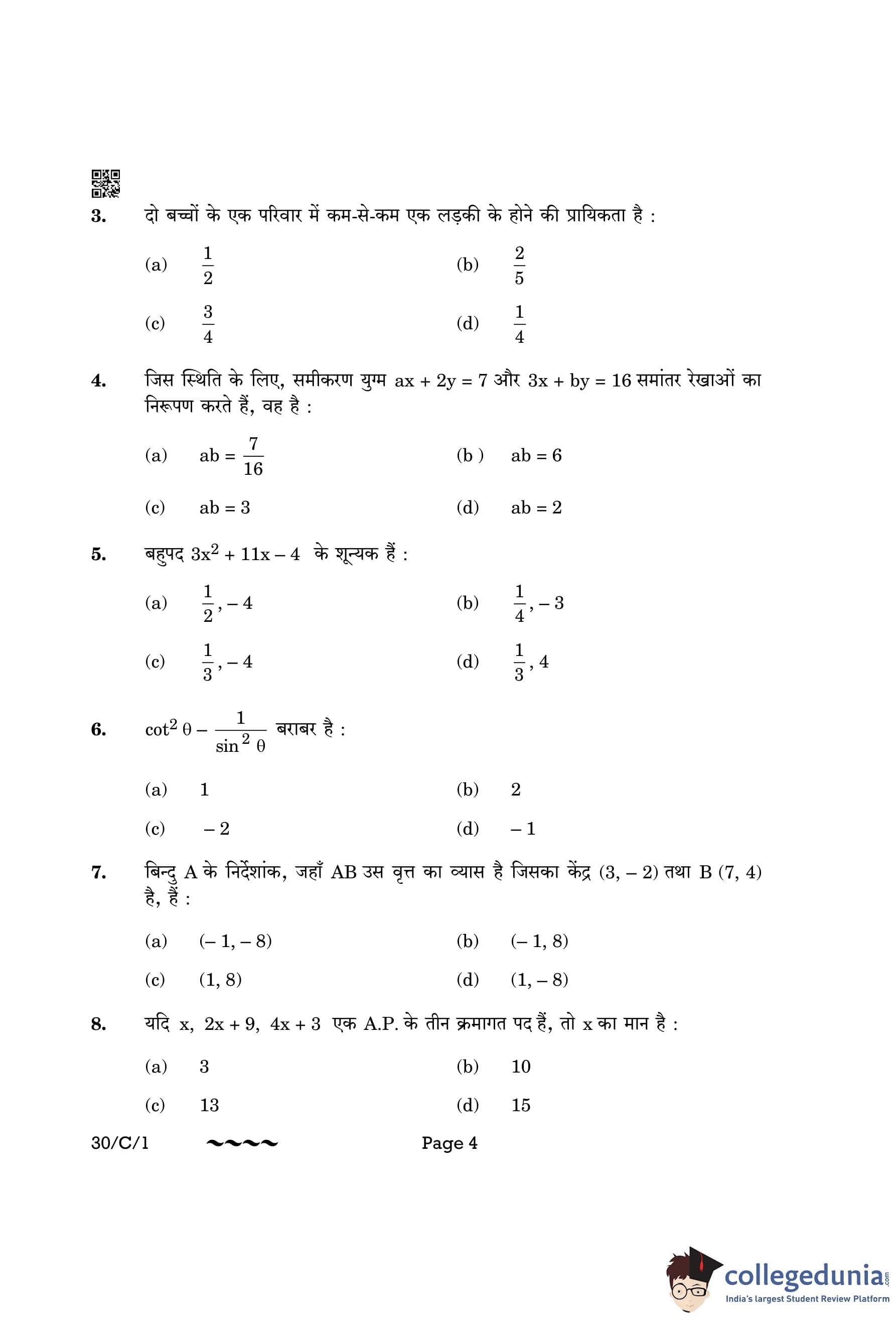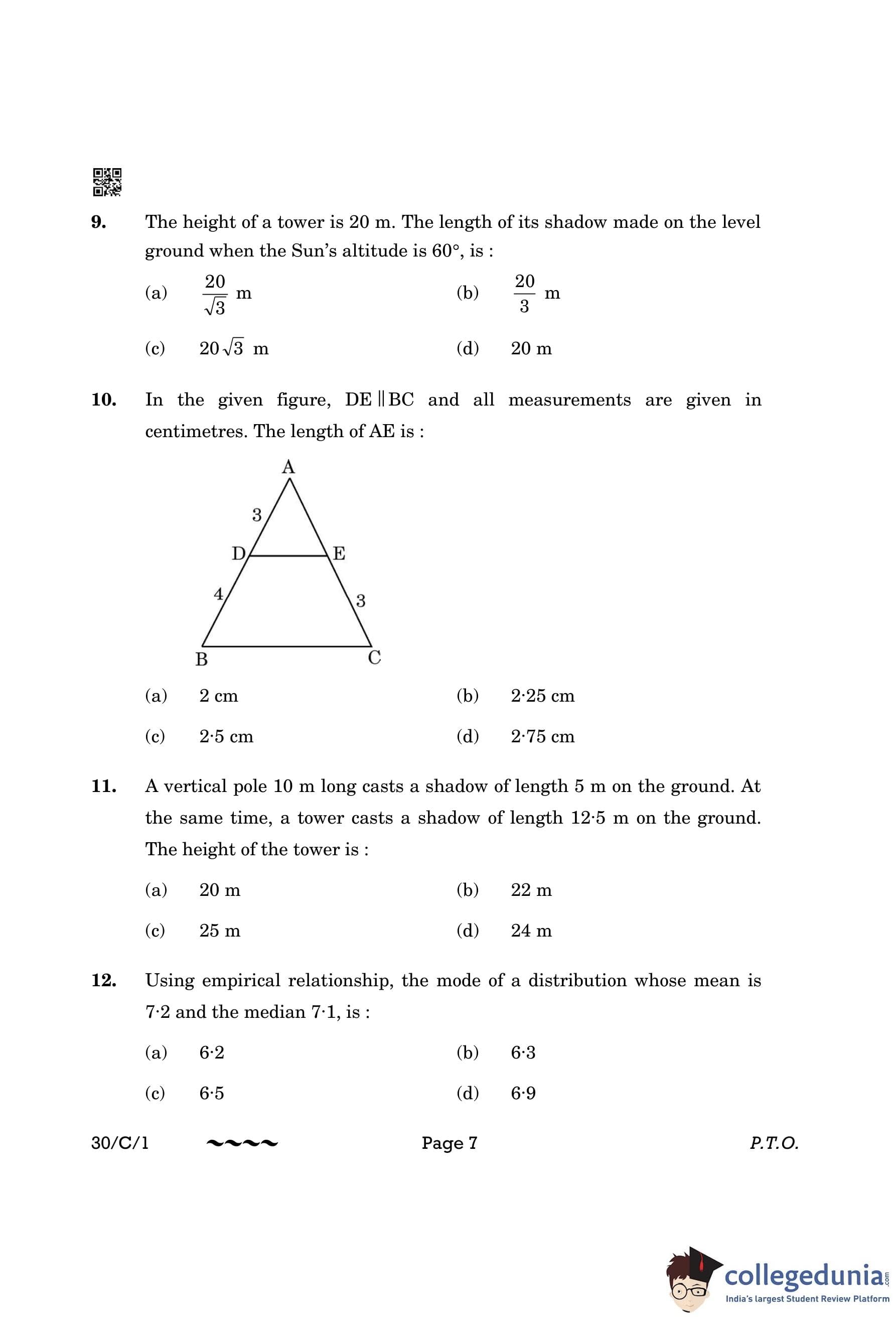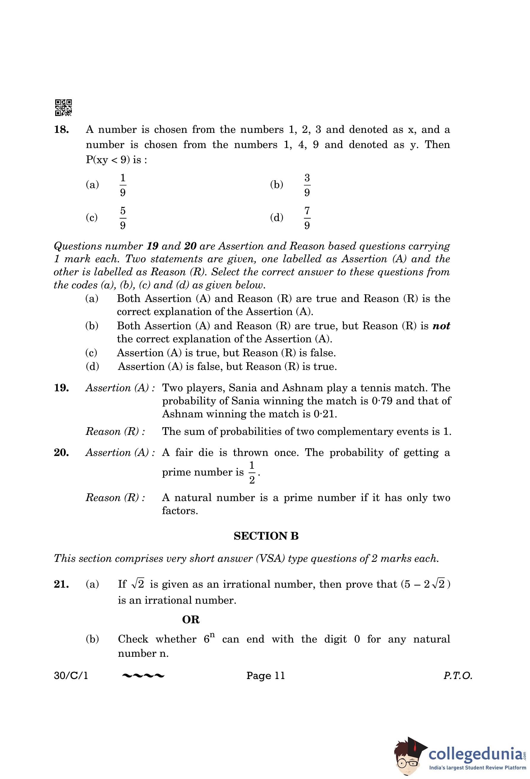 CBSE Class 10 Mathematics Standard (Set 1- 30/C/1) Compartment Question Paper 2023 with Answer Key