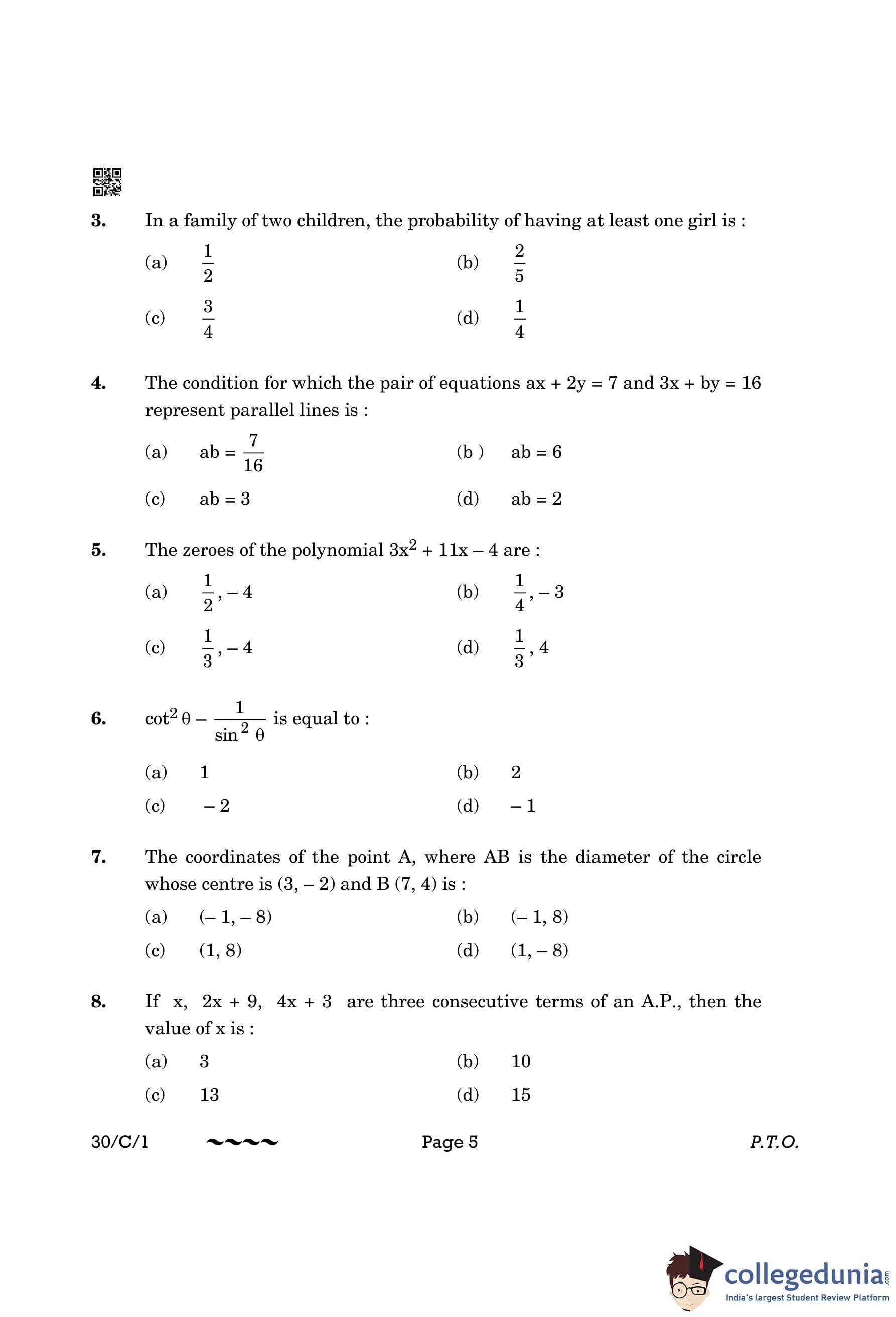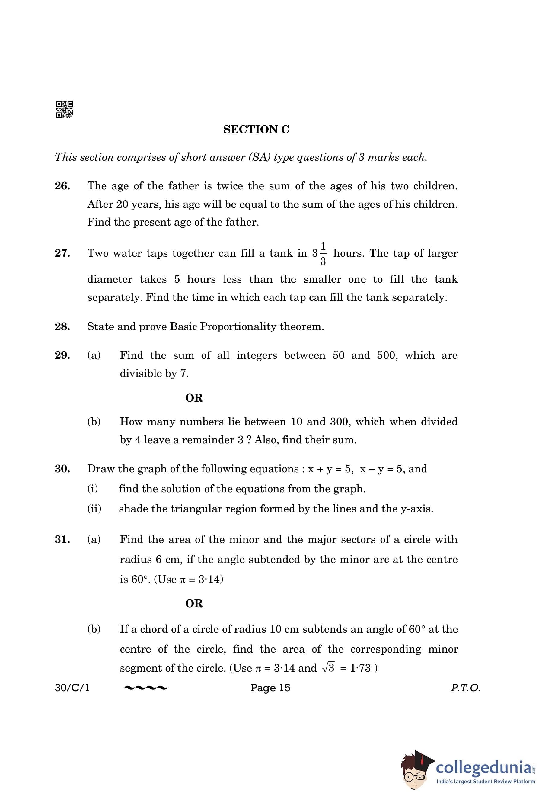CBSE Class 10 Mathematics Standard Compartment Question Paper 2023 with Answer Key pdf (Set 1- 30/C/1) is available for download here. The exam was conducted by Central Board of Secondary Education on July 17, 2023 in the Morning Session 10:30 AM to 1:30 PM. The question paper comprised a total of 38 questions divided among 5 sections.