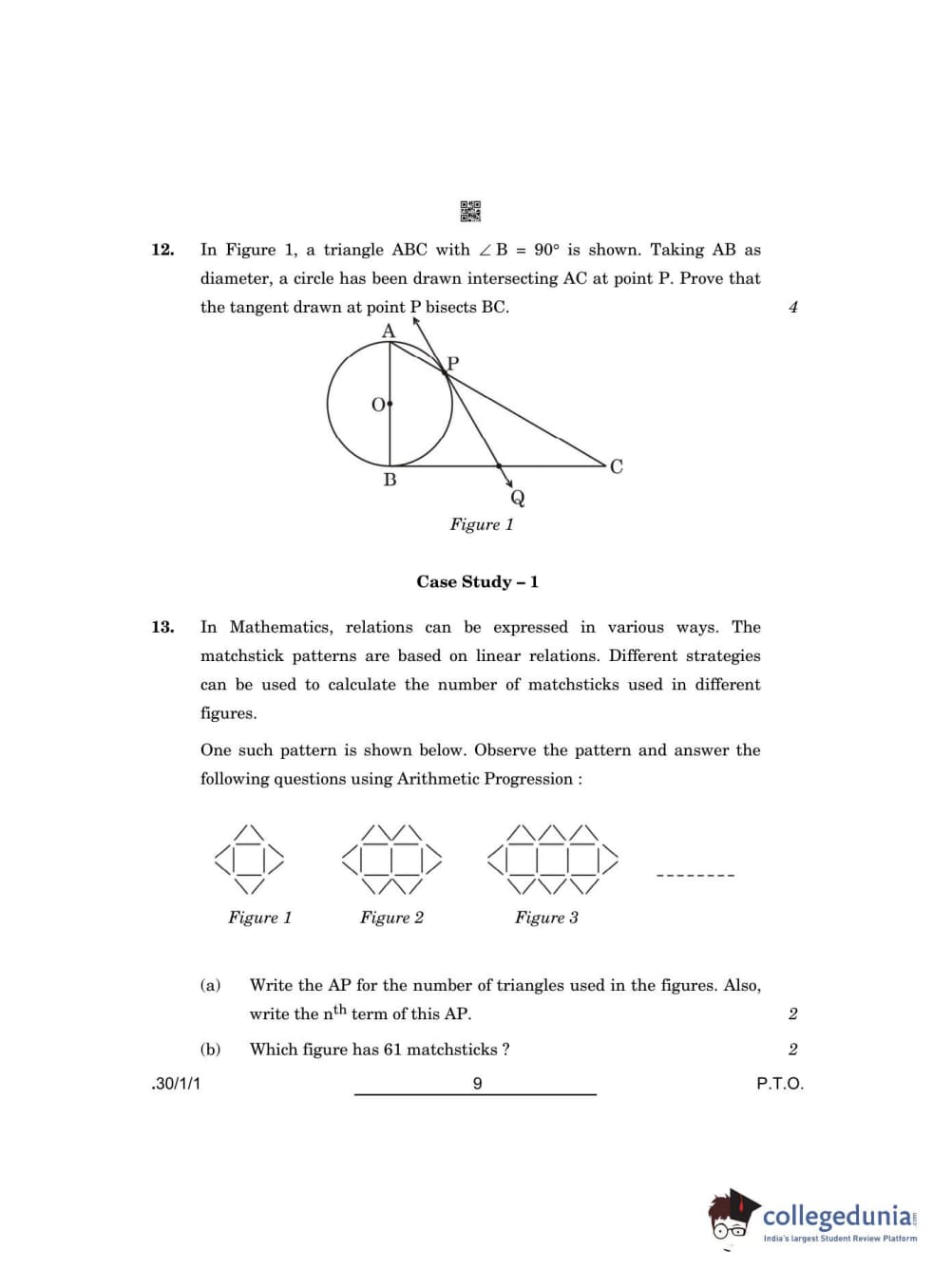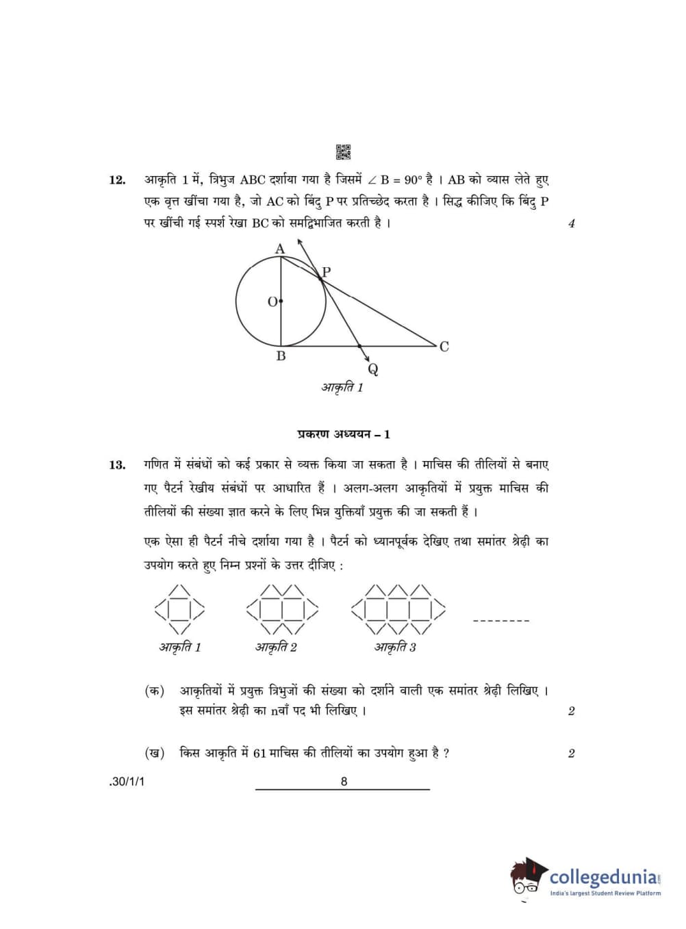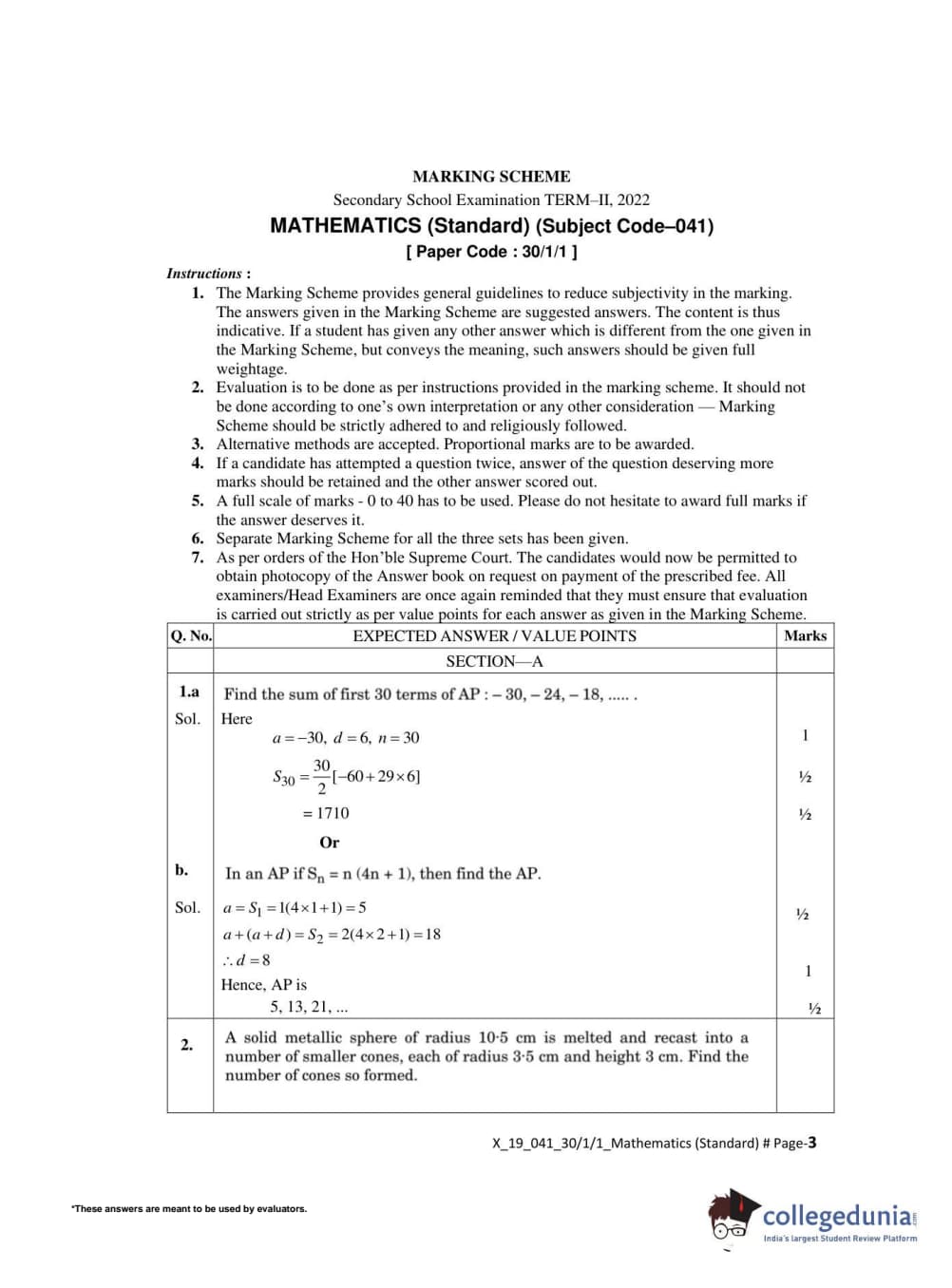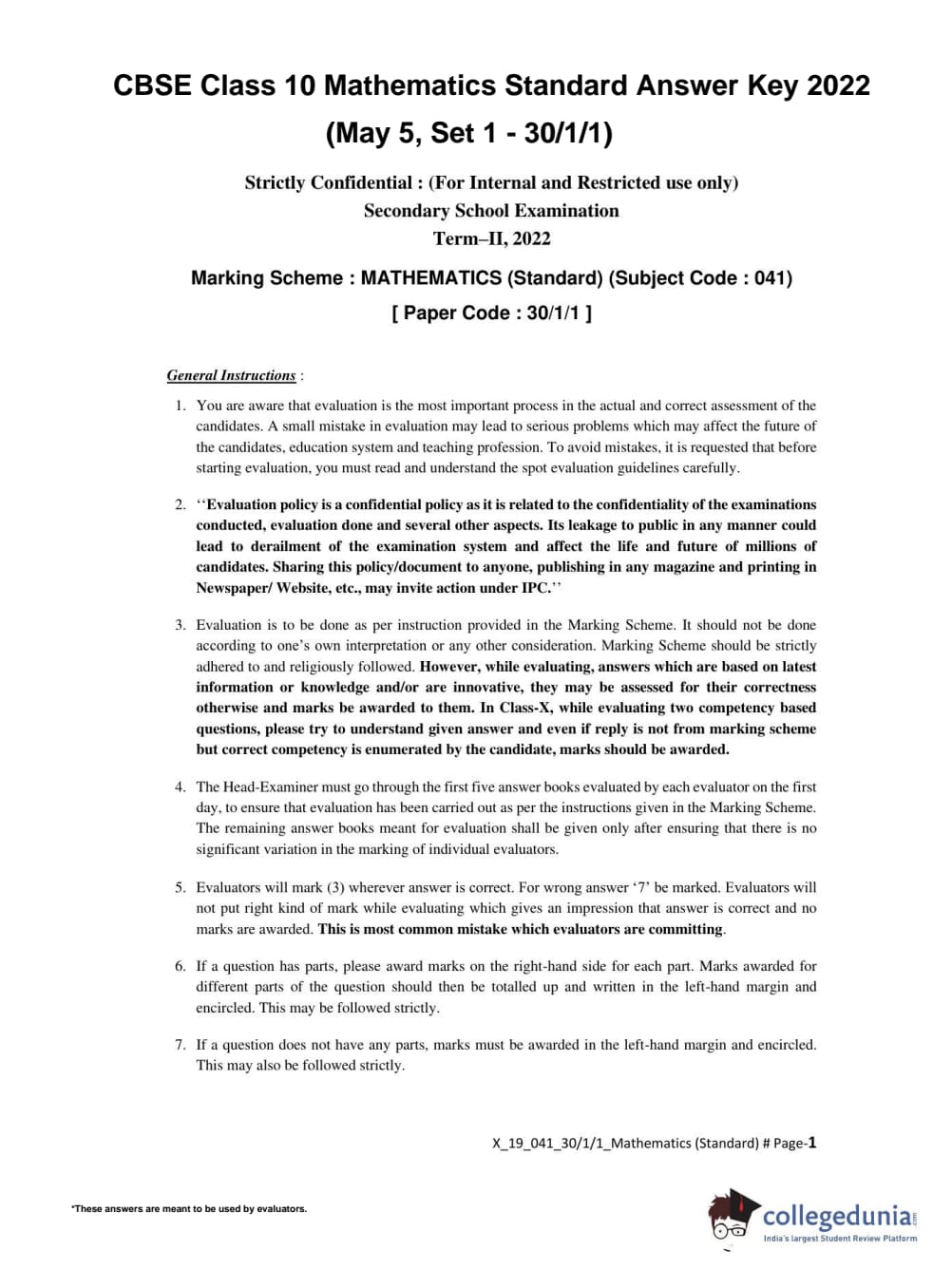CBSE Class 10 Mathematics Standard Set 1 - 30/1/1 Question Paper 2022 with Answer Key (May 5)