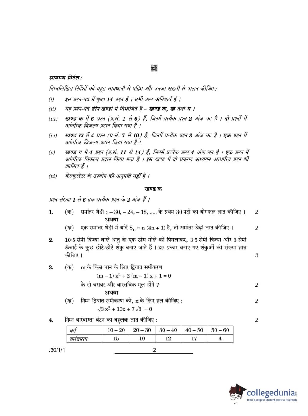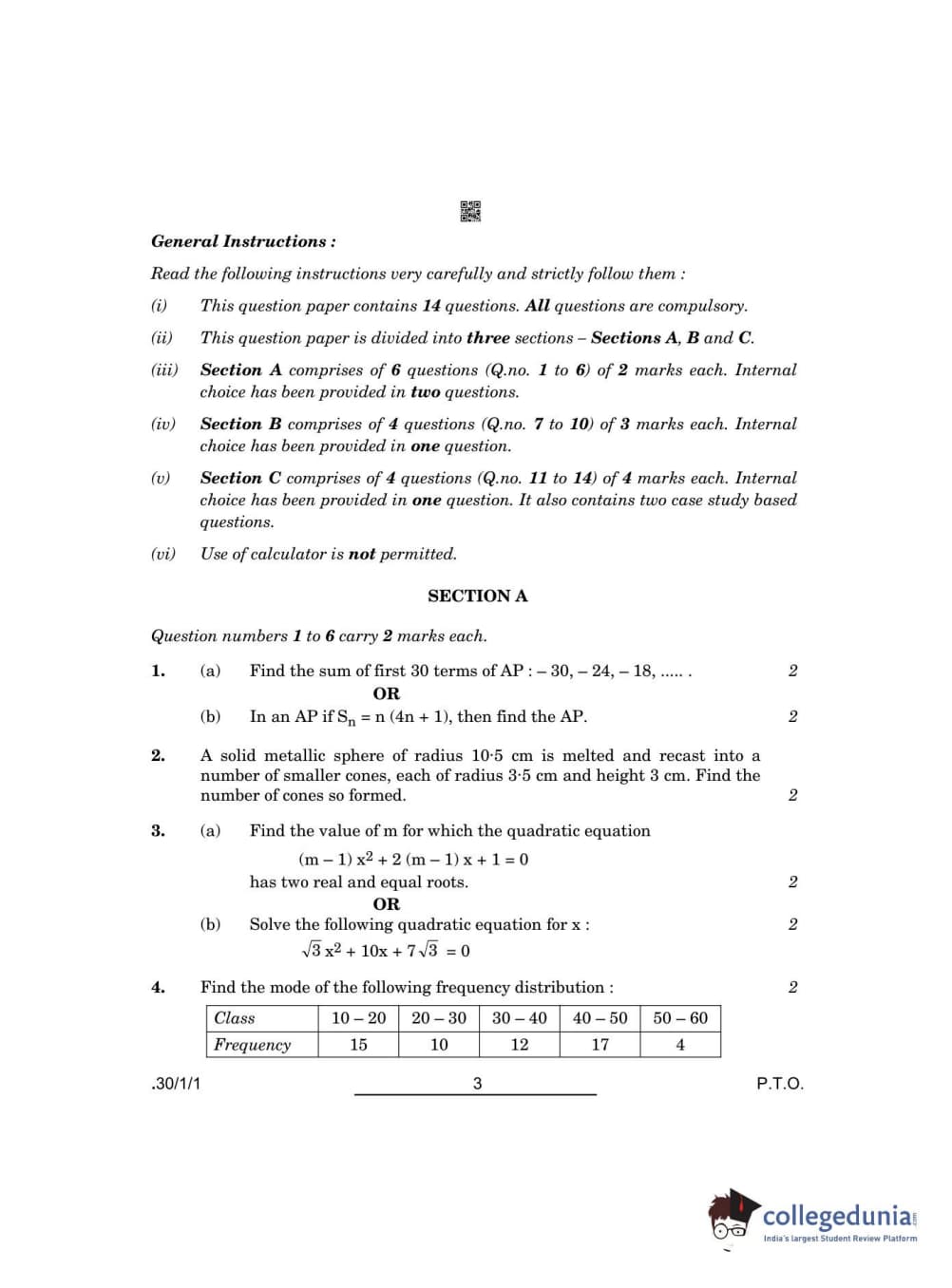 CBSE Class 10 Mathematics Standard Question Paper 2022 with Answer Key Set 1 - 30/1/1 is available for download. The exam was conducted by the Central Board of Secondary Education on May 5, 2022 in the Morning Session 10:30 AM to 12:30 PM. The medium of paper was English & Hindi. The question paper comprised a total of 14 questions divided among 3 sections.