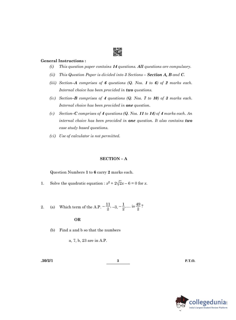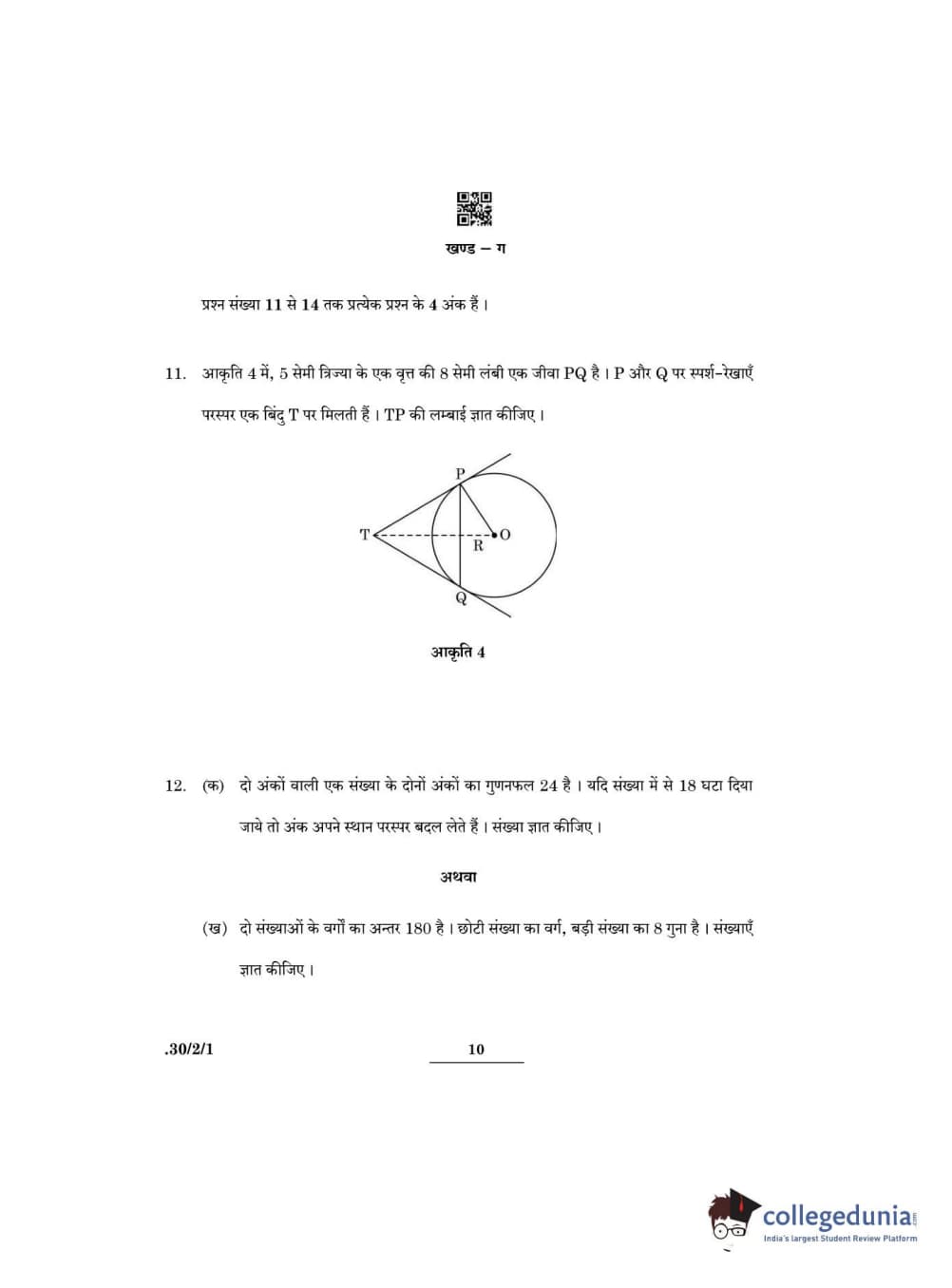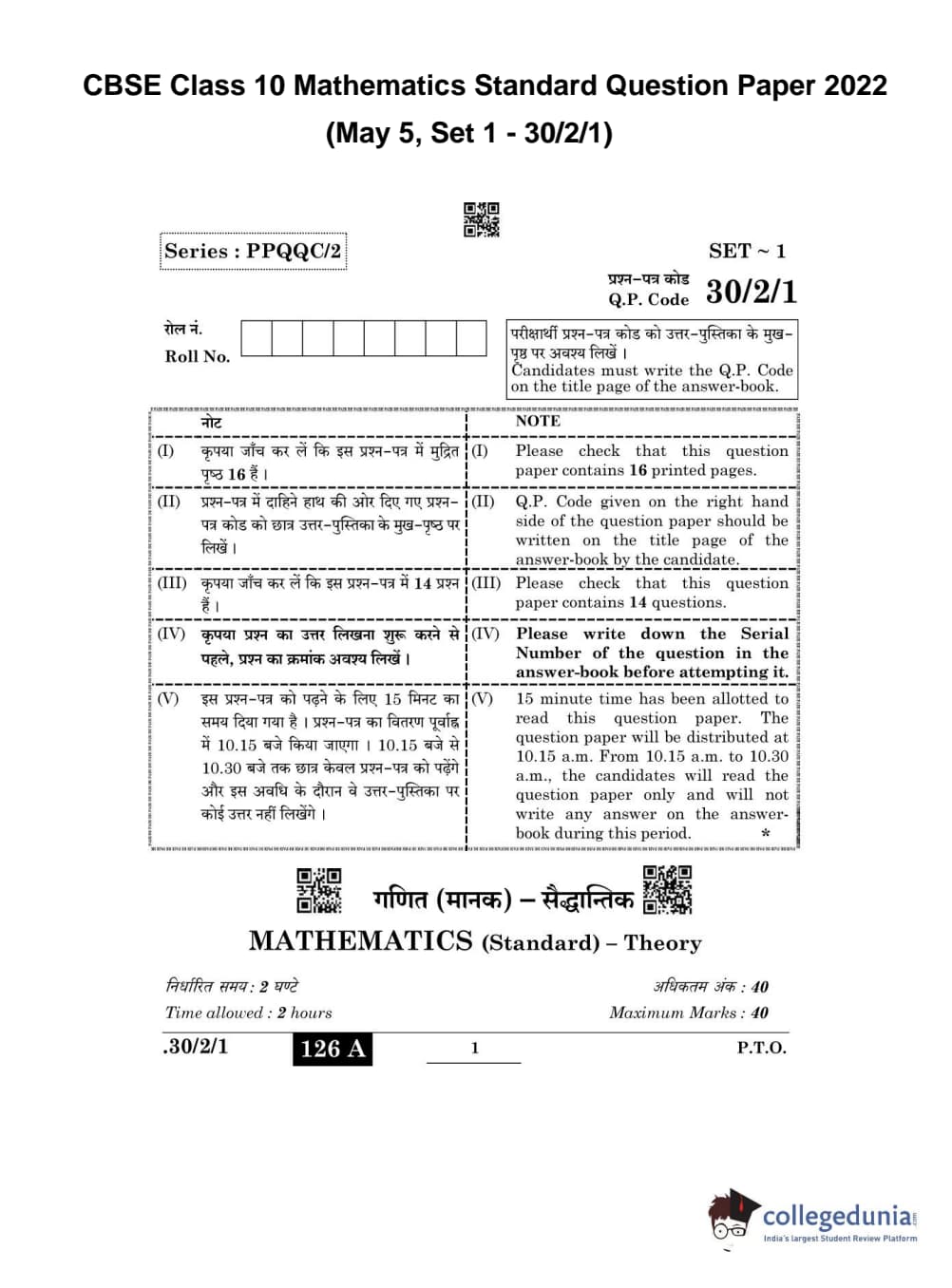 CBSE Class 10 Mathematics Standard Question Paper 2022 with Answer Key Set 1 - 30/2/1 is available for download. The exam was conducted by the Central Board of Secondary Education on May 5, 2022 in the Morning Session 10:30 AM to 12:30 PM. The medium of paper was English & Hindi. The question paper comprised a total of 14 questions divided among 3 sections.