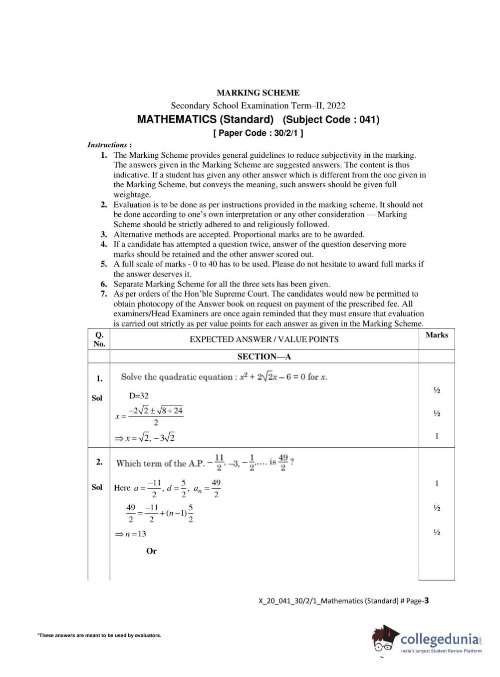 | CBSE Class 10 Mathematics Standard Question Paper 2022 PDF | CBSE Class 10 Mathematics Standard Answer Key 2022 PDF | Detailed Solutions |