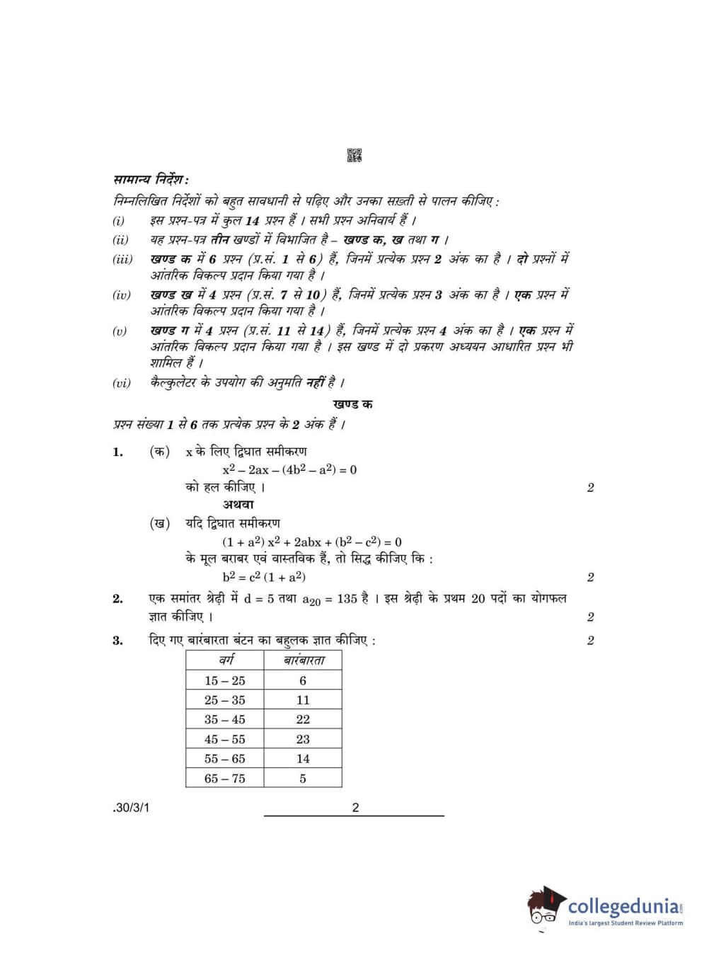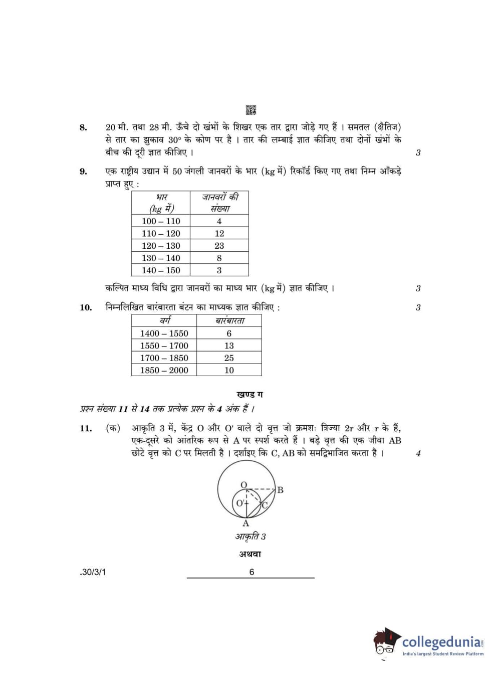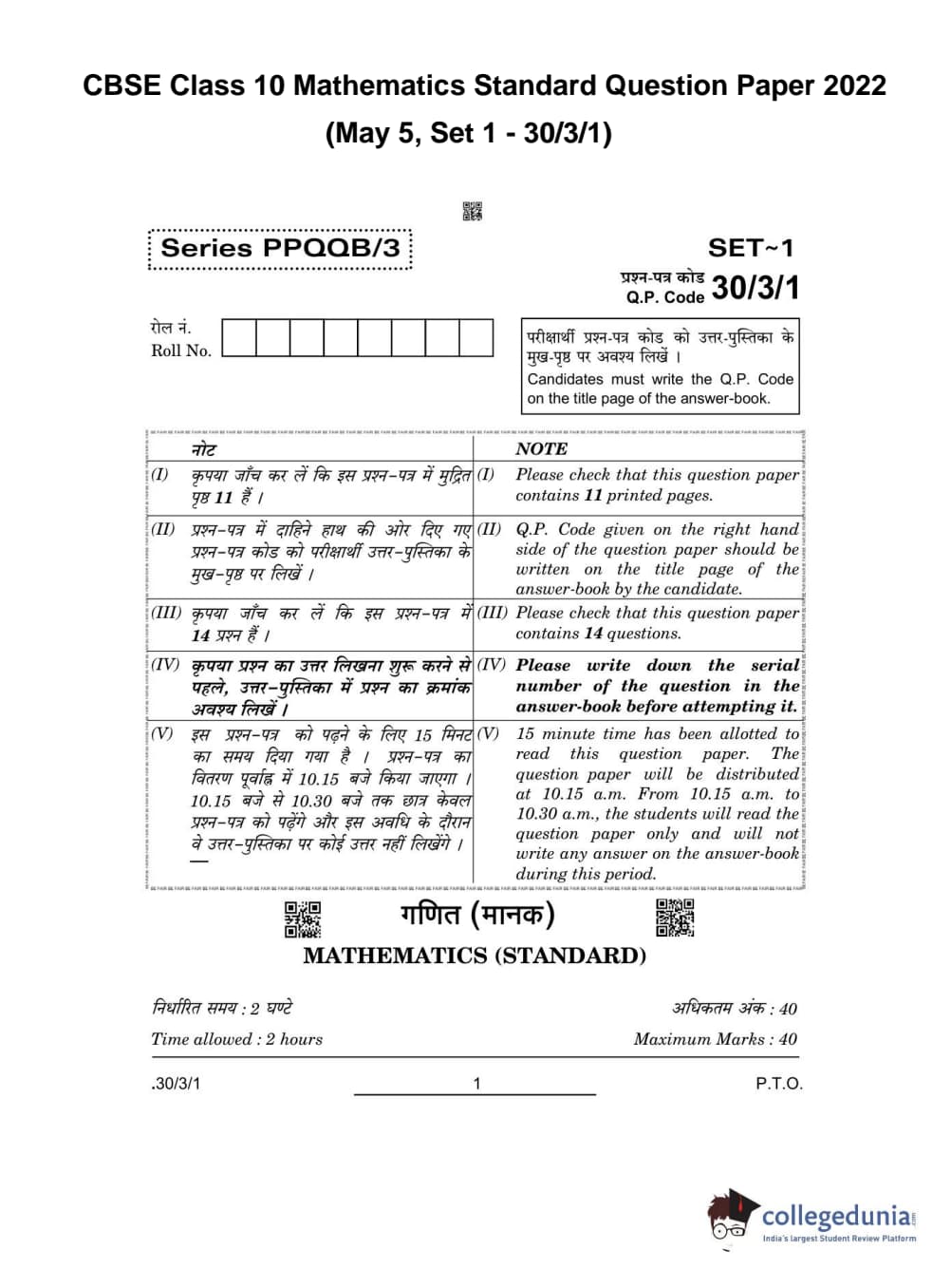 CBSE Class 10 Mathematics Standard Question Paper 2022 with Answer Key Set 1 - 30/3/1 is available for download. The exam was conducted by the Central Board of Secondary Education on May 5, 2022 in the Morning Session 10:30 AM to 12:30 PM. The medium of paper was English & Hindi. The question paper comprised a total of 14 questions divided among 3 sections.