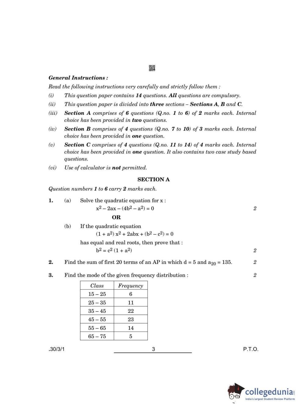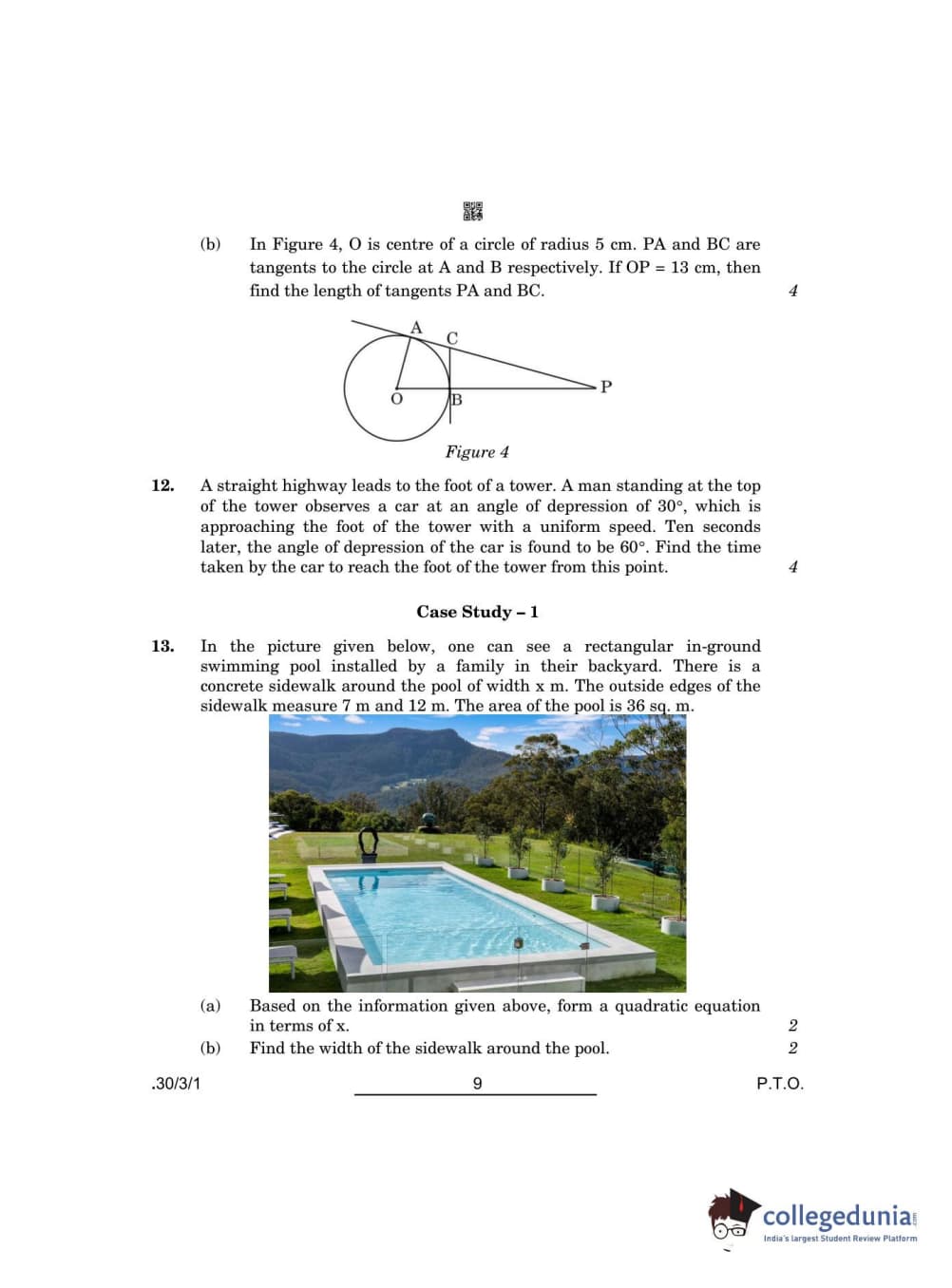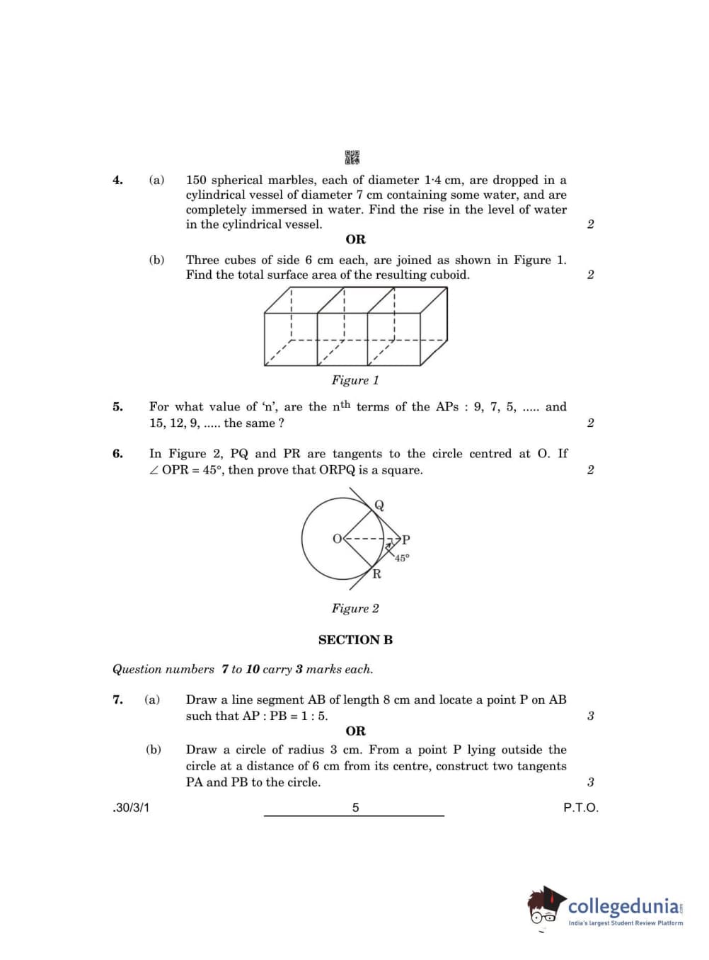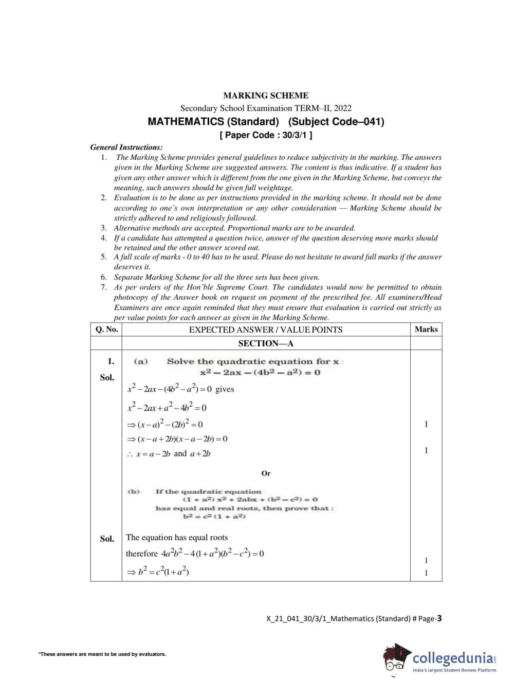 CBSE Class 10 Mathematics Standard Set 1 - 30/3/1 Question Paper 2022 with Answer Key (May 5)