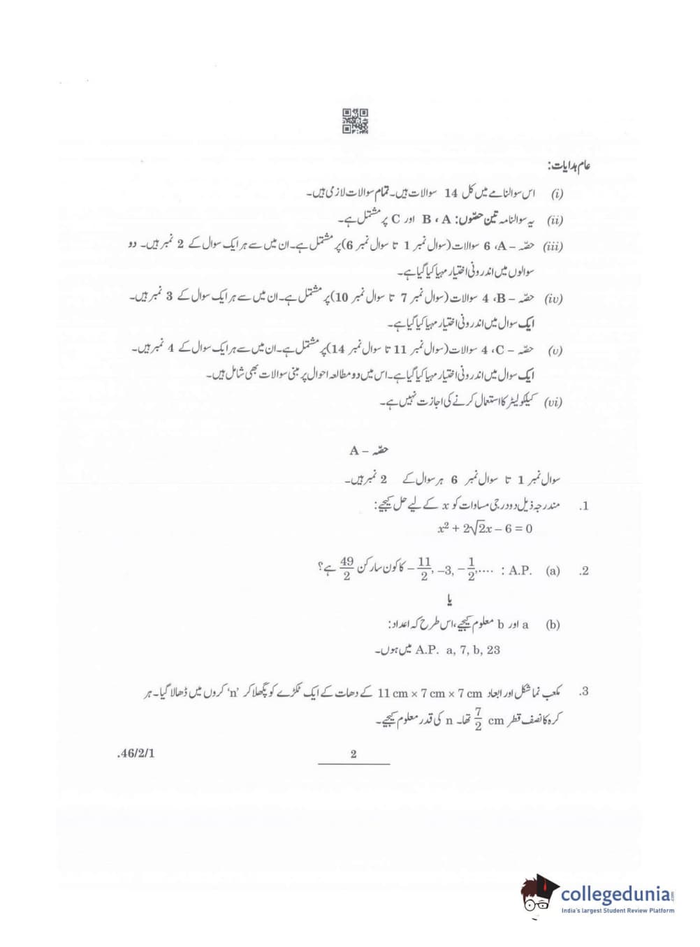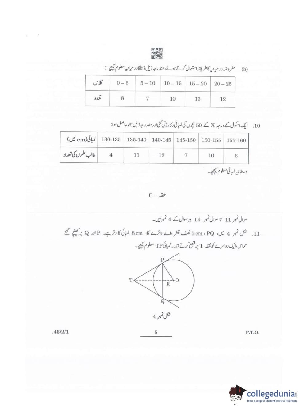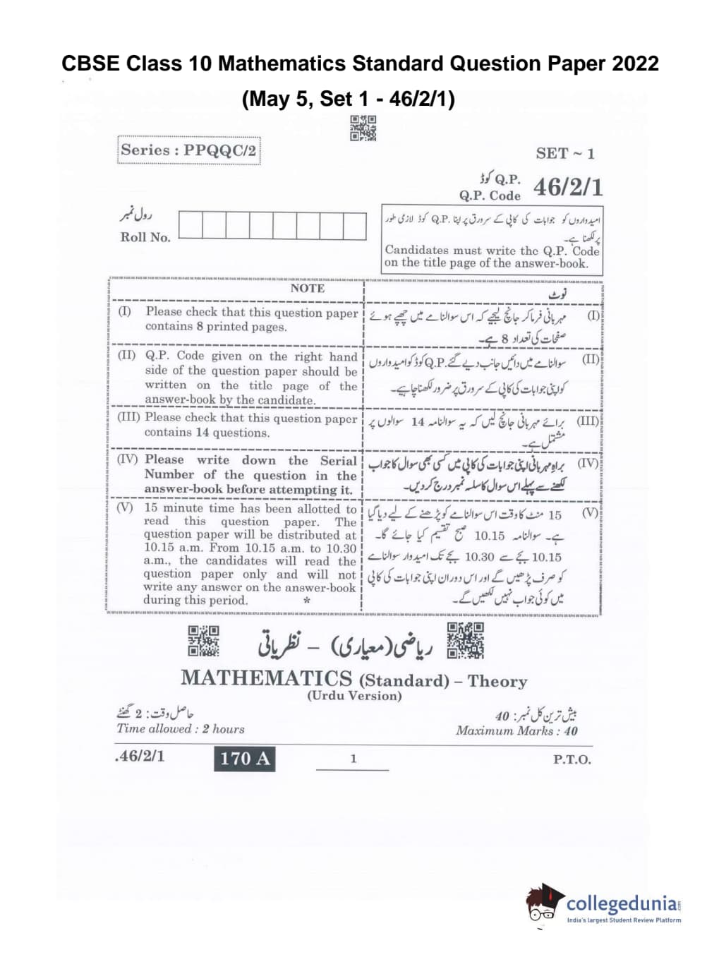 CBSE Class 10 Mathematics Standard Question Paper 2022 with Answer Key Set 1 - 46/2/1 is available for download. The exam was conducted by the Central Board of Secondary Education on May 5, 2022 in the Morning Session 10:30 AM to 12:30 PM. The medium of paper was Urdu. The question paper comprised a total of 14 questions divided among 3 sections.