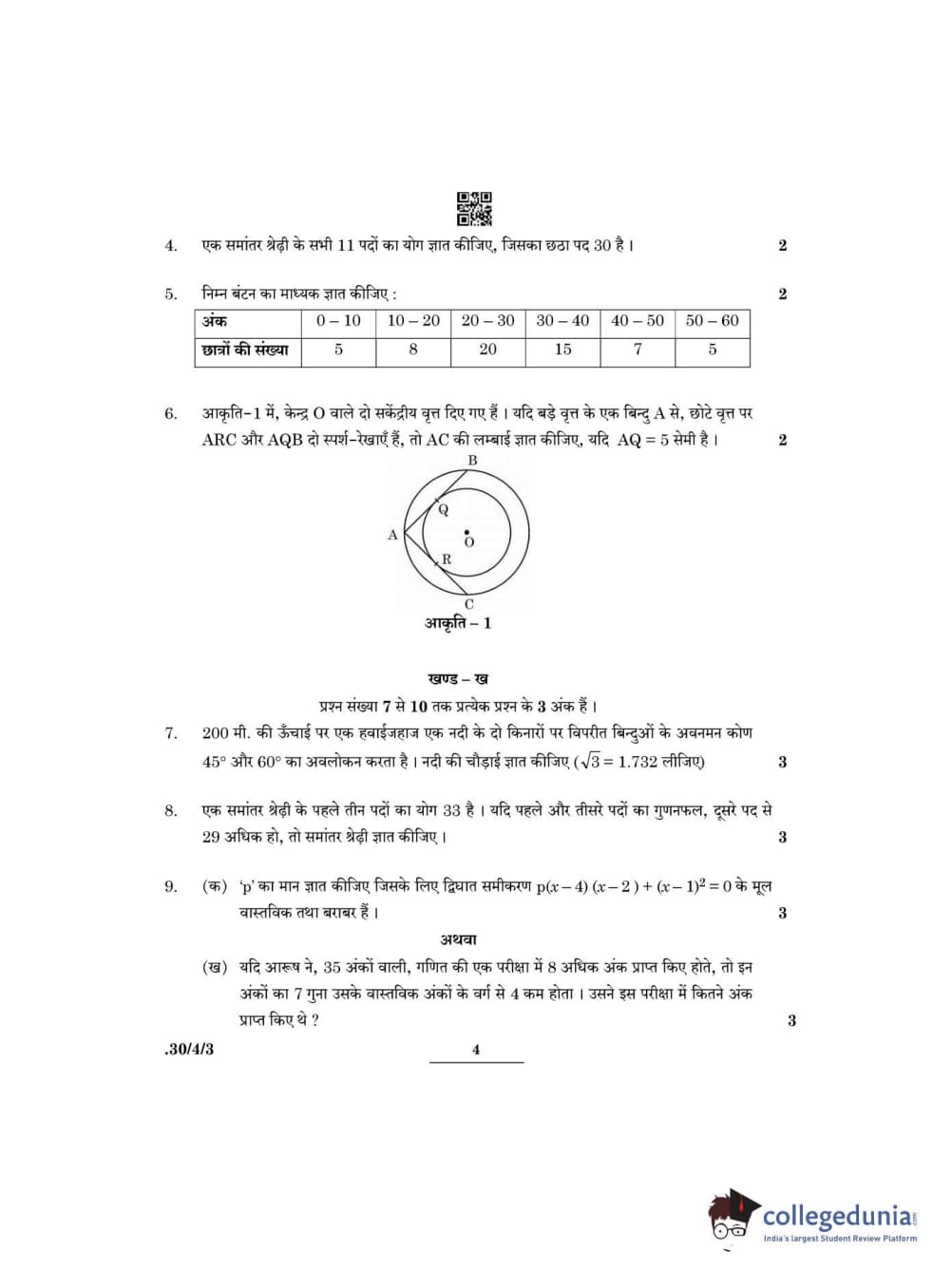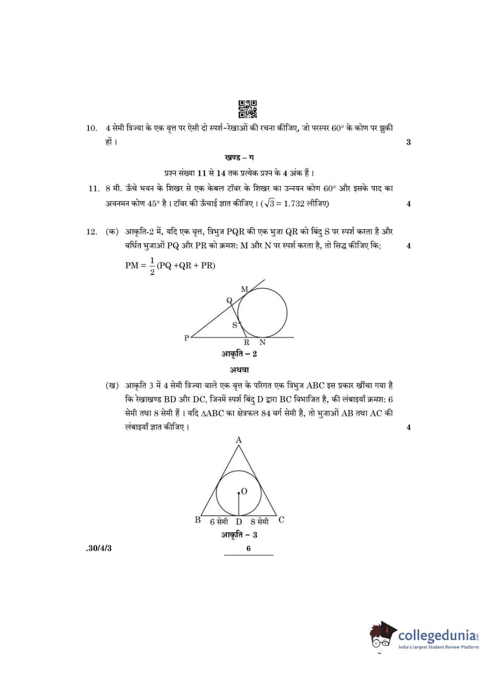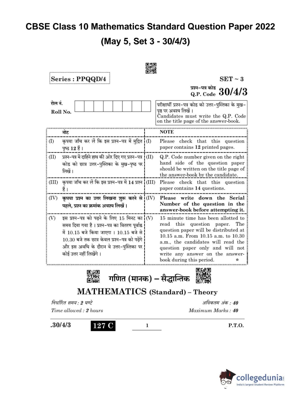 CBSE Class 10 Mathematics Standard Question Paper 2022 with Answer Key Set 3 - 30/4/3 is available for download. The exam was conducted by the Central Board of Secondary Education on May 5, 2022 in the Morning Session 10:30 AM to 12:30 PM. The medium of paper was English & Hindi. The question paper comprised a total of 14 questions divided among 3 sections.