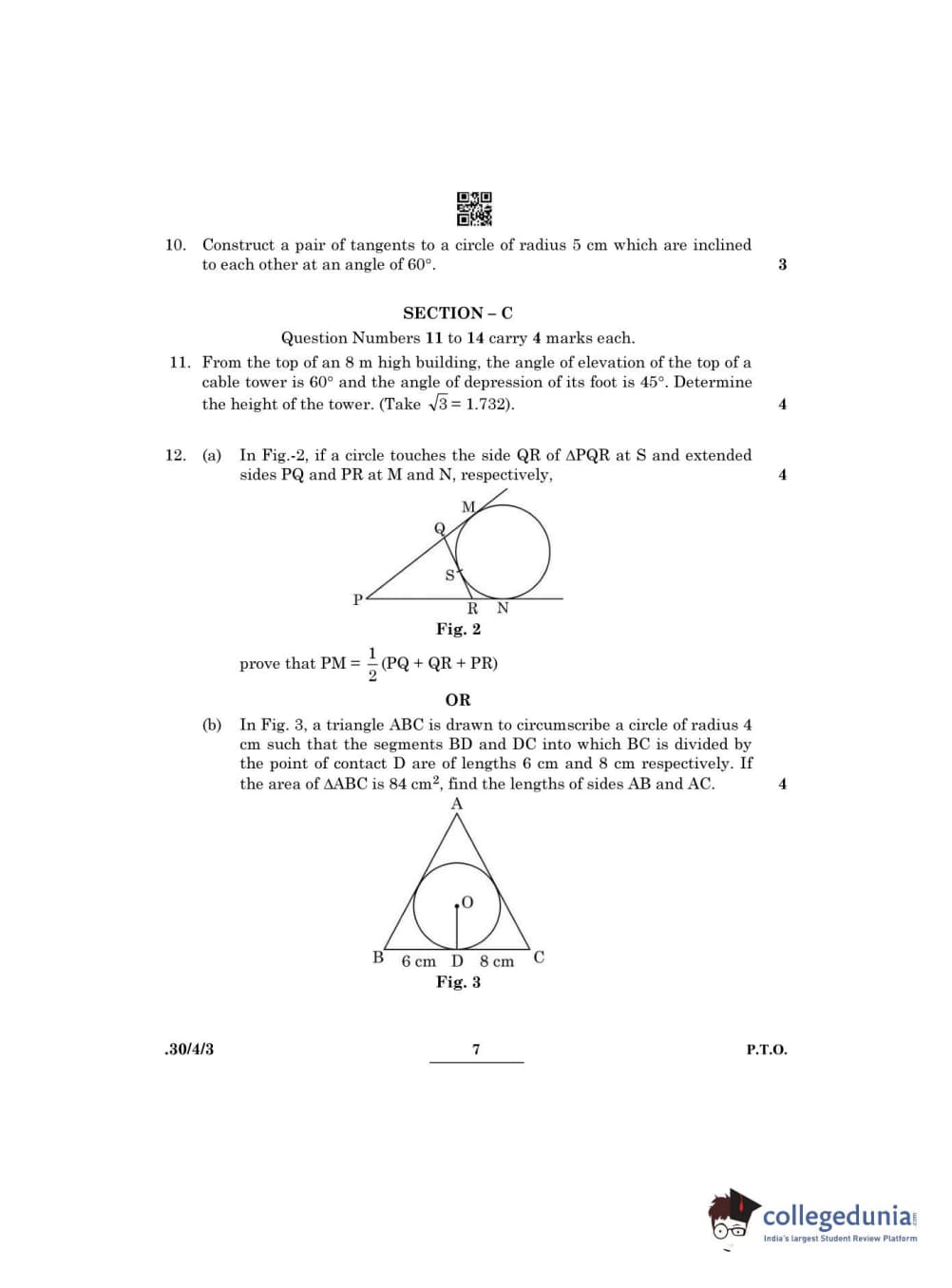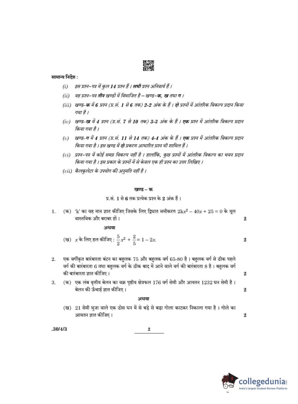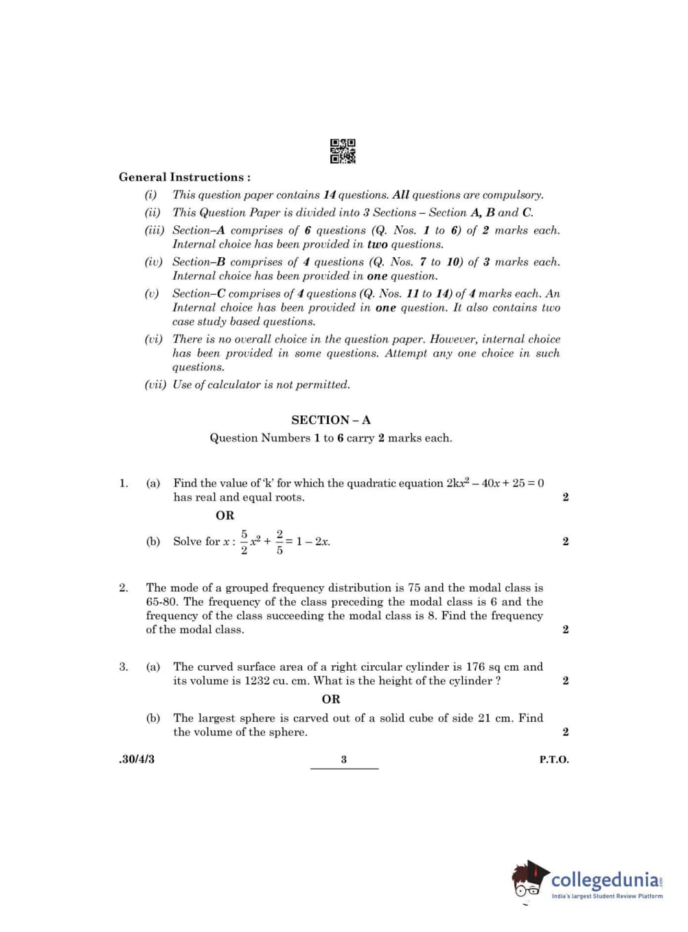 CBSE Class 10 Mathematics Standard Question Paper 2022 with Answer Key Set 3 - 30/4/3 is available for download. The exam was conducted by the Central Board of Secondary Education on May 5, 2022 in the Morning Session 10:30 AM to 12:30 PM. The medium of paper was English & Hindi. The question paper comprised a total of 14 questions divided among 3 sections.