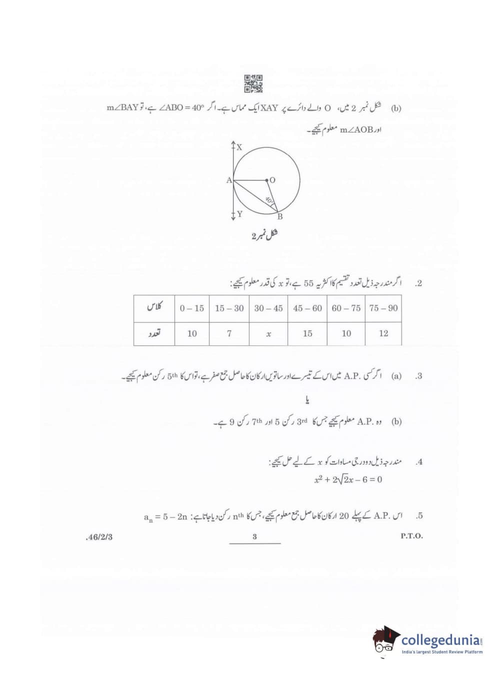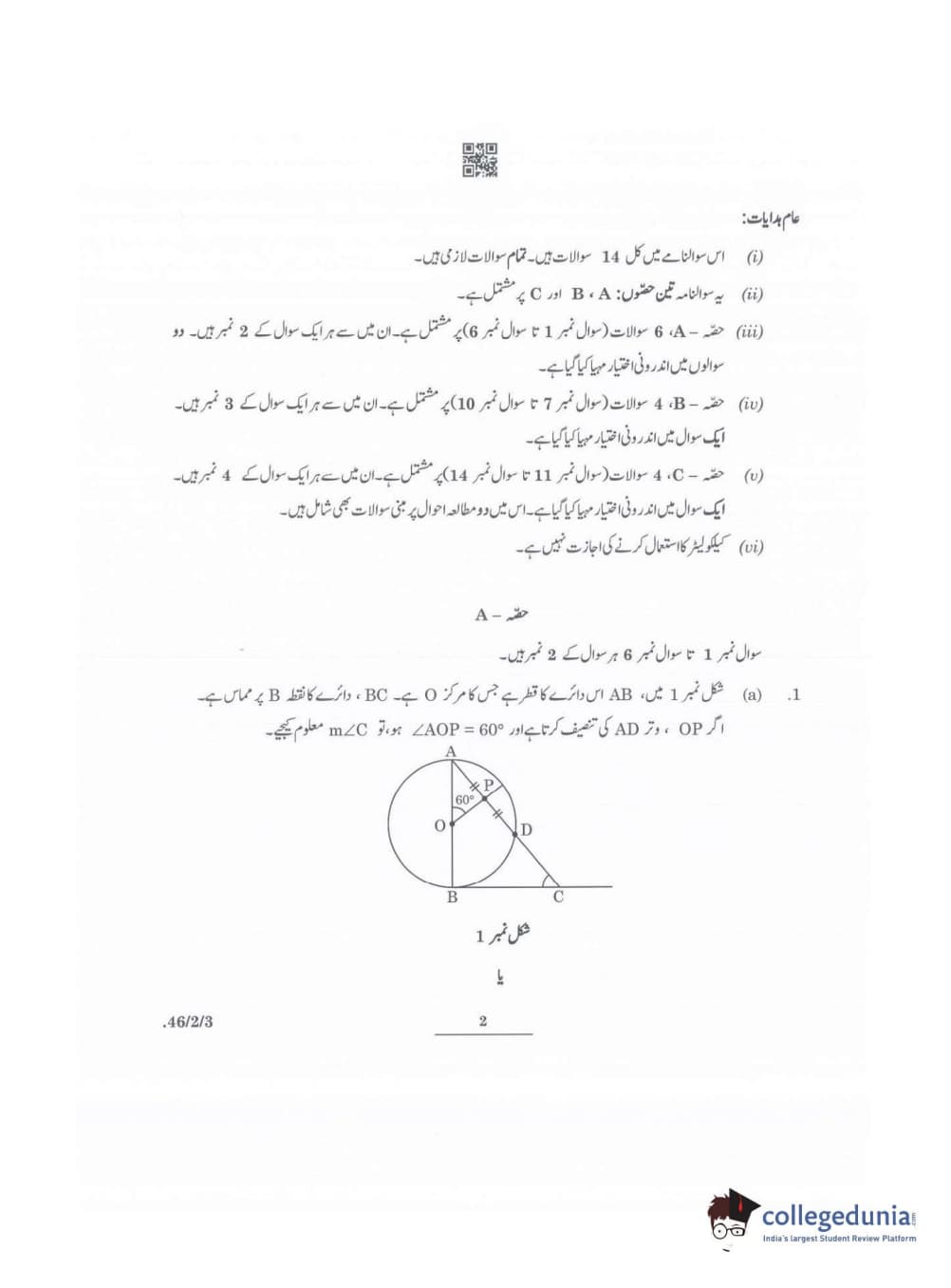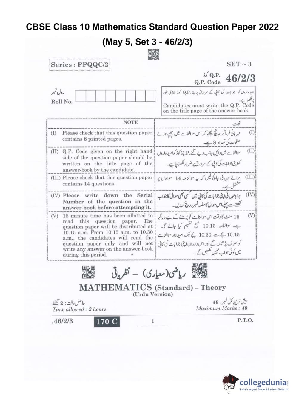 CBSE Class 10 Mathematics Standard Question Paper 2022 with Answer Key Set 3 - 46/2/3 is available for download. The exam was conducted by the Central Board of Secondary Education on May 5, 2022 in the Morning Session 10:30 AM to 12:30 PM. The medium of paper was Urdu. The question paper comprised a total of 14 questions divided among 3 sections.