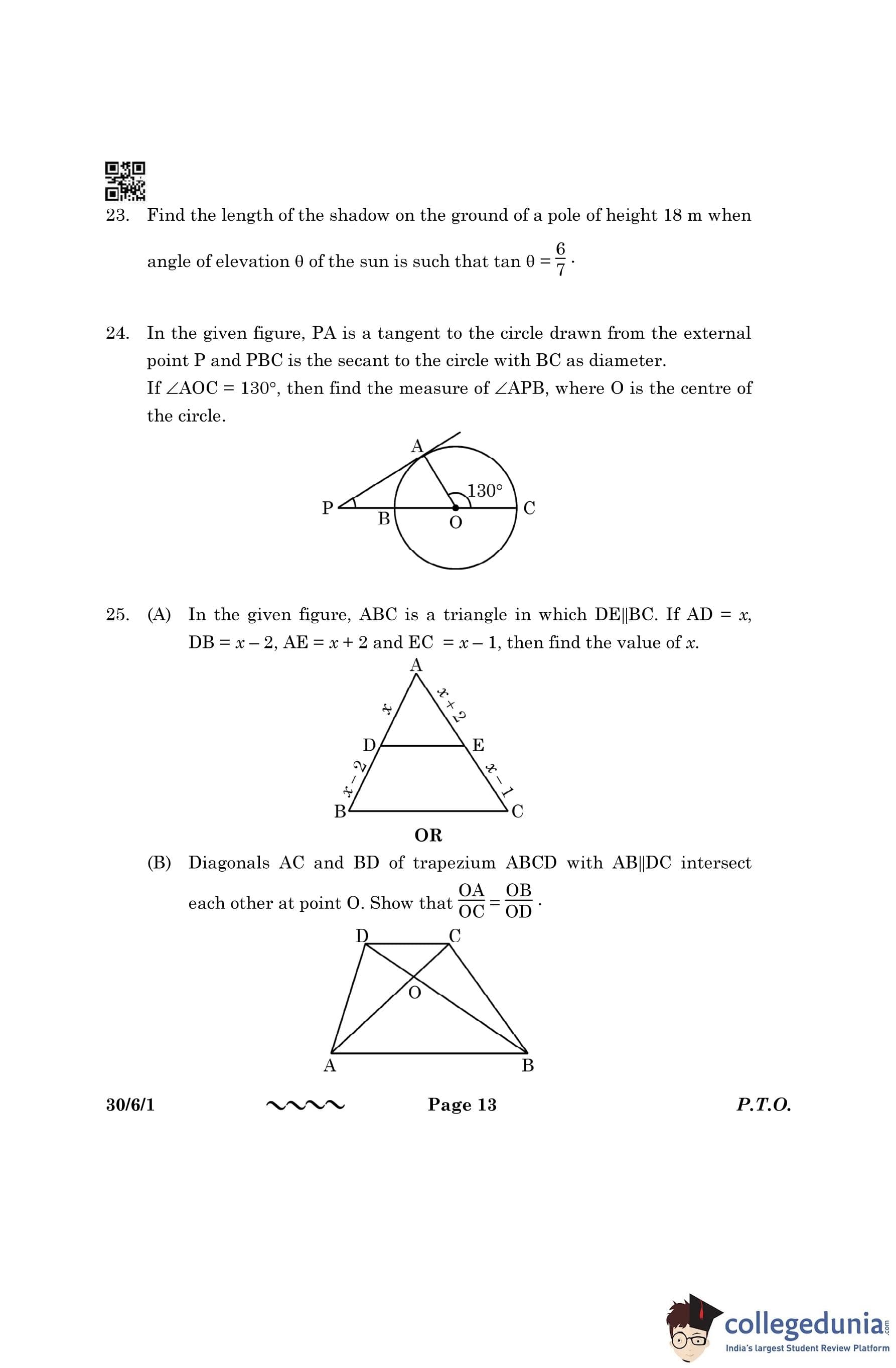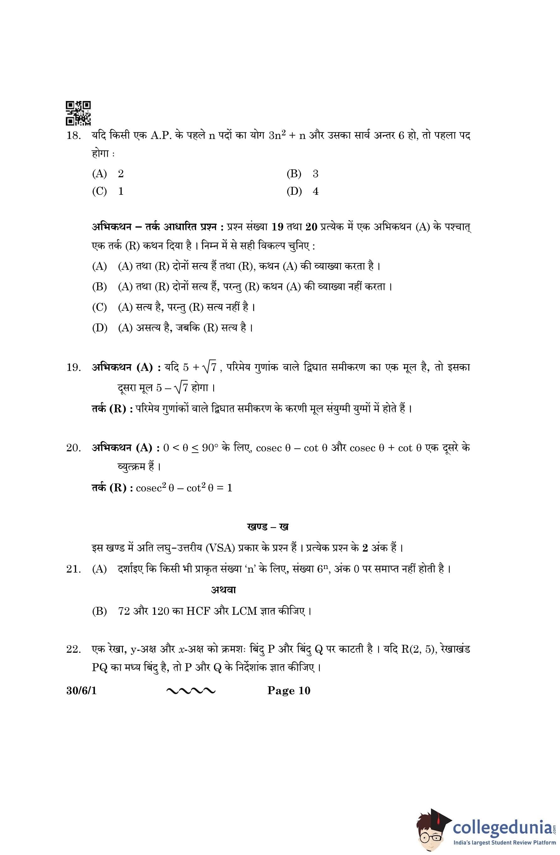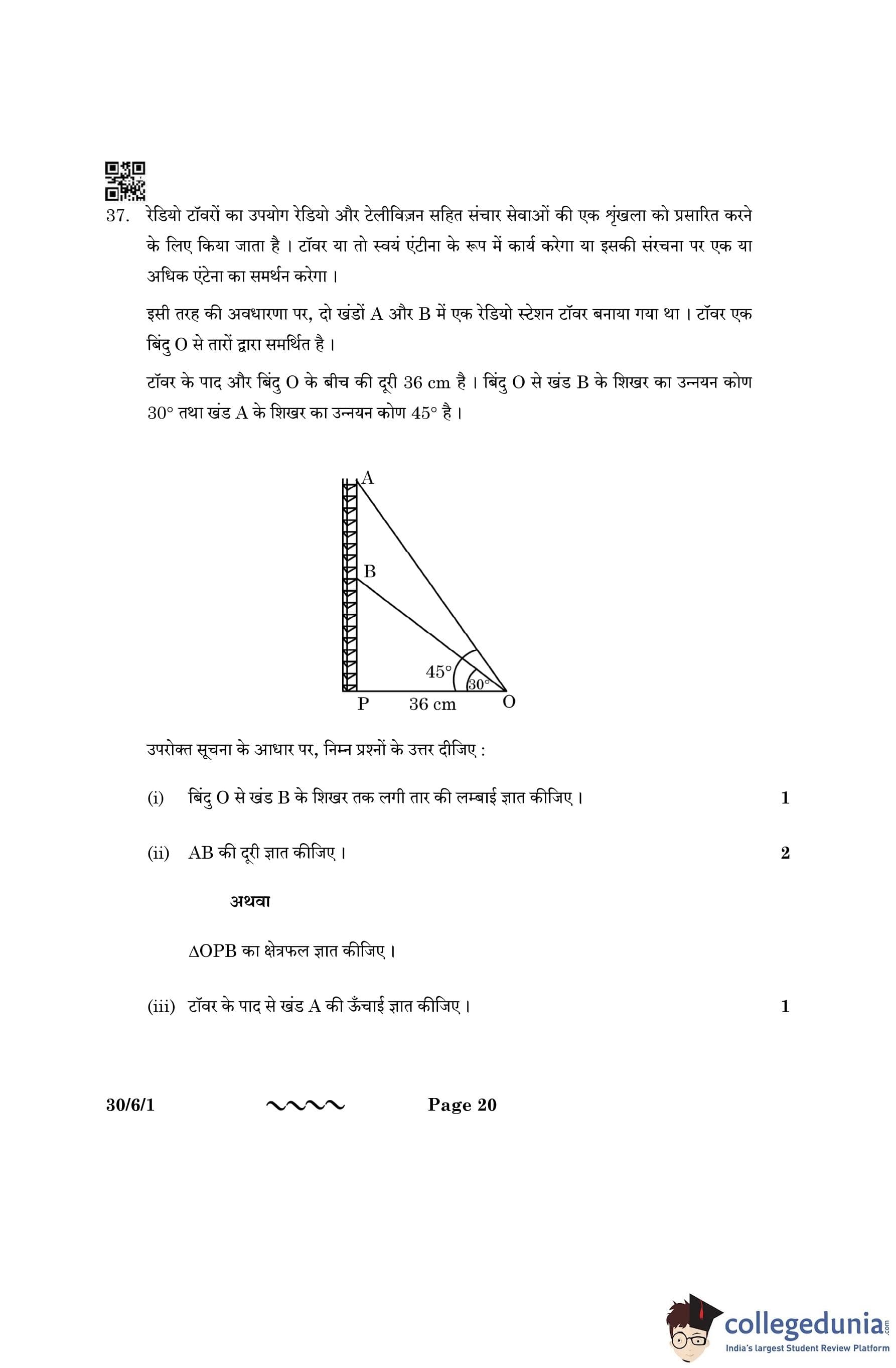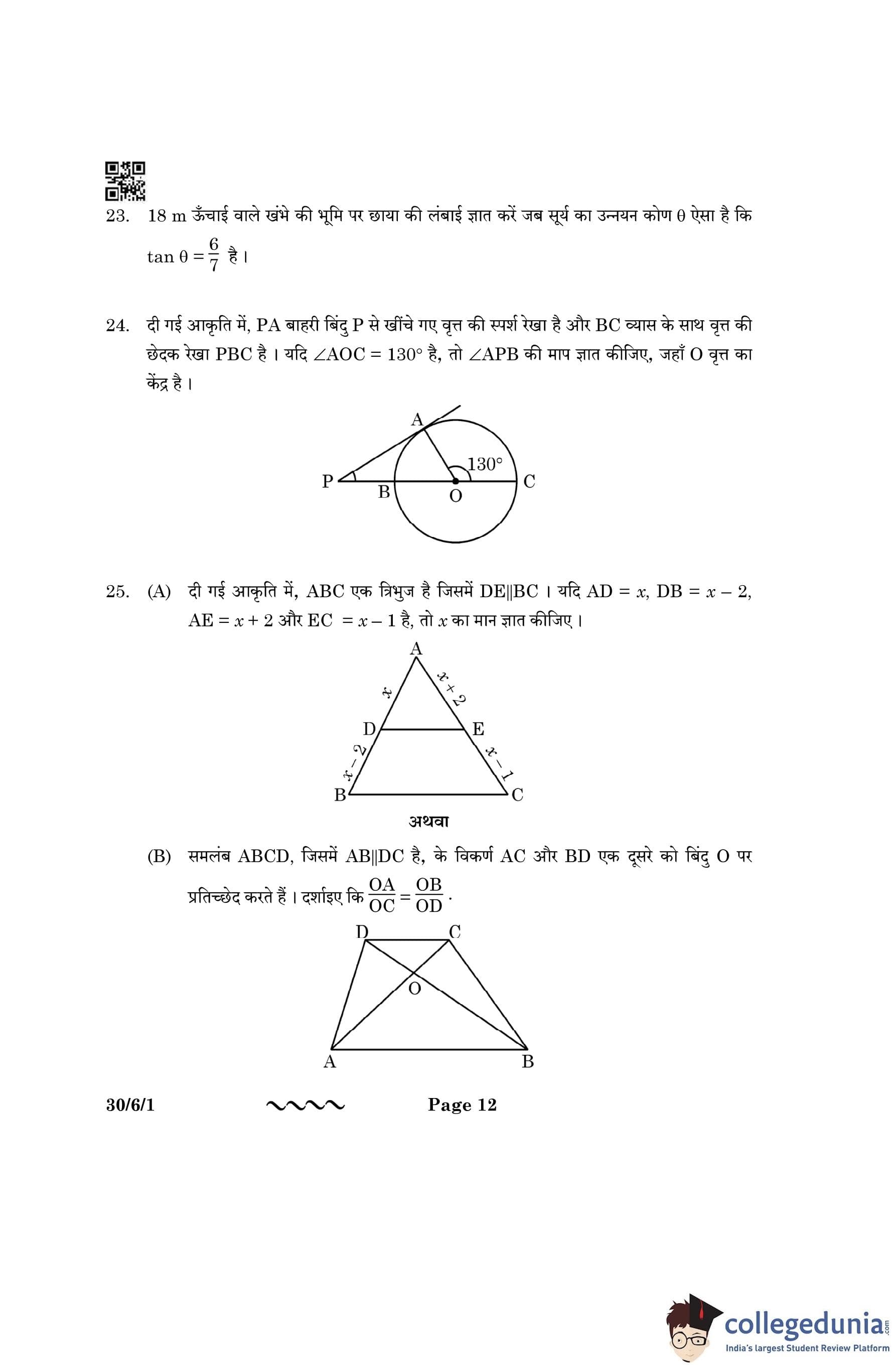 CBSE Class 10 Mathematics Standard Question Paper 2023 with Answer Key (Set 1- 30/6/1) is available for download here. The exam was conducted by the Central Board of Secondary Education on March 21, 2023 in the Morning Session 10:30 AM to 1:30 PM. The medium of paper was English & Hindi. According to initial student reaction, the CBSE Class 10 Mathematics Standard paper was rated as Moderate in difficulty level. The question paper comprised a total of 38 questions divided among 5 sections.