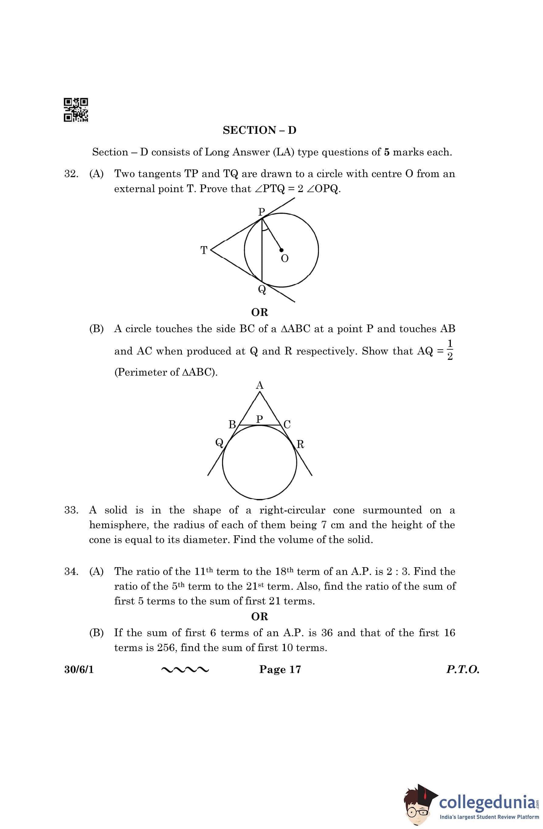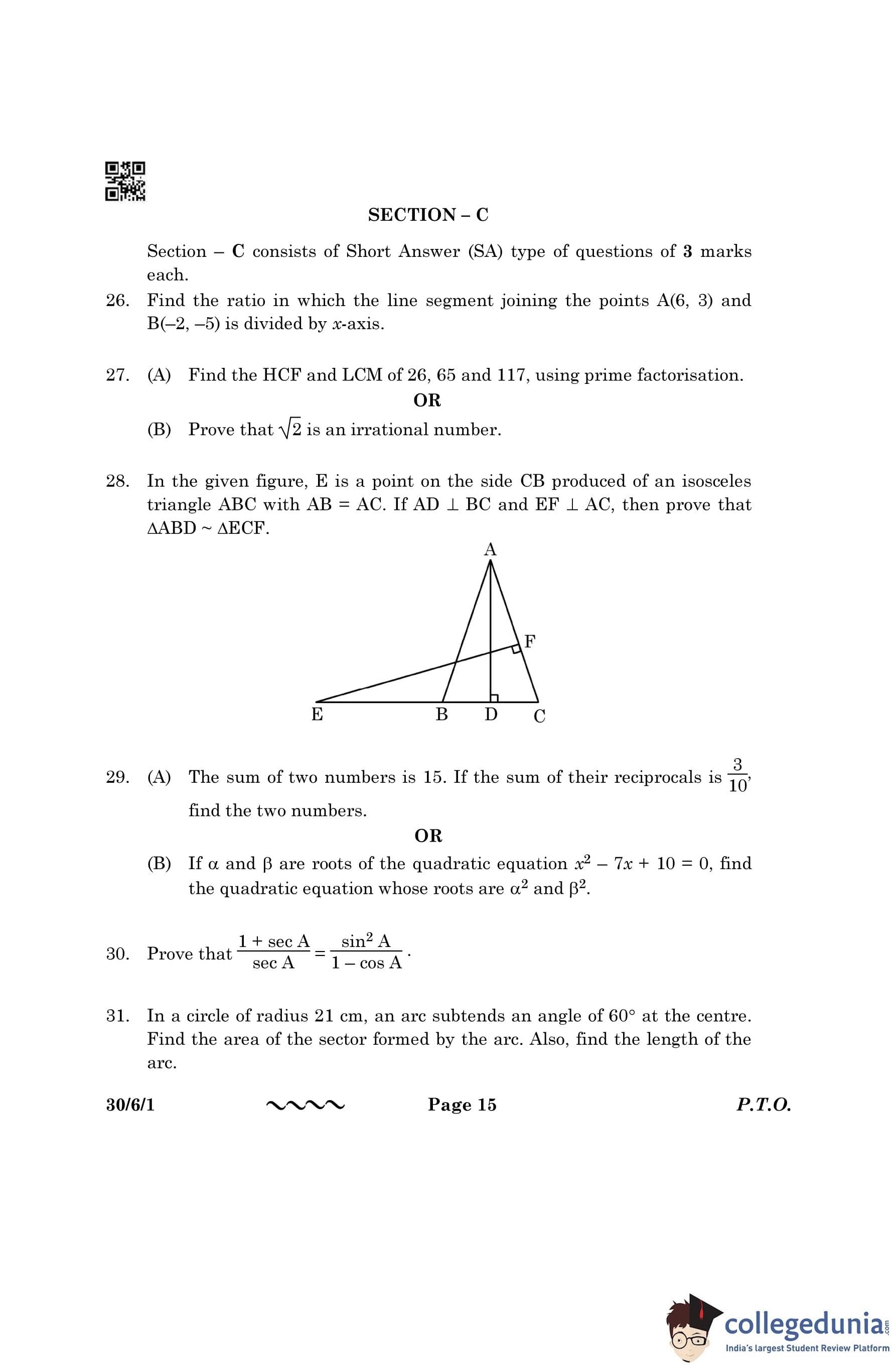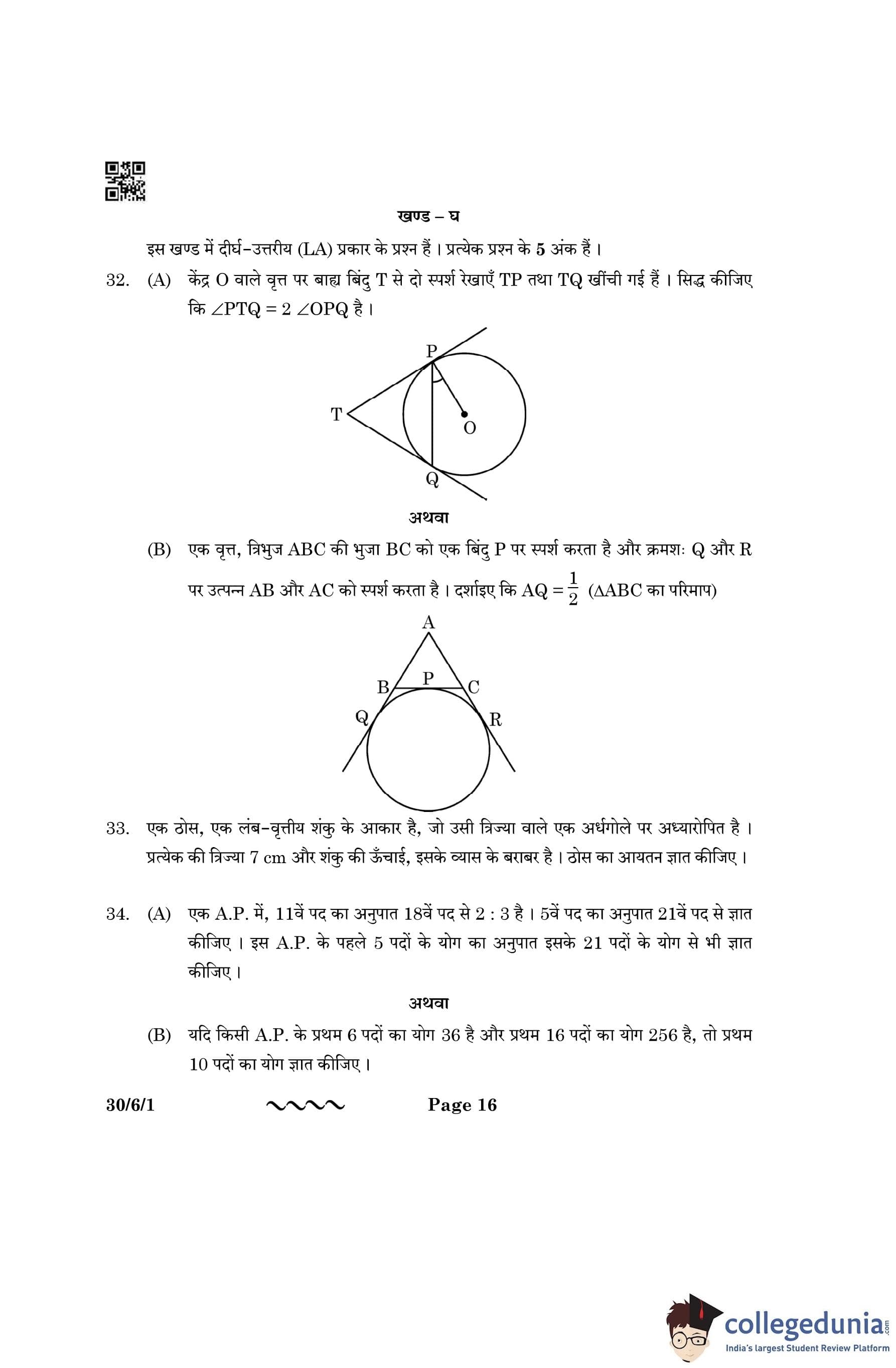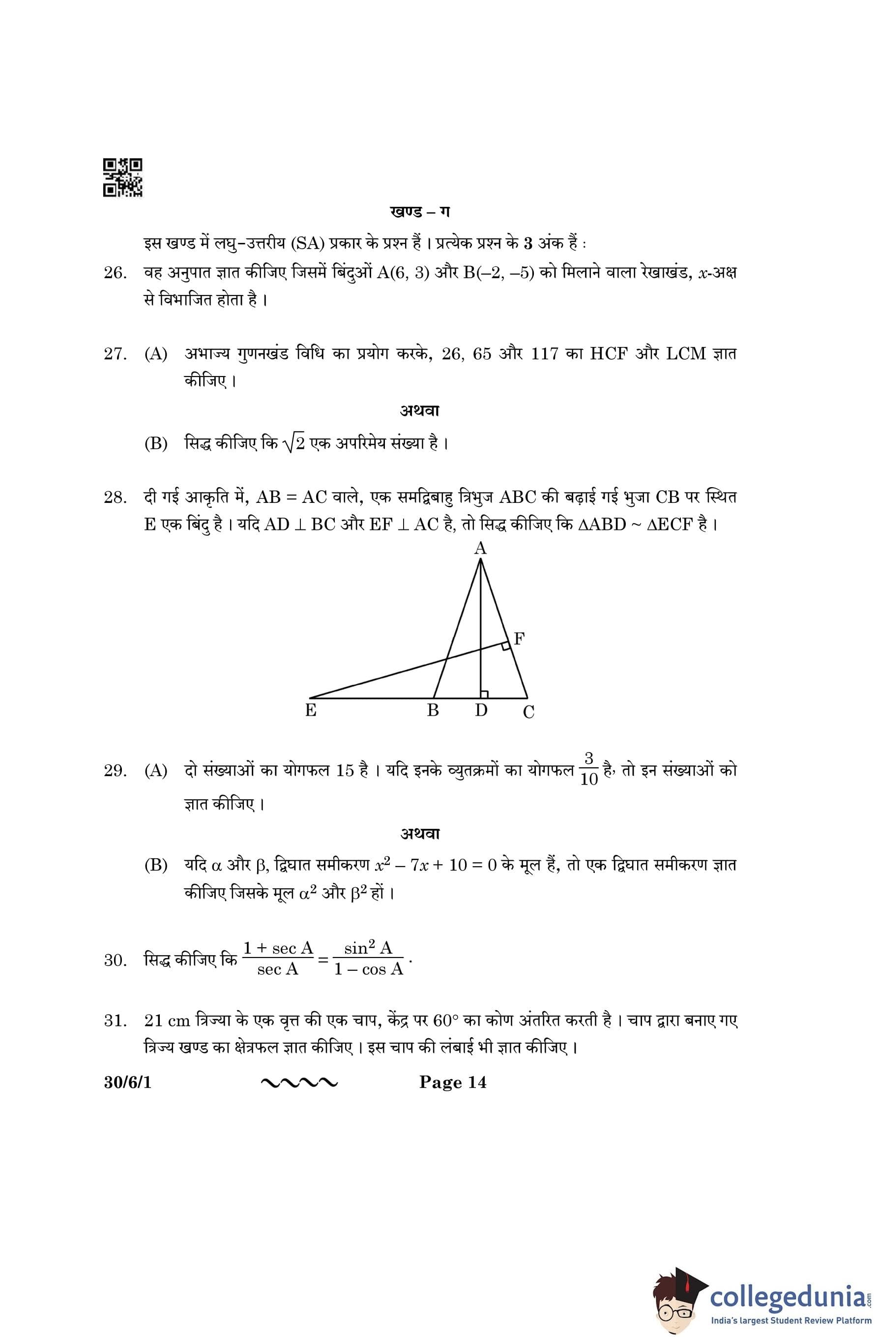 CBSE Class 10 Mathematics Standard (Set 1- 30/6/1) Question Paper 2023 with Answer Key