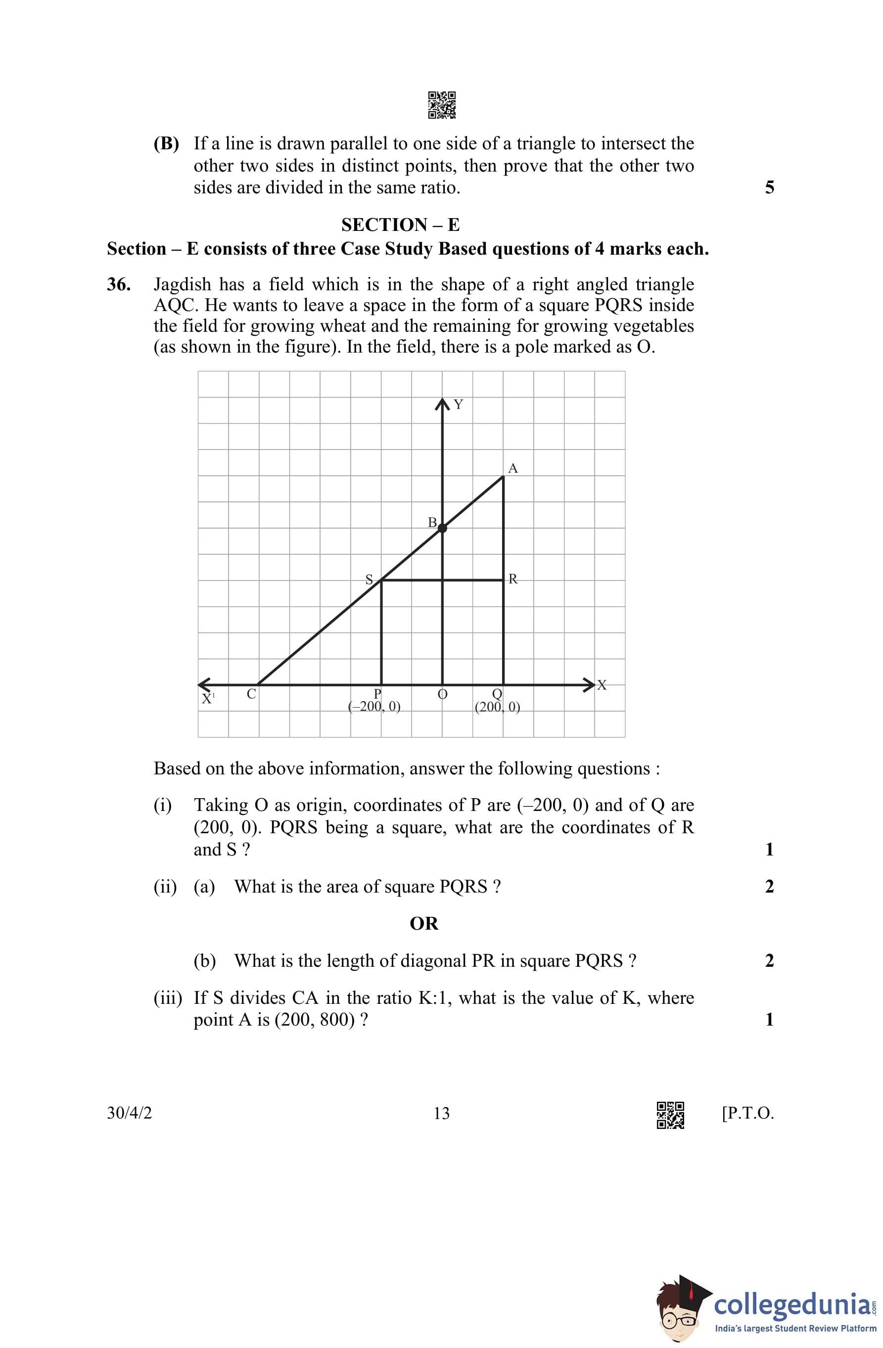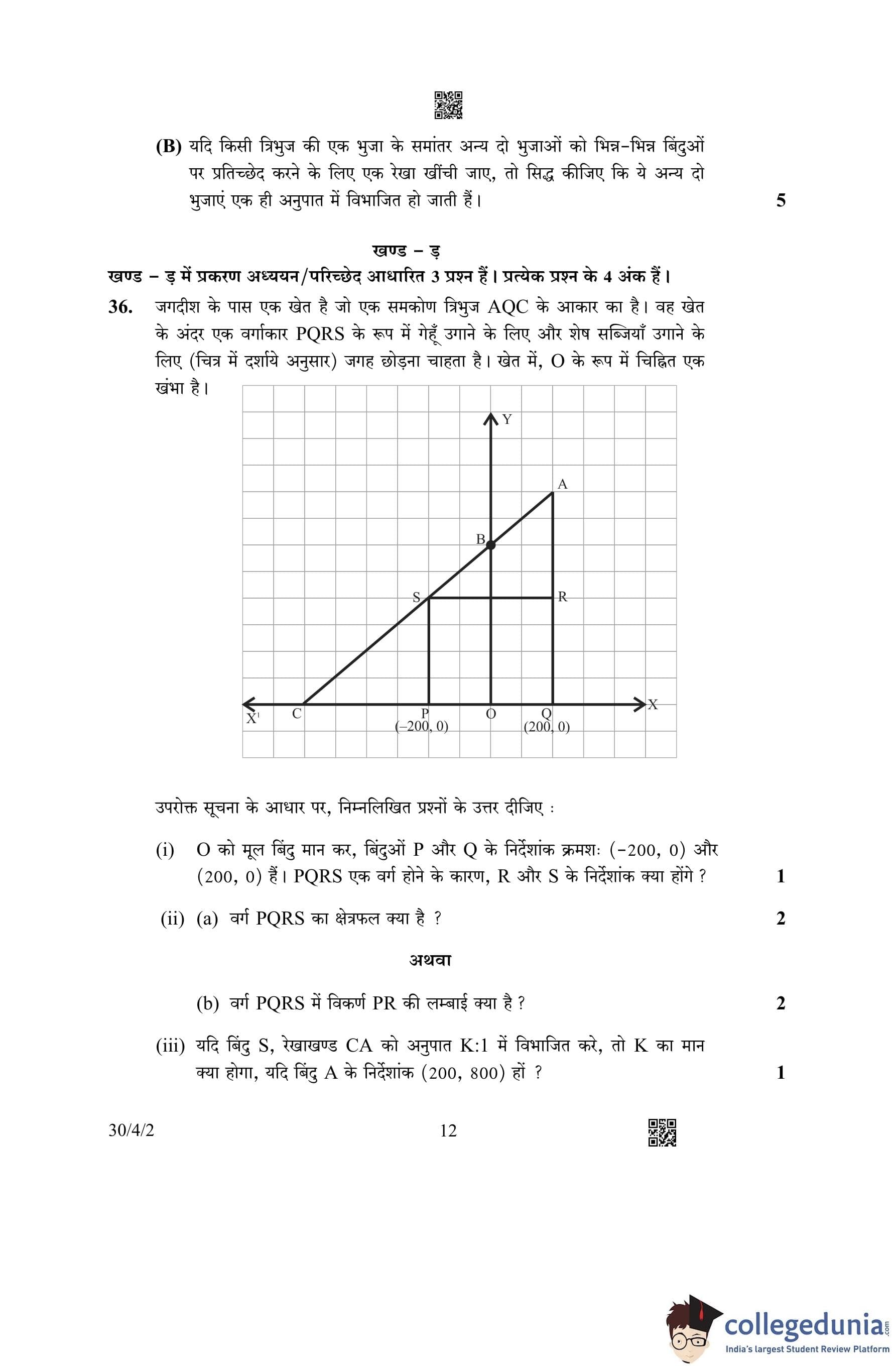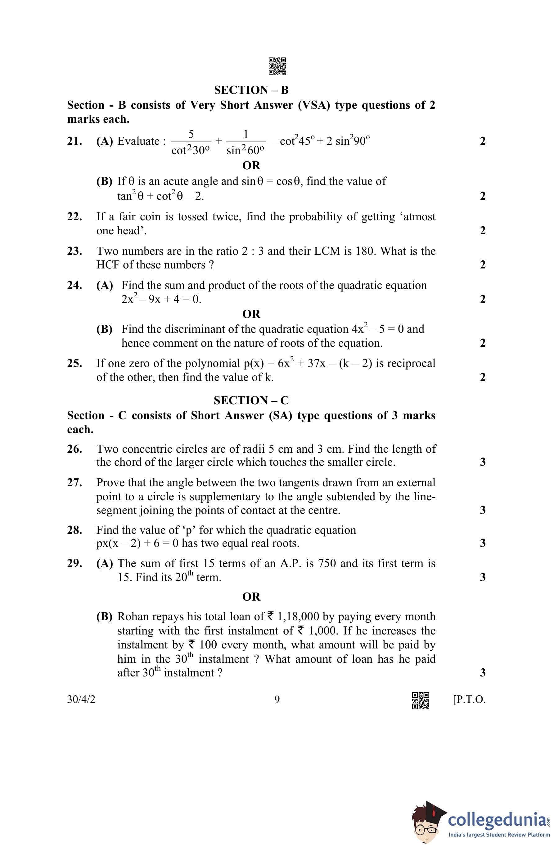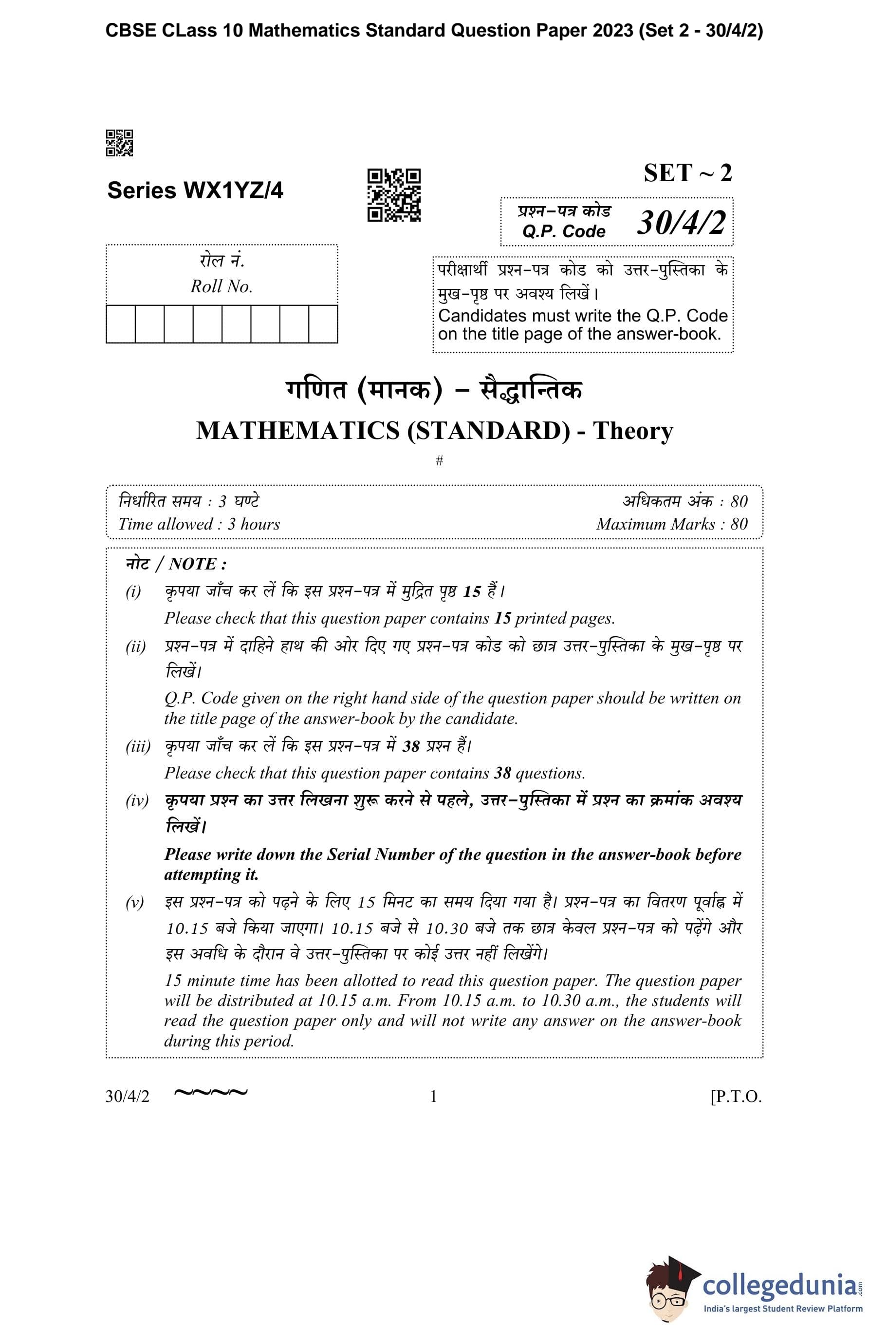 CBSE Class 10 Mathematics Standard (Set 2- 30/4/2) Question Paper 2023 with Answer Key