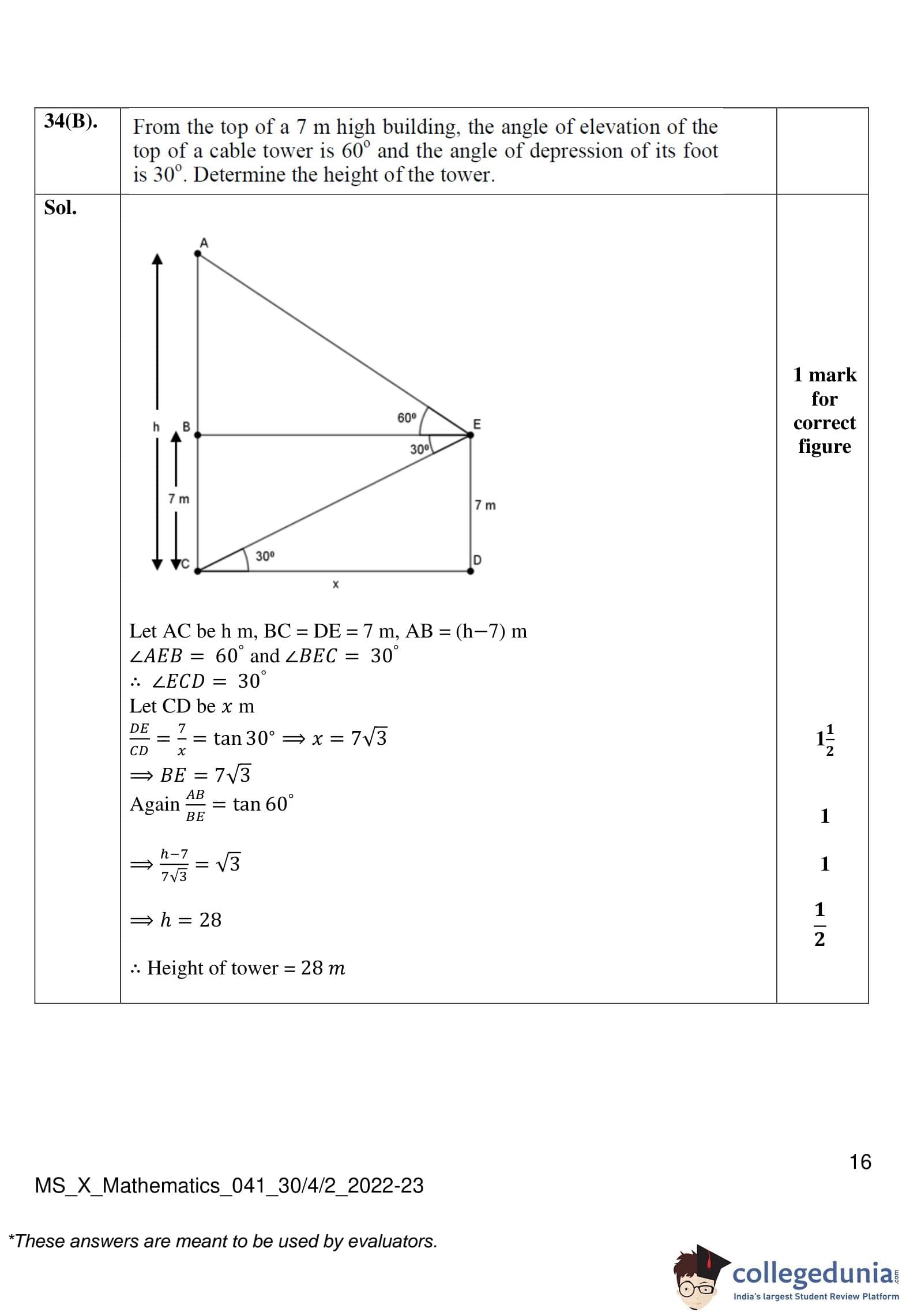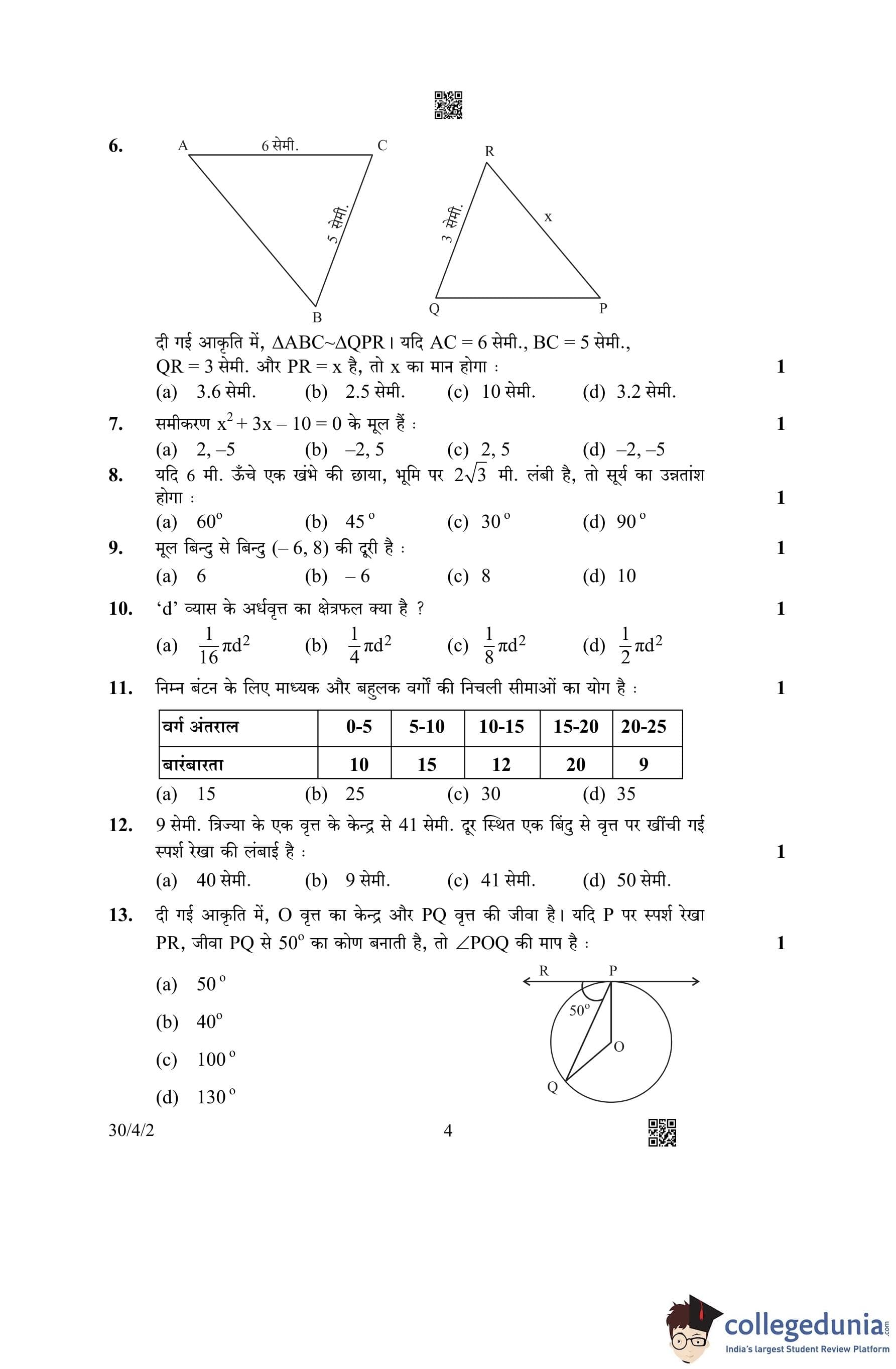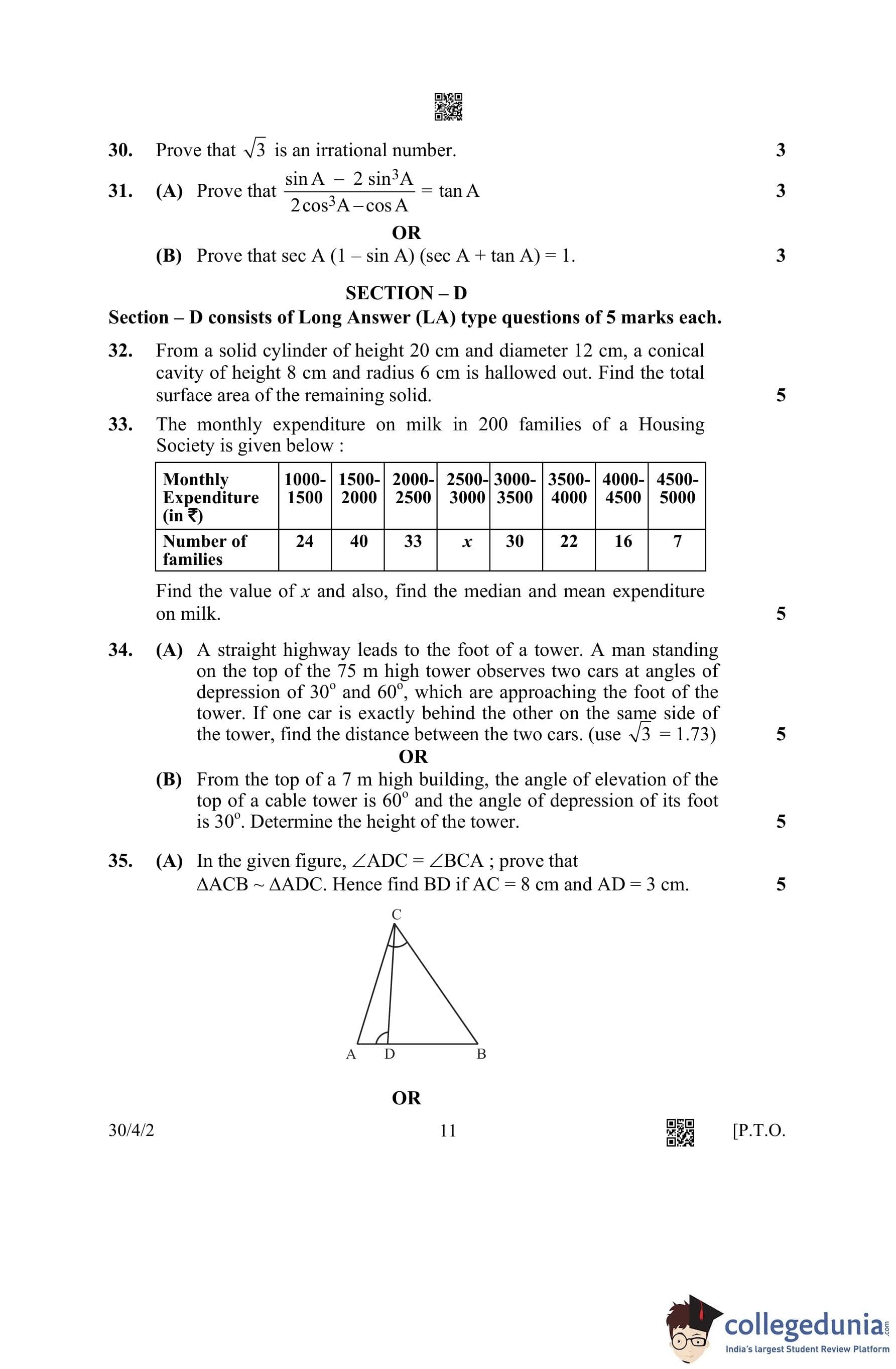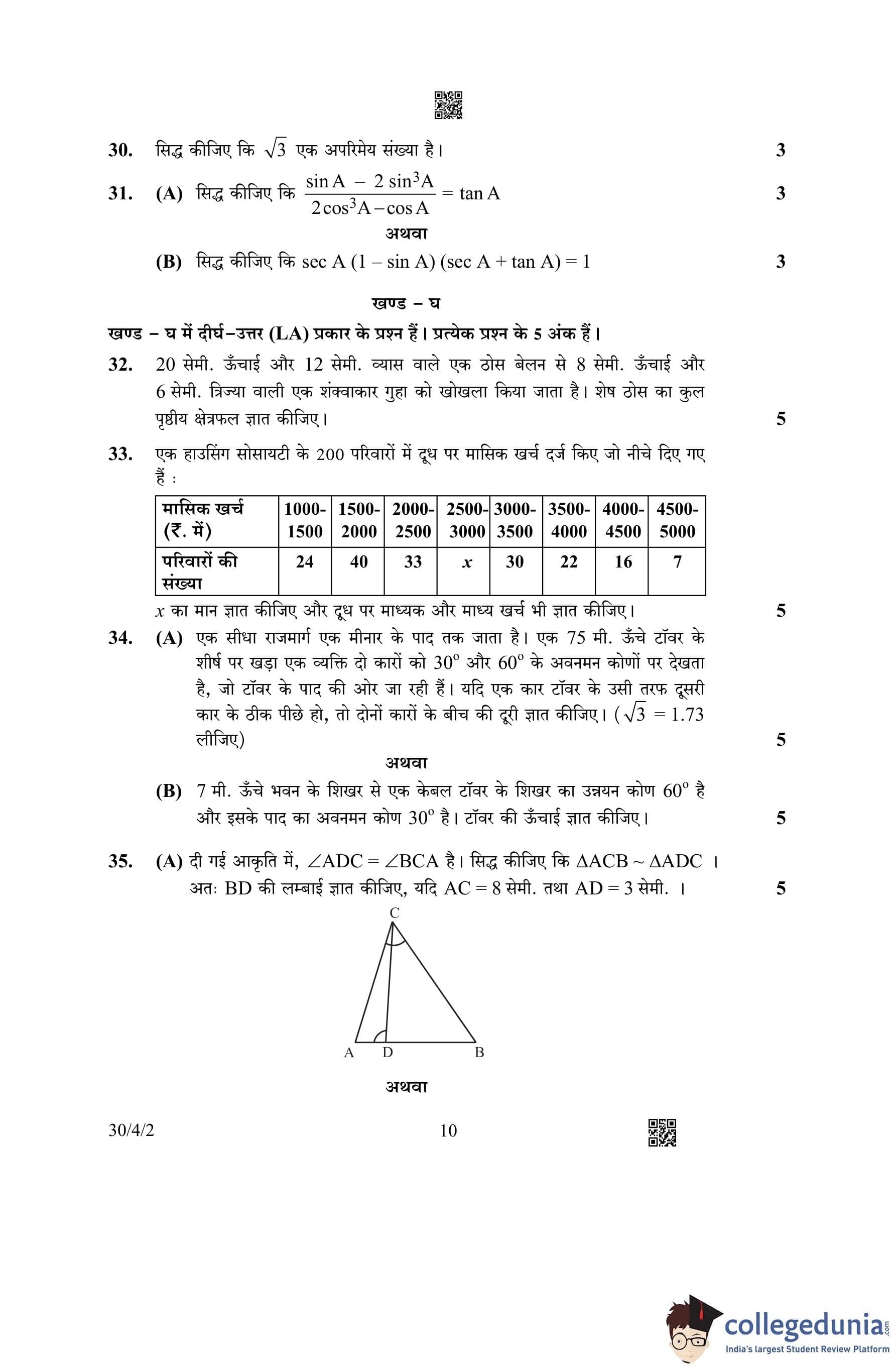 CBSE Class 10 Mathematics Standard (Set 2- 30/4/2) Question Paper 2023 with Answer Key