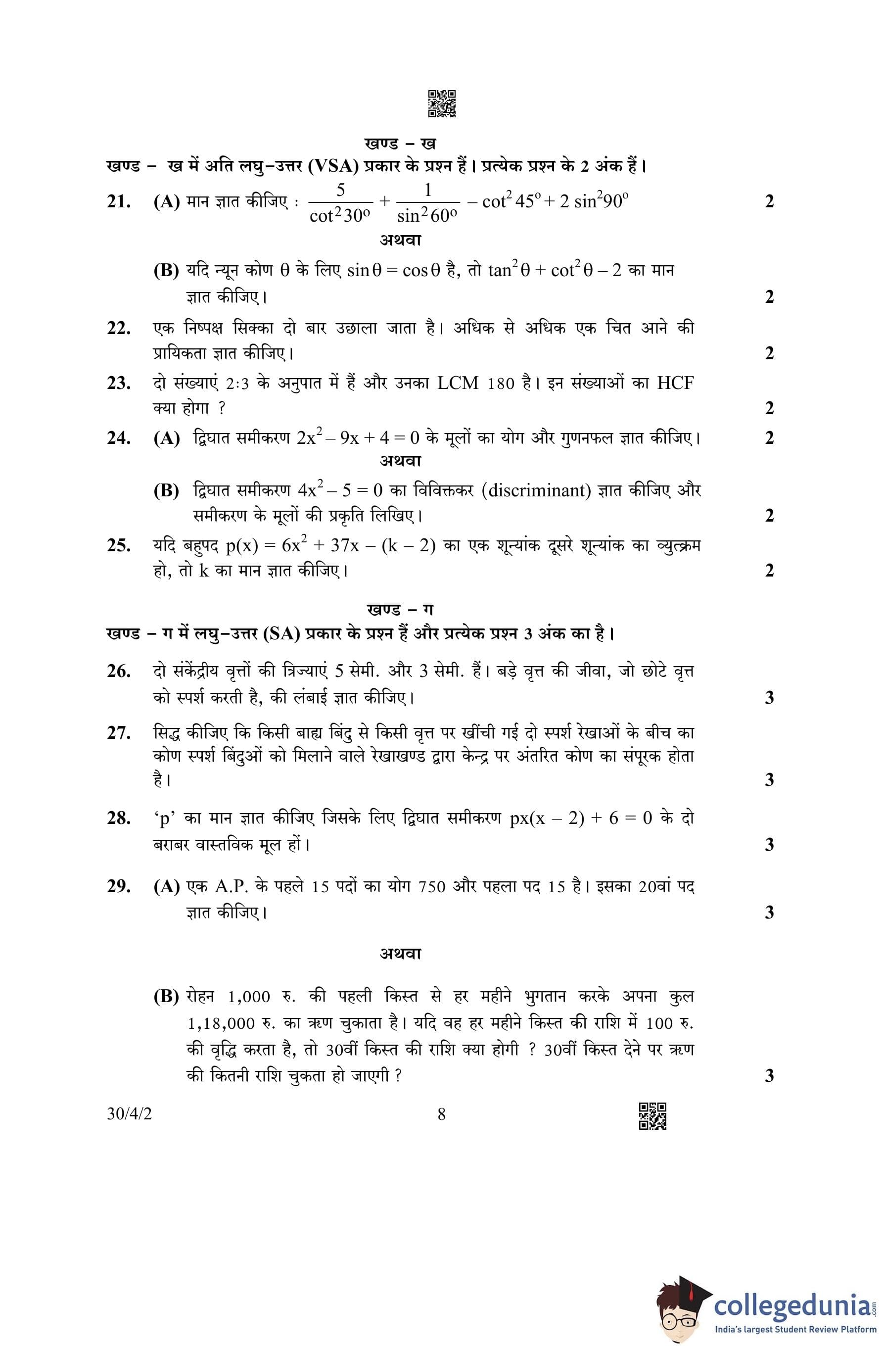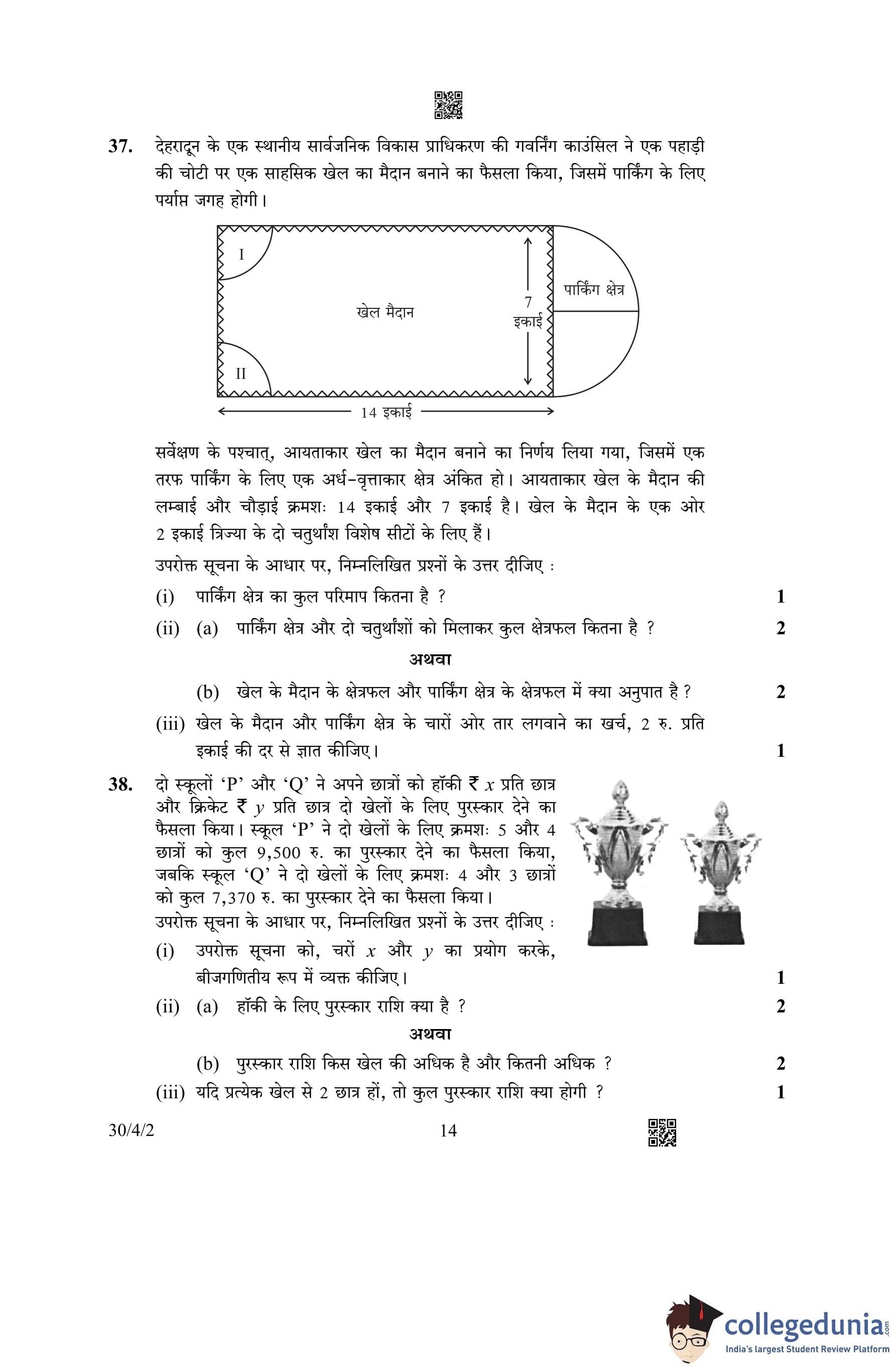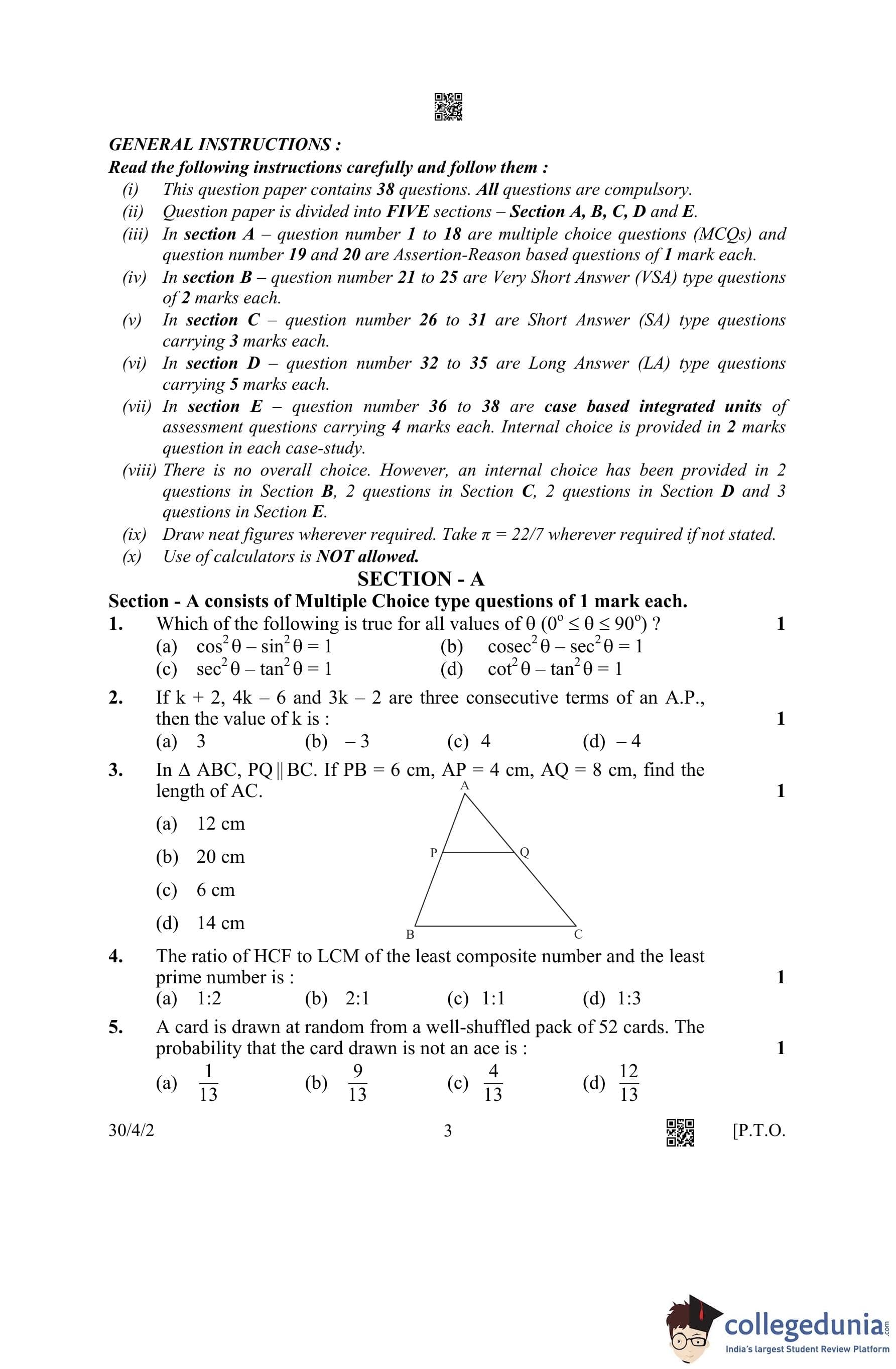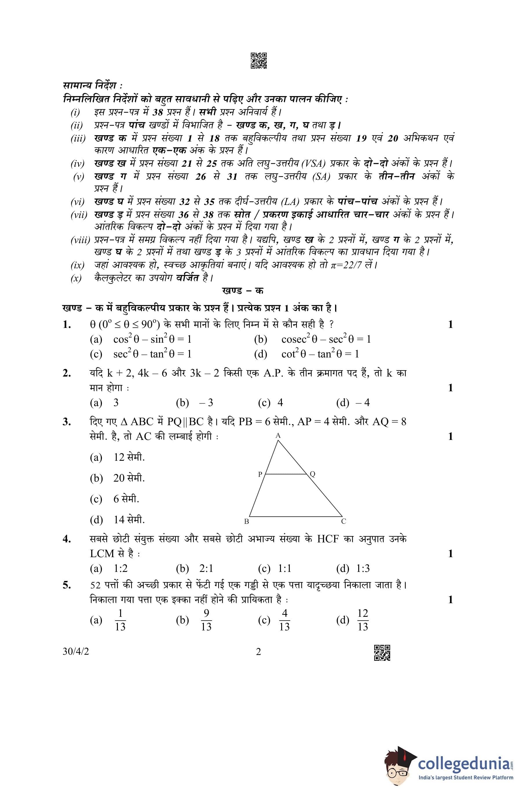 CBSE Class 10 Mathematics Standard Question Paper 2023 with Answer Key (Set 2- 30/4/2) is available for download here. The exam was conducted by the Central Board of Secondary Education on March 21, 2023 in the Morning Session 10:30 AM to 1:30 PM. The medium of paper was English & Hindi. According to initial student reaction, the CBSE Class 10 Mathematics Standard paper was rated as Moderate in difficulty level. The question paper comprised a total of 38 questions divided among 5 sections.