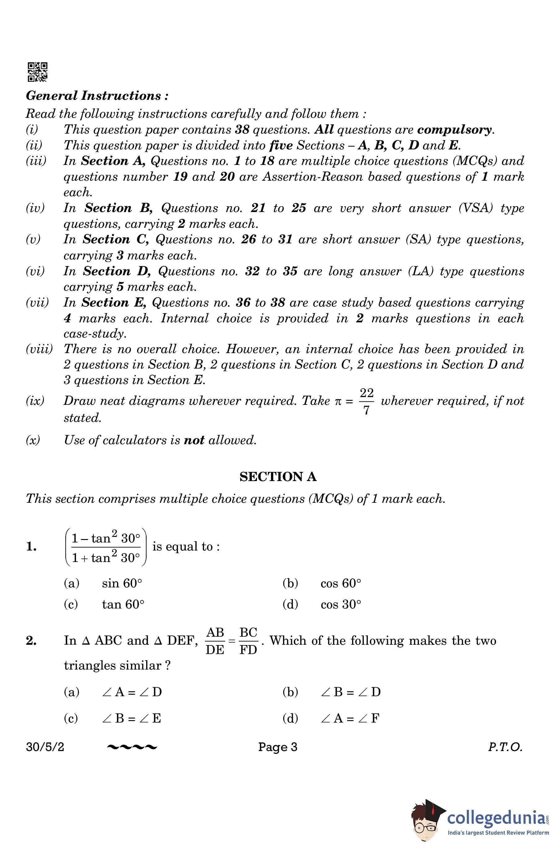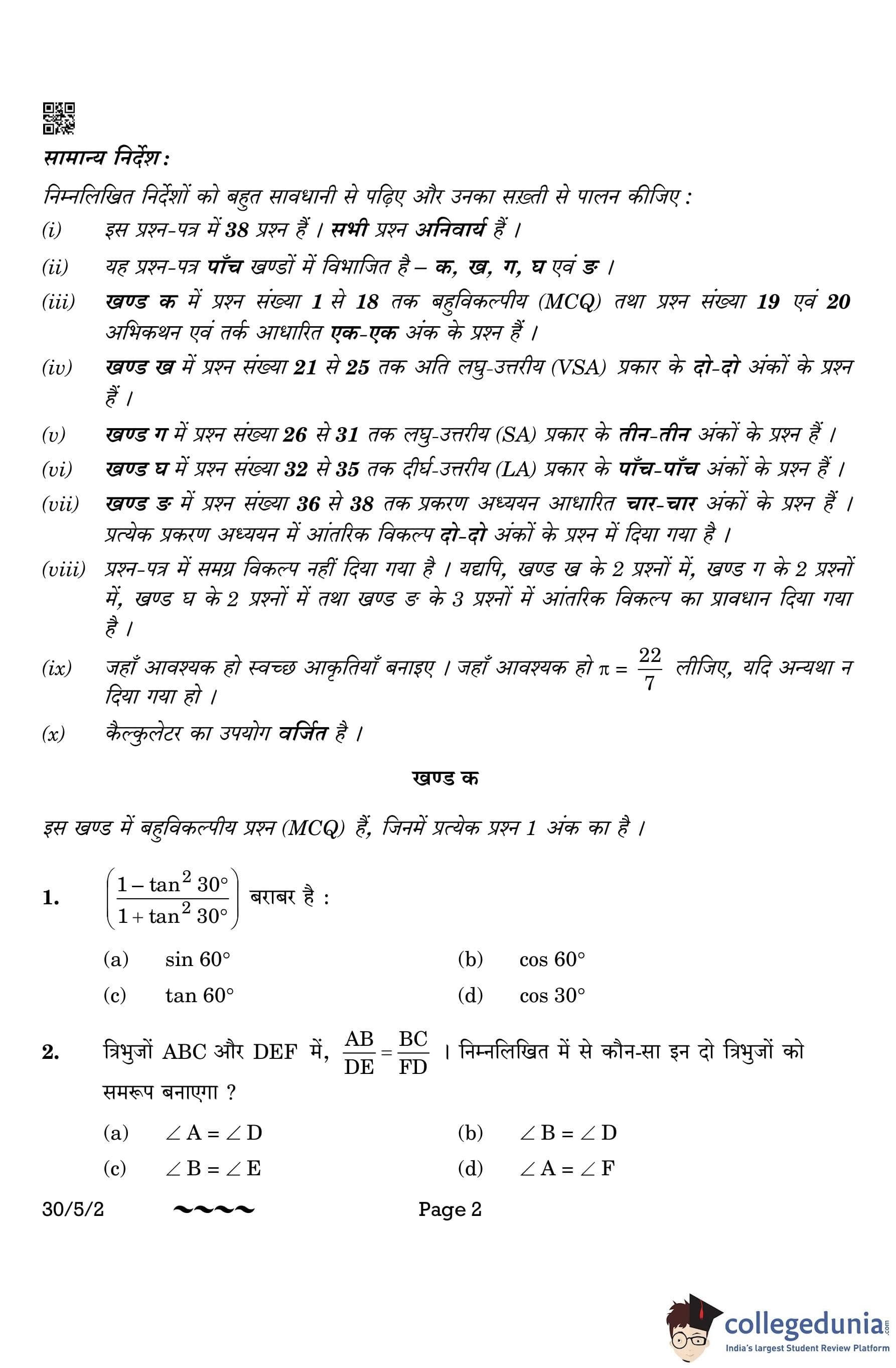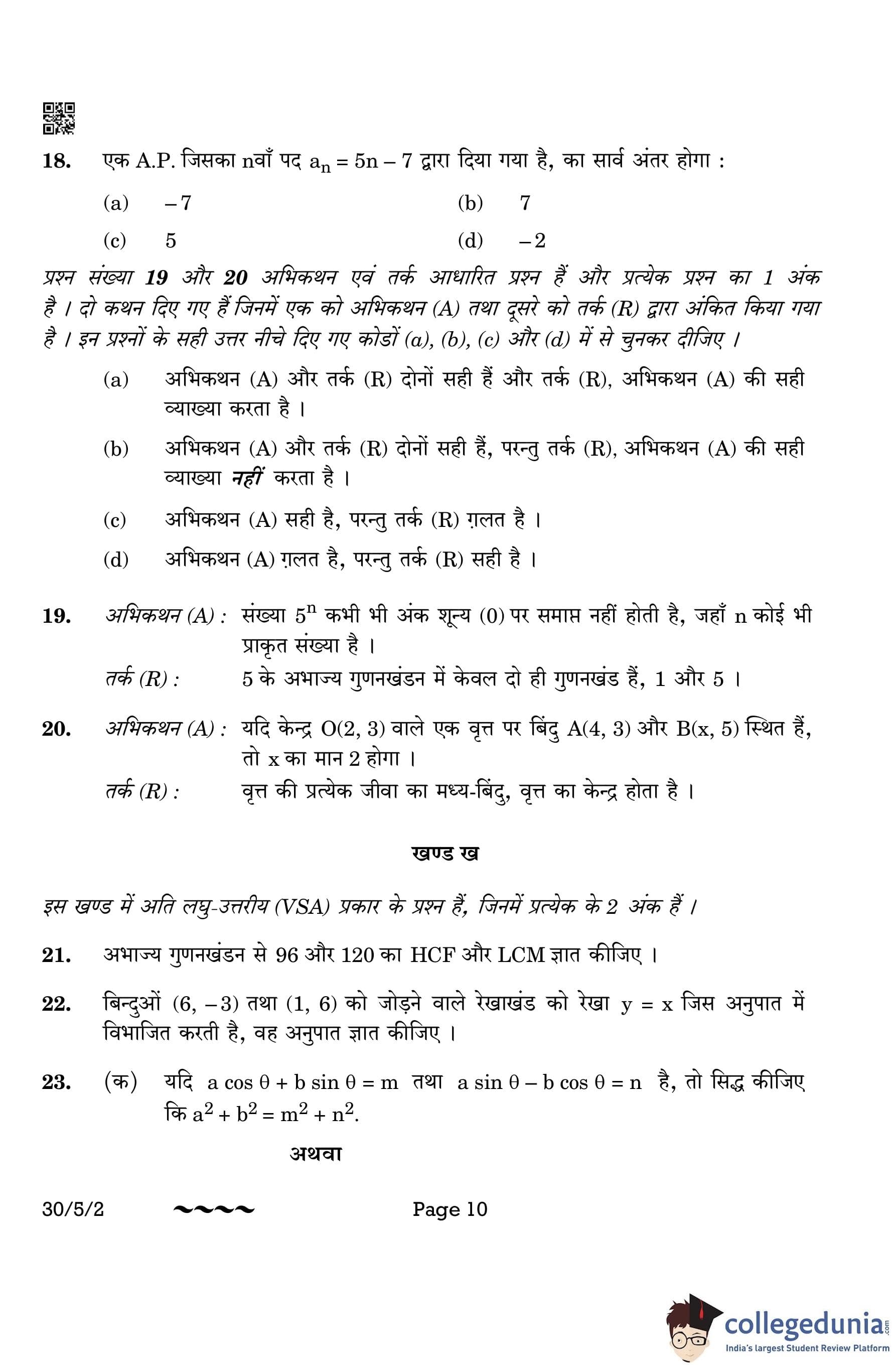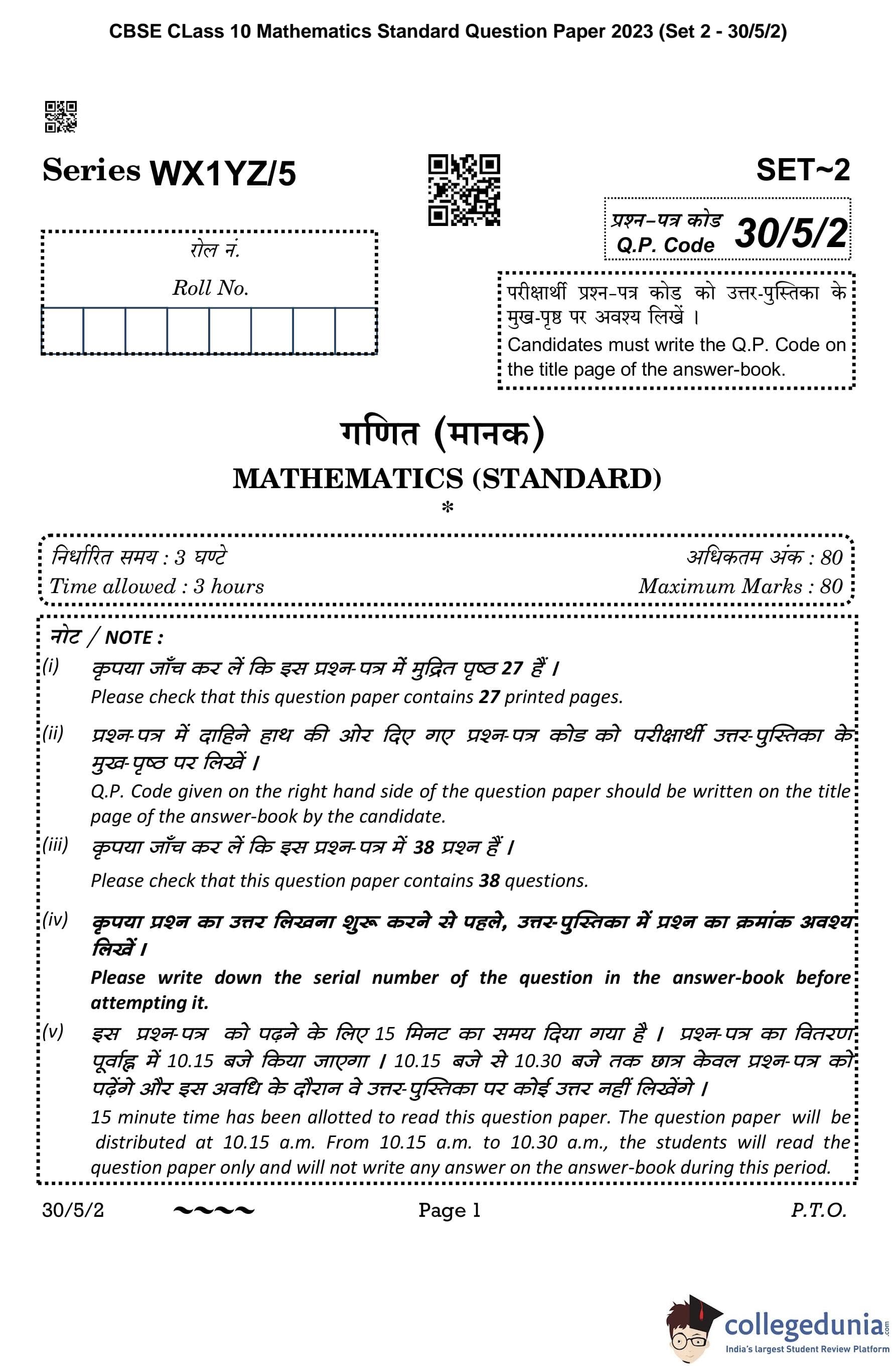 CBSE Class 10 Mathematics Standard Question Paper 2023 with Answer Key (Set 2- 30/5/2) is available for download here. The exam was conducted by the Central Board of Secondary Education on March 21, 2023 in the Morning Session 10:30 AM to 1:30 PM. The medium of paper was English & Hindi. According to initial student reaction, the CBSE Class 10 Mathematics Standard paper was rated as Moderate in difficulty level. The question paper comprised a total of 38 questions divided among 5 sections.