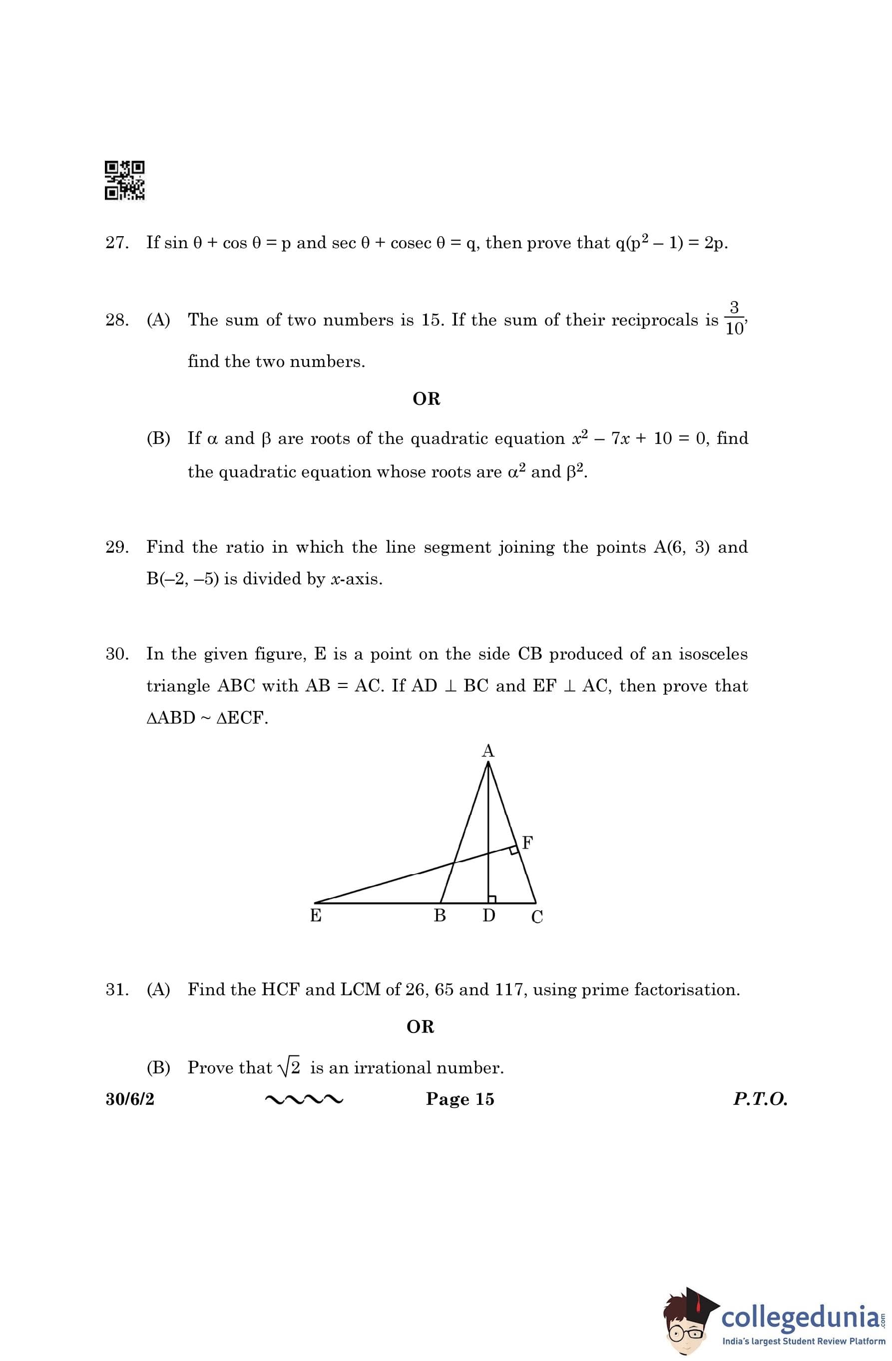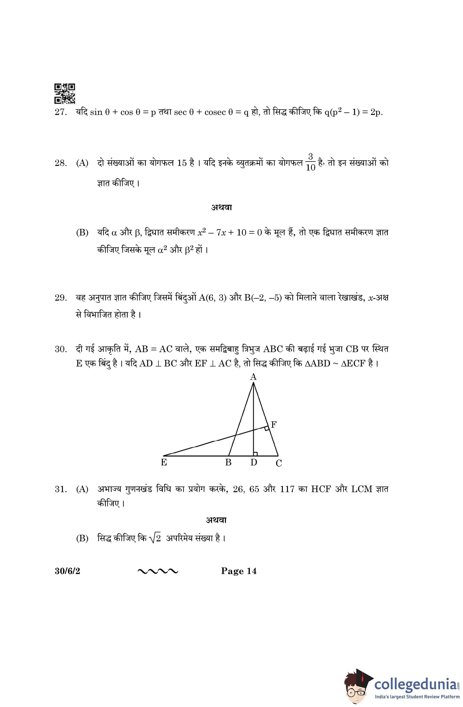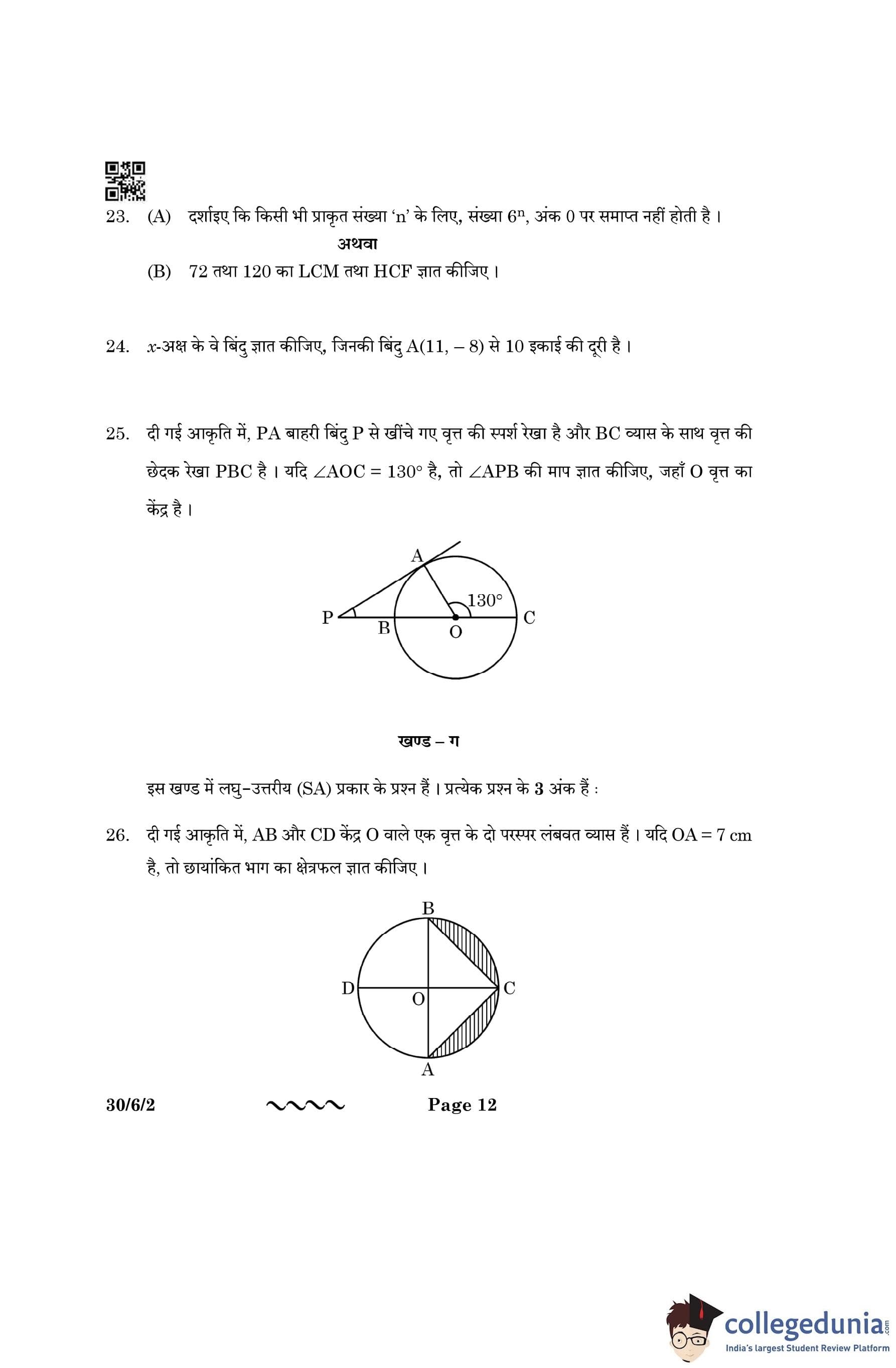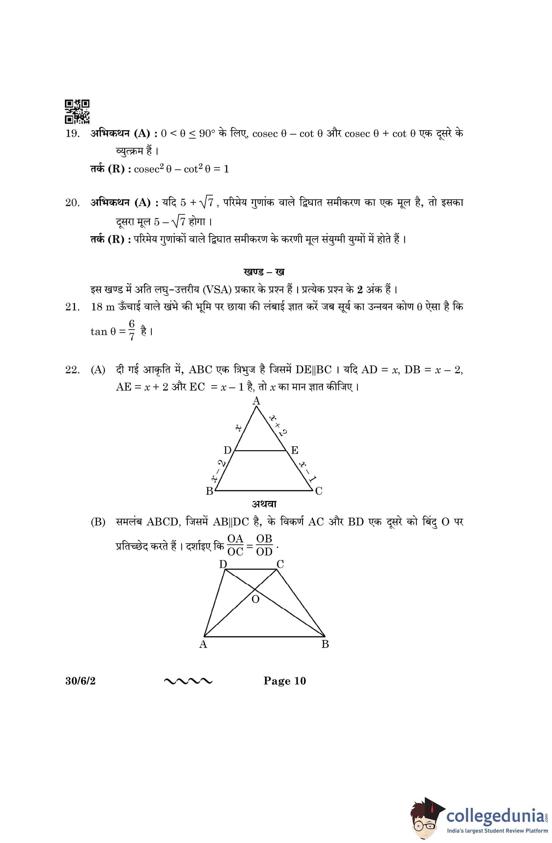 CBSE Class 10 Mathematics Standard (Set 2- 30/6/2) Question Paper 2023 with Answer Key